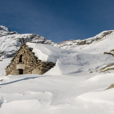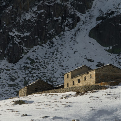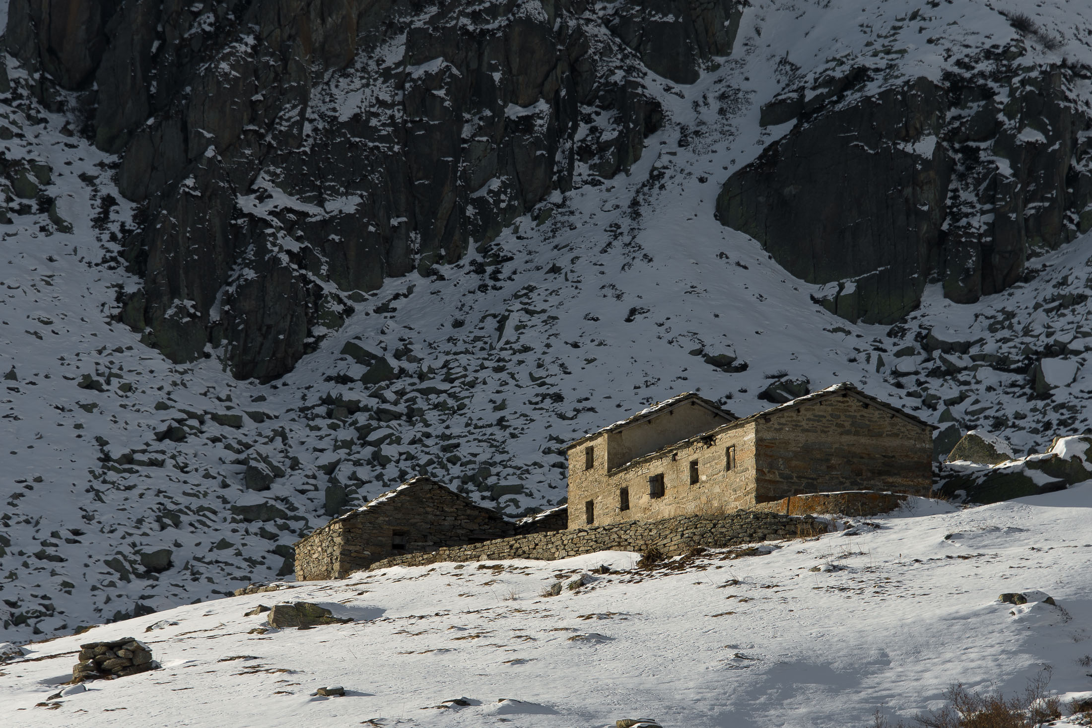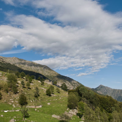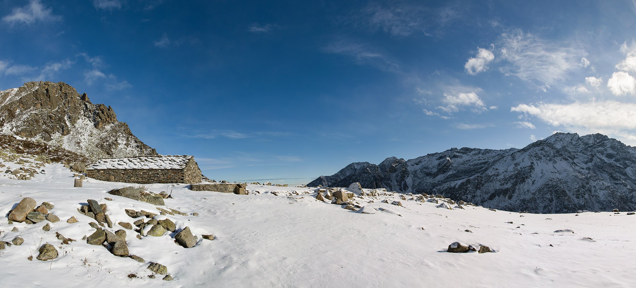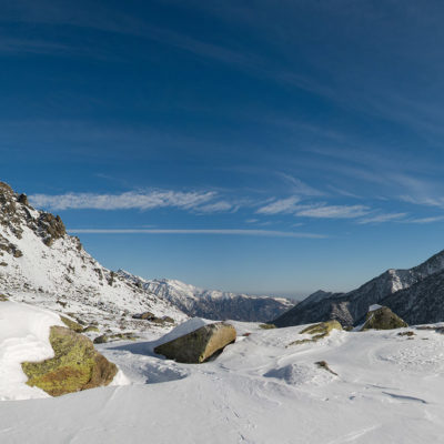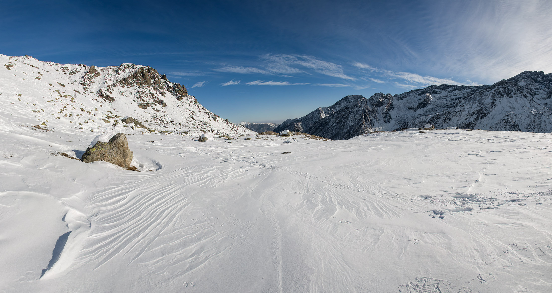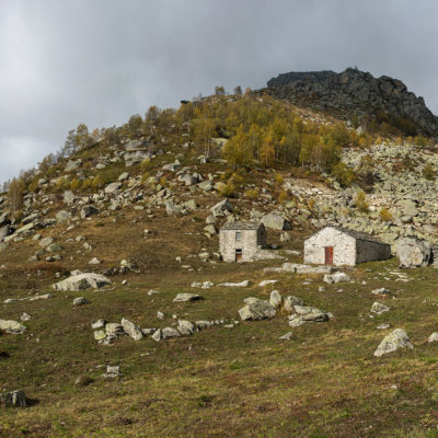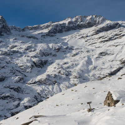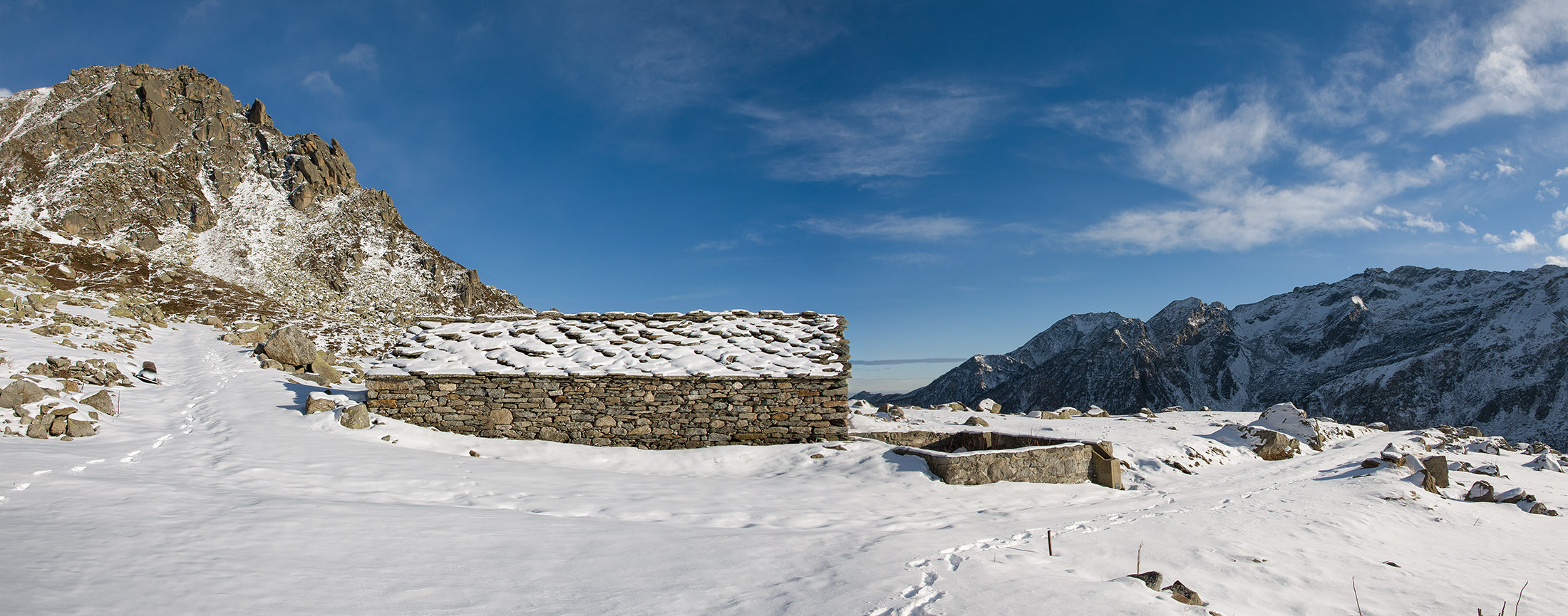 Über einige Serpentinen windet sich der Weg weiter talaufwärts, das Panorama wird immer eindrücklicher. Mit jedem Schritt nähert man sich dem Alpenhauptkamm mit der Gipfelkette zwischen der Uja di Ciamarella (3676 m) und der Levanna Orientale (3555 m), eine gigantische Kulisse mit vielen wilden Graten und Türmen. Es folgt ein längerer flacherer Wegabschnitt, die Hänge sind übersät von Geröllfeldern, ringsherum liegen riesige Steine in der Landschaft rum. Dann ein besonders auffälliger Felsbrocken, man könnte meinen, hier wäre ein Meteorit eingeschlagen. In der Nähe plätschert der Rio Sagnasse zu Tal, auf den von vielen Rinnsalen durchzogenen Feuchtwiesen blühen im Frühsommer Alpen-Kuhschellen, Enzian, Schlangen-Knöterich und Trollblumen. Zwei Kurven weiter oberhalb die aufgegebenen Hütten der Gias Crest (1880 m), ein Kuhstall ist noch intakt, das Schicksal der anderen Gebäude ist bereits besiegelt. Zurück bleiben zerborstene Dachbalken und herumliegende Trümmer. Dann erreicht man den Rand einer weiten Hochebene, ein wenig unterhalb die steinernen Hütten der in den Sommermonaten bewirtschafteten Alpe Pià Nou (1853 m), wo um diese Zeit zahlreiche Kühe und Rinder auf den umliegenden Weiden grasen. Im weiteren Verlauf überquert man die riesigen Alphochflächen der Gias dei Signori und der Gias Sagnasse. Jenseits davon umrundet der Sentiero Balcone sanft ansteigend einen Geländerücken und endet schliesslich wenig später bei den archaisch anmutenden Alpgebäuden der Gias Nuovo Fontane (1986 m). Ein abgeschiedener und faszinierender Ort inmitten einer gewaltigen Hochgebirgslandschaft. Das Panorama ist umfassend, man überblickt nahezu das gesamte Val Grande di Lanzo, vom Monte Bellavarda im Osten bis zum Steilabfall des Alpenhauptkamms, der hier zum Greifen nah ist.