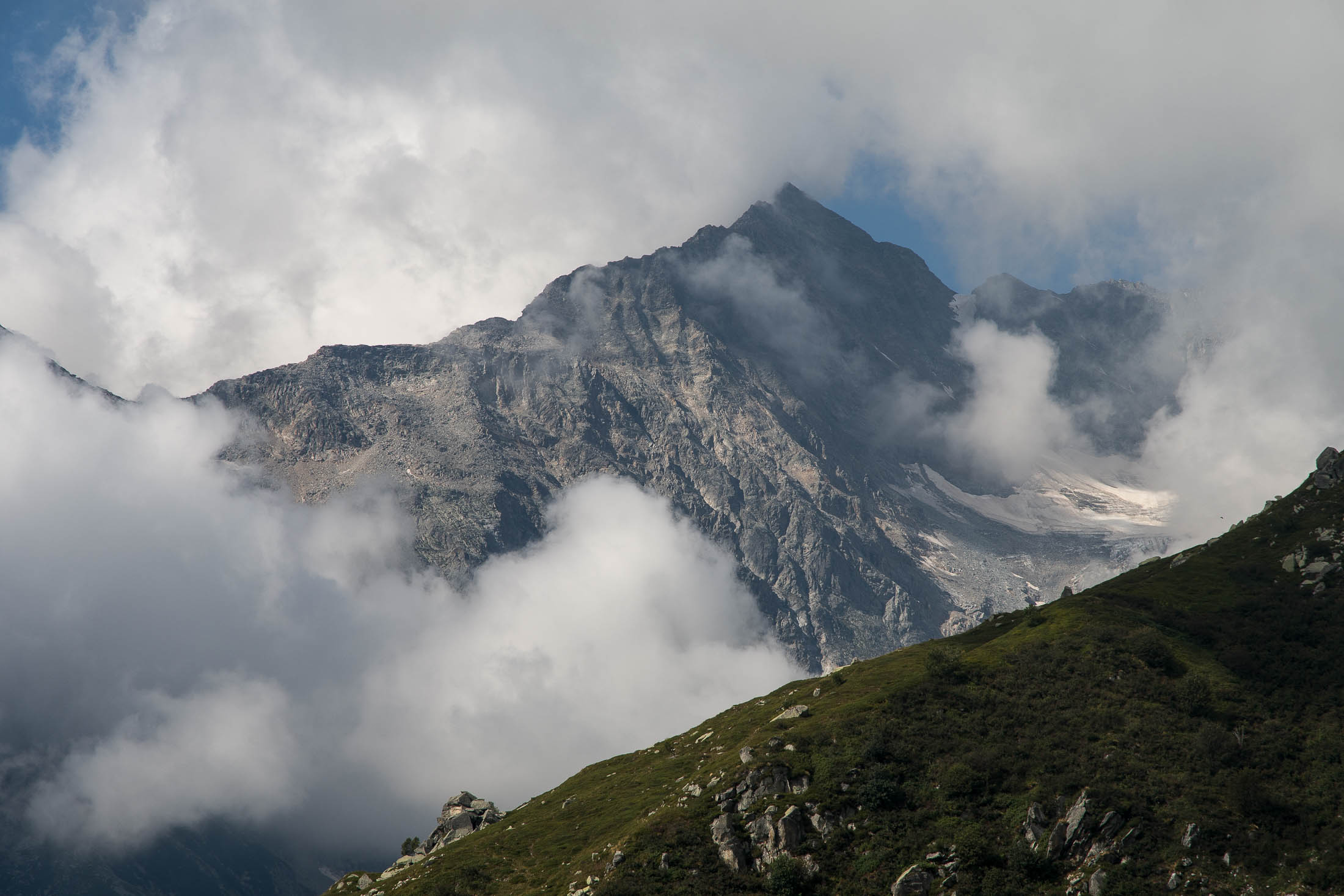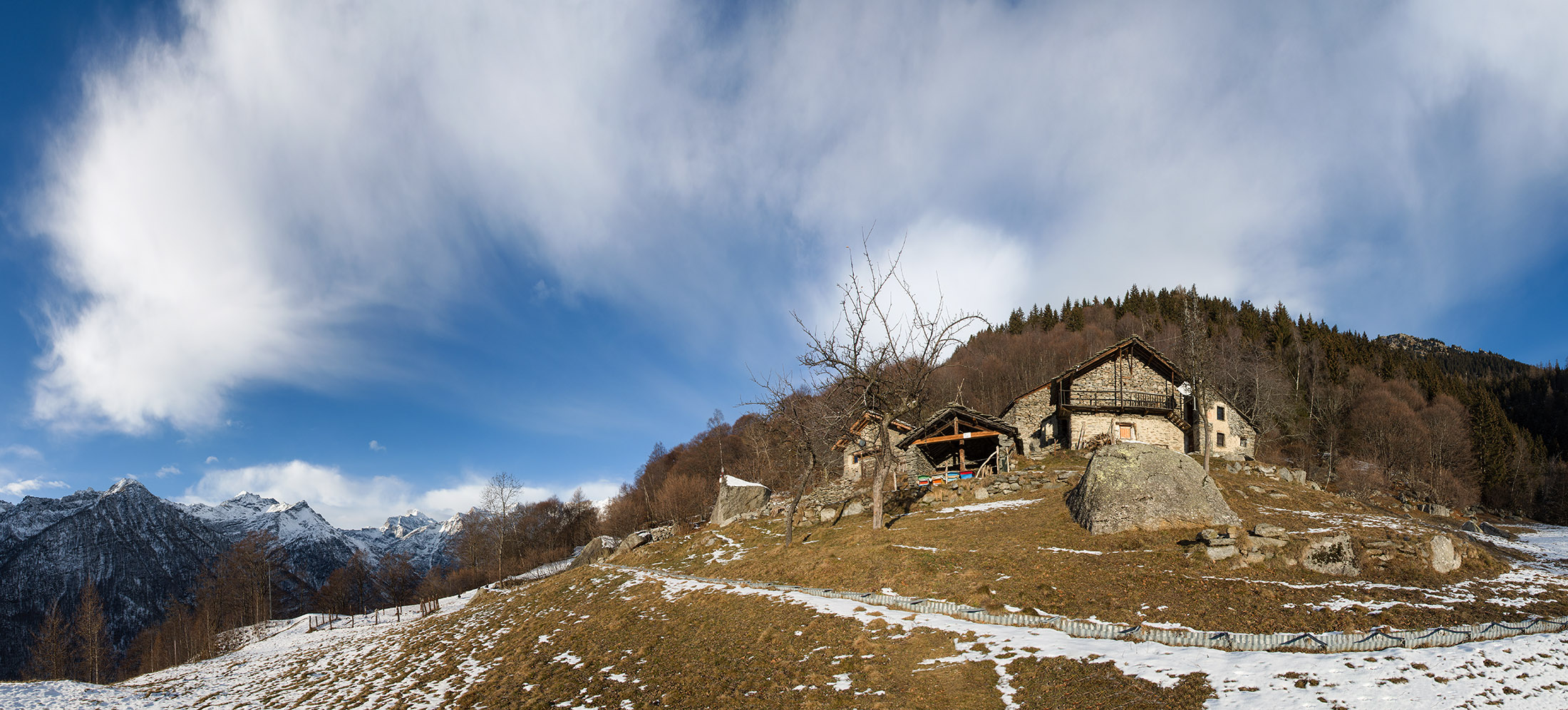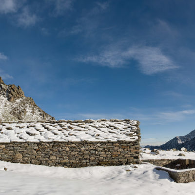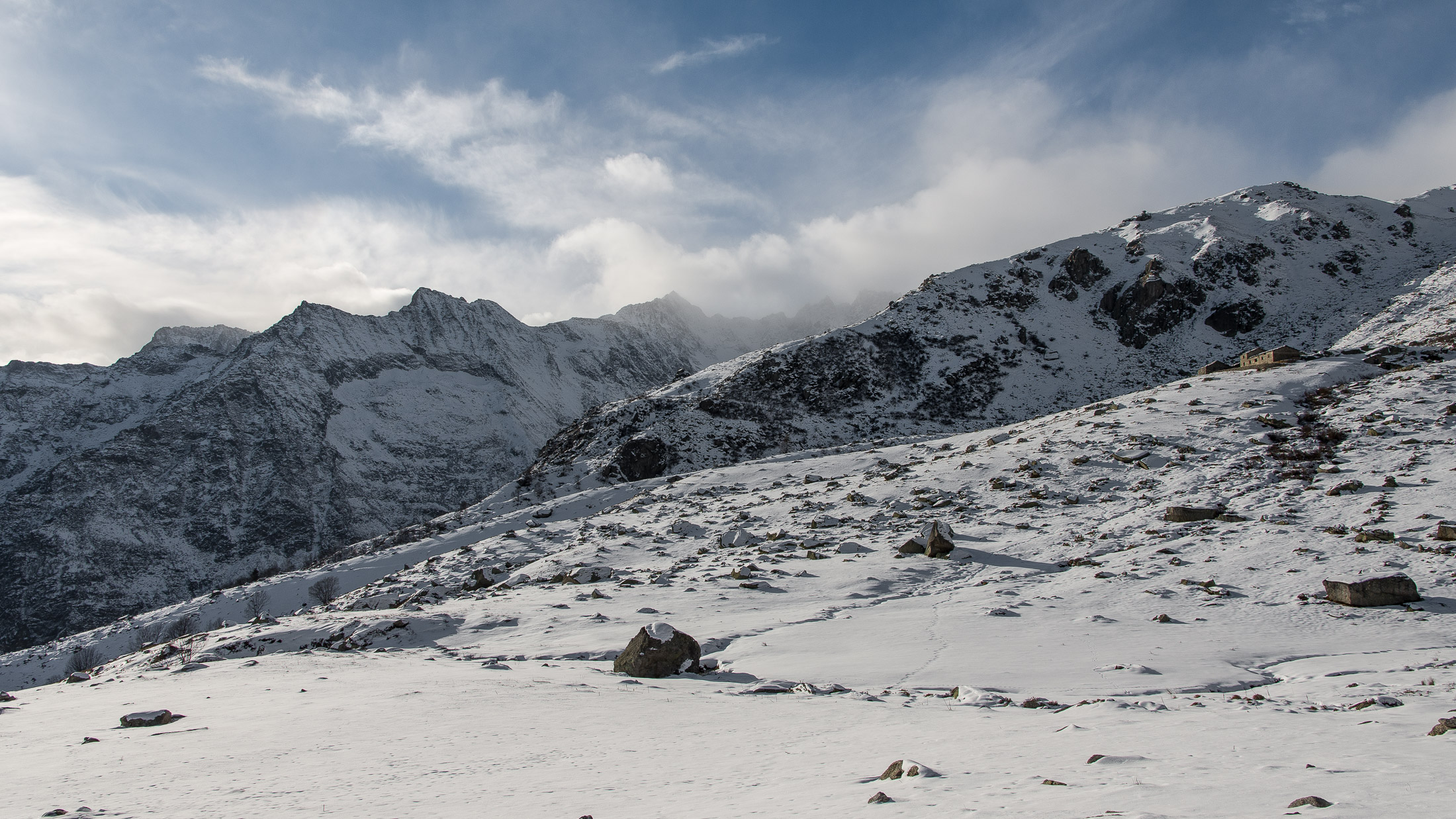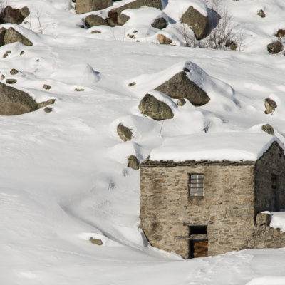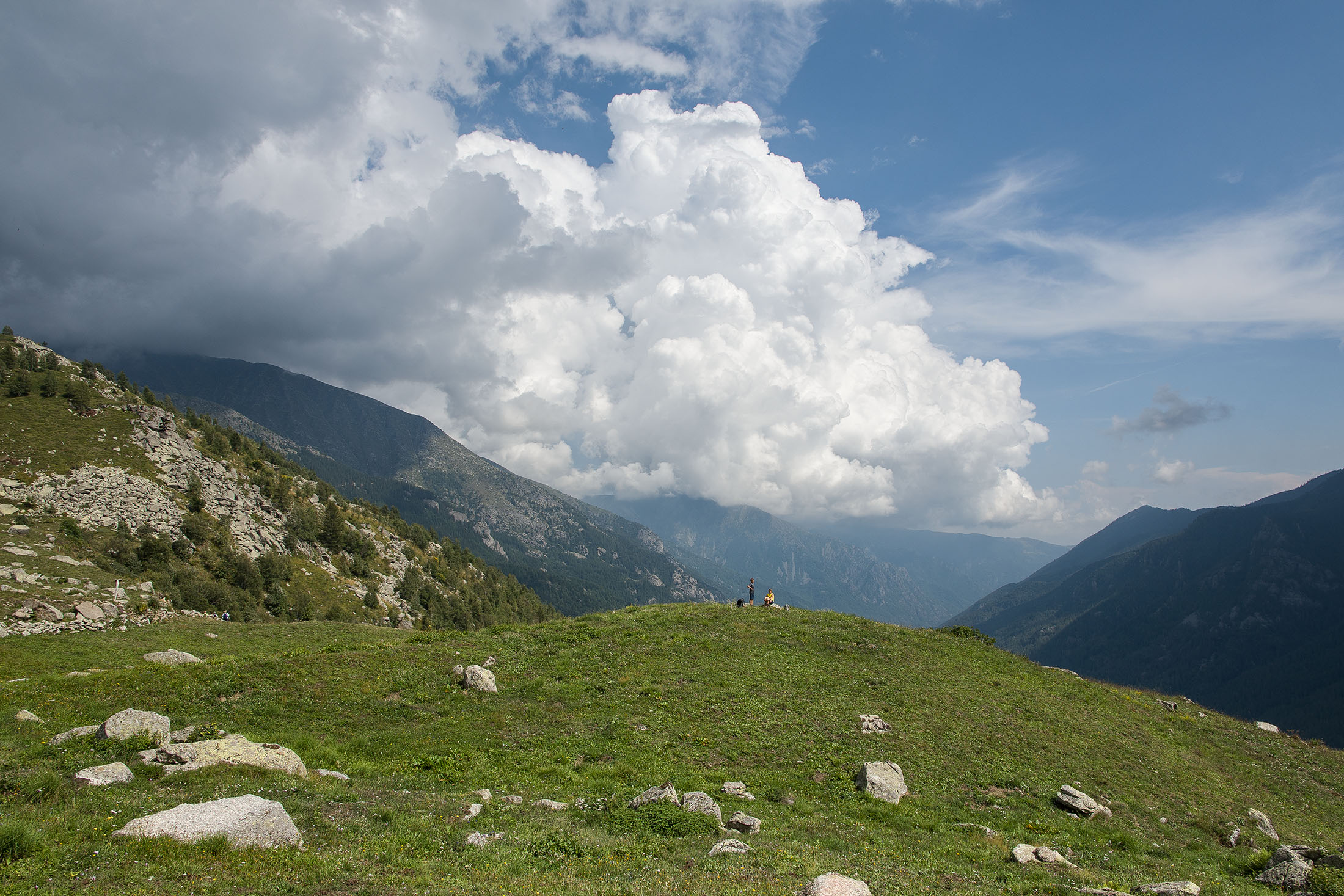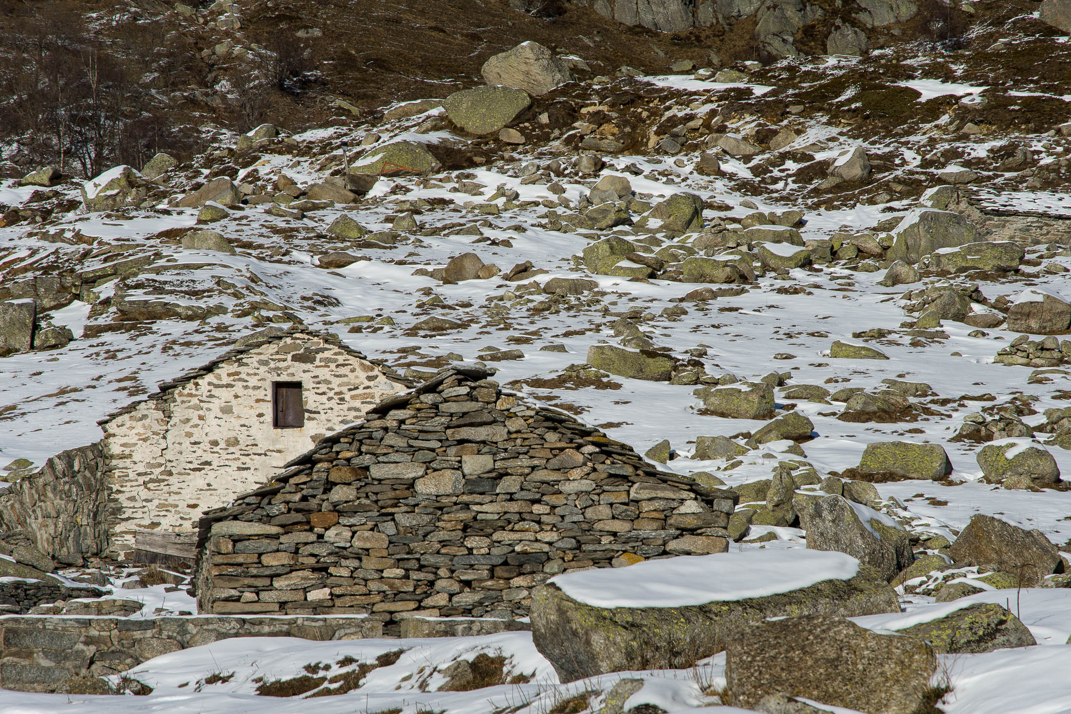 Über einige Serpentinen windet sich der Weg weiter talaufwärts, das Panorama wird immer eindrücklicher. Mit jedem Schritt nähert man sich dem Alpenhauptkamm mit der Gipfelkette zwischen der Uja di Ciamarella (3676 m) und der Levanna Orientale (3555 m), eine gigantische Kulisse mit vielen wilden Graten und Türmen. Es folgt ein längerer flacherer Wegabschnitt, die Hänge sind übersät von Geröllfeldern, ringsherum liegen riesige Steine in der Landschaft rum. Dann ein besonders auffälliger Felsbrocken, man könnte meinen, hier wäre ein Meteorit eingeschlagen. In der Nähe plätschert der Rio Sagnasse zu Tal, auf den von vielen Rinnsalen durchzogenen Feuchtwiesen blühen im Frühsommer Alpen-Kuhschellen, Enzian, Schlangen-Knöterich und Trollblumen. Zwei Kurven weiter oberhalb die aufgegebenen Hütten der Gias Crest (1880 m), ein Kuhstall ist noch intakt, das Schicksal der anderen Gebäude ist bereits besiegelt. Zurück bleiben zerborstene Dachbalken und herumliegende Trümmer. Dann erreicht man den Rand einer weiten Hochebene, ein wenig unterhalb die steinernen Hütten der in den Sommermonaten bewirtschafteten Alpe Pià Nou (1853 m), wo um diese Zeit zahlreiche Kühe und Rinder auf den umliegenden Weiden grasen. Im weiteren Verlauf überquert man die riesigen Alphochflächen der Gias dei Signori und der Gias Sagnasse. Jenseits davon umrundet der Sentiero Balcone sanft ansteigend einen Geländerücken und endet schliesslich wenig später bei den archaisch anmutenden Alpgebäuden der Gias Nuovo Fontane (1986 m). Ein abgeschiedener und faszinierender Ort inmitten einer gewaltigen Hochgebirgslandschaft. Das Panorama ist umfassend, man überblickt nahezu das gesamte Val Grande di Lanzo, vom Monte Bellavarda im Osten bis zum Steilabfall des Alpenhauptkamms, der hier zum Greifen nah ist.