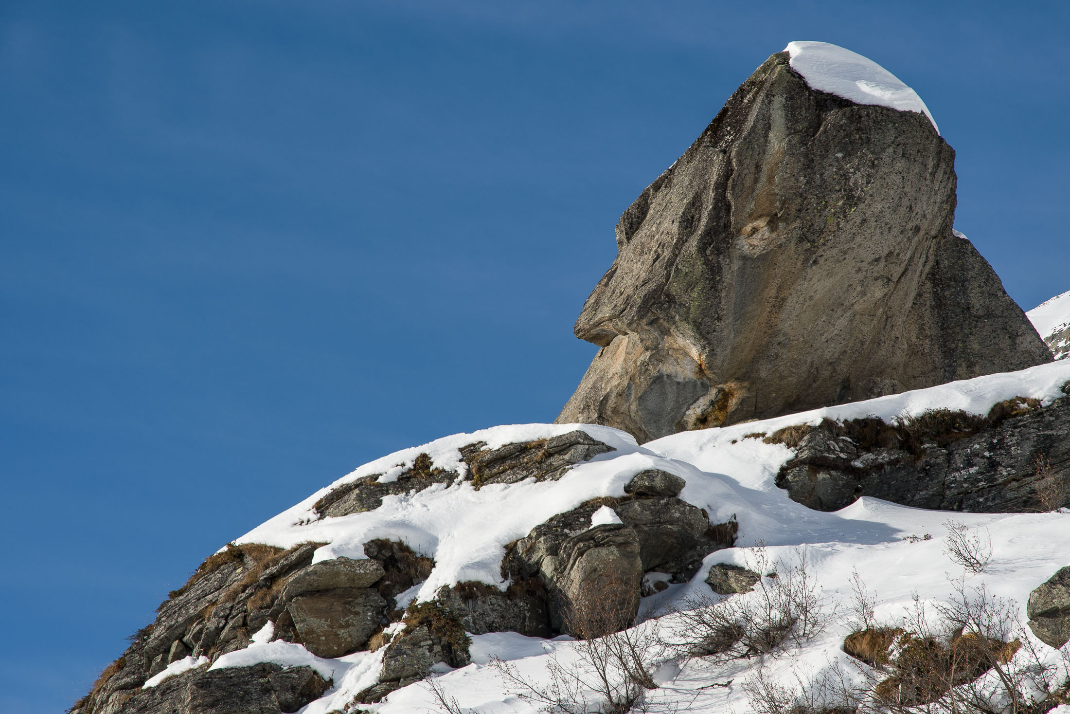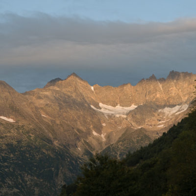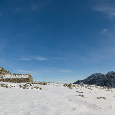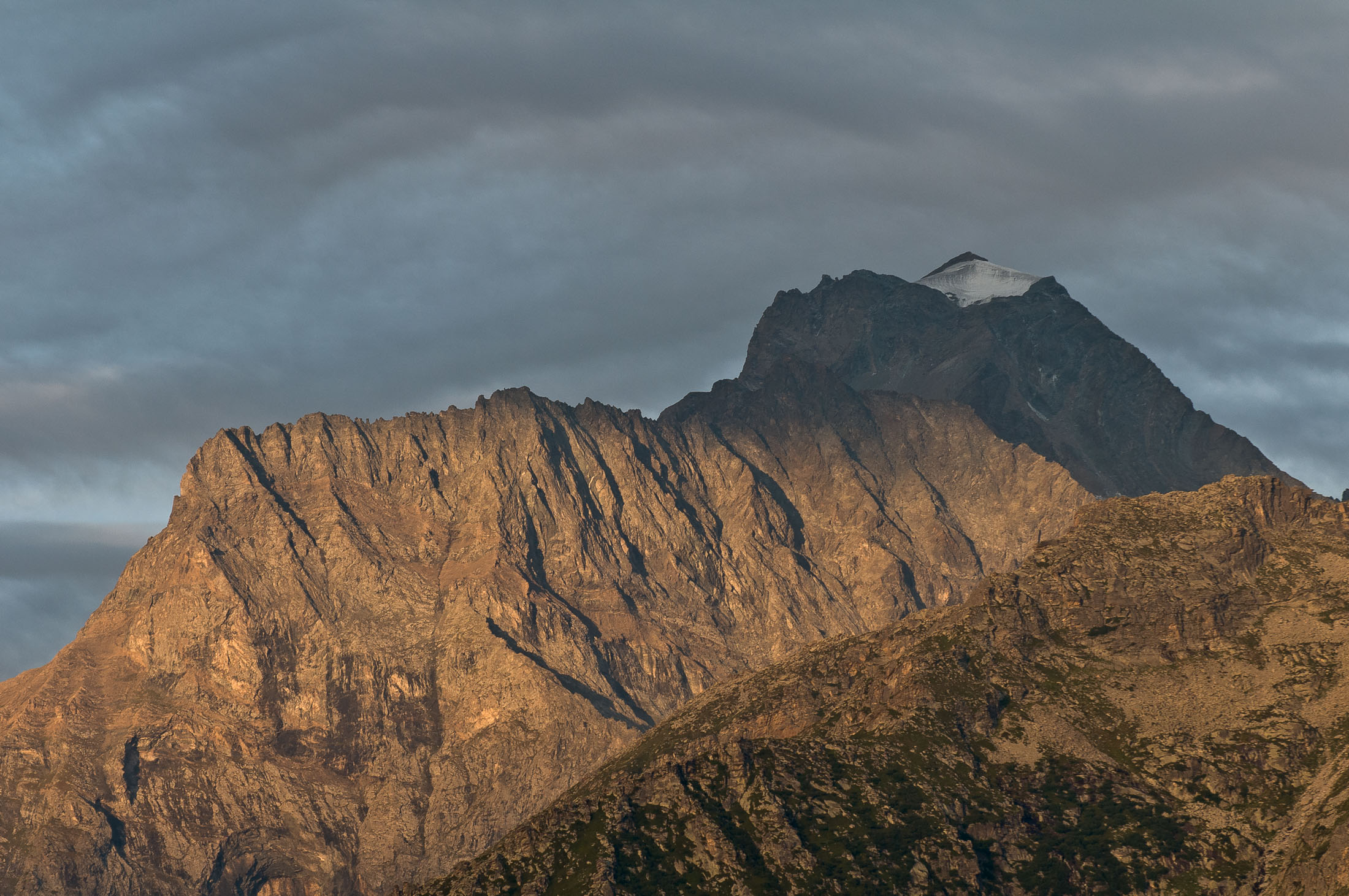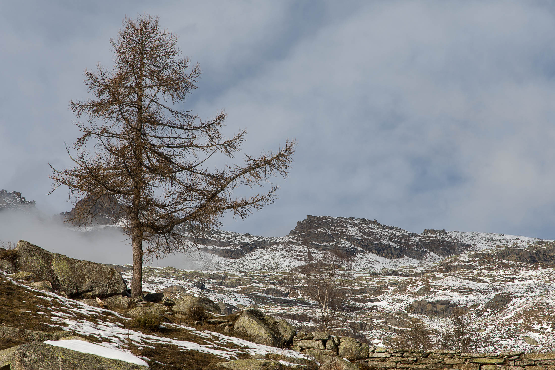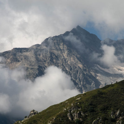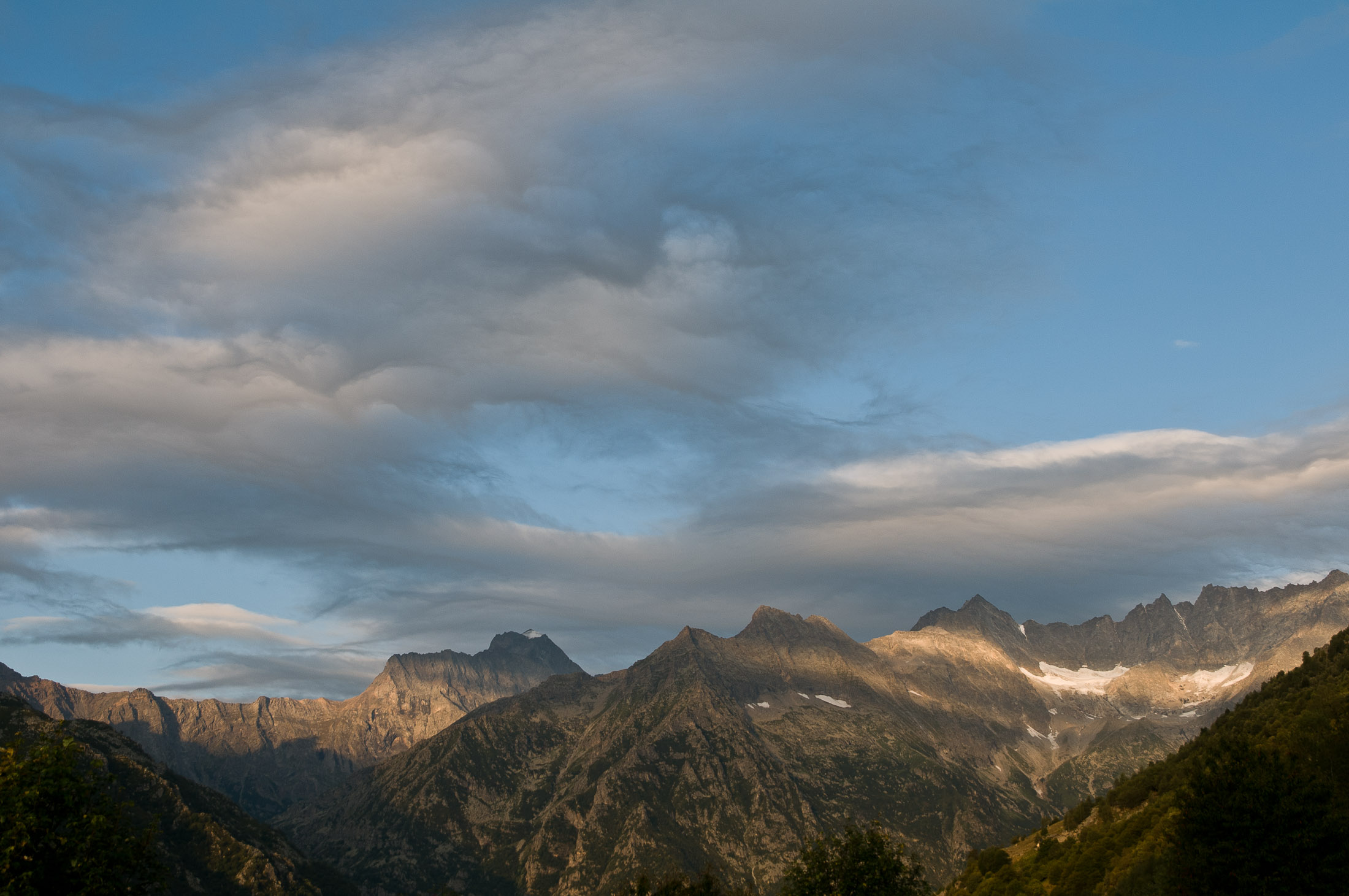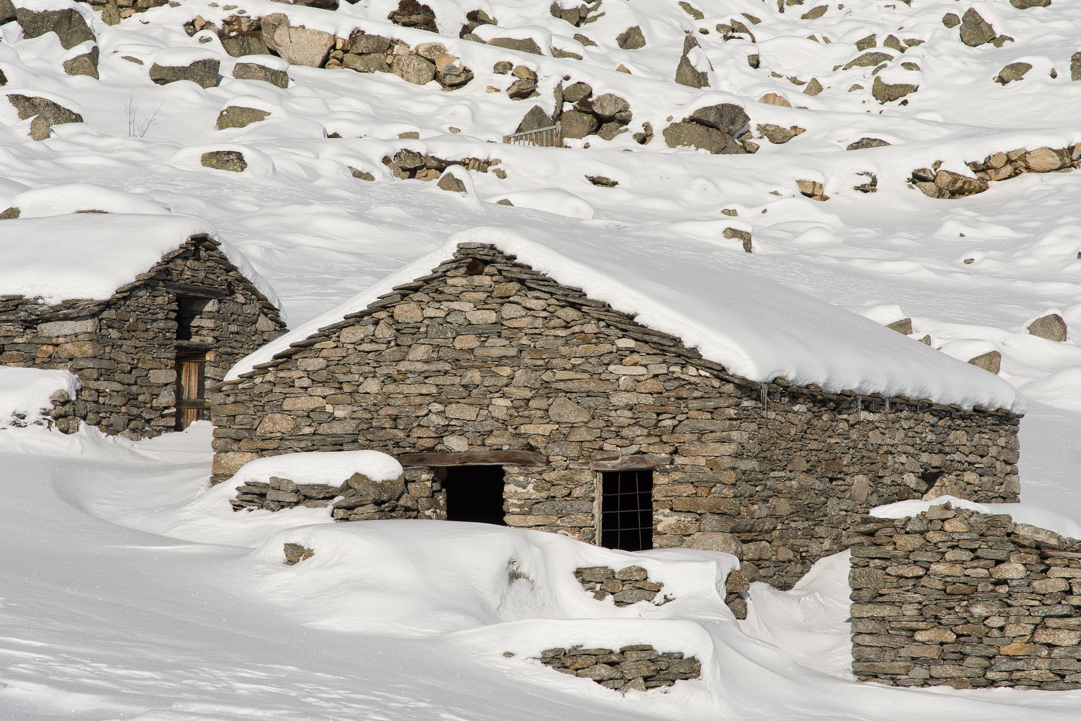 Über einige Serpentinen windet sich der Weg weiter talaufwärts, das Panorama wird immer eindrücklicher. Mit jedem Schritt nähert man sich dem Alpenhauptkamm mit der Gipfelkette zwischen der Uja di Ciamarella (3676 m) und der Levanna Orientale (3555 m), eine gigantische Kulisse mit vielen wilden Graten und Türmen. Es folgt ein längerer flacherer Wegabschnitt, die Hänge sind übersät von Geröllfeldern, ringsherum liegen riesige Steine in der Landschaft rum. Dann ein besonders auffälliger Felsbrocken, man könnte meinen, hier wäre ein Meteorit eingeschlagen. In der Nähe plätschert der Rio Sagnasse zu Tal, auf den von vielen Rinnsalen durchzogenen Feuchtwiesen blühen im Frühsommer Alpen-Kuhschellen, Enzian, Schlangen-Knöterich und Trollblumen. Zwei Kurven weiter oberhalb die aufgegebenen Hütten der Gias Crest (1880 m), ein Kuhstall ist noch intakt, das Schicksal der anderen Gebäude ist bereits besiegelt. Zurück bleiben zerborstene Dachbalken und herumliegende Trümmer. Dann erreicht man den Rand einer weiten Hochebene, ein wenig unterhalb die steinernen Hütten der in den Sommermonaten bewirtschafteten Alpe Pià Nou (1853 m), wo um diese Zeit zahlreiche Kühe und Rinder auf den umliegenden Weiden grasen. Im weiteren Verlauf überquert man die riesigen Alphochflächen der Gias dei Signori und der Gias Sagnasse. Jenseits davon umrundet der Sentiero Balcone sanft ansteigend einen Geländerücken und endet schliesslich wenig später bei den archaisch anmutenden Alpgebäuden der Gias Nuovo Fontane (1986 m). Ein abgeschiedener und faszinierender Ort inmitten einer gewaltigen Hochgebirgslandschaft. Das Panorama ist umfassend, man überblickt nahezu das gesamte Val Grande di Lanzo, vom Monte Bellavarda im Osten bis zum Steilabfall des Alpenhauptkamms, der hier zum Greifen nah ist.