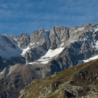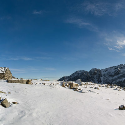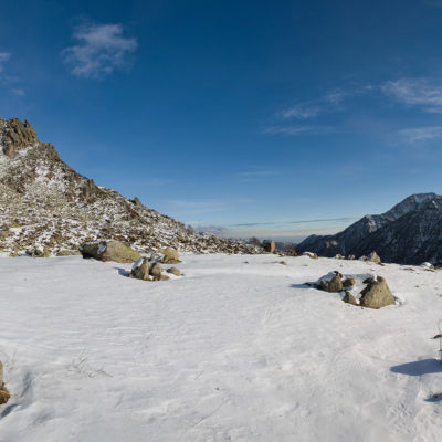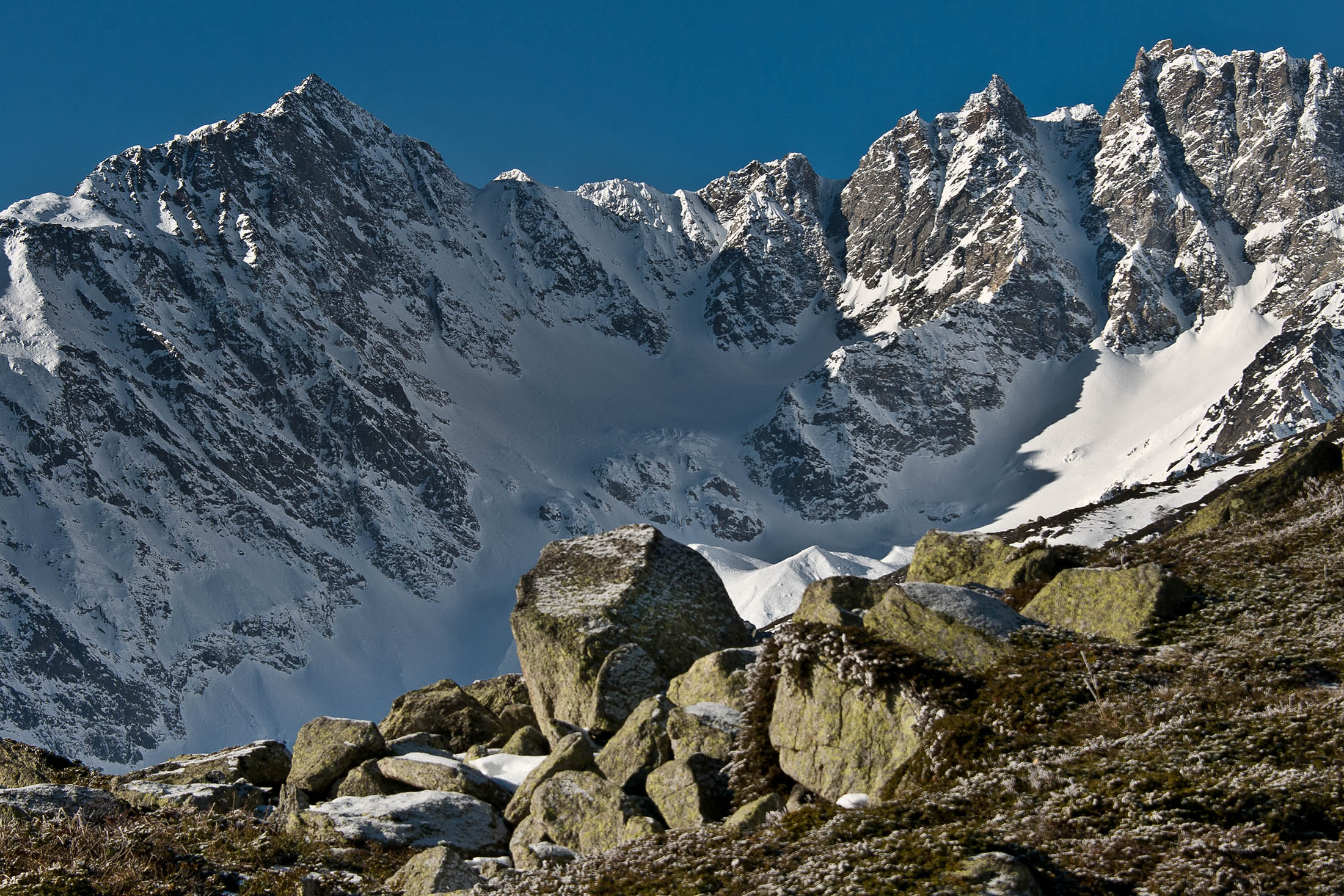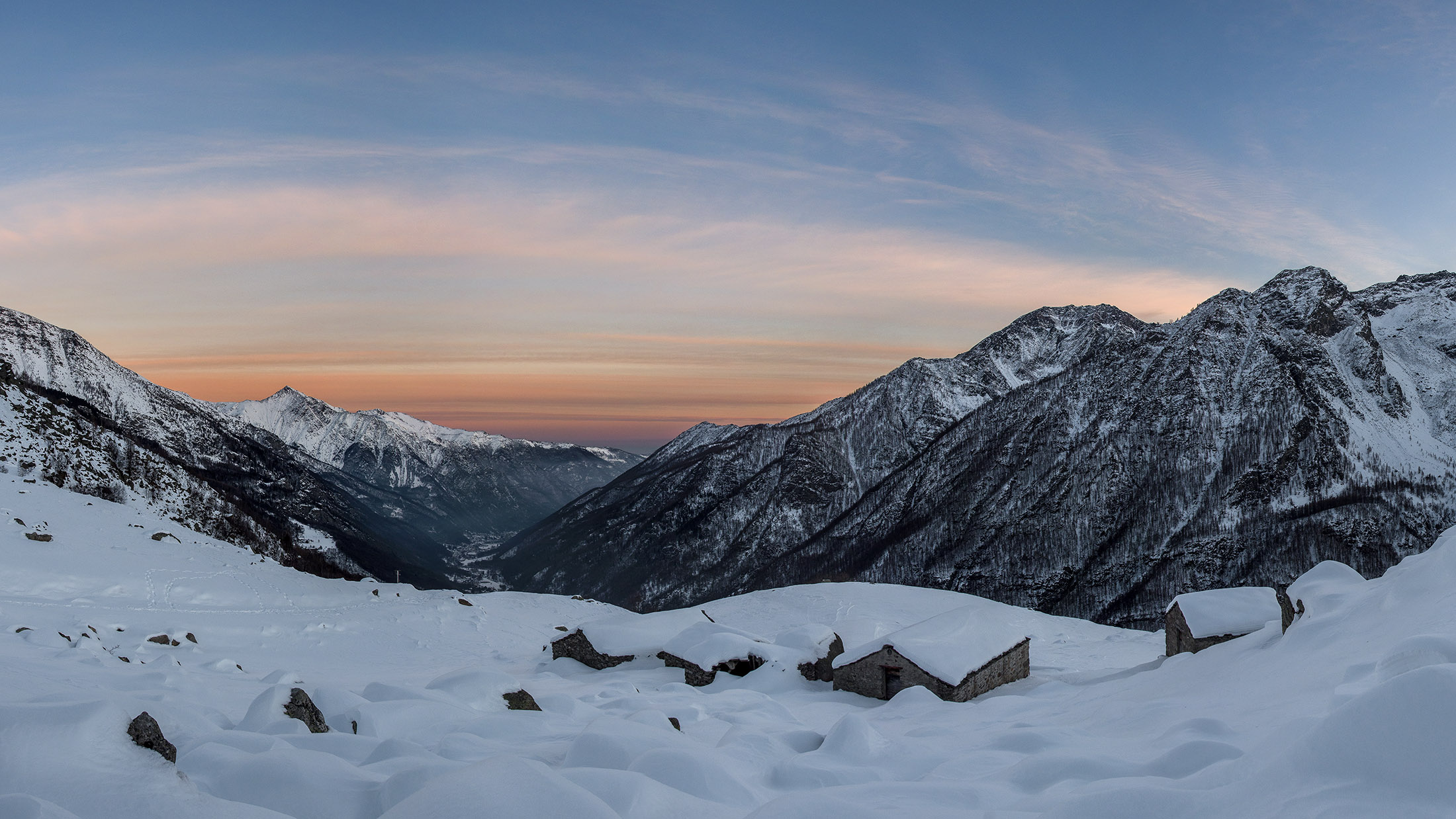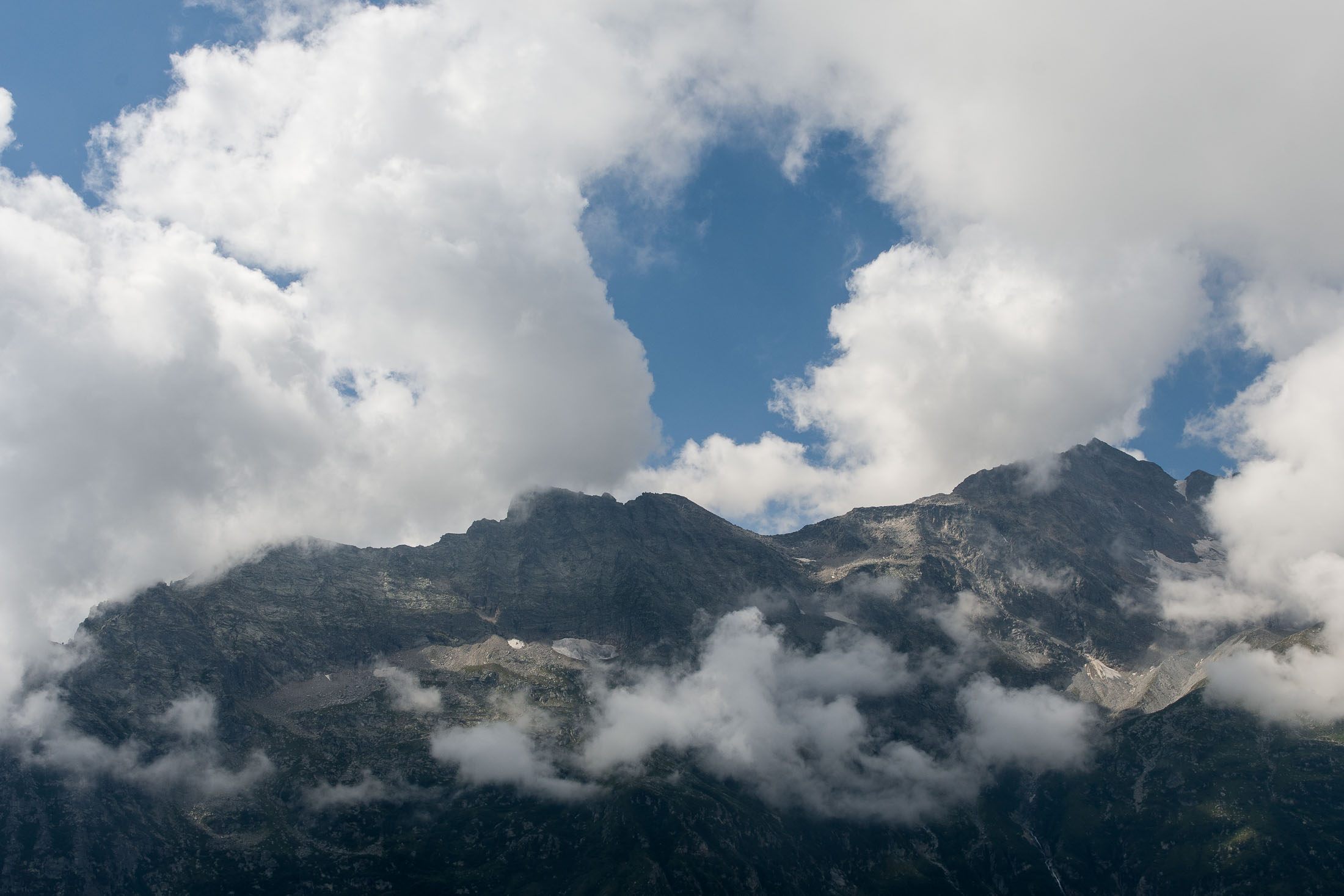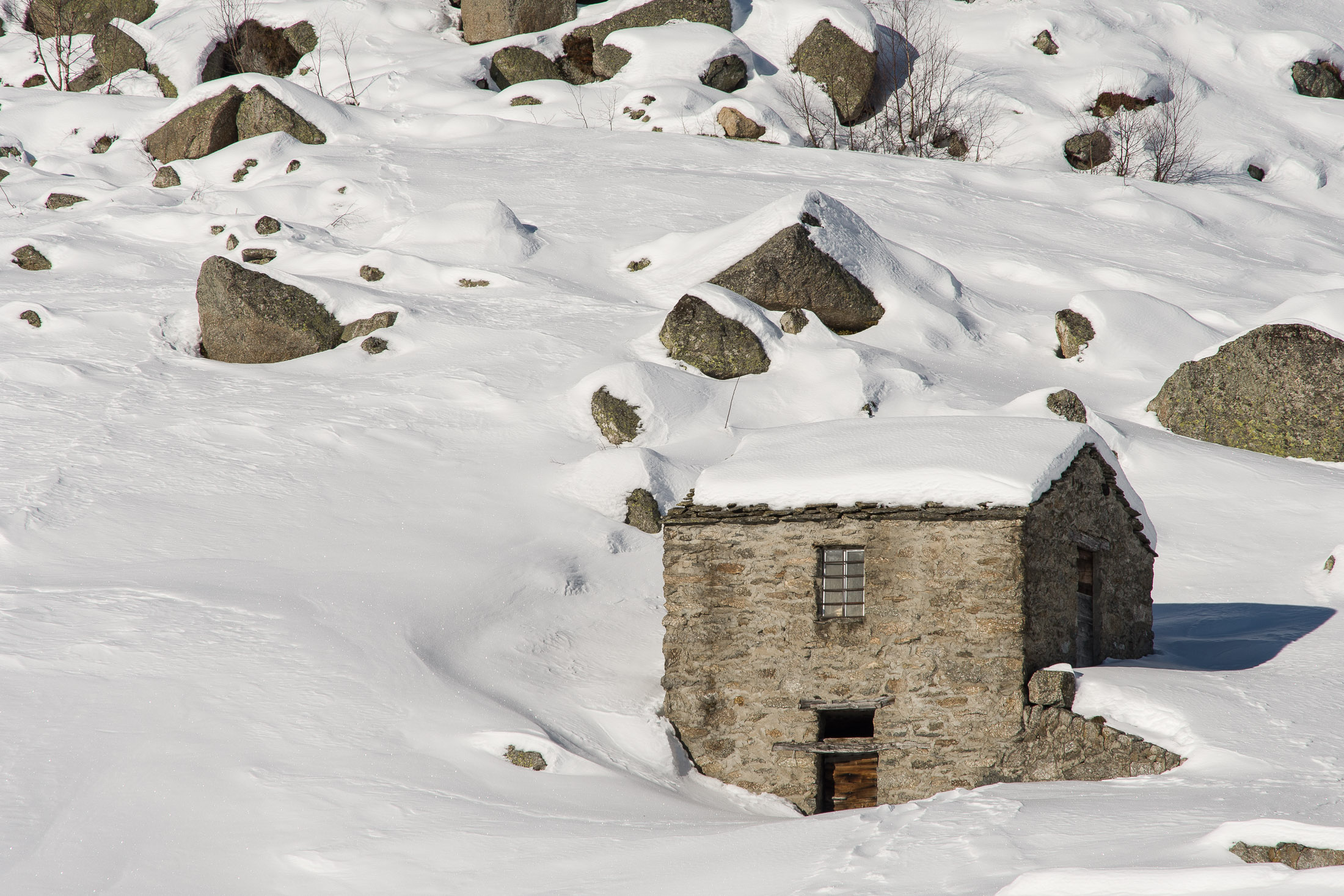 Über einige Serpentinen windet sich der Weg weiter talaufwärts, das Panorama wird immer eindrücklicher. Mit jedem Schritt nähert man sich dem Alpenhauptkamm mit der Gipfelkette zwischen der Uja di Ciamarella (3676 m) und der Levanna Orientale (3555 m), eine gigantische Kulisse mit vielen wilden Graten und Türmen. Es folgt ein längerer flacherer Wegabschnitt, die Hänge sind übersät von Geröllfeldern, ringsherum liegen riesige Steine in der Landschaft rum. Dann ein besonders auffälliger Felsbrocken, man könnte meinen, hier wäre ein Meteorit eingeschlagen. In der Nähe plätschert der Rio Sagnasse zu Tal, auf den von vielen Rinnsalen durchzogenen Feuchtwiesen blühen im Frühsommer Alpen-Kuhschellen, Enzian, Schlangen-Knöterich und Trollblumen. Zwei Kurven weiter oberhalb die aufgegebenen Hütten der Gias Crest (1880 m), ein Kuhstall ist noch intakt, das Schicksal der anderen Gebäude ist bereits besiegelt. Zurück bleiben zerborstene Dachbalken und herumliegende Trümmer. Dann erreicht man den Rand einer weiten Hochebene, ein wenig unterhalb die steinernen Hütten der in den Sommermonaten bewirtschafteten Alpe Pià Nou (1853 m), wo um diese Zeit zahlreiche Kühe und Rinder auf den umliegenden Weiden grasen. Im weiteren Verlauf überquert man die riesigen Alphochflächen der Gias dei Signori und der Gias Sagnasse. Jenseits davon umrundet der Sentiero Balcone sanft ansteigend einen Geländerücken und endet schliesslich wenig später bei den archaisch anmutenden Alpgebäuden der Gias Nuovo Fontane (1986 m). Ein abgeschiedener und faszinierender Ort inmitten einer gewaltigen Hochgebirgslandschaft. Das Panorama ist umfassend, man überblickt nahezu das gesamte Val Grande di Lanzo, vom Monte Bellavarda im Osten bis zum Steilabfall des Alpenhauptkamms, der hier zum Greifen nah ist.