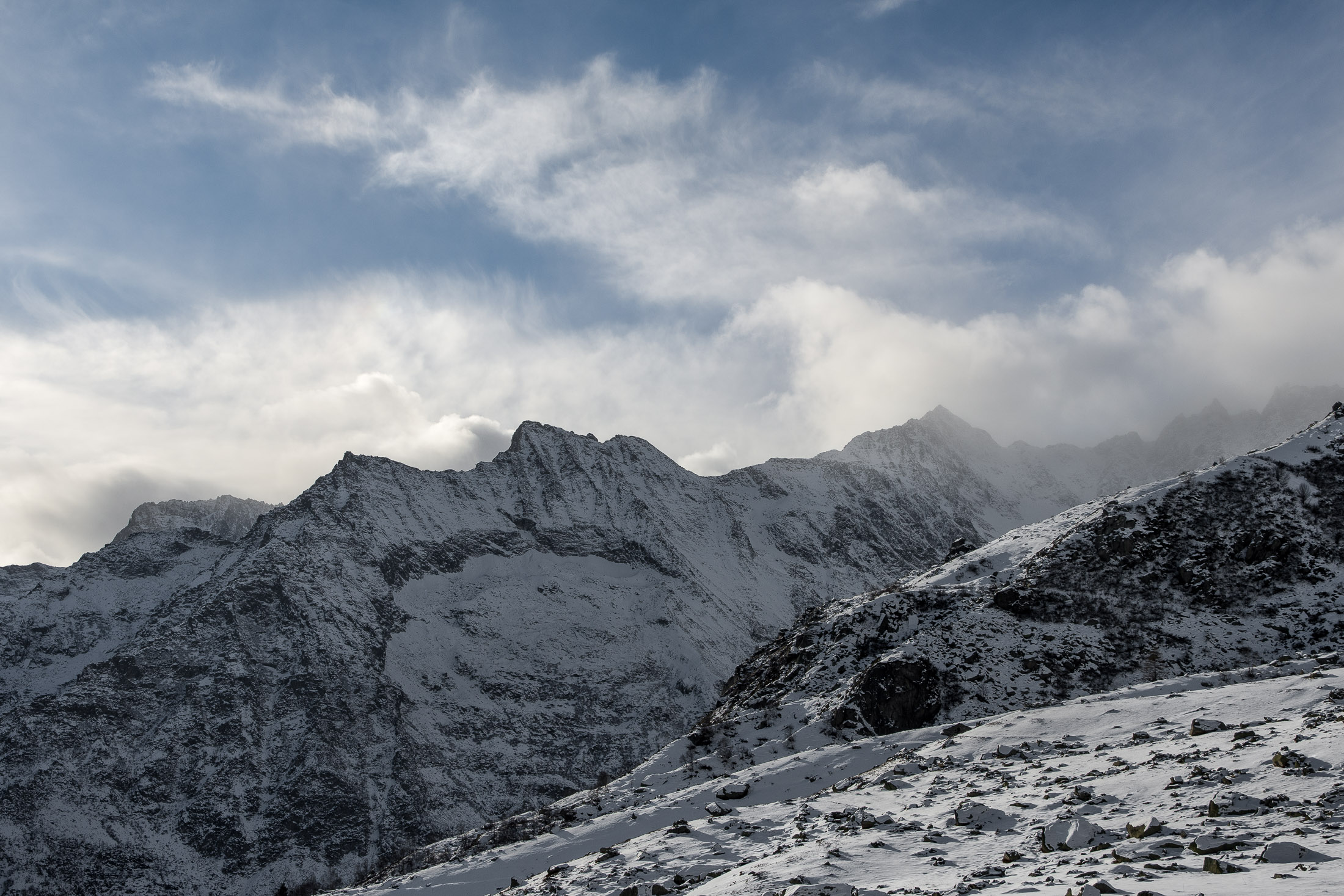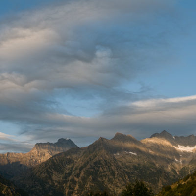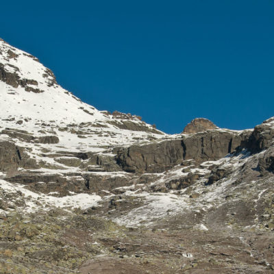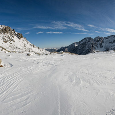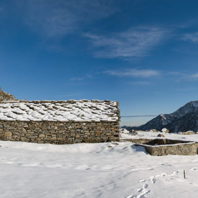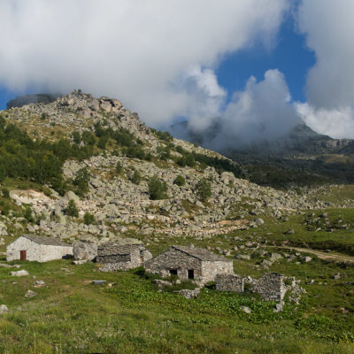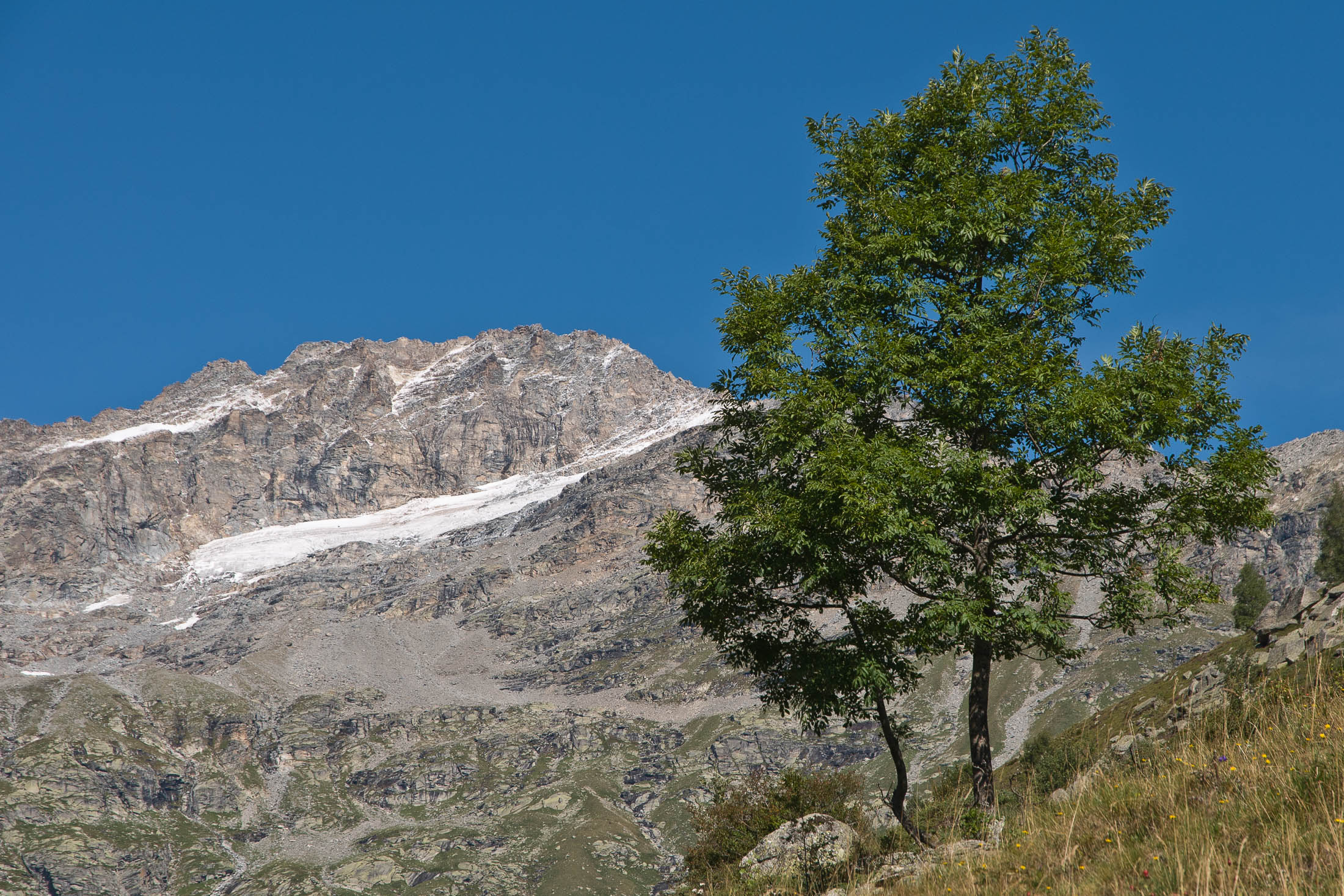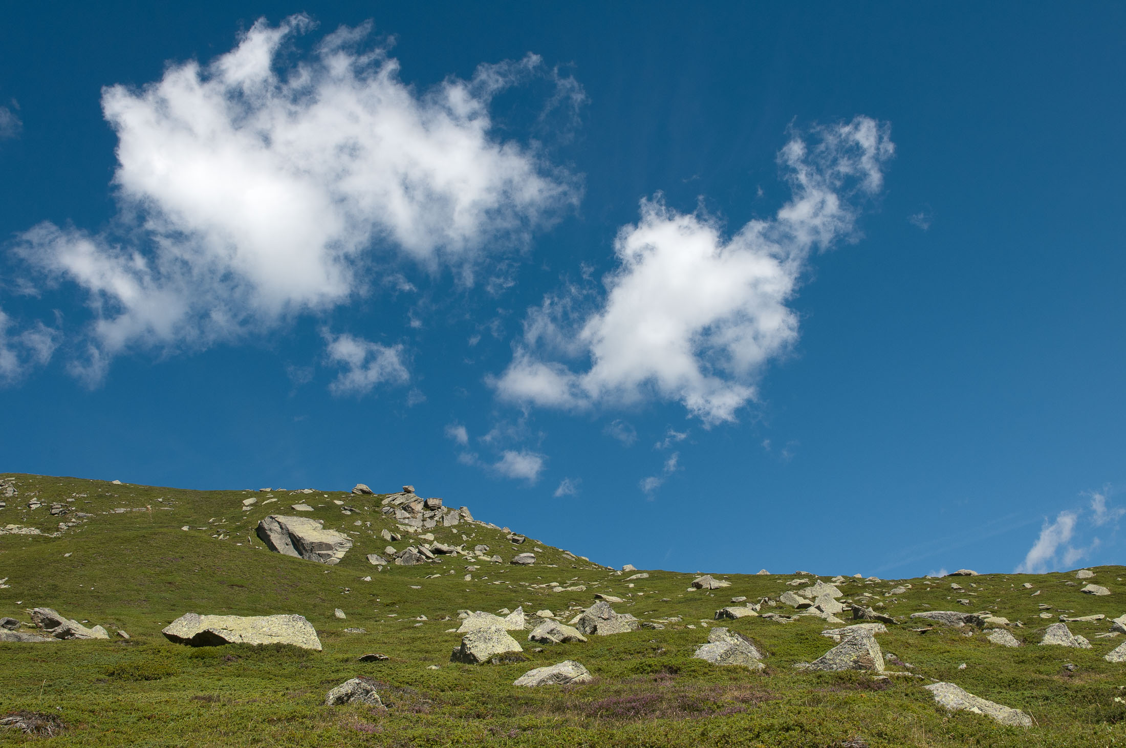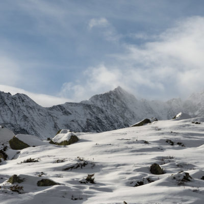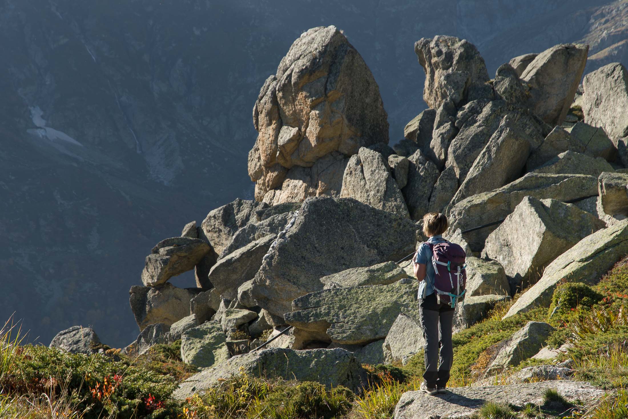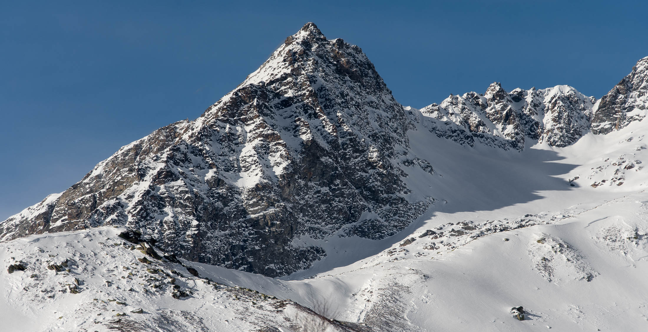 Über einige Serpentinen windet sich der Weg weiter talaufwärts, das Panorama wird immer eindrücklicher. Mit jedem Schritt nähert man sich dem Alpenhauptkamm mit der Gipfelkette zwischen der Uja di Ciamarella (3676 m) und der Levanna Orientale (3555 m), eine gigantische Kulisse mit vielen wilden Graten und Türmen. Es folgt ein längerer flacherer Wegabschnitt, die Hänge sind übersät von Geröllfeldern, ringsherum liegen riesige Steine in der Landschaft rum. Dann ein besonders auffälliger Felsbrocken, man könnte meinen, hier wäre ein Meteorit eingeschlagen. In der Nähe plätschert der Rio Sagnasse zu Tal, auf den von vielen Rinnsalen durchzogenen Feuchtwiesen blühen im Frühsommer Alpen-Kuhschellen, Enzian, Schlangen-Knöterich und Trollblumen. Zwei Kurven weiter oberhalb die aufgegebenen Hütten der Gias Crest (1880 m), ein Kuhstall ist noch intakt, das Schicksal der anderen Gebäude ist bereits besiegelt. Zurück bleiben zerborstene Dachbalken und herumliegende Trümmer. Dann erreicht man den Rand einer weiten Hochebene, ein wenig unterhalb die steinernen Hütten der in den Sommermonaten bewirtschafteten Alpe Pià Nou (1853 m), wo um diese Zeit zahlreiche Kühe und Rinder auf den umliegenden Weiden grasen. Im weiteren Verlauf überquert man die riesigen Alphochflächen der Gias dei Signori und der Gias Sagnasse. Jenseits davon umrundet der Sentiero Balcone sanft ansteigend einen Geländerücken und endet schliesslich wenig später bei den archaisch anmutenden Alpgebäuden der Gias Nuovo Fontane (1986 m). Ein abgeschiedener und faszinierender Ort inmitten einer gewaltigen Hochgebirgslandschaft. Das Panorama ist umfassend, man überblickt nahezu das gesamte Val Grande di Lanzo, vom Monte Bellavarda im Osten bis zum Steilabfall des Alpenhauptkamms, der hier zum Greifen nah ist.