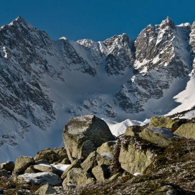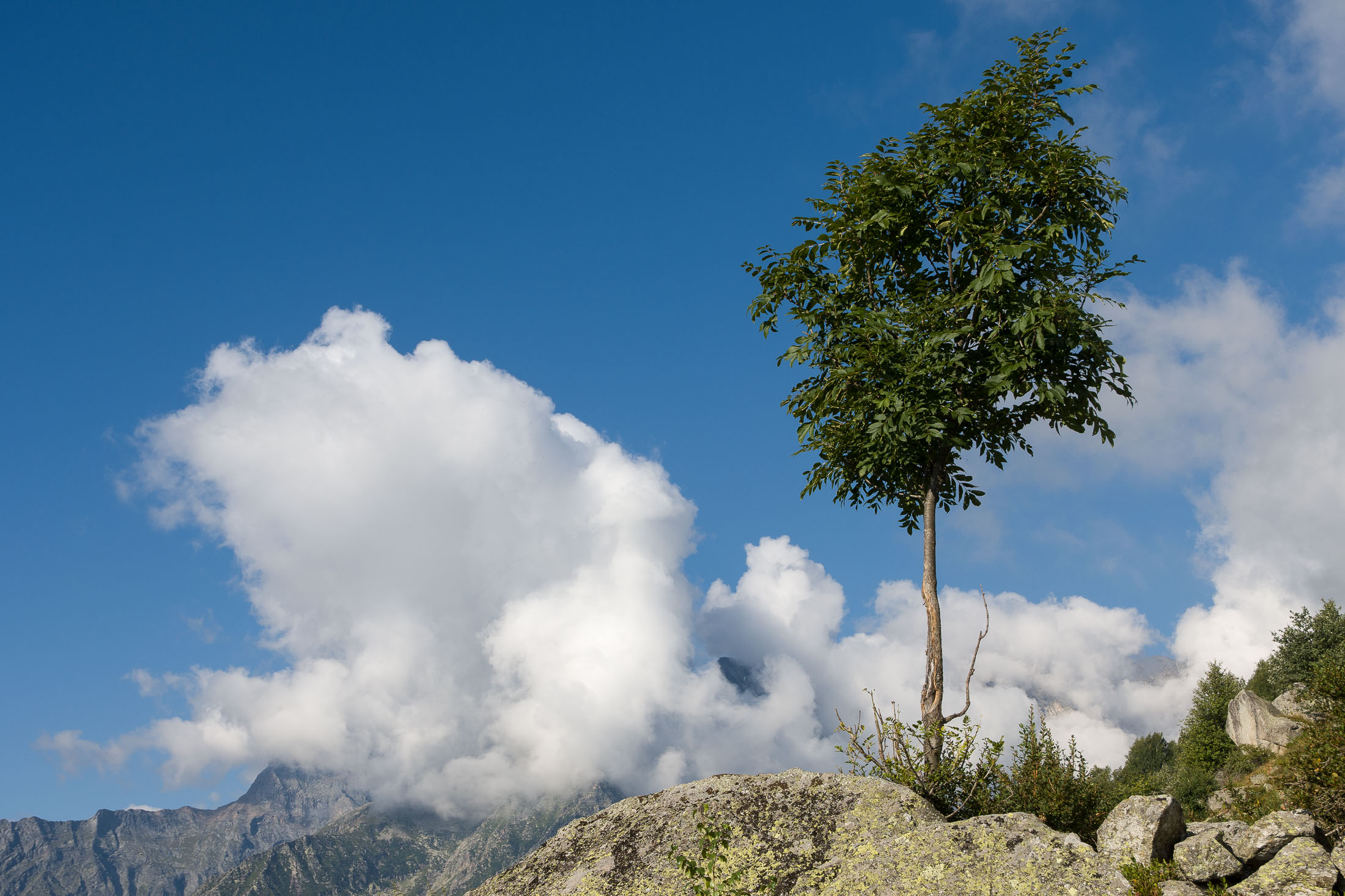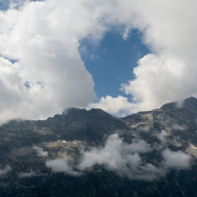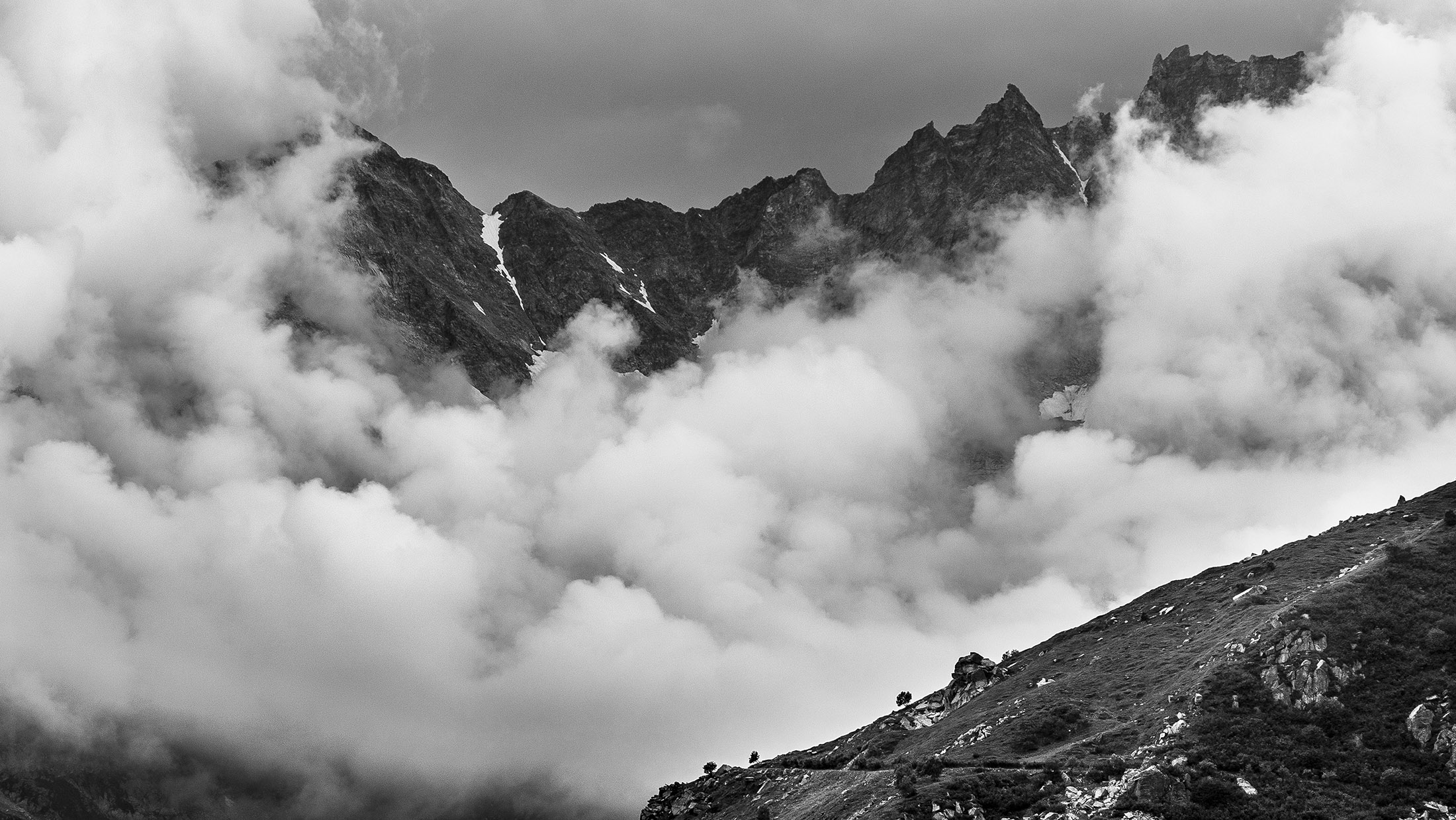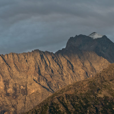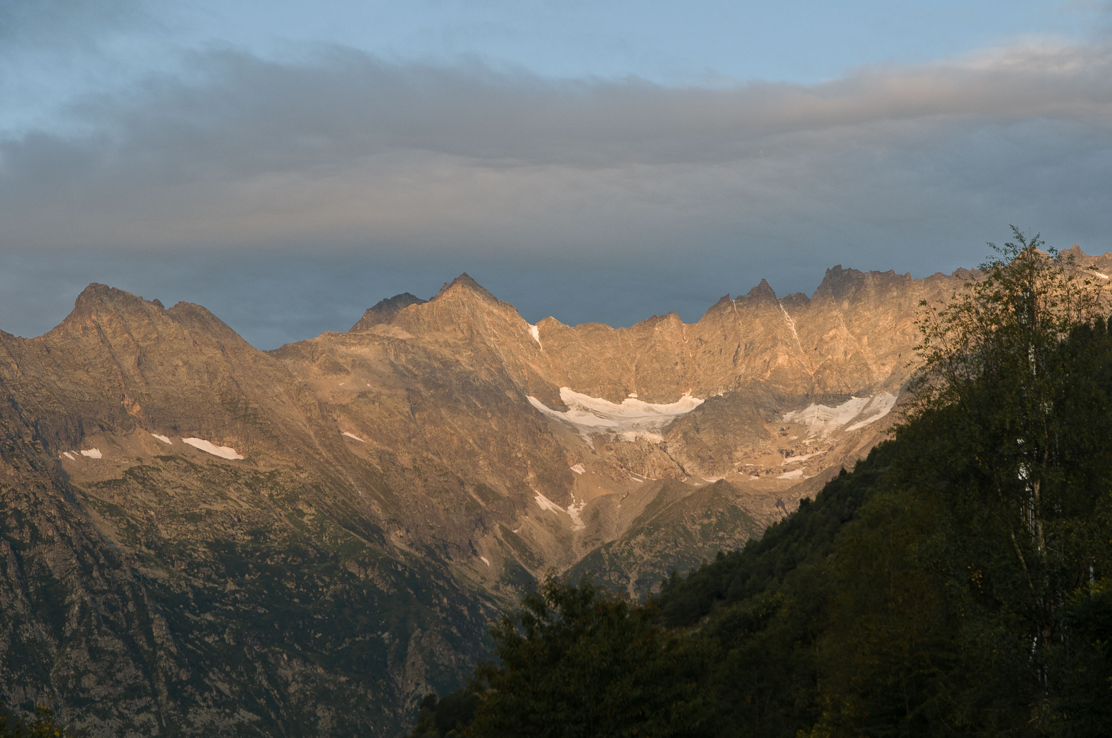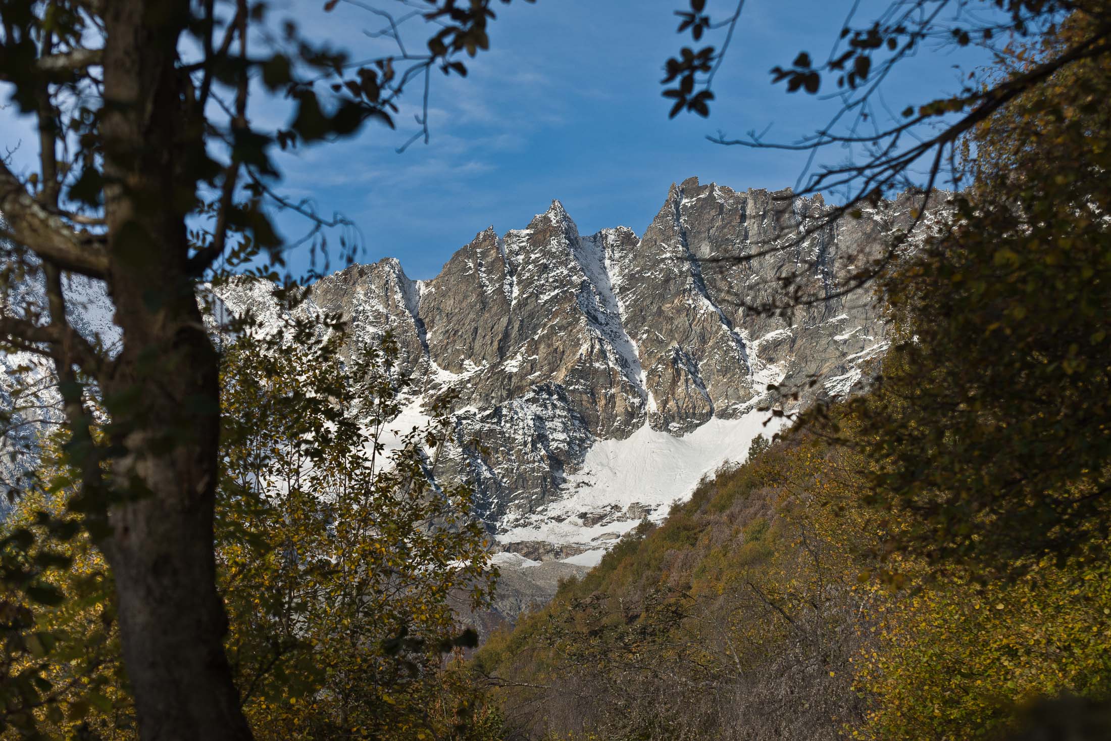 Über einige Serpentinen windet sich der Weg weiter talaufwärts, das Panorama wird immer eindrücklicher. Mit jedem Schritt nähert man sich dem Alpenhauptkamm mit der Gipfelkette zwischen der Uja di Ciamarella (3676 m) und der Levanna Orientale (3555 m), eine gigantische Kulisse mit vielen wilden Graten und Türmen. Es folgt ein längerer flacherer Wegabschnitt, die Hänge sind übersät von Geröllfeldern, ringsherum liegen riesige Steine in der Landschaft rum. Dann ein besonders auffälliger Felsbrocken, man könnte meinen, hier wäre ein Meteorit eingeschlagen. In der Nähe plätschert der Rio Sagnasse zu Tal, auf den von vielen Rinnsalen durchzogenen Feuchtwiesen blühen im Frühsommer Alpen-Kuhschellen, Enzian, Schlangen-Knöterich und Trollblumen. Zwei Kurven weiter oberhalb die aufgegebenen Hütten der Gias Crest (1880 m), ein Kuhstall ist noch intakt, das Schicksal der anderen Gebäude ist bereits besiegelt. Zurück bleiben zerborstene Dachbalken und herumliegende Trümmer. Dann erreicht man den Rand einer weiten Hochebene, ein wenig unterhalb die steinernen Hütten der in den Sommermonaten bewirtschafteten Alpe Pià Nou (1853 m), wo um diese Zeit zahlreiche Kühe und Rinder auf den umliegenden Weiden grasen. Im weiteren Verlauf überquert man die riesigen Alphochflächen der Gias dei Signori und der Gias Sagnasse. Jenseits davon umrundet der Sentiero Balcone sanft ansteigend einen Geländerücken und endet schliesslich wenig später bei den archaisch anmutenden Alpgebäuden der Gias Nuovo Fontane (1986 m). Ein abgeschiedener und faszinierender Ort inmitten einer gewaltigen Hochgebirgslandschaft. Das Panorama ist umfassend, man überblickt nahezu das gesamte Val Grande di Lanzo, vom Monte Bellavarda im Osten bis zum Steilabfall des Alpenhauptkamms, der hier zum Greifen nah ist.