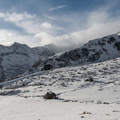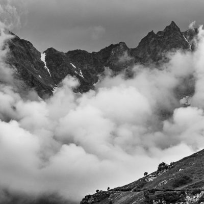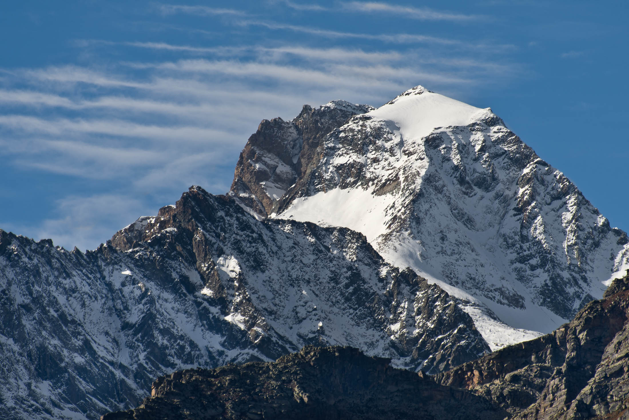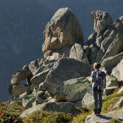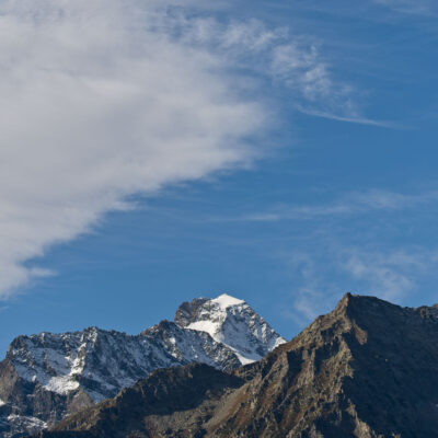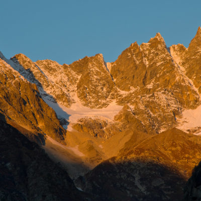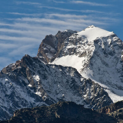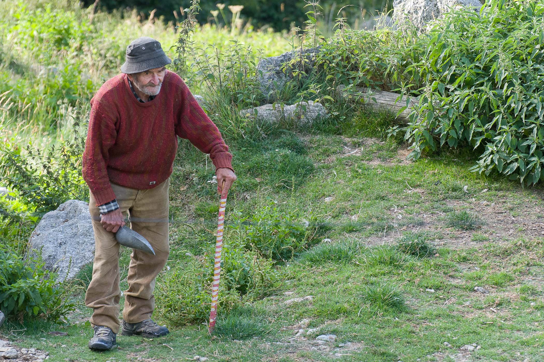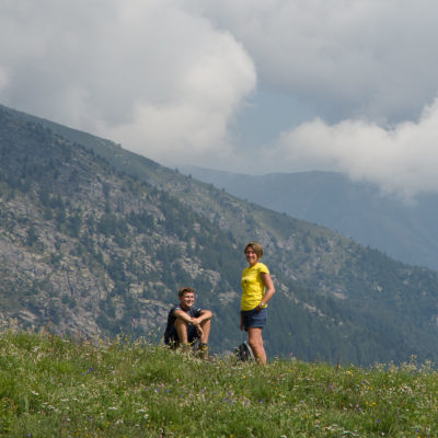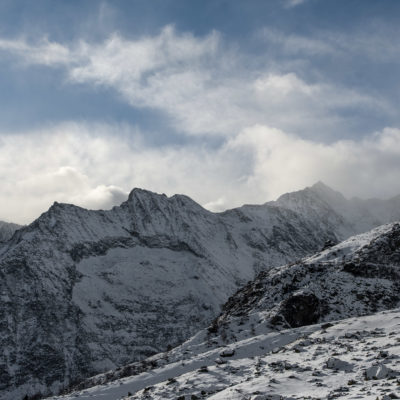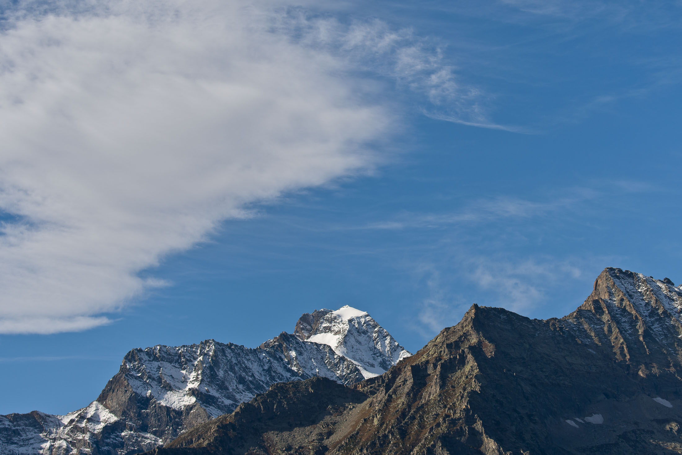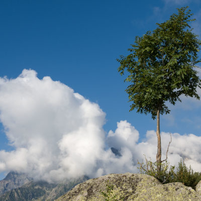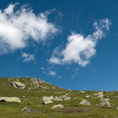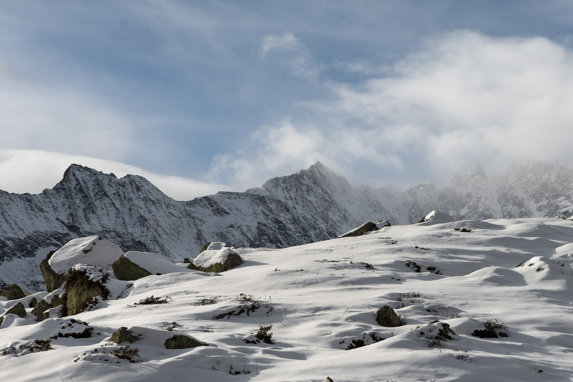 Über einige Serpentinen windet sich der Weg weiter talaufwärts, das Panorama wird immer eindrücklicher. Mit jedem Schritt nähert man sich dem Alpenhauptkamm mit der Gipfelkette zwischen der Uja di Ciamarella (3676 m) und der Levanna Orientale (3555 m), eine gigantische Kulisse mit vielen wilden Graten und Türmen. Es folgt ein längerer flacherer Wegabschnitt, die Hänge sind übersät von Geröllfeldern, ringsherum liegen riesige Steine in der Landschaft rum. Dann ein besonders auffälliger Felsbrocken, man könnte meinen, hier wäre ein Meteorit eingeschlagen. In der Nähe plätschert der Rio Sagnasse zu Tal, auf den von vielen Rinnsalen durchzogenen Feuchtwiesen blühen im Frühsommer Alpen-Kuhschellen, Enzian, Schlangen-Knöterich und Trollblumen. Zwei Kurven weiter oberhalb die aufgegebenen Hütten der Gias Crest (1880 m), ein Kuhstall ist noch intakt, das Schicksal der anderen Gebäude ist bereits besiegelt. Zurück bleiben zerborstene Dachbalken und herumliegende Trümmer. Dann erreicht man den Rand einer weiten Hochebene, ein wenig unterhalb die steinernen Hütten der in den Sommermonaten bewirtschafteten Alpe Pià Nou (1853 m), wo um diese Zeit zahlreiche Kühe und Rinder auf den umliegenden Weiden grasen. Im weiteren Verlauf überquert man die riesigen Alphochflächen der Gias dei Signori und der Gias Sagnasse. Jenseits davon umrundet der Sentiero Balcone sanft ansteigend einen Geländerücken und endet schliesslich wenig später bei den archaisch anmutenden Alpgebäuden der Gias Nuovo Fontane (1986 m). Ein abgeschiedener und faszinierender Ort inmitten einer gewaltigen Hochgebirgslandschaft. Das Panorama ist umfassend, man überblickt nahezu das gesamte Val Grande di Lanzo, vom Monte Bellavarda im Osten bis zum Steilabfall des Alpenhauptkamms, der hier zum Greifen nah ist.