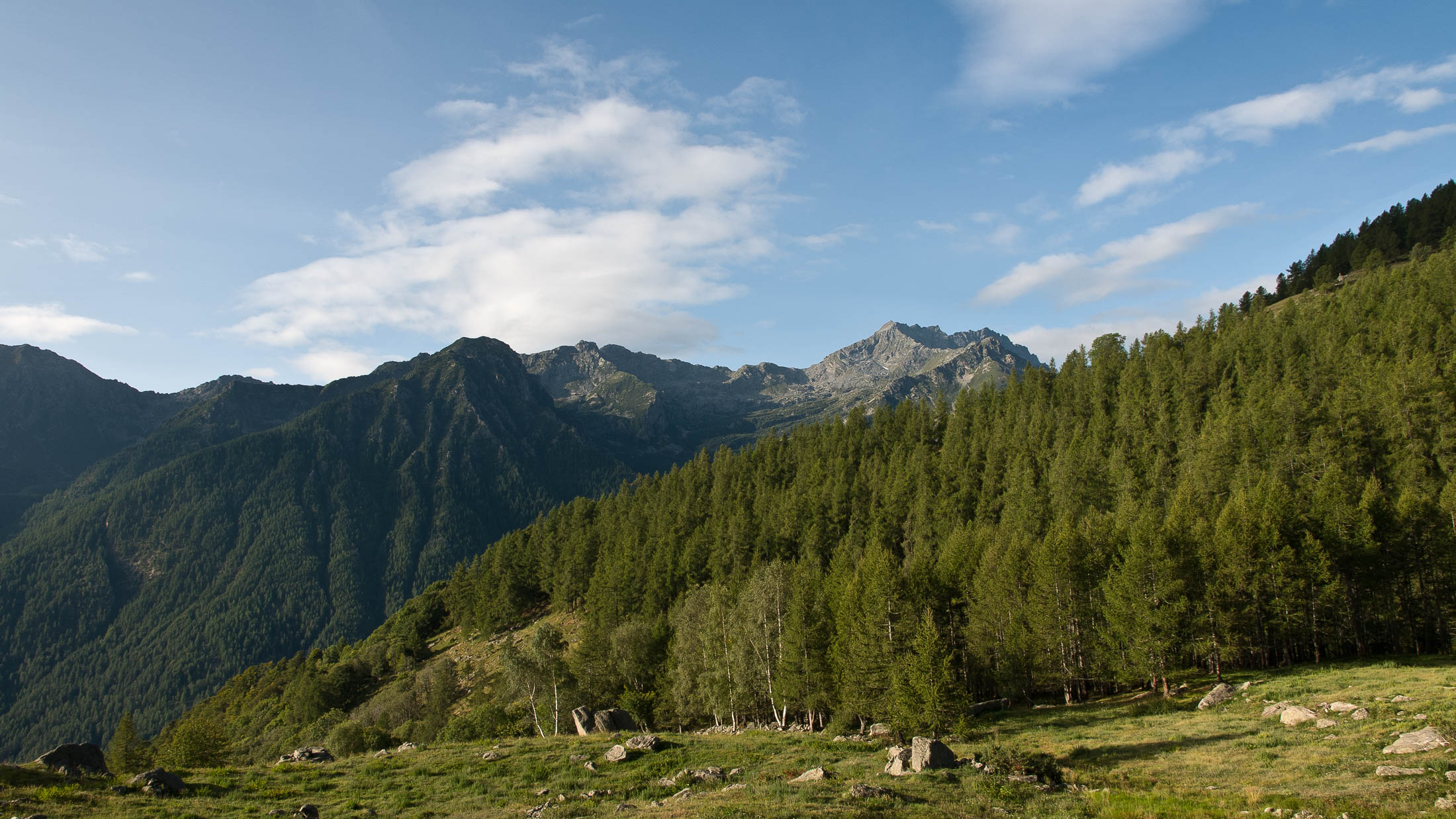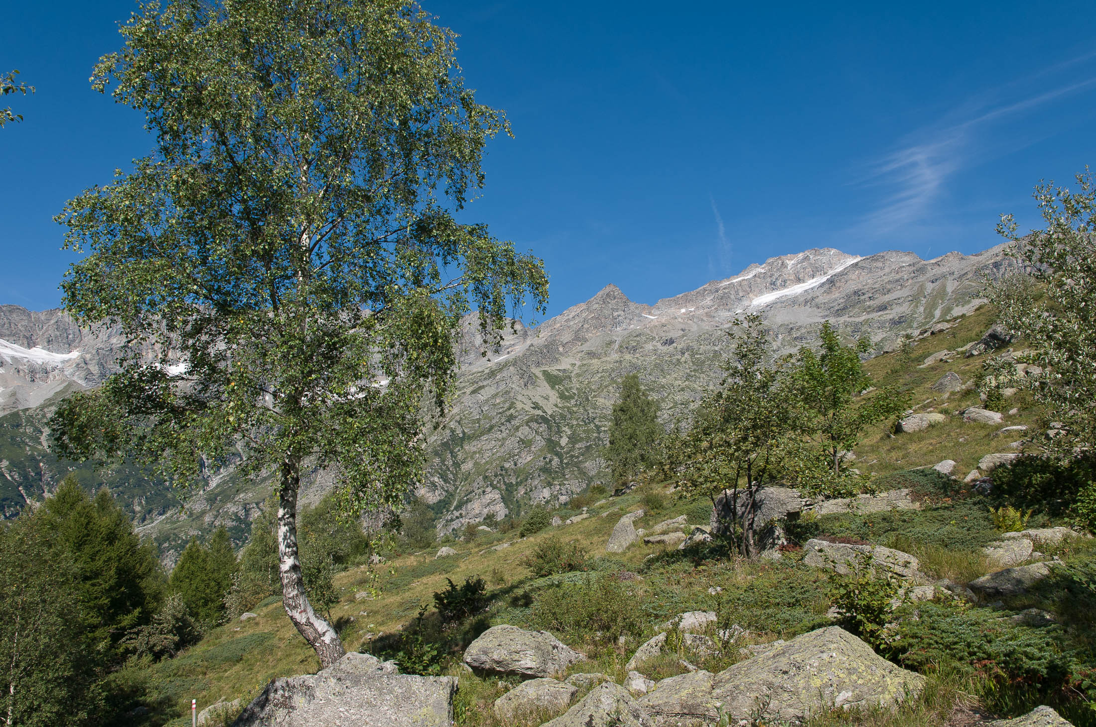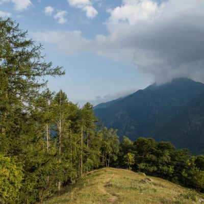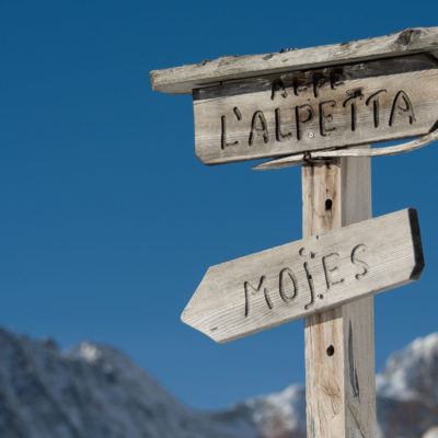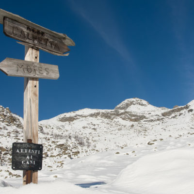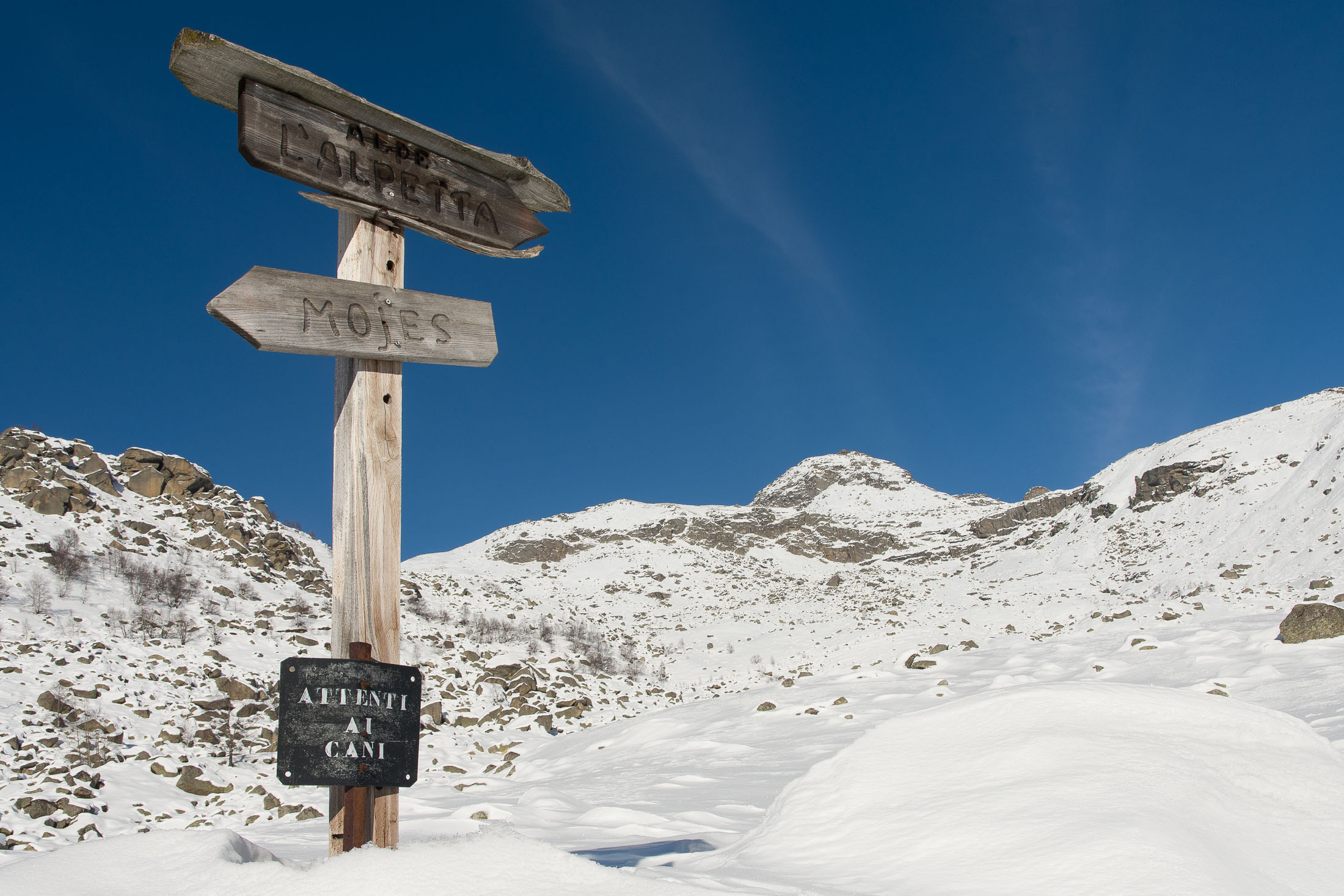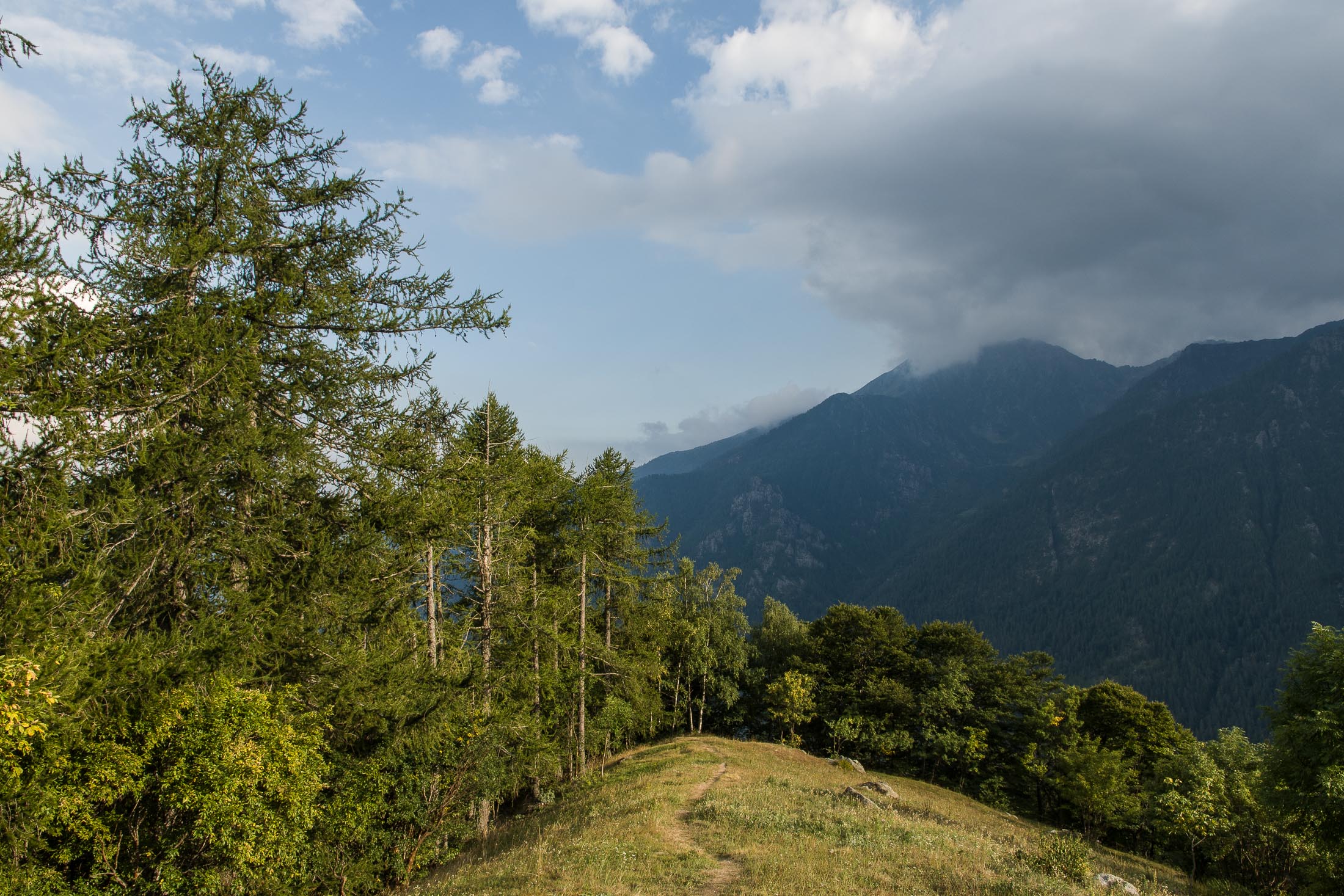 Von Rivotti folgt man zunächst den GTA-Wegweisern und geht in einer Viertelstunde nach Crest (1534 m), eine im Sommer bewirtschaftete Alp mit toller Aussicht auf die umliegenden Berge. Oberhalb der Alp überquert man die Fahrstrasse und wandert in weiteren 10 Minuten zu den teils restaurierten Hütten von Balmes (1604 m), unmittelbar am Talausgang des Vallone di Vercellina. An dieser Stelle erreicht man den sogenannten Sentiero Balcone, ein wunderschöner Höhenweg über dem oberen Val Grande di Lanzo, der erst etwa 6 km weiter westlich bei der Gias Nuovo Fontane endet. Er verläuft auf einem unbefestigten und für den öffentlichen Verkehr gesperrten Fahrweg, der gleichzeitig die Zufahrt zu den Alpgebieten oberhalb von Pialpetta, Groscavallo und Forno ist. Nach einem kurzen Wegstück durch lichten Birkenwald und verbuschendes Kulturland erreicht man bei den Alpgebäuden von Mojes (1705 m, in manchen Karten auch Le Moie genannt) offenes und aussichtsreiches Gelände. Mojes liegt am Rand des Vallone dell‘Alpetta, die saftigen Wiesen in diesem kleinen Seitental werden seit vielen Jahrhunderten als Weideland genutzt. In der Umgebung befinden sich weitere Alpgebiete, die Gias Primavera, die Gias Alpetta und die Gias Pian delle Cialme werden auch heute noch in den Sommermonaten bewirtschaftet.