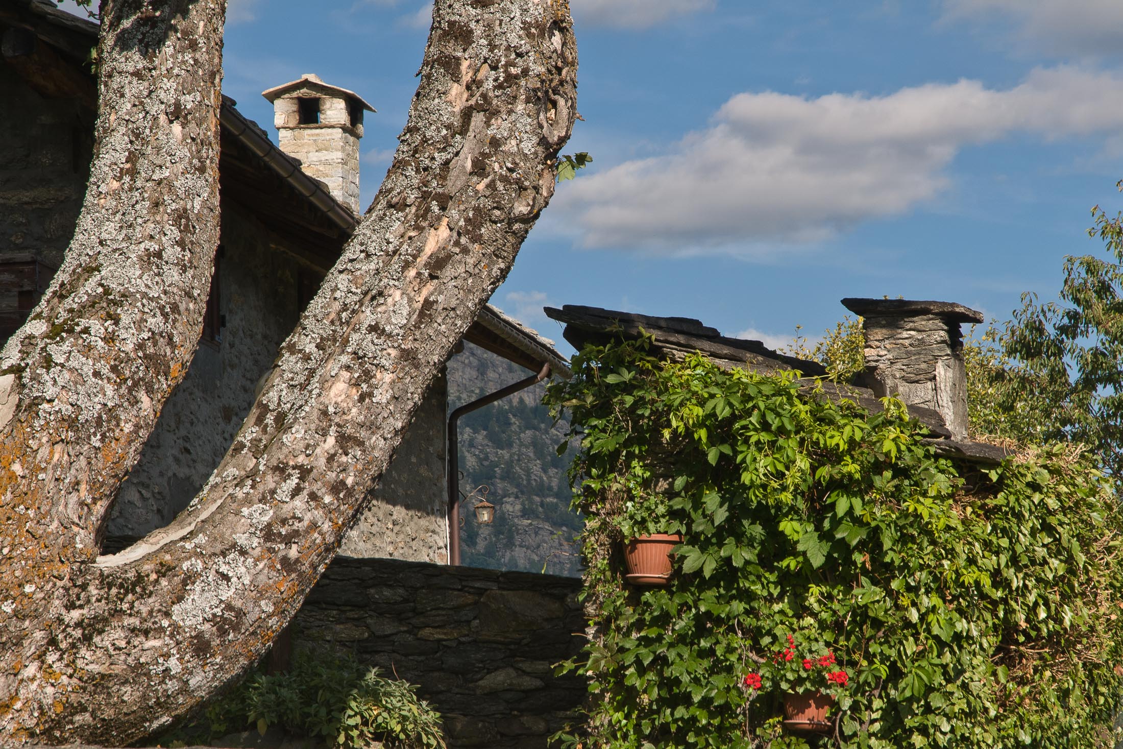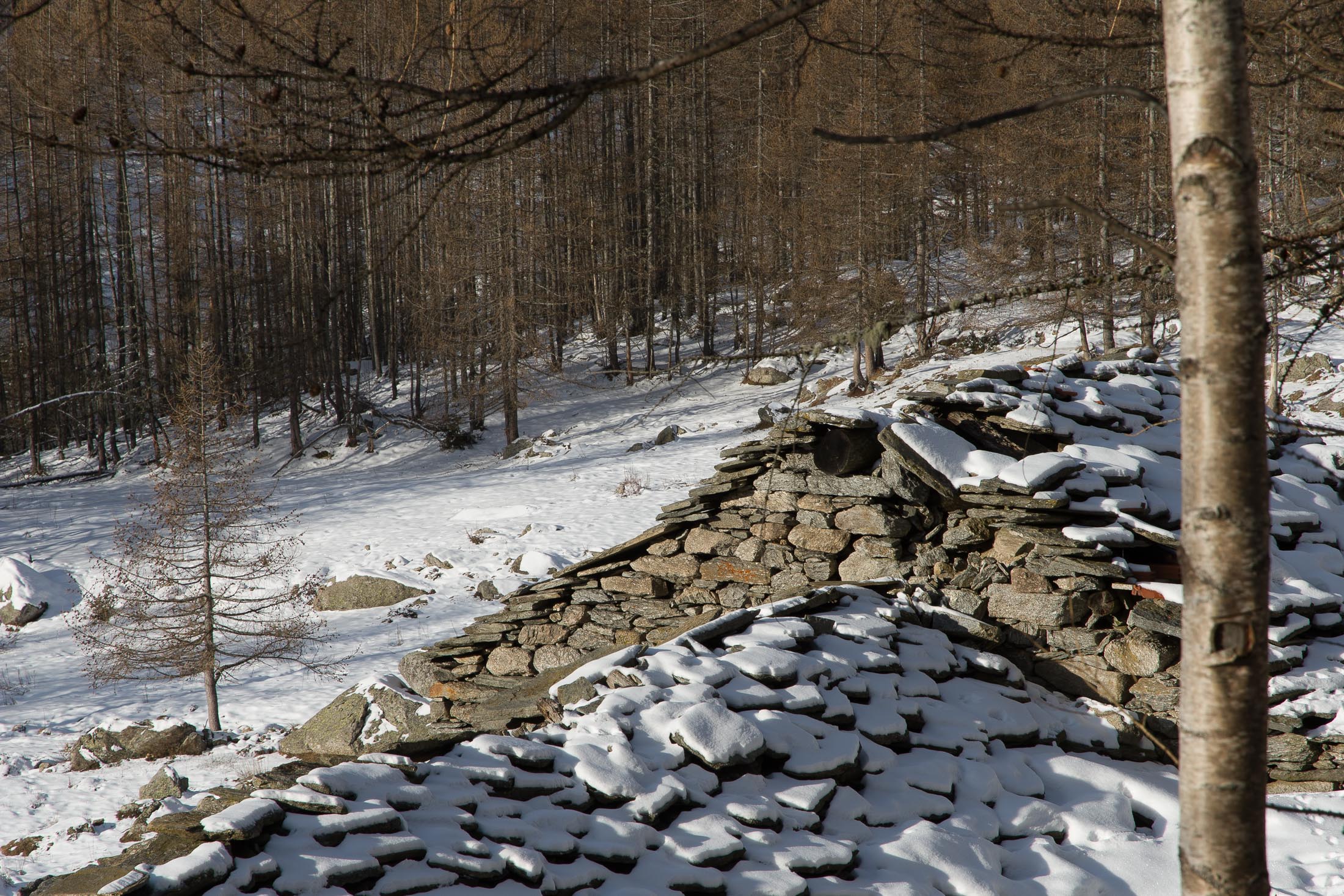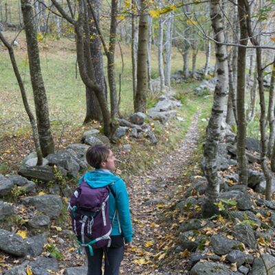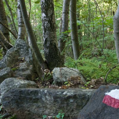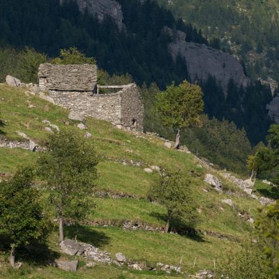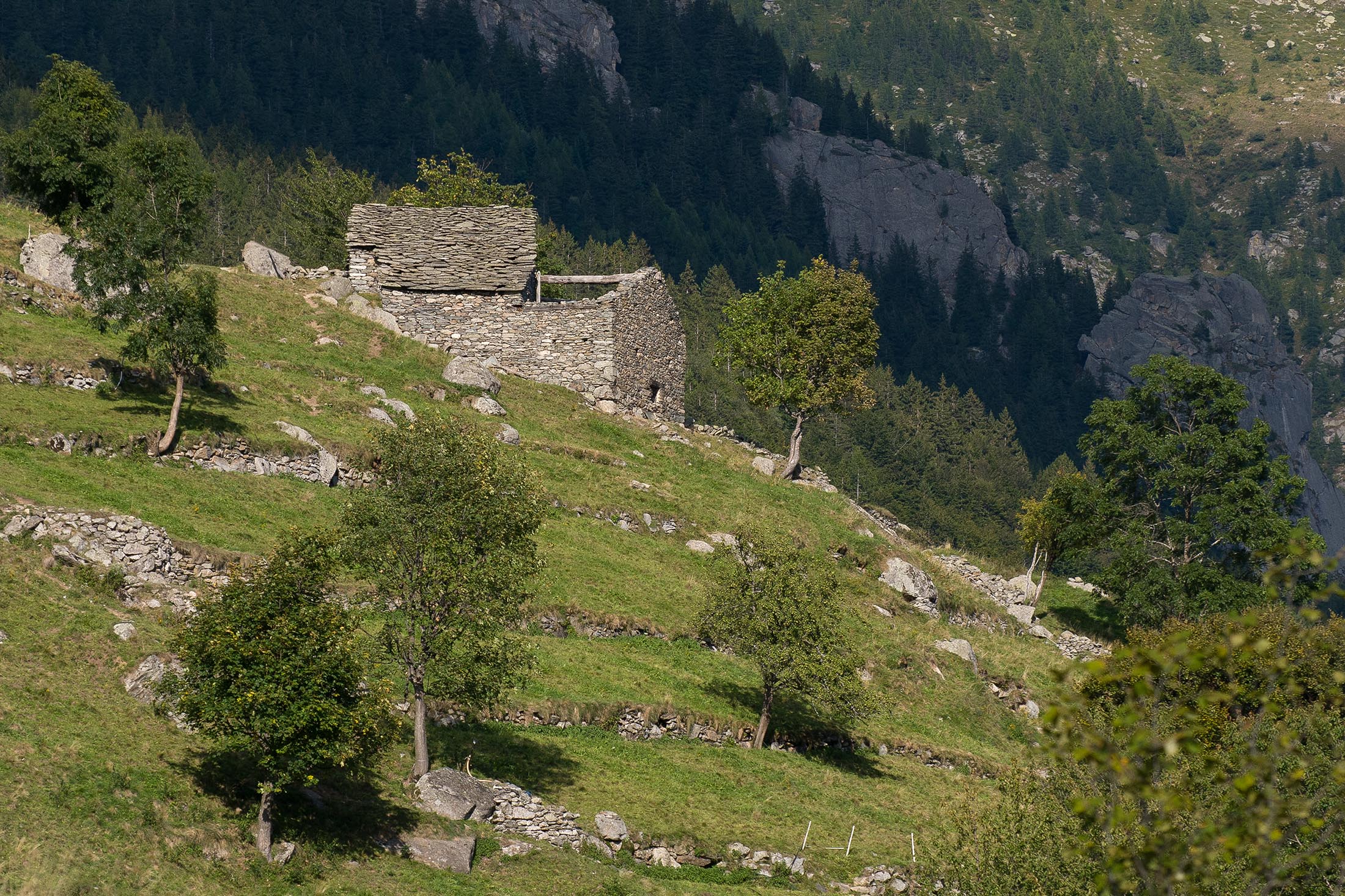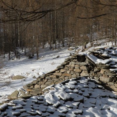 Von der Gias Nuovo Fontane (1986 m) hat man zwei Möglichkeiten, die Wanderung fortzusetzen, entweder man kehrt auf gleichem Weg nach Rivotti oder Alboni zurück, oder man steigt von hier nach Forno Alpi Graie ab, ein sehenswertes Bergdorf im Talboden des Val Grande di Lanzo. Um nach Forno zu gelangen, geht man zunächst eine Viertelstunde auf dem Aufstiegsweg zurück, an dem beschilderten Abzweig hält man sich rechts und steigt auf teils spärlichen Pfadspuren zwischen Wacholdersträuchern, Alpenrosen und verstreuten Lärchen hinab zur Gias Travet di sopra (1829 m). Der alte Alpweg wurde im Jahr 2016 von Freiwilligen des CAI di Lanzo freigeschnitten und neu markiert, bei Nebel sollte man hier dennoch aufpassen, dass man den nicht immer klar ersichtlichen Pfad nicht verliert. Durch verbuschendes ehemaliges Weideland steigt man weiter bis zur Gias Travet di sotto (1754 m) ab. Etwas unterhalb der Alphütten erreicht man den Waldrand, auf nun deutlich erkennbarem Pfad geht es weiterhin abwärts. Nach einer Weile kommt man zu einer ziemlich steilen Passage durch ein fast senkrecht Felsband, das nur an dieser Stelle passierbar ist. Der kurze Abschnitt ist ein wenig mühsam aber unschwierig, bei Nässe ist hier jedoch Trittsicherheit gefragt. Kaum zu glauben, dass man durch diesen schmalen Durchgang einst Tiere hinauf auf die Weiden getrieben hat. Der verbleibende Abstieg führt ohne weitere Schwierigkeiten durch schattigen Wald, schliesslich erreicht man den Talboden mit dem Fiume Stura di Val Grande. Auf einer wunderschönen gepflasterten Mulattiera (= Saumweg oder Maultierweg) wandert man auf der orografisch linken Seite des Flusses in Kürze nach Forno. Auffällig sind hier die grossen Murbrecher, dies sind Sperren im Fluss, die zwar Wasser hindurchlassen, aber keine grösseren Steine oder Baumstämme. Forno war am 24. September 1993 Schauplatz einer grossen Naturkatastrophe, als nach tagelangen sintflutartigen Regenfällen grosse Teile des Dorfes meterhoch von Schlamm- und Geröllmassen vermurt wurden. Die Schutzbauten wurden in den Folgejahren errichtet, um den Ort zukünftig vor weiteren Vermurungen zu schützen.