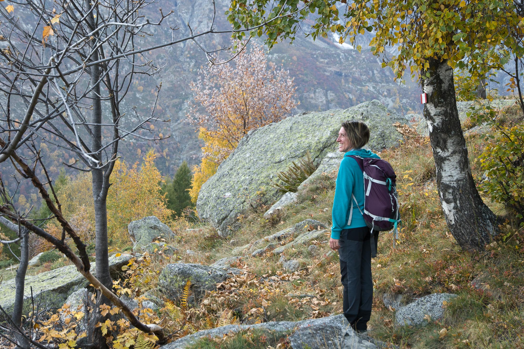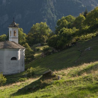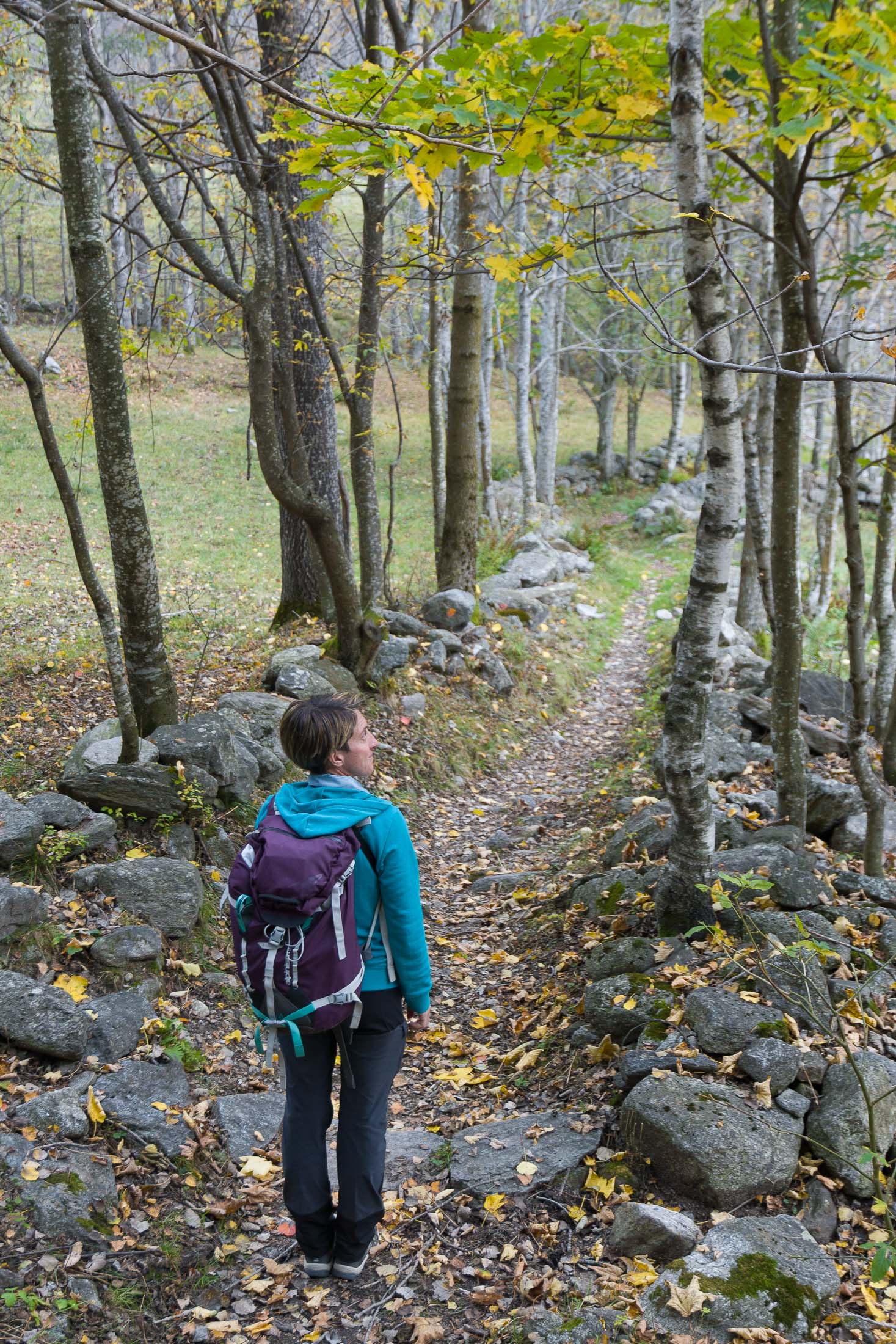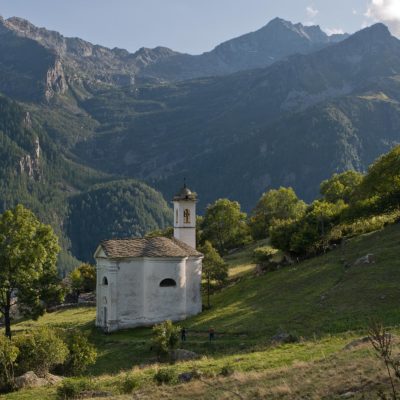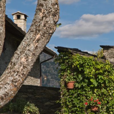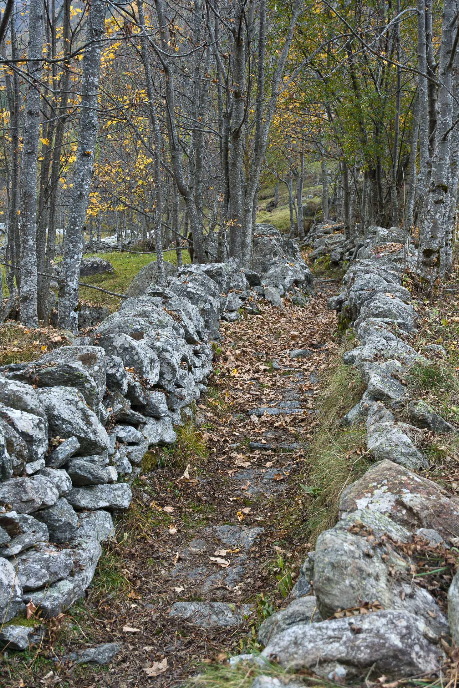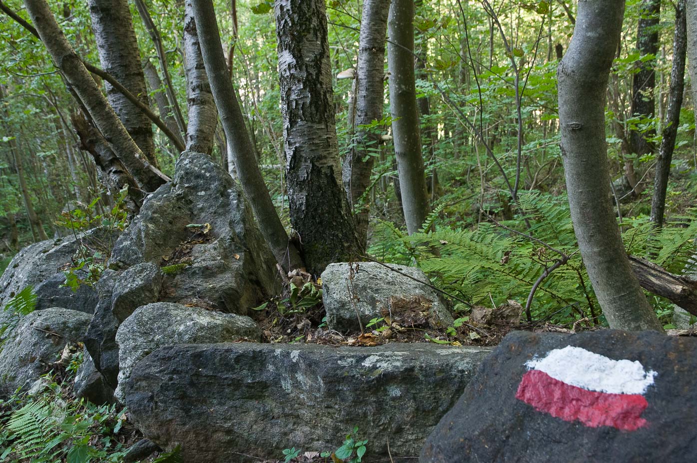 Von der Gias Nuovo Fontane (1986 m) hat man zwei Möglichkeiten, die Wanderung fortzusetzen, entweder man kehrt auf gleichem Weg nach Rivotti oder Alboni zurück, oder man steigt von hier nach Forno Alpi Graie ab, ein sehenswertes Bergdorf im Talboden des Val Grande di Lanzo. Um nach Forno zu gelangen, geht man zunächst eine Viertelstunde auf dem Aufstiegsweg zurück, an dem beschilderten Abzweig hält man sich rechts und steigt auf teils spärlichen Pfadspuren zwischen Wacholdersträuchern, Alpenrosen und verstreuten Lärchen hinab zur Gias Travet di sopra (1829 m). Der alte Alpweg wurde im Jahr 2016 von Freiwilligen des CAI di Lanzo freigeschnitten und neu markiert, bei Nebel sollte man hier dennoch aufpassen, dass man den nicht immer klar ersichtlichen Pfad nicht verliert. Durch verbuschendes ehemaliges Weideland steigt man weiter bis zur Gias Travet di sotto (1754 m) ab. Etwas unterhalb der Alphütten erreicht man den Waldrand, auf nun deutlich erkennbarem Pfad geht es weiterhin abwärts. Nach einer Weile kommt man zu einer ziemlich steilen Passage durch ein fast senkrecht Felsband, das nur an dieser Stelle passierbar ist. Der kurze Abschnitt ist ein wenig mühsam aber unschwierig, bei Nässe ist hier jedoch Trittsicherheit gefragt. Kaum zu glauben, dass man durch diesen schmalen Durchgang einst Tiere hinauf auf die Weiden getrieben hat. Der verbleibende Abstieg führt ohne weitere Schwierigkeiten durch schattigen Wald, schliesslich erreicht man den Talboden mit dem Fiume Stura di Val Grande. Auf einer wunderschönen gepflasterten Mulattiera (= Saumweg oder Maultierweg) wandert man auf der orografisch linken Seite des Flusses in Kürze nach Forno. Auffällig sind hier die grossen Murbrecher, dies sind Sperren im Fluss, die zwar Wasser hindurchlassen, aber keine grösseren Steine oder Baumstämme. Forno war am 24. September 1993 Schauplatz einer grossen Naturkatastrophe, als nach tagelangen sintflutartigen Regenfällen grosse Teile des Dorfes meterhoch von Schlamm- und Geröllmassen vermurt wurden. Die Schutzbauten wurden in den Folgejahren errichtet, um den Ort zukünftig vor weiteren Vermurungen zu schützen.