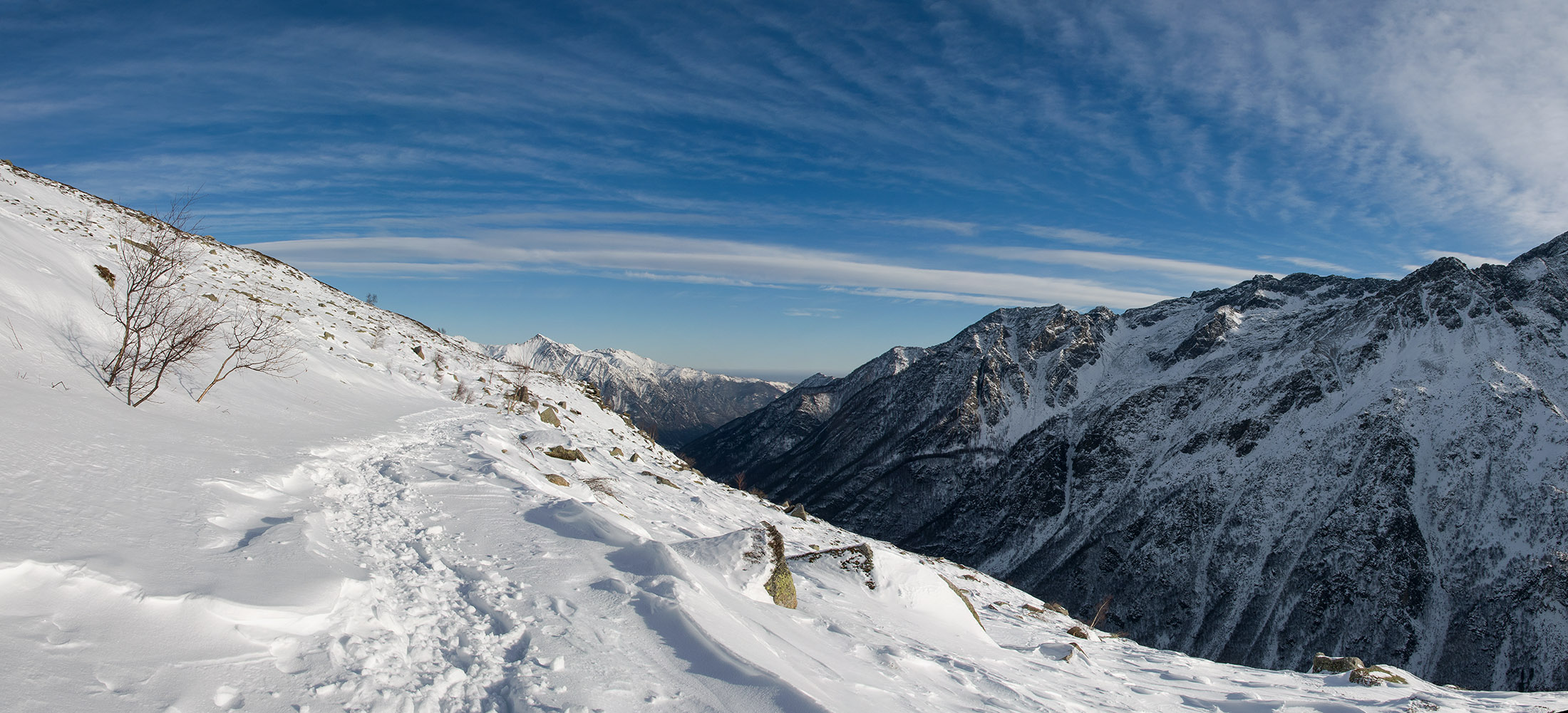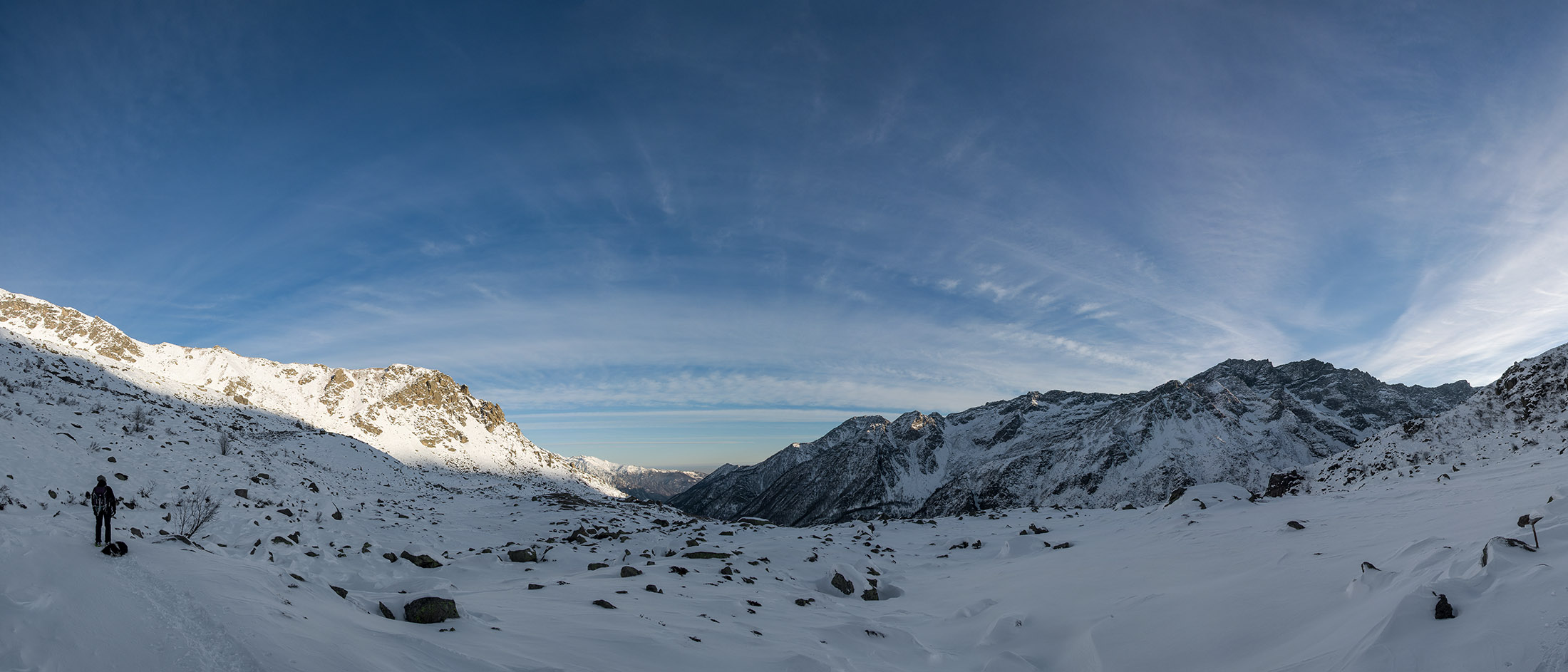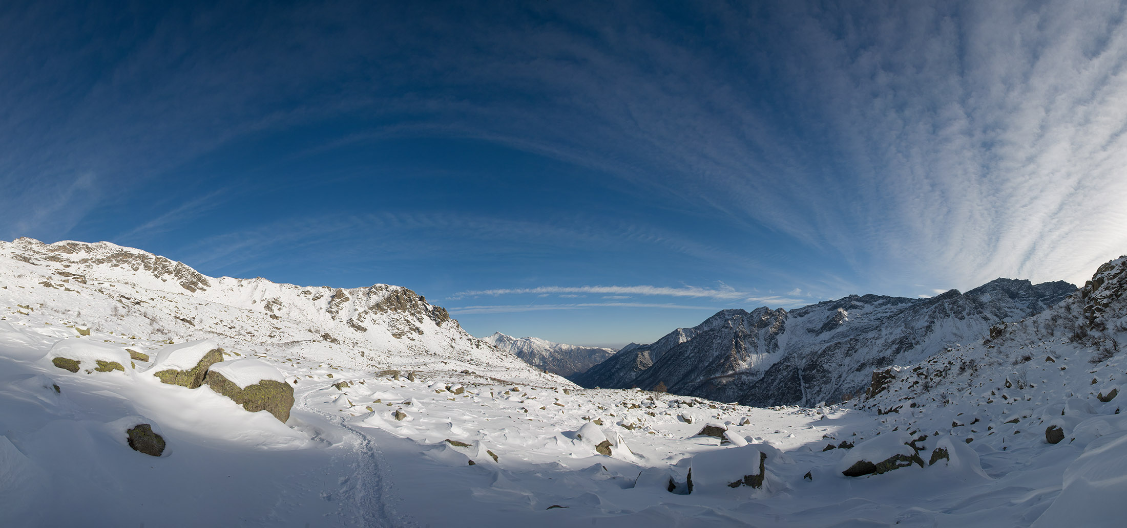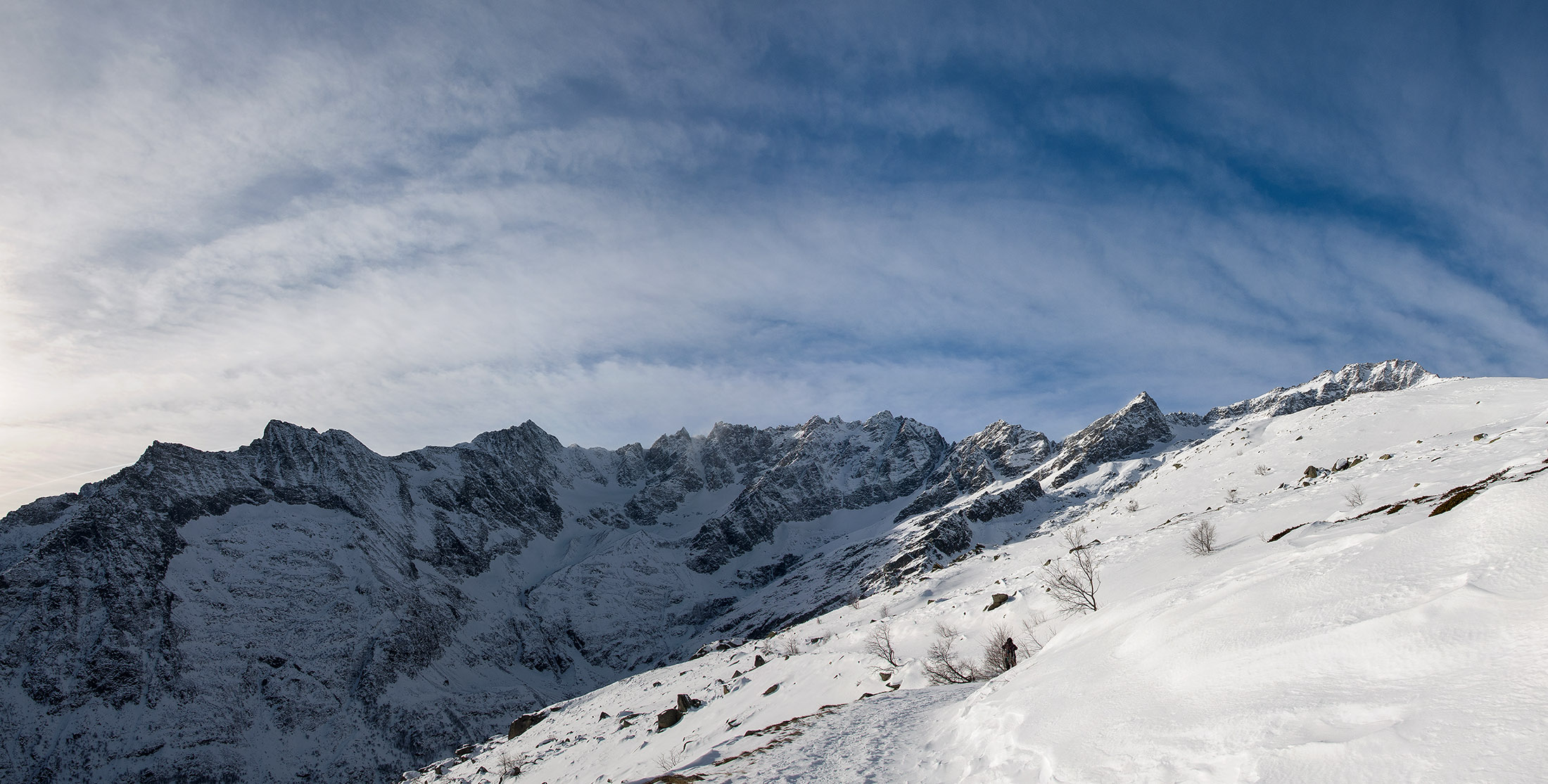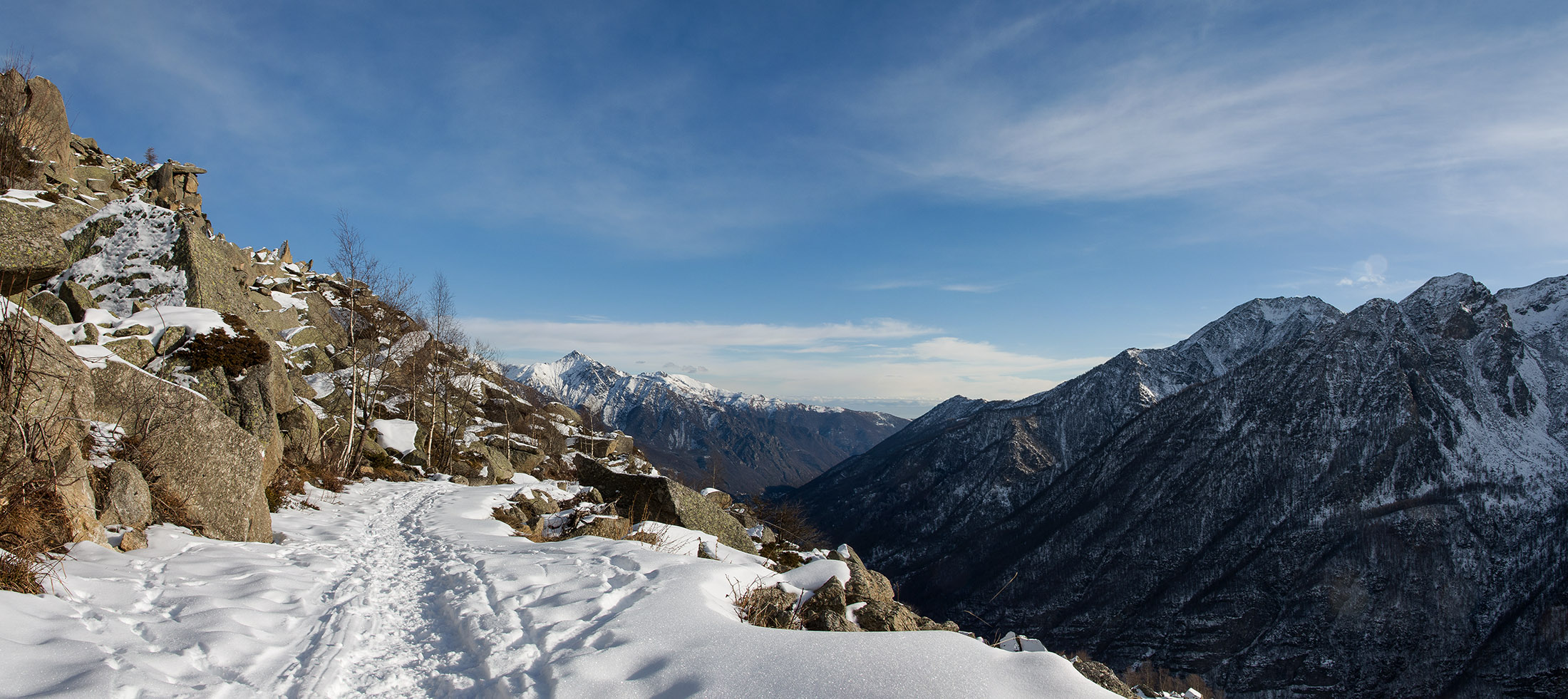 Panoramareiche Wanderung auf dem Sentiero Balcone, ein einfach zu begehender Höhenweg auf der Sonnenseite des Val Grande. Einer der Klassiker der Valli di Lanzo, an Schönwetterwochenenden auch bei den Italienern ein beliebtes und dementsprechend frequentiertes Ausflugsziel, ohne jedoch überlaufen zu sein. Unter der Woche trifft man selbst im Sommer (bis auf den Ferienmonat August) unterwegs kaum eine Menschenseele. Die Tour kann man sich nach eigenem Belieben flexibel gestalten, entweder als Streckenwanderung von Rivotti nach Forno Alpi Graie, oder man beschränkt sich nur auf einzelne Abschnitte und kehrt auf dem Aufstiegsweg zum Ausgangspunkt zurück. Hierzu habe ich einige Vorschläge aufgelistet (> siehe unten). Bei normalen Schneeverhältnissen ist der Sentiero Balcone auch in den Wintermonaten problemlos und unschwierig zu begehen.