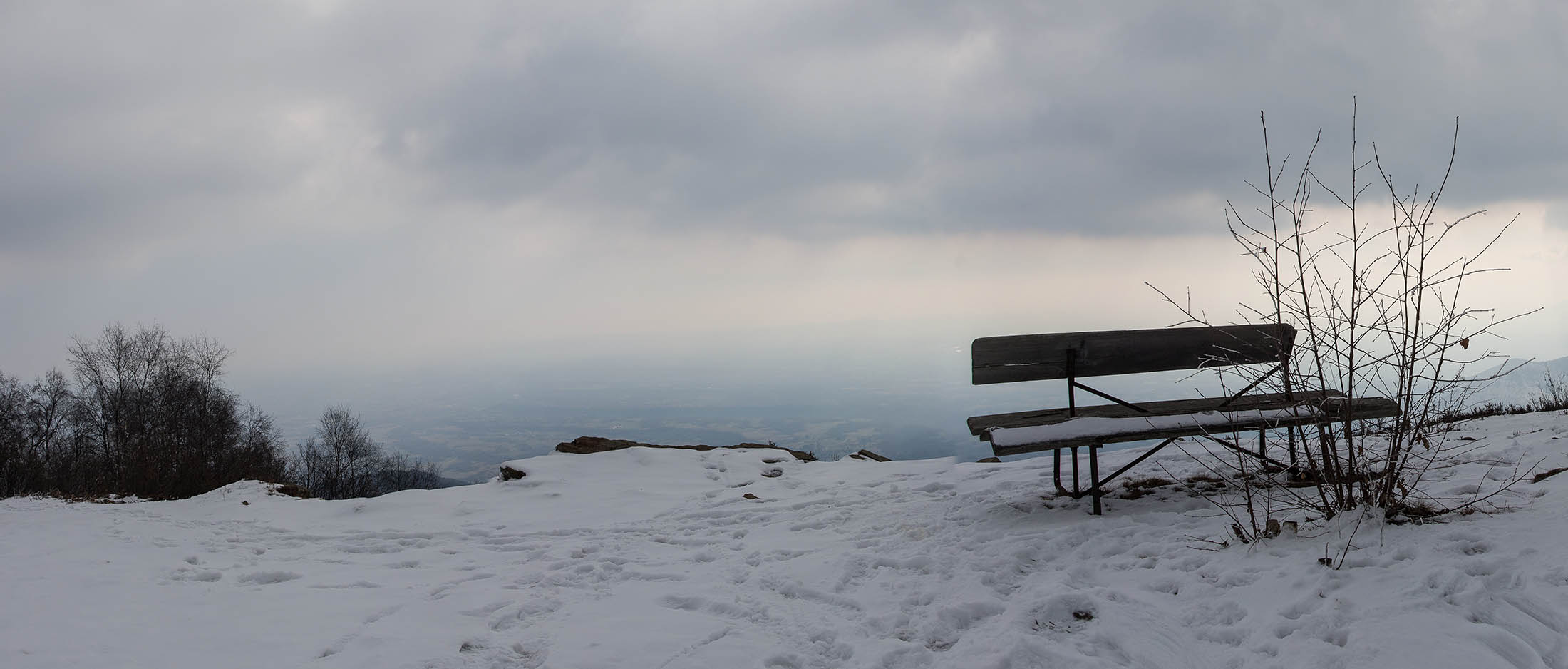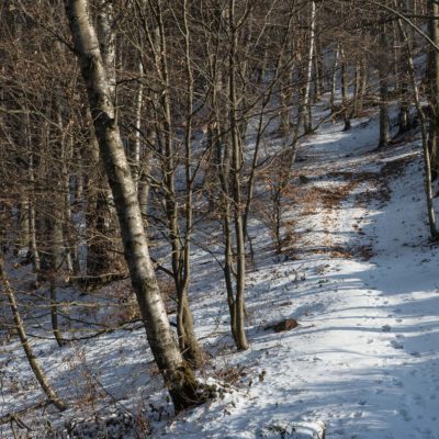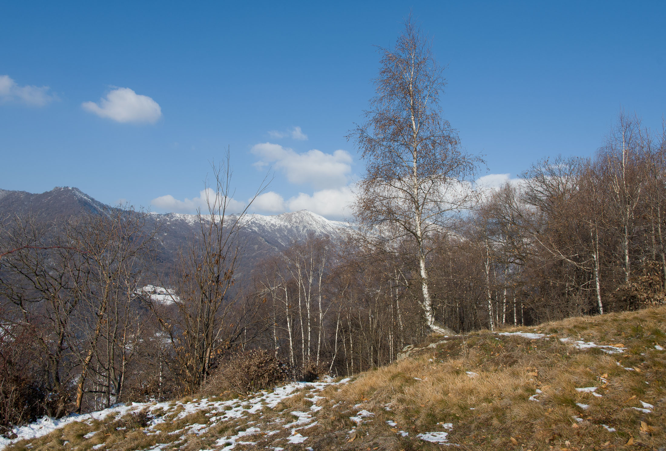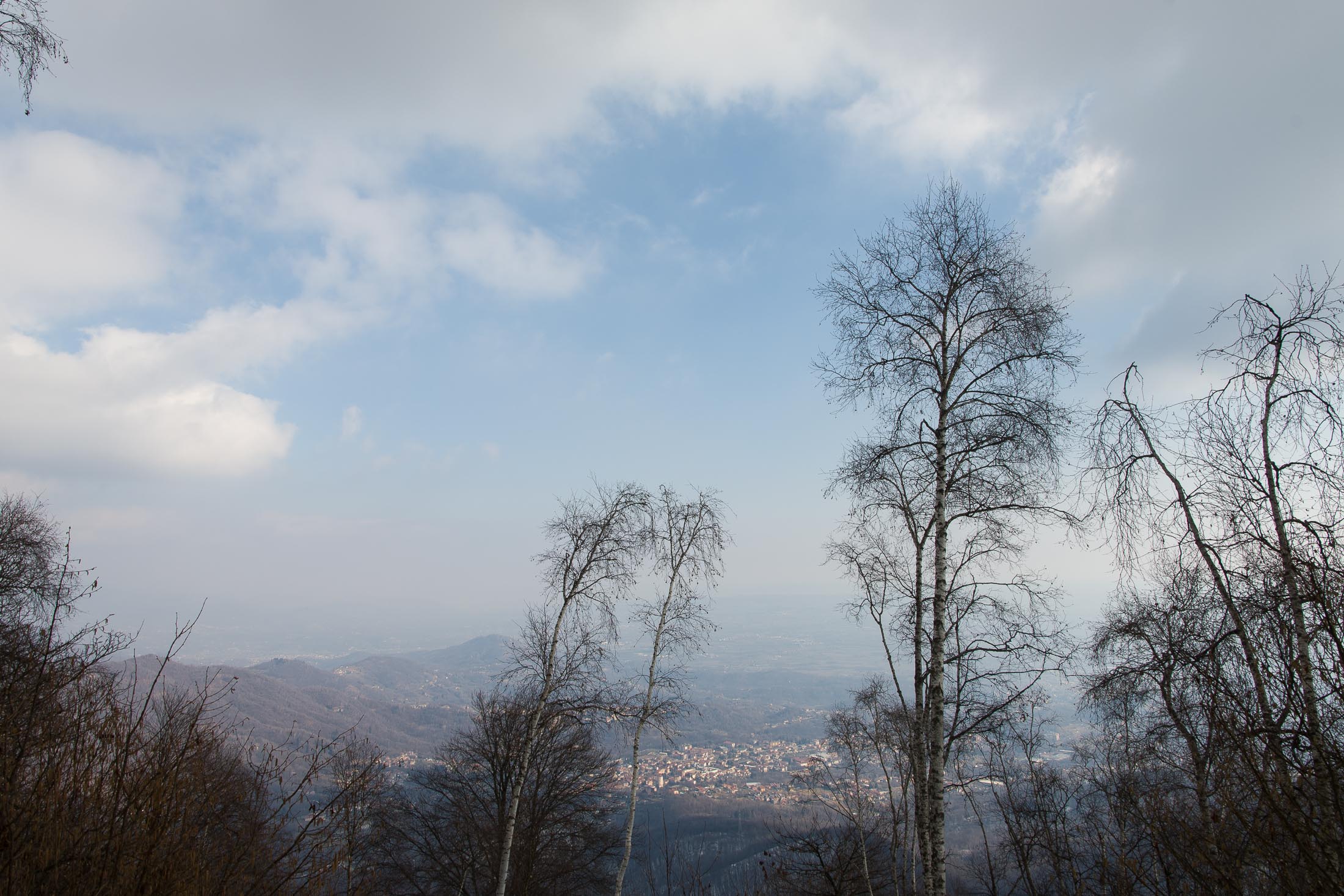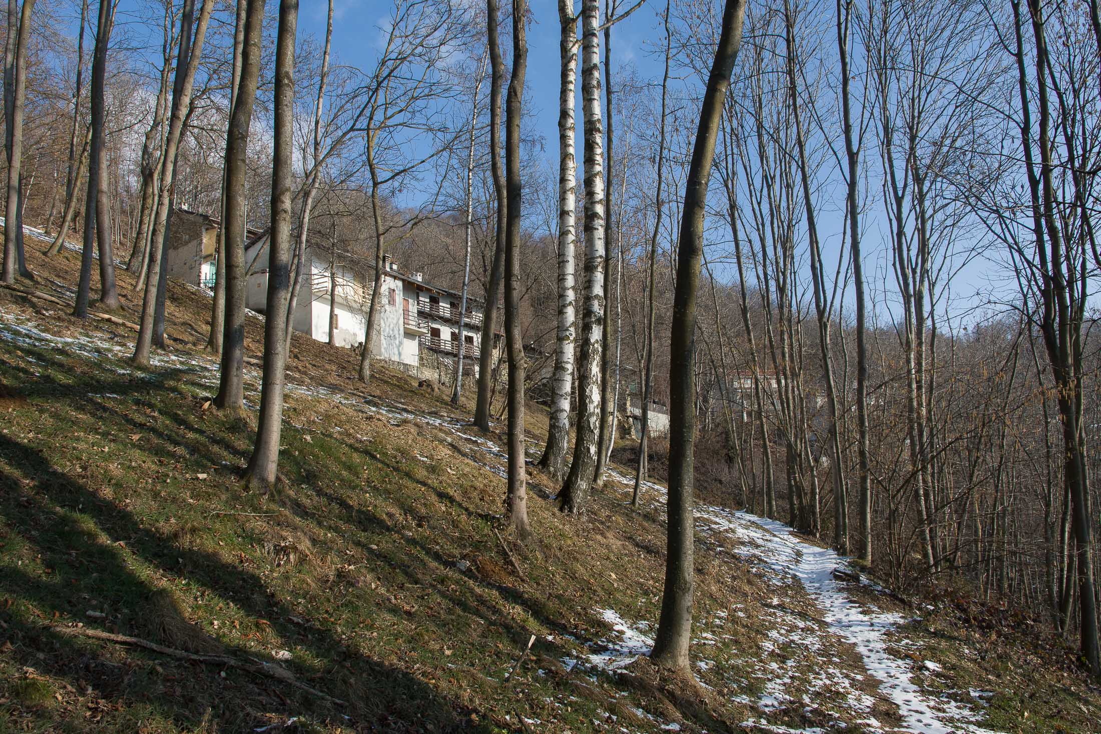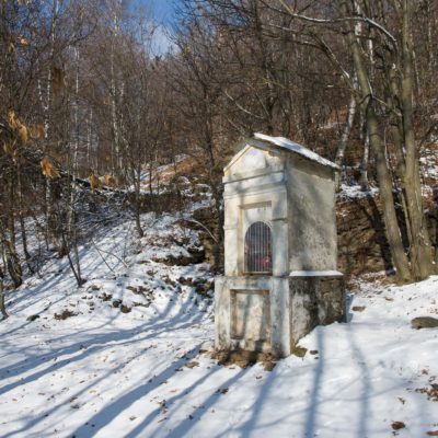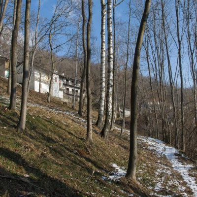 Bei der oberen Häusergruppe folgt man dem Wegweiser Richtung Colle Matteo und Colle del Bandito. Es geht zunächst einen grasigen Hang hinauf, dann führt der Weg durch einen jungen Stangenwald. Grosse Flächen in der Umgebung von Trinità waren einst gerodet und wurden als Viehweiden oder als Mähwiesen genutzt, allmählich werden sie von der Natur zurückerobert. Wenig später erreicht man den kleinen Weiler Case d‘Aggiorgio (1020 m). Eine handvoll Häuser, einige davon gammeln vor sich hin, andere wiederum werden noch gepflegt und instandgehalten und vermutlich nur noch am Wochenende oder im Sommer bewohnt, auch hier scheint niemand mehr dauerhaft zu leben. Hinter einem der Häuser verschwindet der Weg in einer hohlen Gasse, von dort wandert man zwischen hohen Trockensteinmauern in wenigen Minuten zum Colle Matteo (1035 m), der sich mitten im Wald befindet. Buchen und Birken dominieren das Geschehen, eine rustikale Picknickbank lädt zum Verweilen ein. Die wunderschöne Mulattiera (= Saumweg oder Maultierweg) windet sich weiter sanft ansteigend den Wald hinauf, später knickt der Weg Richtung Norden ab. An einer Wegverzweigung folgt man der Beschilderung Richtung Cappella del Bandito und San Bernardo. Nach einer Weile mündet die Mulattiera bei einem einzelstehenden Bildstock in einen unbefestigten Fahrweg. Auf diesem geht es nun einige Höhenmeter bergab, vorbei an den Wochenendhäusern von Gamba, zwei grosse Anwesen auf einer schönen Lichtung im Wald. Weiter unten verlässt man in einer Kehre das Fahrsträsschen und wandert ohne nennenswerte Höhenunterschiede weiter nach Case Ser, ein einzelstehendes Wohnhaus mit einem Holzschuppen auf einem riesigen eingezäunten Gelände. Jenseits davon mündet der Weg erneut in eine unbefestigte Alpstrasse, diese windet sich nun in zahllosen Kurven den Birkenwald hinauf. Nach einer Dreiviertelstunde kommt man zu einer kleinen Verebnungsfläche, wo ein markierter Pfad abzweigt, auf diesem erreicht man in Kürze das sanft gewellte Gipfelplatau der Testa Brusà (1351 m). Ringsherum ein paar verstreute windzerzauste Birken, ein Gipfelkreuz oder einen Steinmann sucht man hier oben vergeblich, dafür gibt es eine hölzerne Sitzbank, von der man in aller Ruhe die tolle Aussicht geniessen kann. Die nahe Tiefebene liegt einem zu Füssen, mittendrin das Häusermeer der nur 30 km entfernten Millionenmetropole von Turin. Im Westen die Berge der Valli di Lanzo, im Osten der Alpenrand mit dem Alto Canavese, im Süden zeigt sich der Monviso (3841 m), der höchste Berg der Cottischen Alpen, bei klarem Wetter blickt man bis in die Seealpen. Die Testa Brusà ist die letzte nennenswerte Erhebung auf dem etwa 5 km langen Grat, der sich vom Monte Soglio Richtung Süden erstreckt und schliesslich in die Po-Ebene ausläuft.