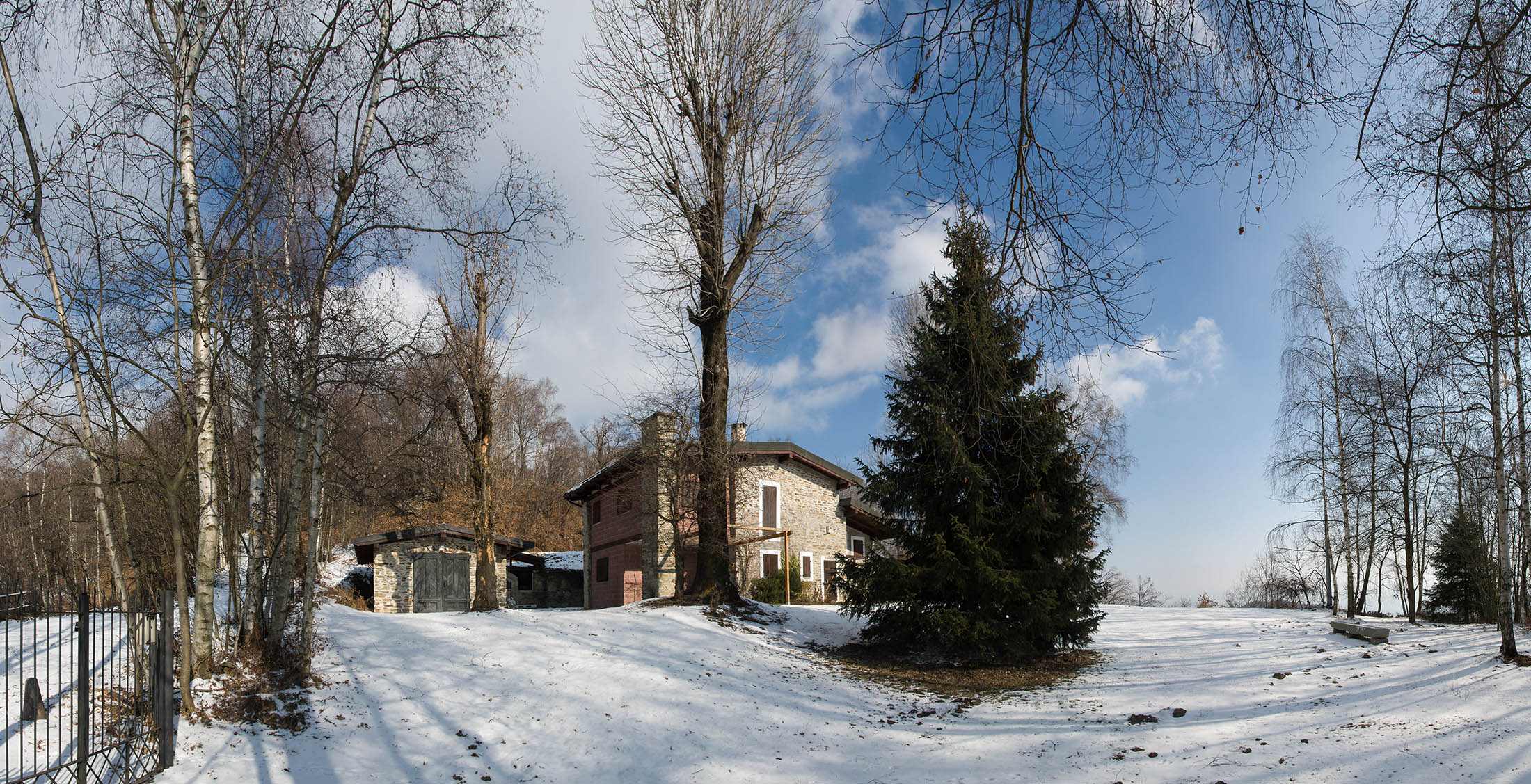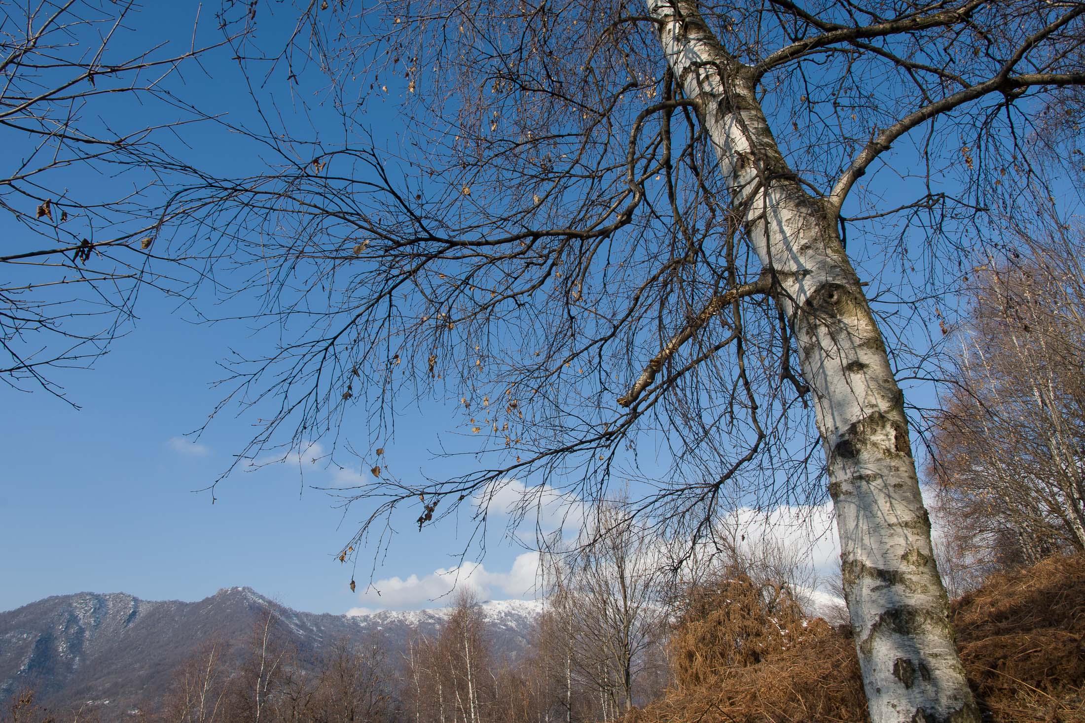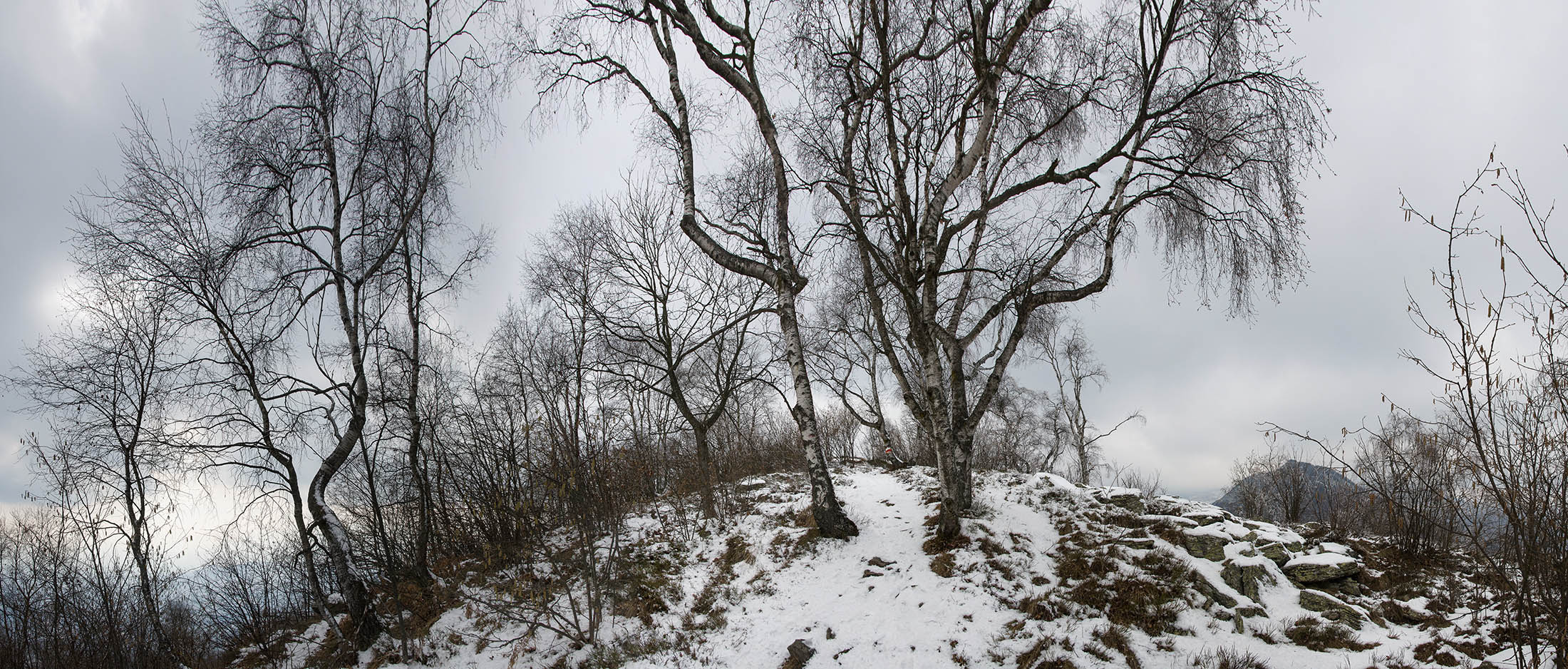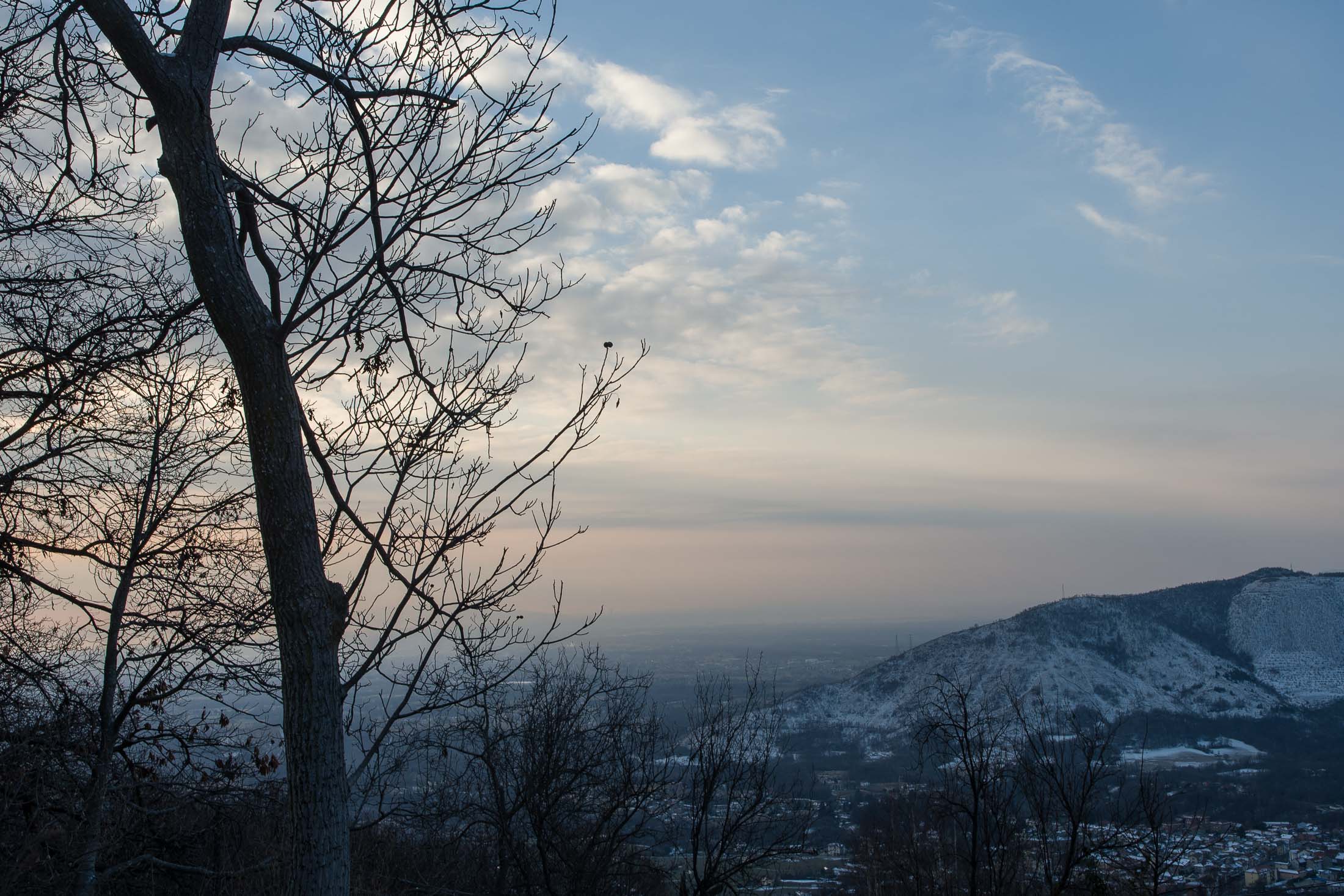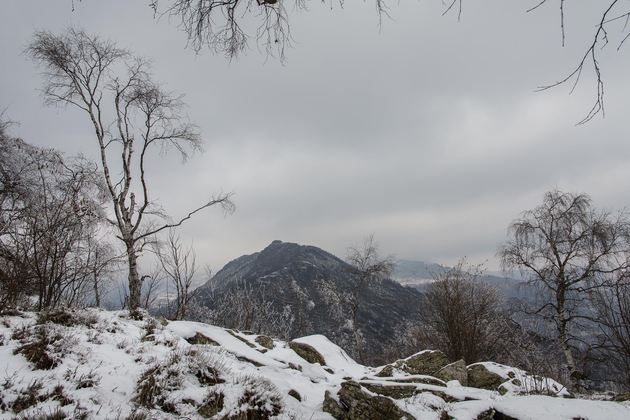 Bei der oberen Häusergruppe folgt man dem Wegweiser Richtung Colle Matteo und Colle del Bandito. Es geht zunächst einen grasigen Hang hinauf, dann führt der Weg durch einen jungen Stangenwald. Grosse Flächen in der Umgebung von Trinità waren einst gerodet und wurden als Viehweiden oder als Mähwiesen genutzt, allmählich werden sie von der Natur zurückerobert. Wenig später erreicht man den kleinen Weiler Case d‘Aggiorgio (1020 m). Eine handvoll Häuser, einige davon gammeln vor sich hin, andere wiederum werden noch gepflegt und instandgehalten und vermutlich nur noch am Wochenende oder im Sommer bewohnt, auch hier scheint niemand mehr dauerhaft zu leben. Hinter einem der Häuser verschwindet der Weg in einer hohlen Gasse, von dort wandert man zwischen hohen Trockensteinmauern in wenigen Minuten zum Colle Matteo (1035 m), der sich mitten im Wald befindet. Buchen und Birken dominieren das Geschehen, eine rustikale Picknickbank lädt zum Verweilen ein. Die wunderschöne Mulattiera (= Saumweg oder Maultierweg) windet sich weiter sanft ansteigend den Wald hinauf, später knickt der Weg Richtung Norden ab. An einer Wegverzweigung folgt man der Beschilderung Richtung Cappella del Bandito und San Bernardo. Nach einer Weile mündet die Mulattiera bei einem einzelstehenden Bildstock in einen unbefestigten Fahrweg. Auf diesem geht es nun einige Höhenmeter bergab, vorbei an den Wochenendhäusern von Gamba, zwei grosse Anwesen auf einer schönen Lichtung im Wald. Weiter unten verlässt man in einer Kehre das Fahrsträsschen und wandert ohne nennenswerte Höhenunterschiede weiter nach Case Ser, ein einzelstehendes Wohnhaus mit einem Holzschuppen auf einem riesigen eingezäunten Gelände. Jenseits davon mündet der Weg erneut in eine unbefestigte Alpstrasse, diese windet sich nun in zahllosen Kurven den Birkenwald hinauf. Nach einer Dreiviertelstunde kommt man zu einer kleinen Verebnungsfläche, wo ein markierter Pfad abzweigt, auf diesem erreicht man in Kürze das sanft gewellte Gipfelplatau der Testa Brusà (1351 m). Ringsherum ein paar verstreute windzerzauste Birken, ein Gipfelkreuz oder einen Steinmann sucht man hier oben vergeblich, dafür gibt es eine hölzerne Sitzbank, von der man in aller Ruhe die tolle Aussicht geniessen kann. Die nahe Tiefebene liegt einem zu Füssen, mittendrin das Häusermeer der nur 30 km entfernten Millionenmetropole von Turin. Im Westen die Berge der Valli di Lanzo, im Osten der Alpenrand mit dem Alto Canavese, im Süden zeigt sich der Monviso (3841 m), der höchste Berg der Cottischen Alpen, bei klarem Wetter blickt man bis in die Seealpen. Die Testa Brusà ist die letzte nennenswerte Erhebung auf dem etwa 5 km langen Grat, der sich vom Monte Soglio Richtung Süden erstreckt und schliesslich in die Po-Ebene ausläuft.