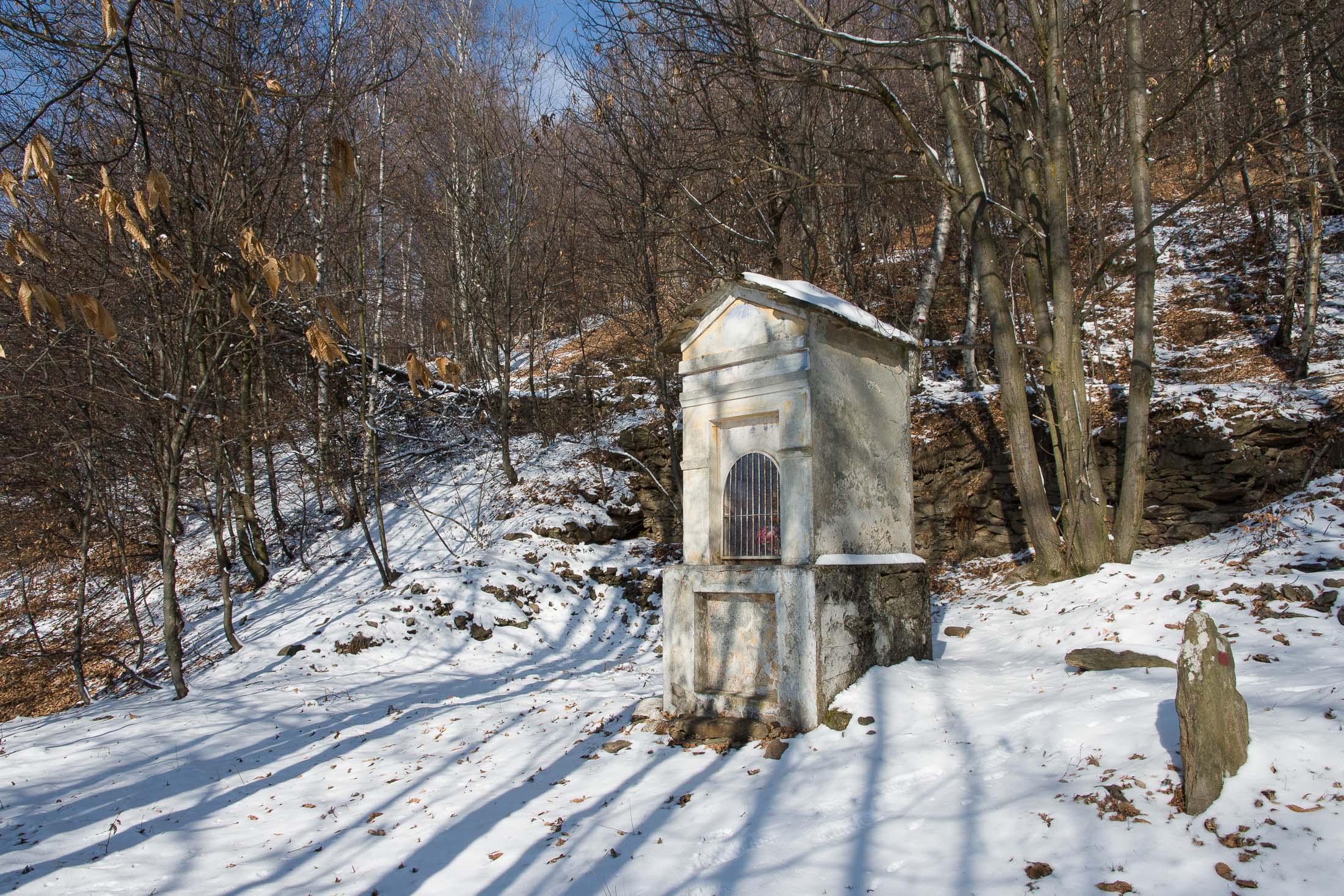Für den Abstieg bieten sich mehrere Möglichkeiten an. Entweder man kehrt auf dem Aufstiegsweg nach Trinità zurück, hier lohnt ein kleiner Schlenker zur Cappella del Bandito, eine sehenswertes Kirchlein auf dem gleichnamigen Pass. Oder man erweitert die Tour zu einer Rundwanderung. Vom Gipfel kehrt man zunächst in wenigen Minuten auf dem Aufstiegsweg zu der unbefestigten Alpstrasse zurück. Auf dieser nun über den flachen Gratrücken Richtung Norden, die Alpstrasse geht nach einer Viertelstunde in einen Pfad über. Wenig später verlässt man den Grat und steigt Richtung Westen ab, der markierte Pfad mündet 150 Höhenmeter weiter unten in den alten Alpweg, der vom Colle Matteo heraufkommt (Weg 416B). Auf diesem ein kurzes Stück Richtung Colle Matteo, vorbei an den verfallenen Hütten der Alpe Losera (1200 m), dann zweigt bei einem Wegweiser rechts ein Pfad ab, der steil hinab nach Case Andrè führt. Von Case Andrè erreicht man in 20 Minuten das Dorf Piano Audi (867 m), die taloberste Dauersiedlung des Val Malone. In Piano Audi und den umliegenden verstreuten Weilern lebten um die vorletzte Jahrhundertwende noch etwa 900 Menschen, heute sind es gerade mal 30 dauerhafte Bewohner. In der sympathischen Dorfkneipe an der Hauptstrasse kann man einkehren und vorzüglich essen. Von Piano Audi kehrt man auf dem wunderschönen alten Saumweg in einigem Auf und Ab über Case Gobbio und Case Muggion nach Trinità zurück.