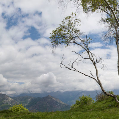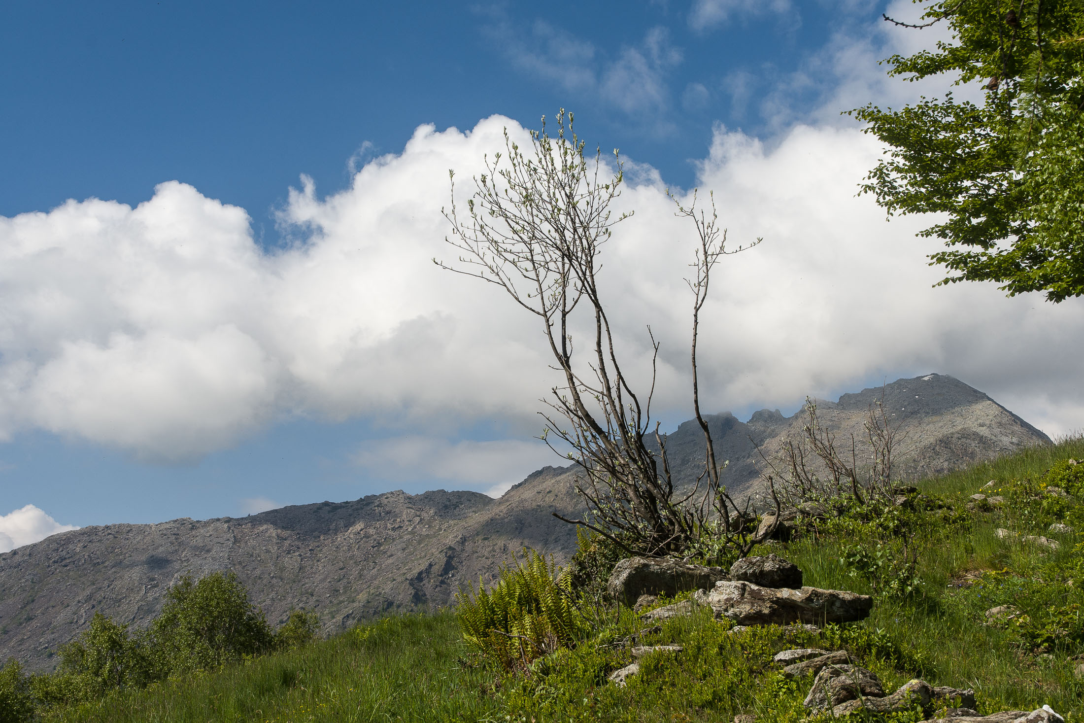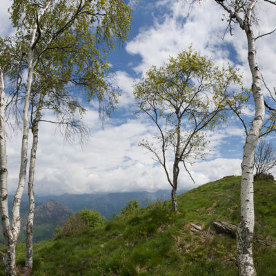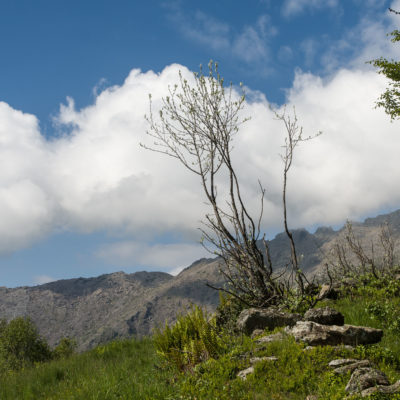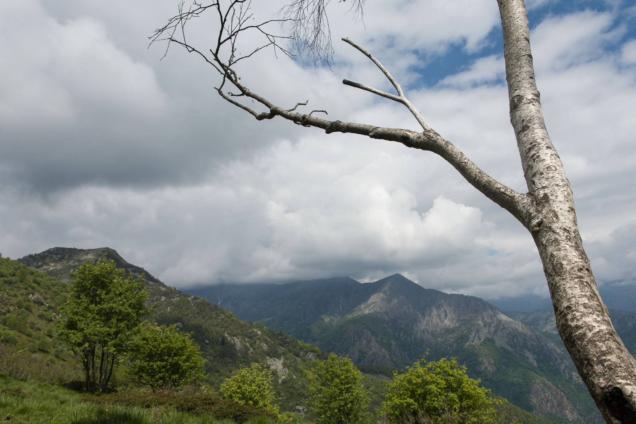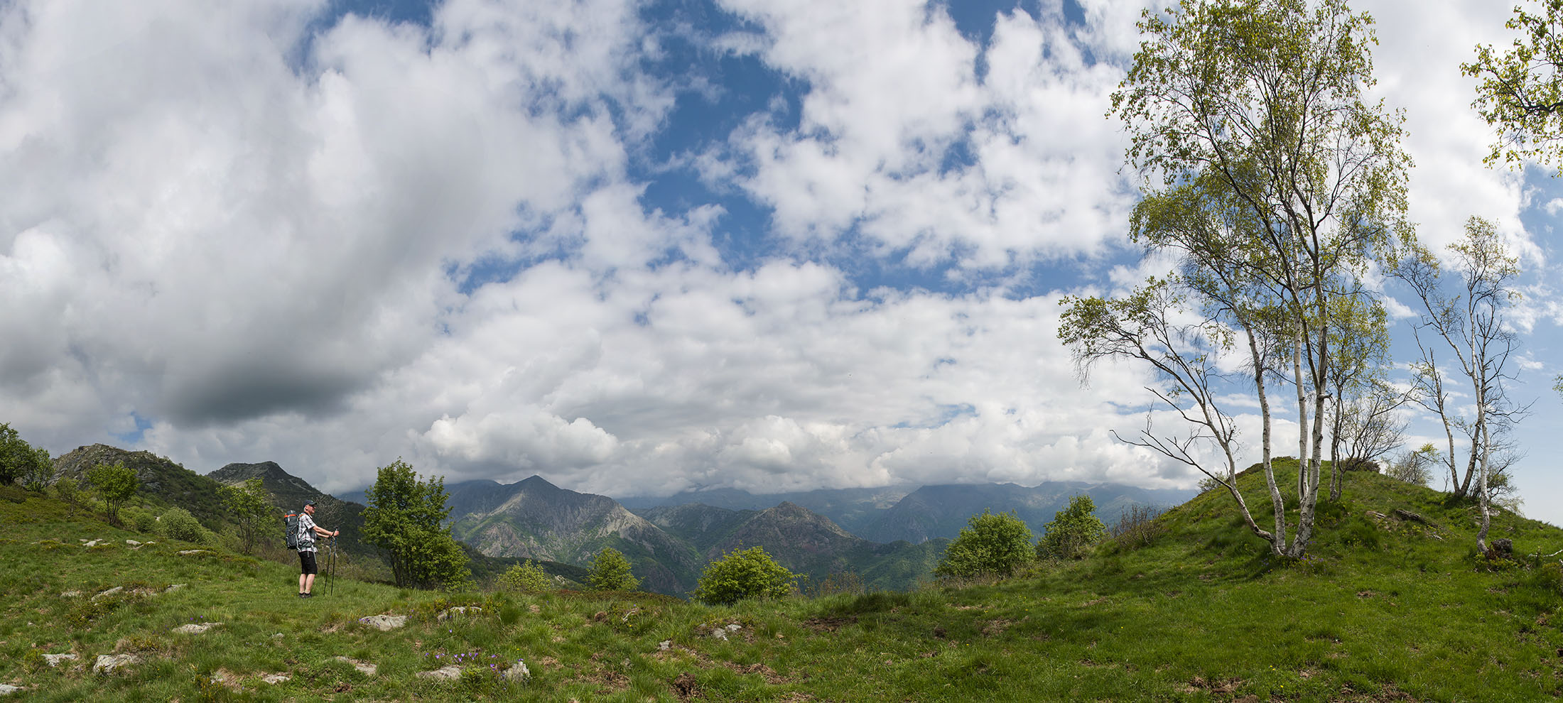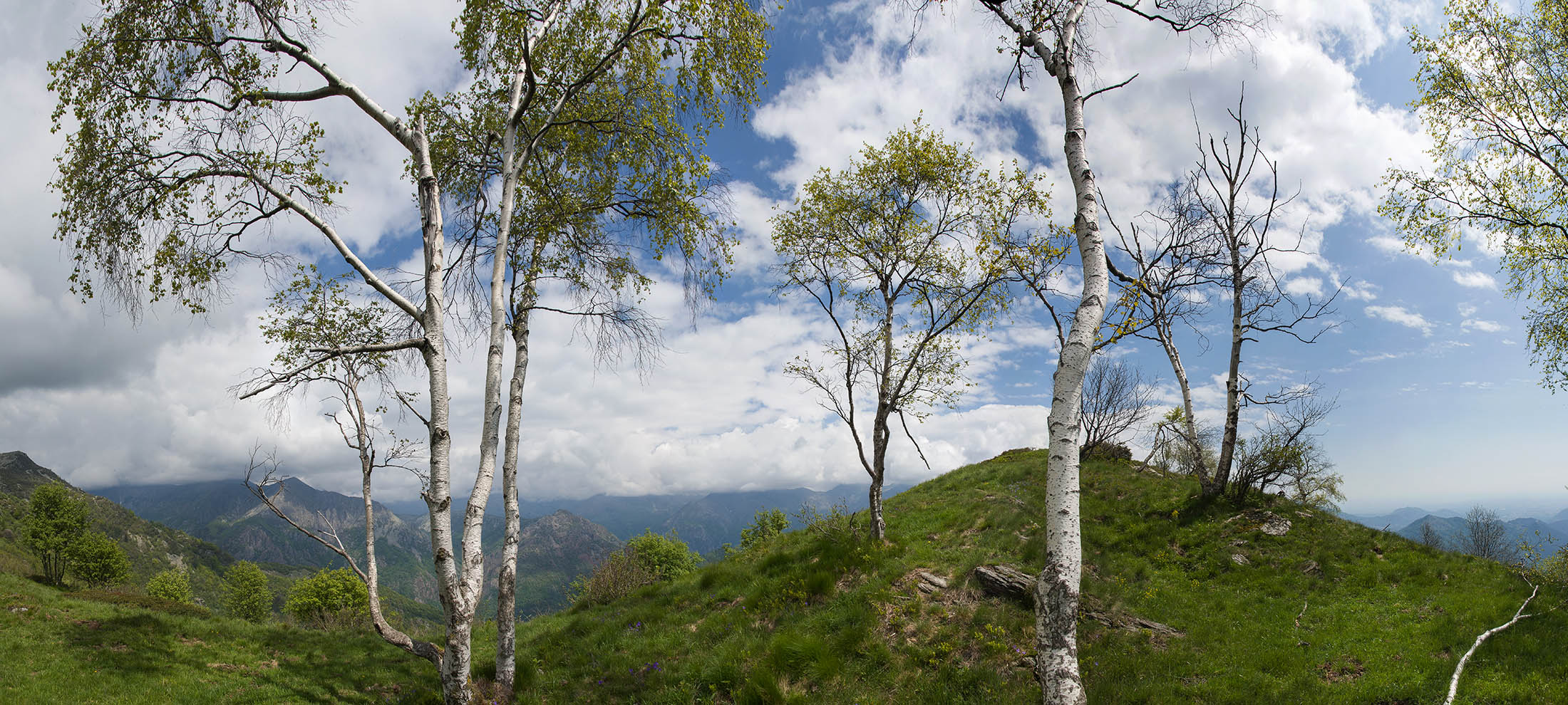 Hinter den Häusern von Giardino geht man an der Gabelung vor der Kirche rechts und folgt dem unbefestigten Alpsträsschen bis Sart (1151 m), eine ehemalige Alp, die Hütten werden noch instandgehalten und als Wochenenddomizil genutzt. Die Wiesen und Weiden in der Umgebung sind inzwischen von vielen Birken überwachsen. Bei den Alpgebäuden beginnt ein markierter Weg, der durch Buchenwald hinauf zur grossen Lichtung von Baudè (1240 m, in der Fraternali-Karte als Baudet bezeichnet) führt. Von Mai bis September stehen hier noch einige Kühe und Ziegen auf den saftigen Weiden, die schön gelegene Alp wird auch heute noch von einem Bauern aus dem Tal bewohnt und bewirtschaftet. Jenseits der Hütten verschwindet der Pfad wieder im Wald und mündet wenig später in einen Forstweg, den man nach einem kurzen Anstieg bei den Ruinen von I Nogeri (1320 m) wieder verlässt. Hier lässt man den Wald hinter sich und geht über Wiesen und Weiden zwischen alten Trockensteinmauern hinauf zur Alpe Belvedere (1452 m). Der klangvolle Name ist hier bereits Programm, die Berge und Hügel des Bassa Valle (das untere Lanzo-Tal) liegen einem zu Füssen, jenseits davon verliert sich die piemontesische Tiefebene im nahezu immerwährenden Dunst. Das ehemalige Alpgebäude wurde vor einigen Jahren wieder aufgebaut und zu Ferienwohnungen umgebaut, ideal für diejenigen, die Stille und völlige Abgeschiedenheit in Verbindung mit ein wenig Komfort mögen (nähere Informationen: www.alpebelvedere.net). Wenige Meter oberhalb zweigt bei einem Wegweiser ein markierter Pfad von der Alpstrasse ab, dieser führt zunächst leicht ansteigend auf einen mit Birken überwachsenen Rücken, kurz darauf erreicht man wieder offenes und aussichtsreiches Gelände. Weiter zwischen verstreuten Birken hinauf zum Gipfel der Testa della Cialma (1630 m). Ein paar windzerzauste Bäume, weite Blicke in die Ferne, mehr gibt es von hier oben nicht zu berichten. Einsamkeit kann so wohltuend sein.