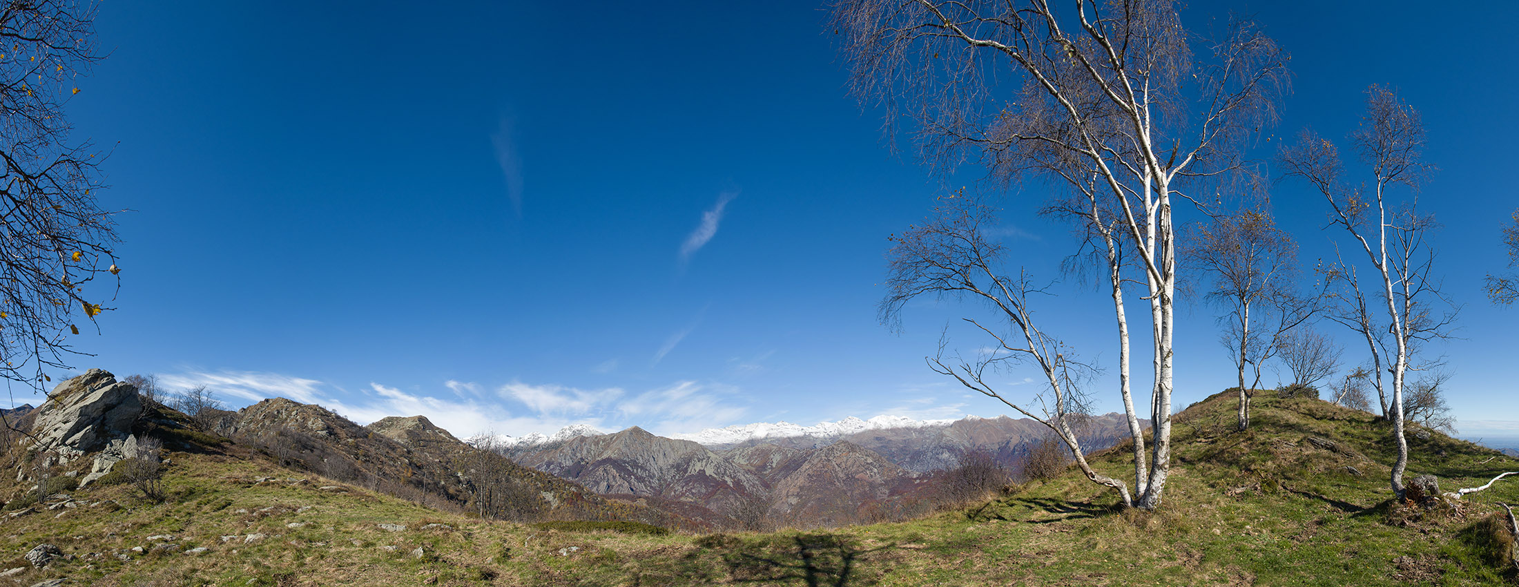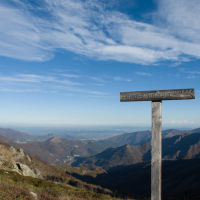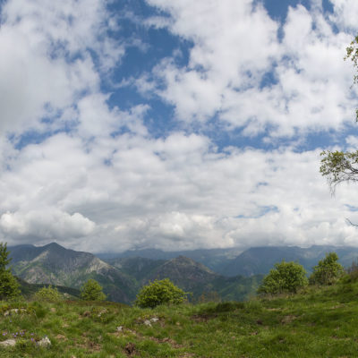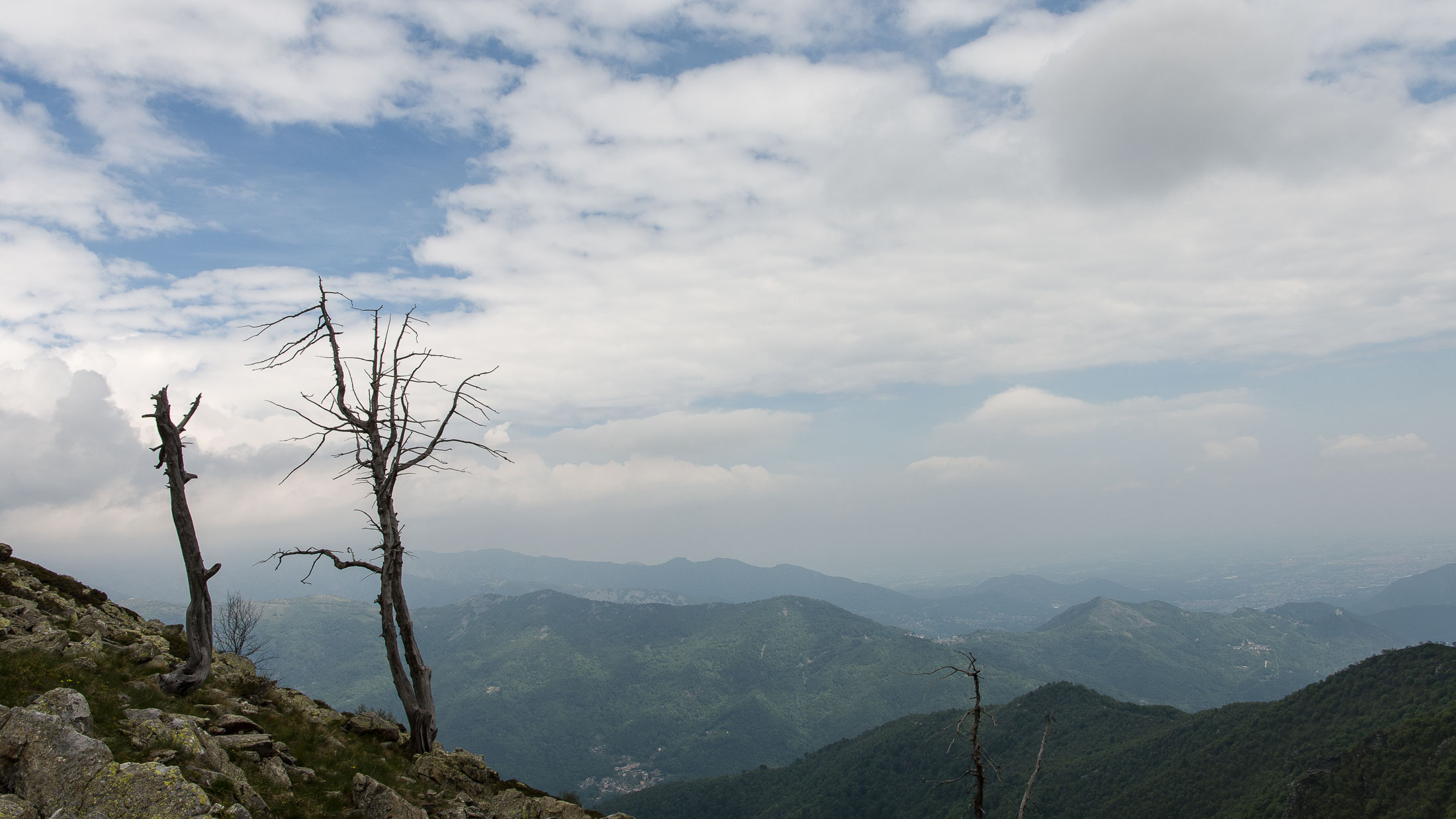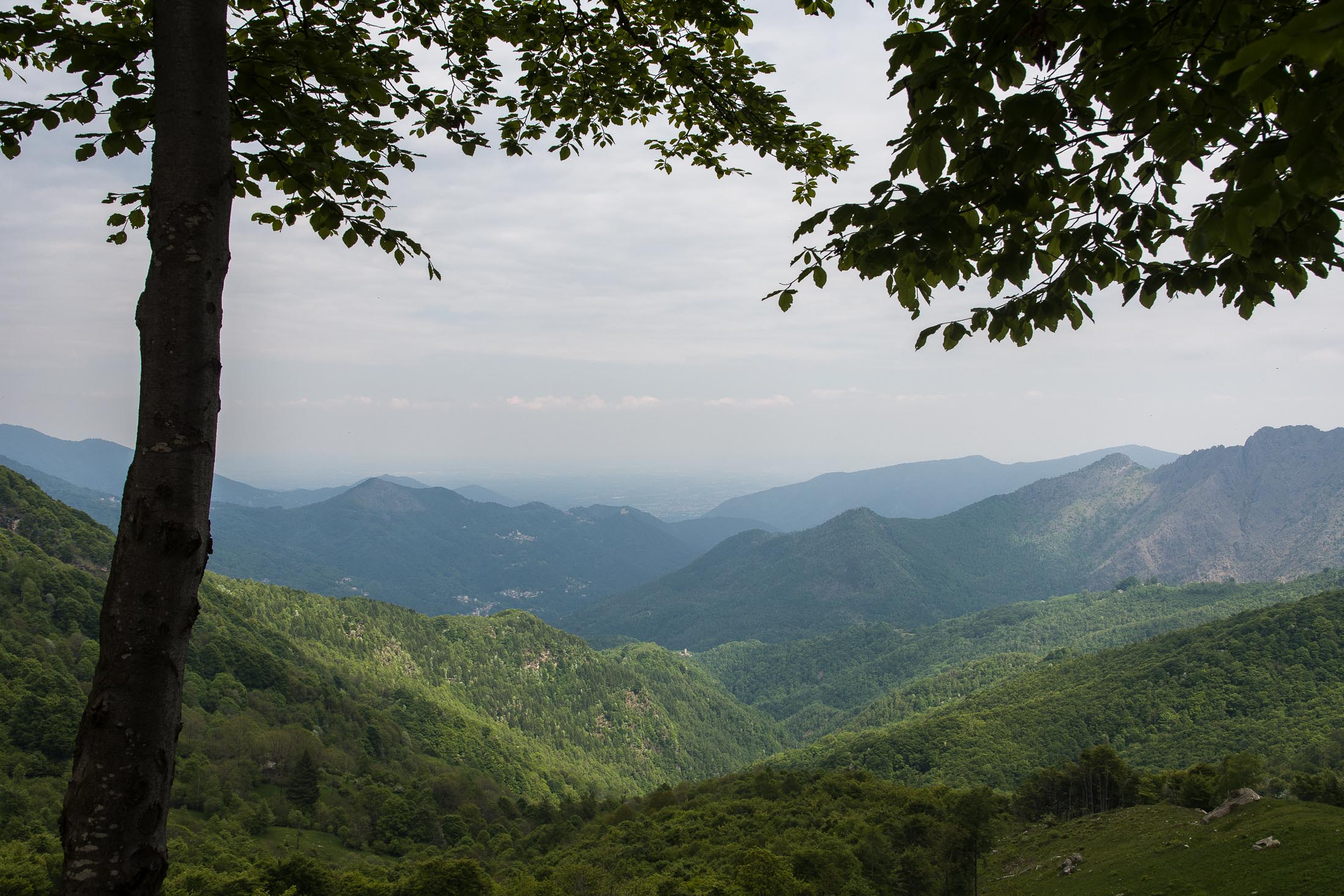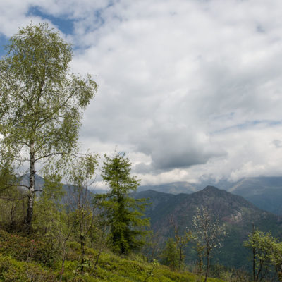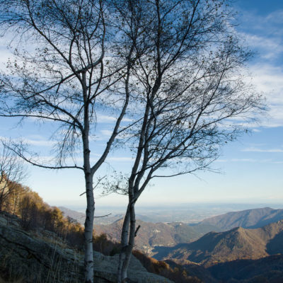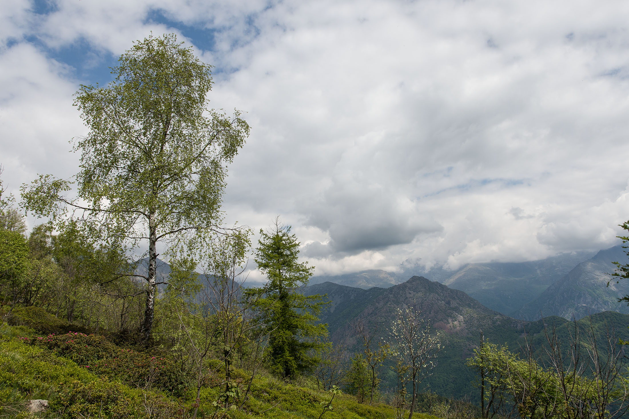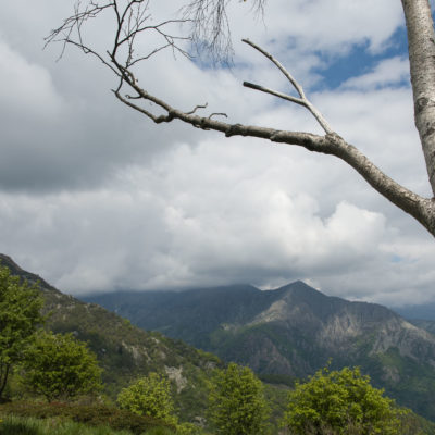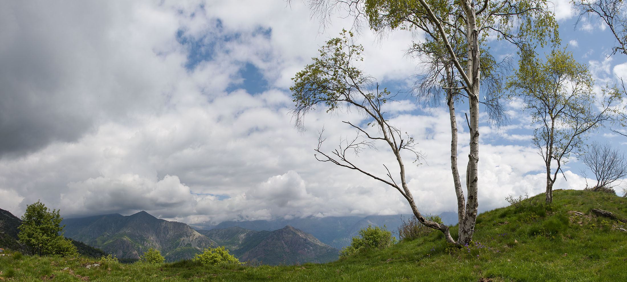 Hinter den Häusern von Giardino geht man an der Gabelung vor der Kirche rechts und folgt dem unbefestigten Alpsträsschen bis Sart (1151 m), eine ehemalige Alp, die Hütten werden noch instandgehalten und als Wochenenddomizil genutzt. Die Wiesen und Weiden in der Umgebung sind inzwischen von vielen Birken überwachsen. Bei den Alpgebäuden beginnt ein markierter Weg, der durch Buchenwald hinauf zur grossen Lichtung von Baudè (1240 m, in der Fraternali-Karte als Baudet bezeichnet) führt. Von Mai bis September stehen hier noch einige Kühe und Ziegen auf den saftigen Weiden, die schön gelegene Alp wird auch heute noch von einem Bauern aus dem Tal bewohnt und bewirtschaftet. Jenseits der Hütten verschwindet der Pfad wieder im Wald und mündet wenig später in einen Forstweg, den man nach einem kurzen Anstieg bei den Ruinen von I Nogeri (1320 m) wieder verlässt. Hier lässt man den Wald hinter sich und geht über Wiesen und Weiden zwischen alten Trockensteinmauern hinauf zur Alpe Belvedere (1452 m). Der klangvolle Name ist hier bereits Programm, die Berge und Hügel des Bassa Valle (das untere Lanzo-Tal) liegen einem zu Füssen, jenseits davon verliert sich die piemontesische Tiefebene im nahezu immerwährenden Dunst. Das ehemalige Alpgebäude wurde vor einigen Jahren wieder aufgebaut und zu Ferienwohnungen umgebaut, ideal für diejenigen, die Stille und völlige Abgeschiedenheit in Verbindung mit ein wenig Komfort mögen (nähere Informationen: www.alpebelvedere.net). Wenige Meter oberhalb zweigt bei einem Wegweiser ein markierter Pfad von der Alpstrasse ab, dieser führt zunächst leicht ansteigend auf einen mit Birken überwachsenen Rücken, kurz darauf erreicht man wieder offenes und aussichtsreiches Gelände. Weiter zwischen verstreuten Birken hinauf zum Gipfel der Testa della Cialma (1630 m). Ein paar windzerzauste Bäume, weite Blicke in die Ferne, mehr gibt es von hier oben nicht zu berichten. Einsamkeit kann so wohltuend sein.