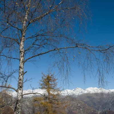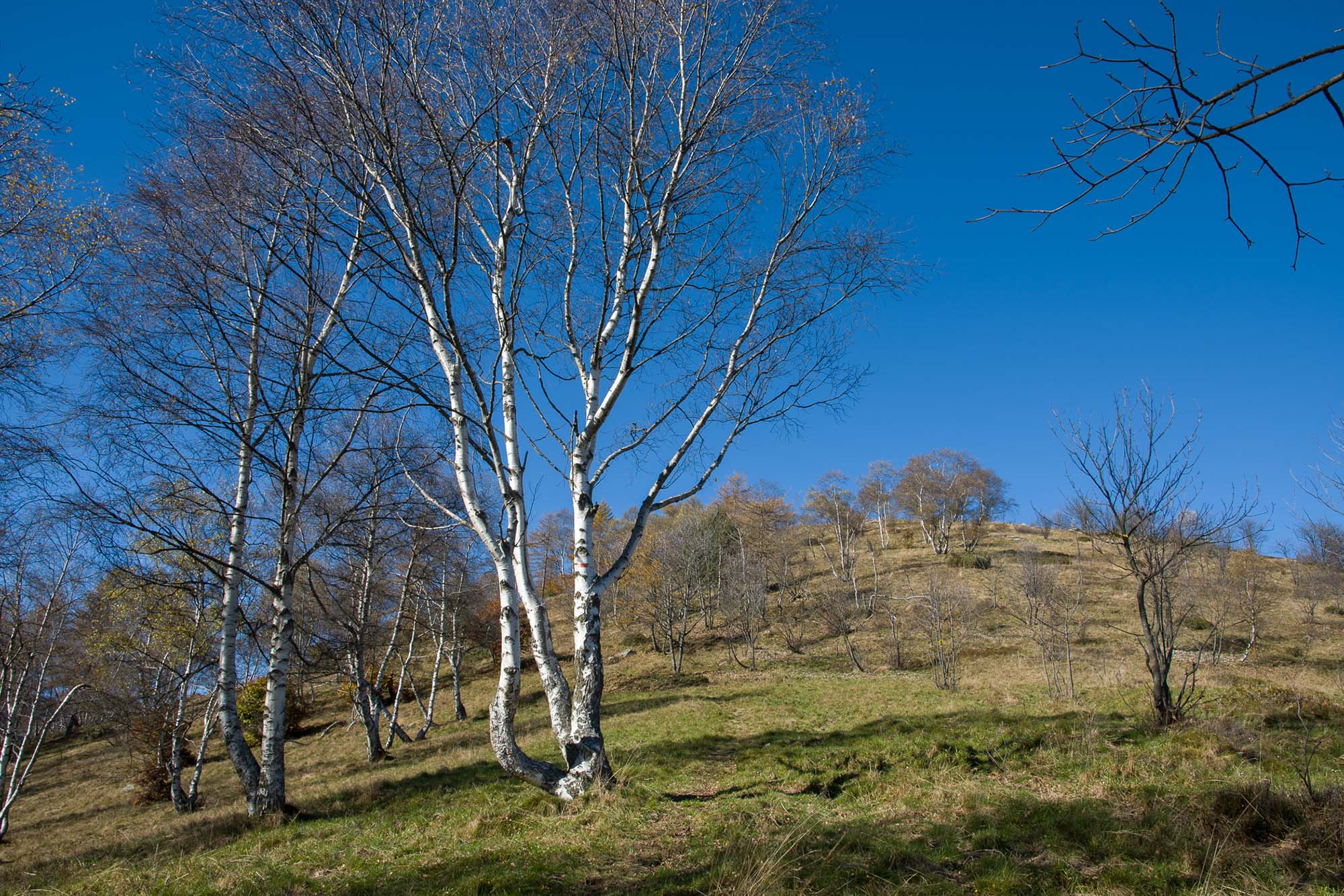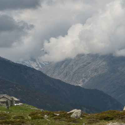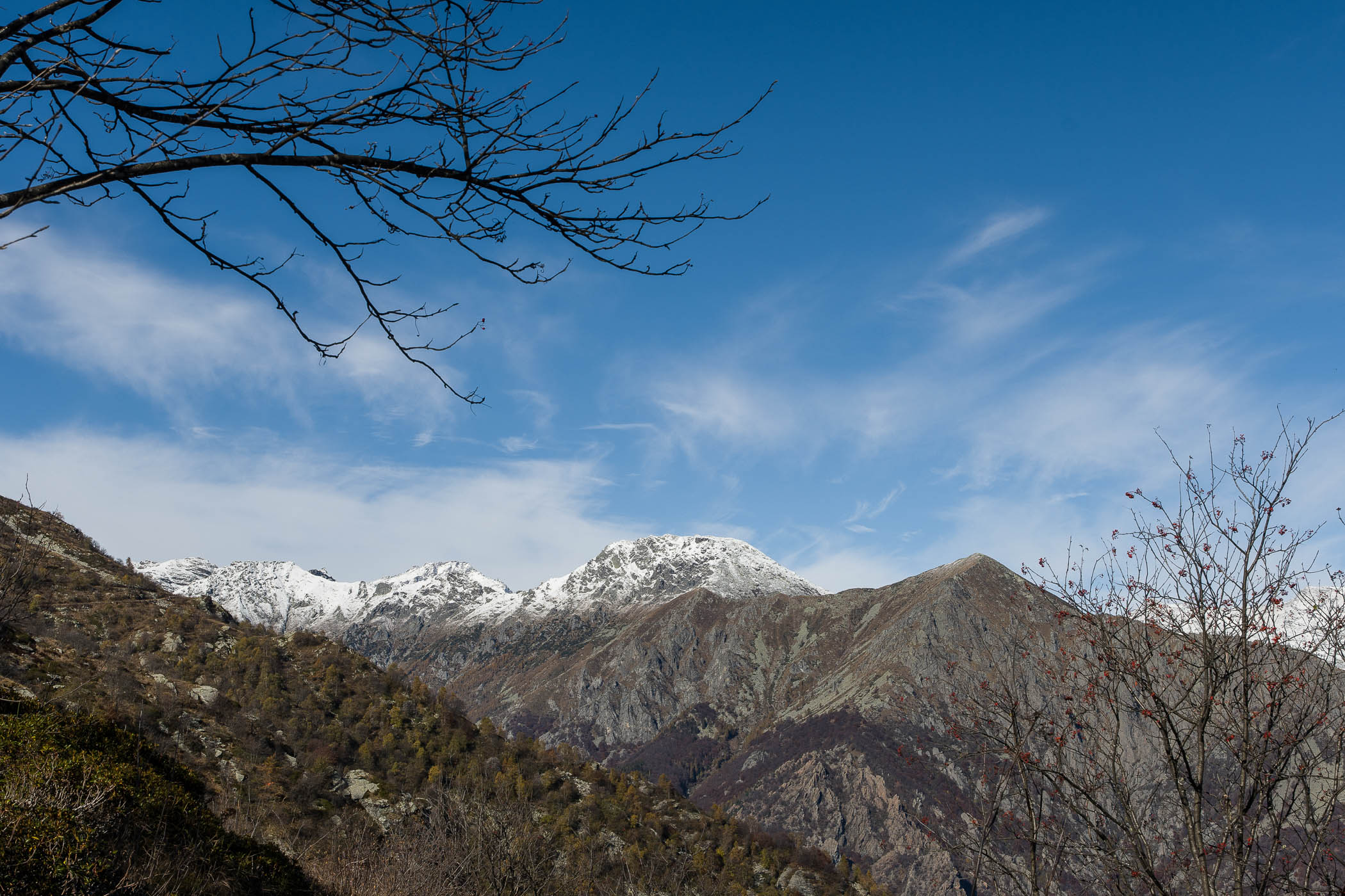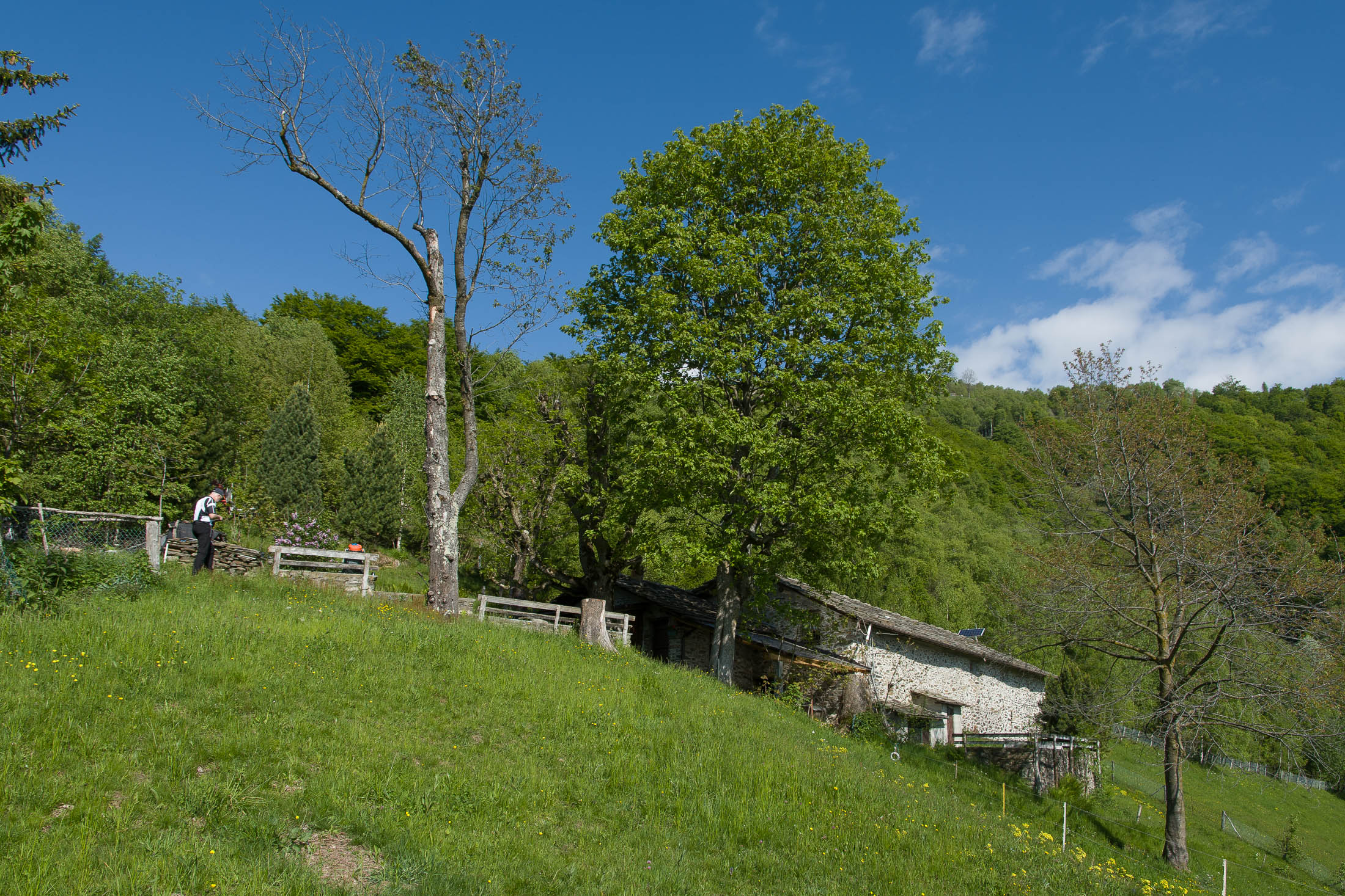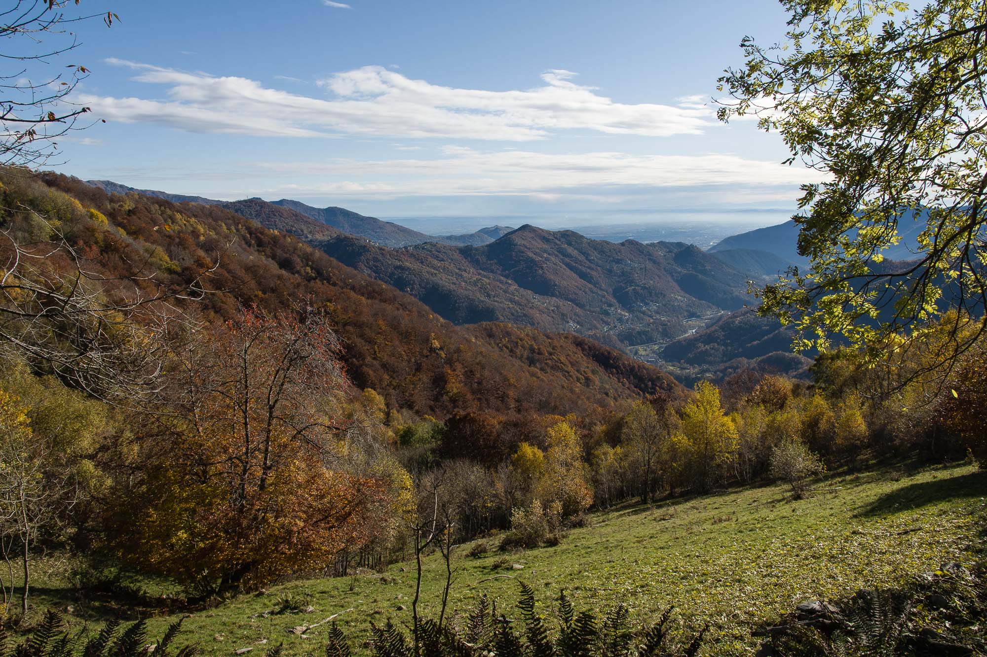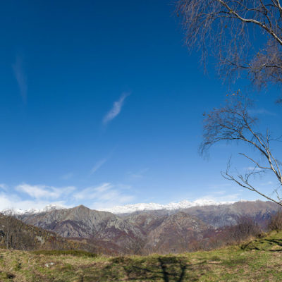 Hinter den Häusern von Giardino geht man an der Gabelung vor der Kirche rechts und folgt dem unbefestigten Alpsträsschen bis Sart (1151 m), eine ehemalige Alp, die Hütten werden noch instandgehalten und als Wochenenddomizil genutzt. Die Wiesen und Weiden in der Umgebung sind inzwischen von vielen Birken überwachsen. Bei den Alpgebäuden beginnt ein markierter Weg, der durch Buchenwald hinauf zur grossen Lichtung von Baudè (1240 m, in der Fraternali-Karte als Baudet bezeichnet) führt. Von Mai bis September stehen hier noch einige Kühe und Ziegen auf den saftigen Weiden, die schön gelegene Alp wird auch heute noch von einem Bauern aus dem Tal bewohnt und bewirtschaftet. Jenseits der Hütten verschwindet der Pfad wieder im Wald und mündet wenig später in einen Forstweg, den man nach einem kurzen Anstieg bei den Ruinen von I Nogeri (1320 m) wieder verlässt. Hier lässt man den Wald hinter sich und geht über Wiesen und Weiden zwischen alten Trockensteinmauern hinauf zur Alpe Belvedere (1452 m). Der klangvolle Name ist hier bereits Programm, die Berge und Hügel des Bassa Valle (das untere Lanzo-Tal) liegen einem zu Füssen, jenseits davon verliert sich die piemontesische Tiefebene im nahezu immerwährenden Dunst. Das ehemalige Alpgebäude wurde vor einigen Jahren wieder aufgebaut und zu Ferienwohnungen umgebaut, ideal für diejenigen, die Stille und völlige Abgeschiedenheit in Verbindung mit ein wenig Komfort mögen (nähere Informationen: www.alpebelvedere.net). Wenige Meter oberhalb zweigt bei einem Wegweiser ein markierter Pfad von der Alpstrasse ab, dieser führt zunächst leicht ansteigend auf einen mit Birken überwachsenen Rücken, kurz darauf erreicht man wieder offenes und aussichtsreiches Gelände. Weiter zwischen verstreuten Birken hinauf zum Gipfel der Testa della Cialma (1630 m). Ein paar windzerzauste Bäume, weite Blicke in die Ferne, mehr gibt es von hier oben nicht zu berichten. Einsamkeit kann so wohltuend sein.