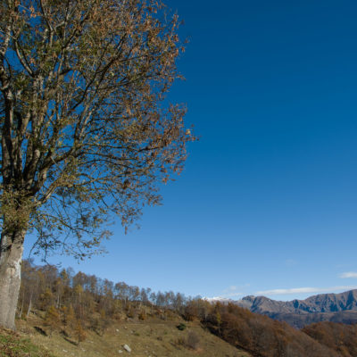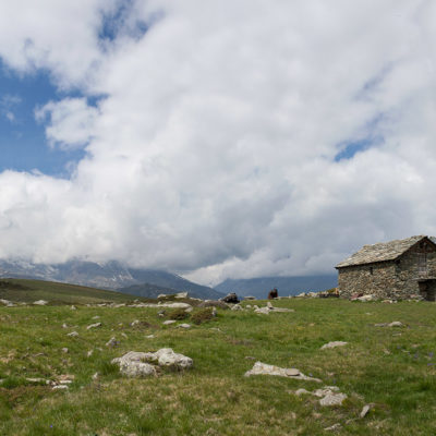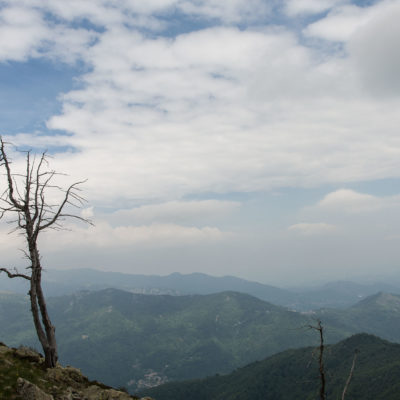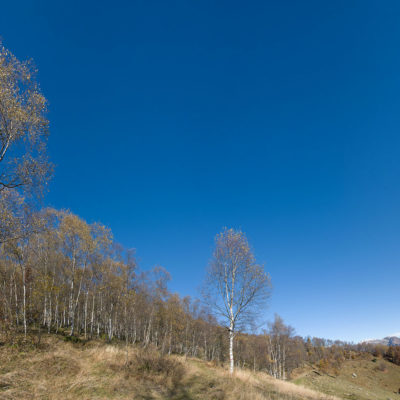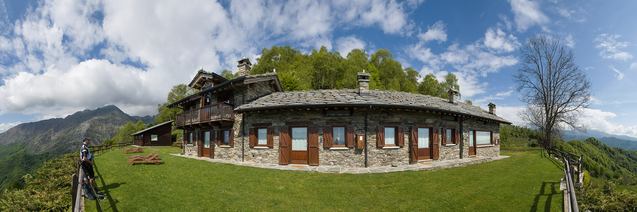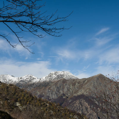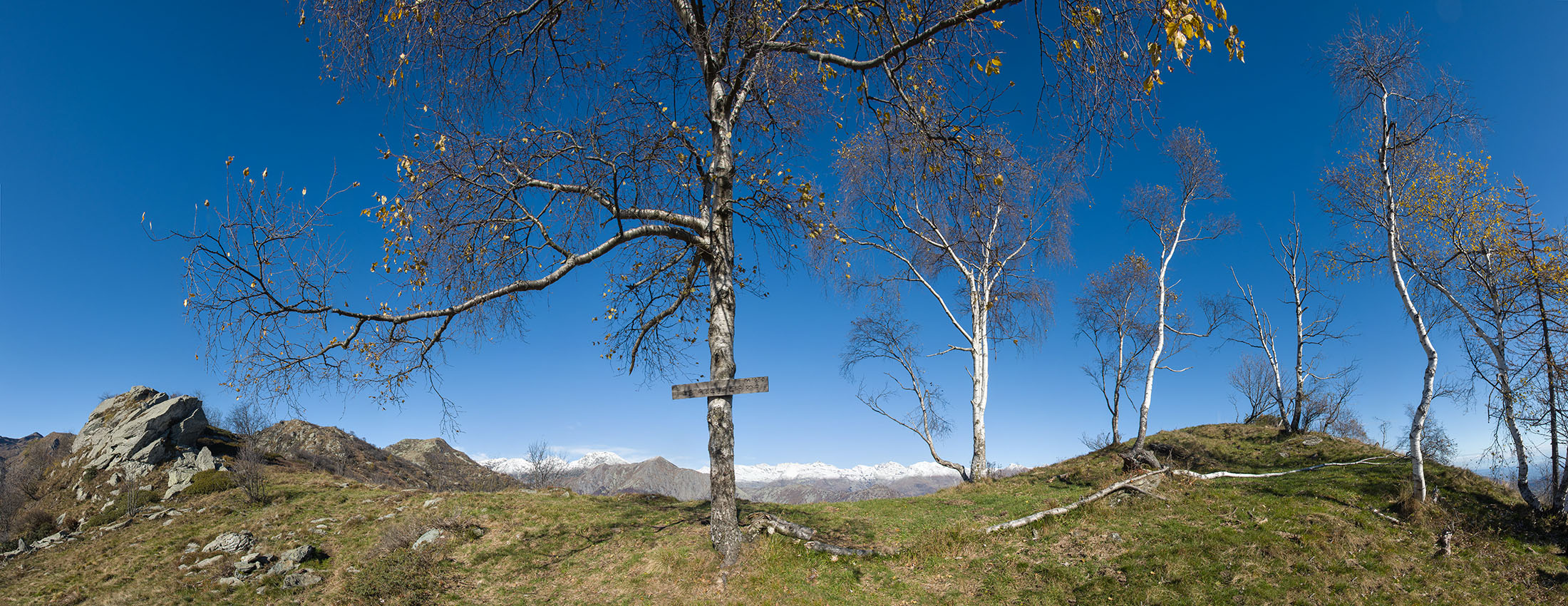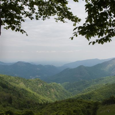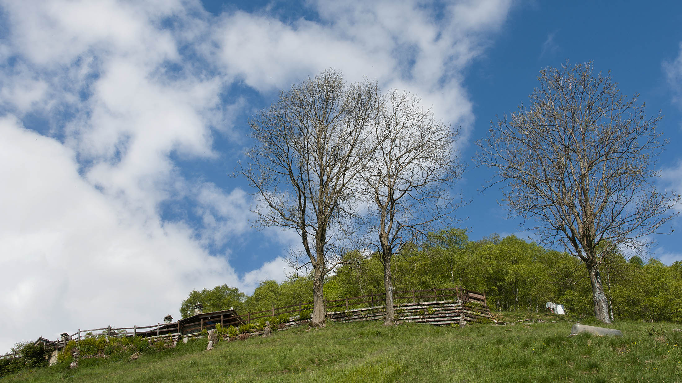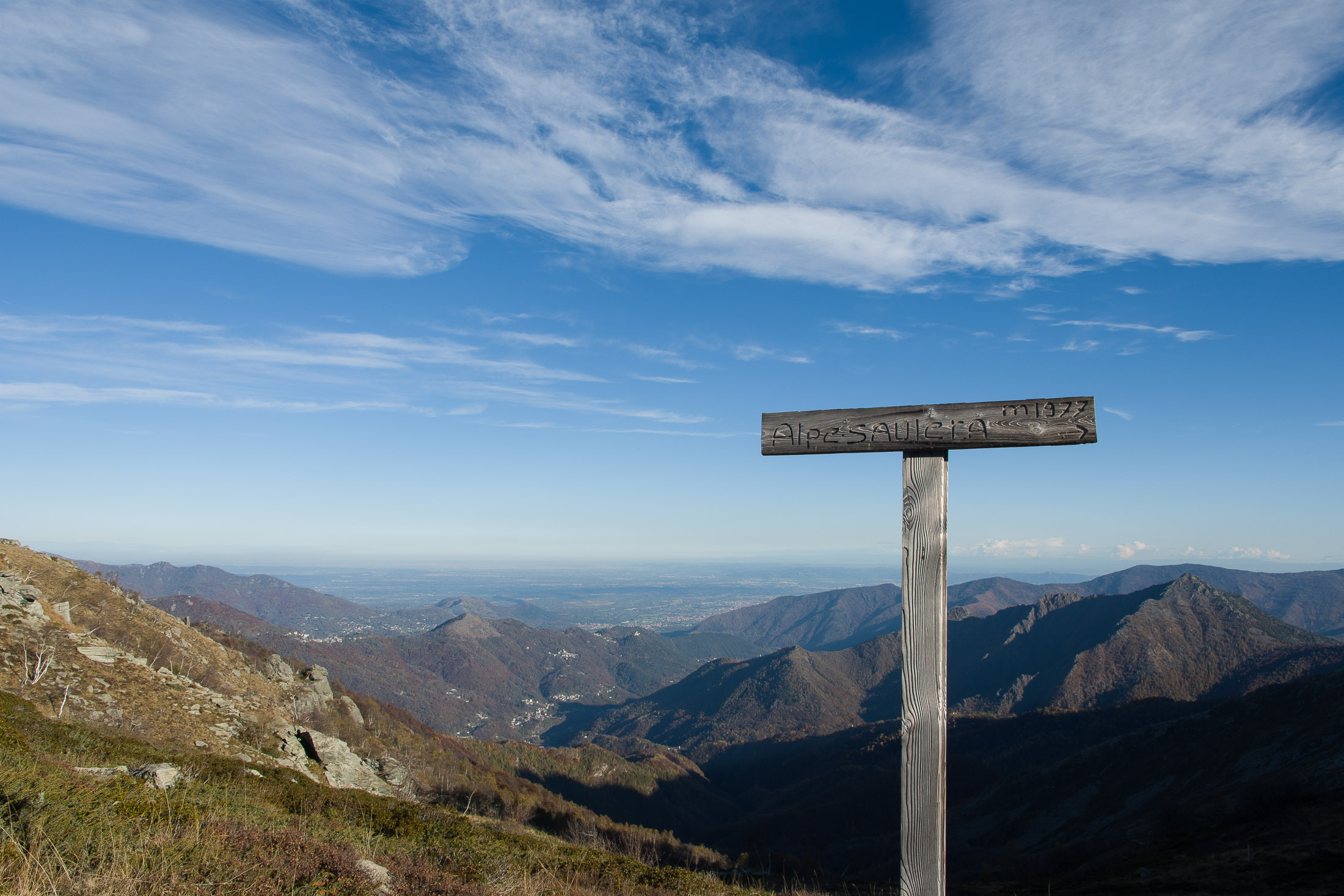 Hinter den Häusern von Giardino geht man an der Gabelung vor der Kirche rechts und folgt dem unbefestigten Alpsträsschen bis Sart (1151 m), eine ehemalige Alp, die Hütten werden noch instandgehalten und als Wochenenddomizil genutzt. Die Wiesen und Weiden in der Umgebung sind inzwischen von vielen Birken überwachsen. Bei den Alpgebäuden beginnt ein markierter Weg, der durch Buchenwald hinauf zur grossen Lichtung von Baudè (1240 m, in der Fraternali-Karte als Baudet bezeichnet) führt. Von Mai bis September stehen hier noch einige Kühe und Ziegen auf den saftigen Weiden, die schön gelegene Alp wird auch heute noch von einem Bauern aus dem Tal bewohnt und bewirtschaftet. Jenseits der Hütten verschwindet der Pfad wieder im Wald und mündet wenig später in einen Forstweg, den man nach einem kurzen Anstieg bei den Ruinen von I Nogeri (1320 m) wieder verlässt. Hier lässt man den Wald hinter sich und geht über Wiesen und Weiden zwischen alten Trockensteinmauern hinauf zur Alpe Belvedere (1452 m). Der klangvolle Name ist hier bereits Programm, die Berge und Hügel des Bassa Valle (das untere Lanzo-Tal) liegen einem zu Füssen, jenseits davon verliert sich die piemontesische Tiefebene im nahezu immerwährenden Dunst. Das ehemalige Alpgebäude wurde vor einigen Jahren wieder aufgebaut und zu Ferienwohnungen umgebaut, ideal für diejenigen, die Stille und völlige Abgeschiedenheit in Verbindung mit ein wenig Komfort mögen (nähere Informationen: www.alpebelvedere.net). Wenige Meter oberhalb zweigt bei einem Wegweiser ein markierter Pfad von der Alpstrasse ab, dieser führt zunächst leicht ansteigend auf einen mit Birken überwachsenen Rücken, kurz darauf erreicht man wieder offenes und aussichtsreiches Gelände. Weiter zwischen verstreuten Birken hinauf zum Gipfel der Testa della Cialma (1630 m). Ein paar windzerzauste Bäume, weite Blicke in die Ferne, mehr gibt es von hier oben nicht zu berichten. Einsamkeit kann so wohltuend sein.