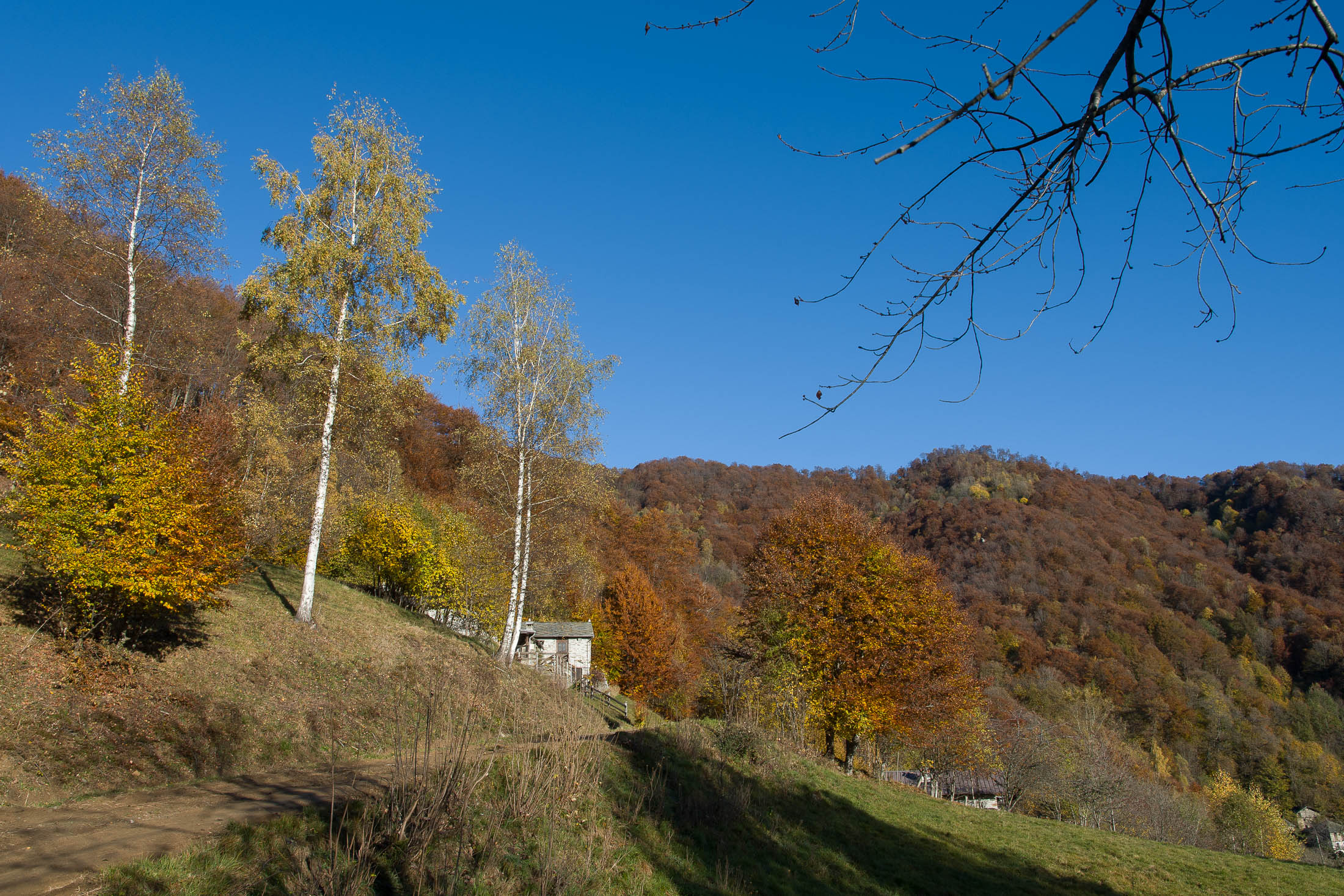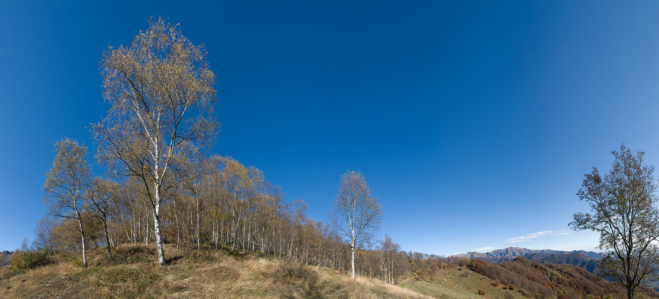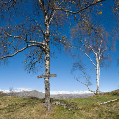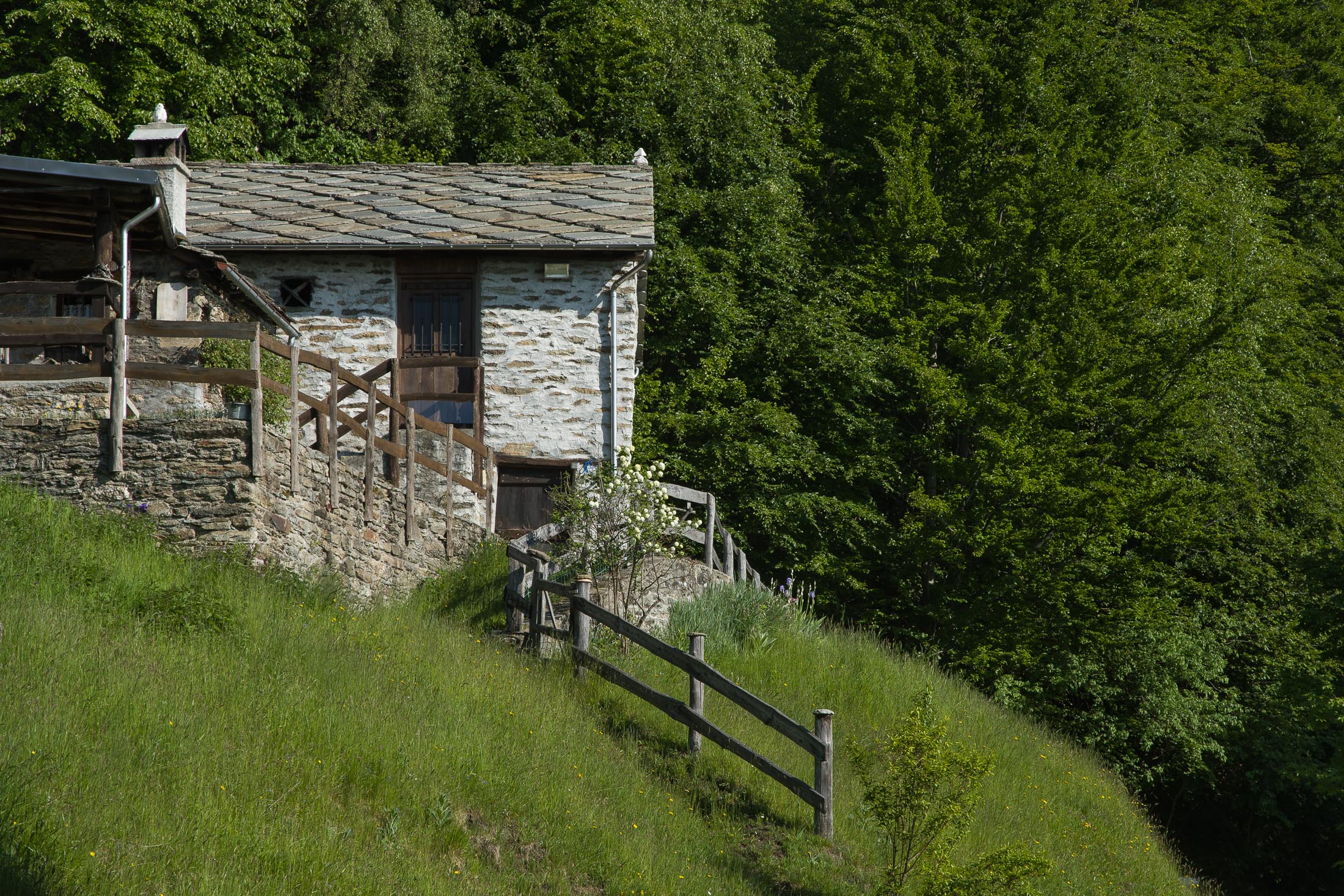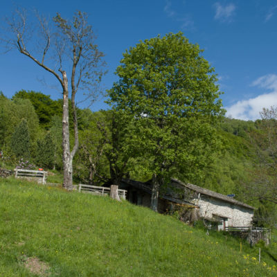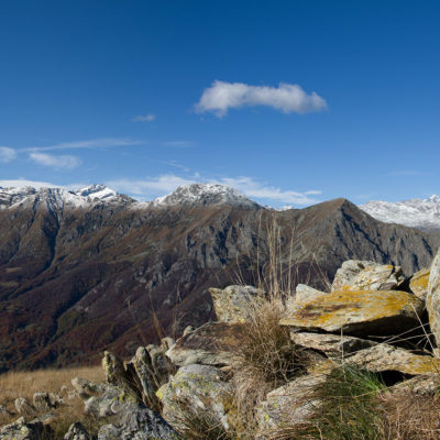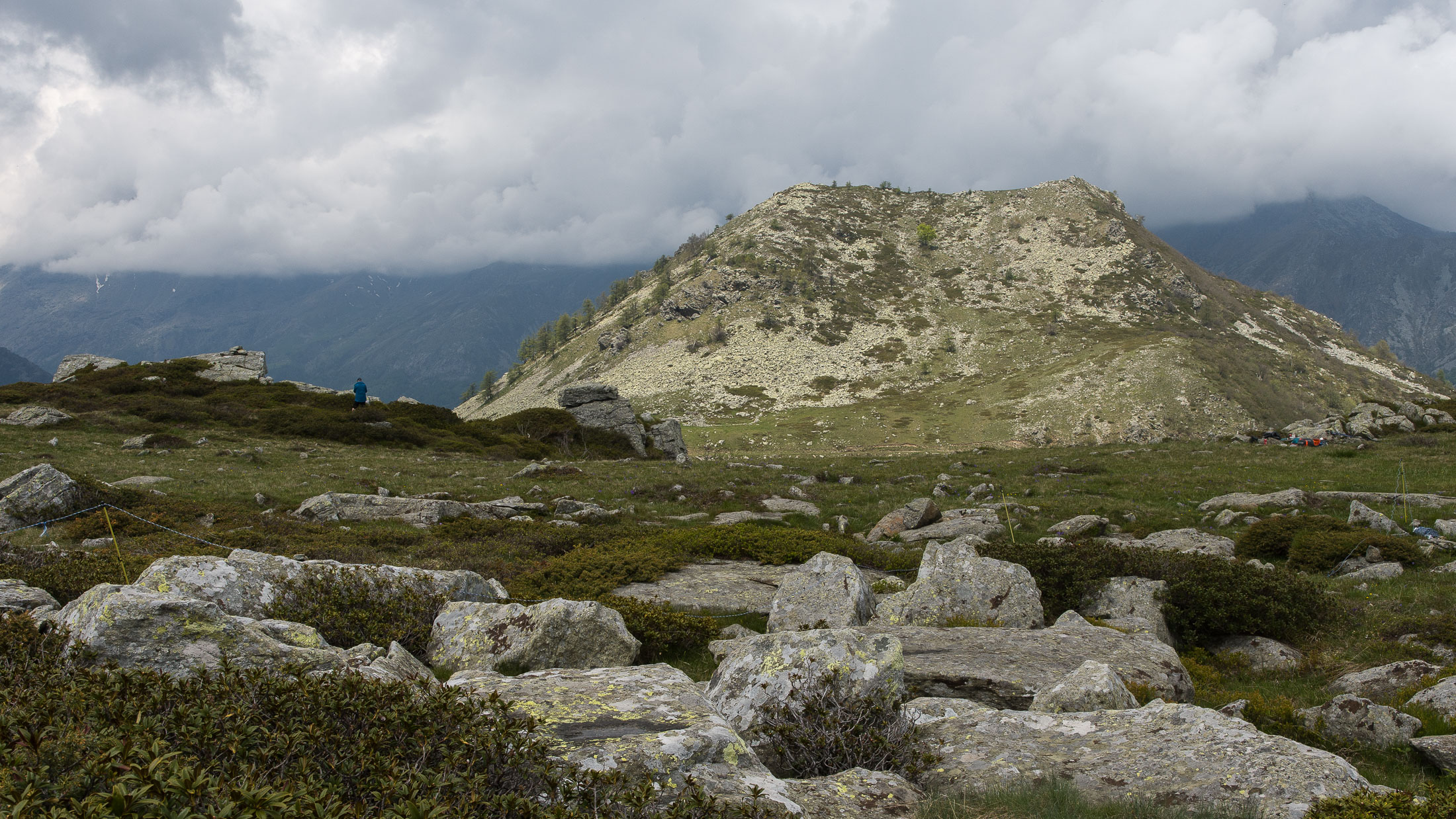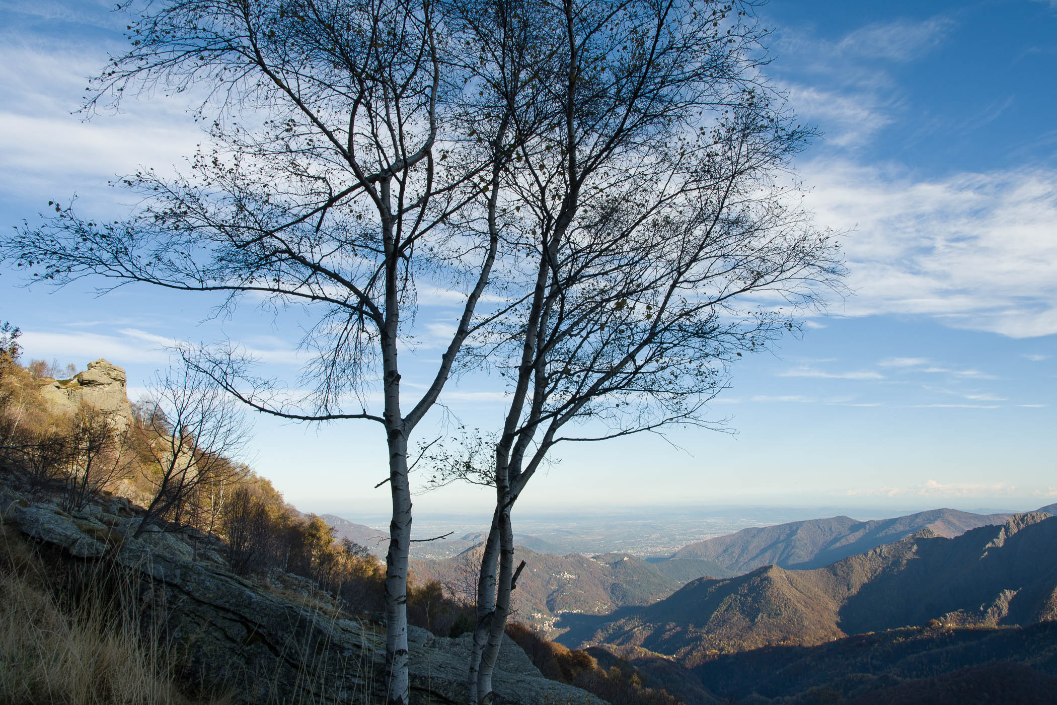Hinter den Häusern von Giardino geht man an der Gabelung vor der Kirche rechts und folgt dem unbefestigten Alpsträsschen bis Sart (1151 m), eine ehemalige Alp, die Hütten werden noch instandgehalten und als Wochenenddomizil genutzt. Die Wiesen und Weiden in der Umgebung sind inzwischen von vielen Birken überwachsen. Bei den Alpgebäuden beginnt ein markierter Weg, der durch Buchenwald hinauf zur grossen Lichtung von Baudè (1240 m, in der Fraternali-Karte als Baudet bezeichnet) führt. Von Mai bis September stehen hier noch einige Kühe und Ziegen auf den saftigen Weiden, die schön gelegene Alp wird auch heute noch von einem Bauern aus dem Tal bewohnt und bewirtschaftet. Jenseits der Hütten verschwindet der Pfad wieder im Wald und mündet wenig später in einen Forstweg, den man nach einem kurzen Anstieg bei den Ruinen von I Nogeri (1320 m) wieder verlässt. Hier lässt man den Wald hinter sich und geht über Wiesen und Weiden zwischen alten Trockensteinmauern hinauf zur Alpe Belvedere (1452 m). Der klangvolle Name ist hier bereits Programm, die Berge und Hügel des Bassa Valle (das untere Lanzo-Tal) liegen einem zu Füssen, jenseits davon verliert sich die piemontesische Tiefebene im nahezu immerwährenden Dunst. Das ehemalige Alpgebäude wurde vor einigen Jahren wieder aufgebaut und zu Ferienwohnungen umgebaut, ideal für diejenigen, die Stille und völlige Abgeschiedenheit in Verbindung mit ein wenig Komfort mögen (nähere Informationen: www.alpebelvedere.net). Wenige Meter oberhalb zweigt bei einem Wegweiser ein markierter Pfad von der Alpstrasse ab, dieser führt zunächst leicht ansteigend auf einen mit Birken überwachsenen Rücken, kurz darauf erreicht man wieder offenes und aussichtsreiches Gelände. Weiter zwischen verstreuten Birken hinauf zum Gipfel der Testa della Cialma (1630 m). Ein paar windzerzauste Bäume, weite Blicke in die Ferne, mehr gibt es von hier oben nicht zu berichten. Einsamkeit kann so wohltuend sein.