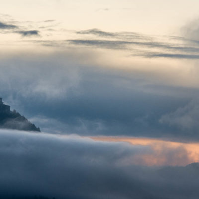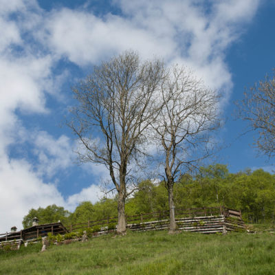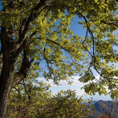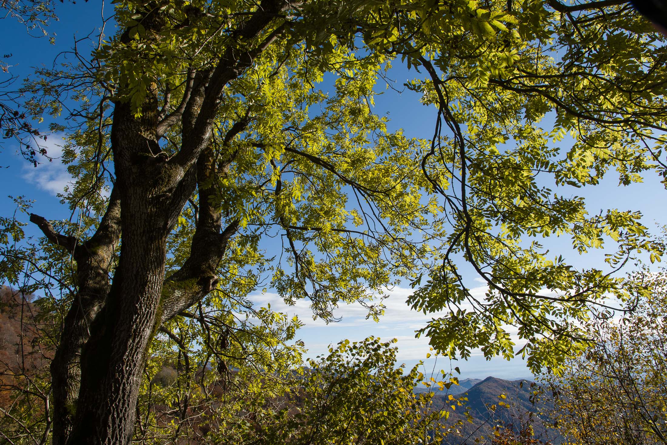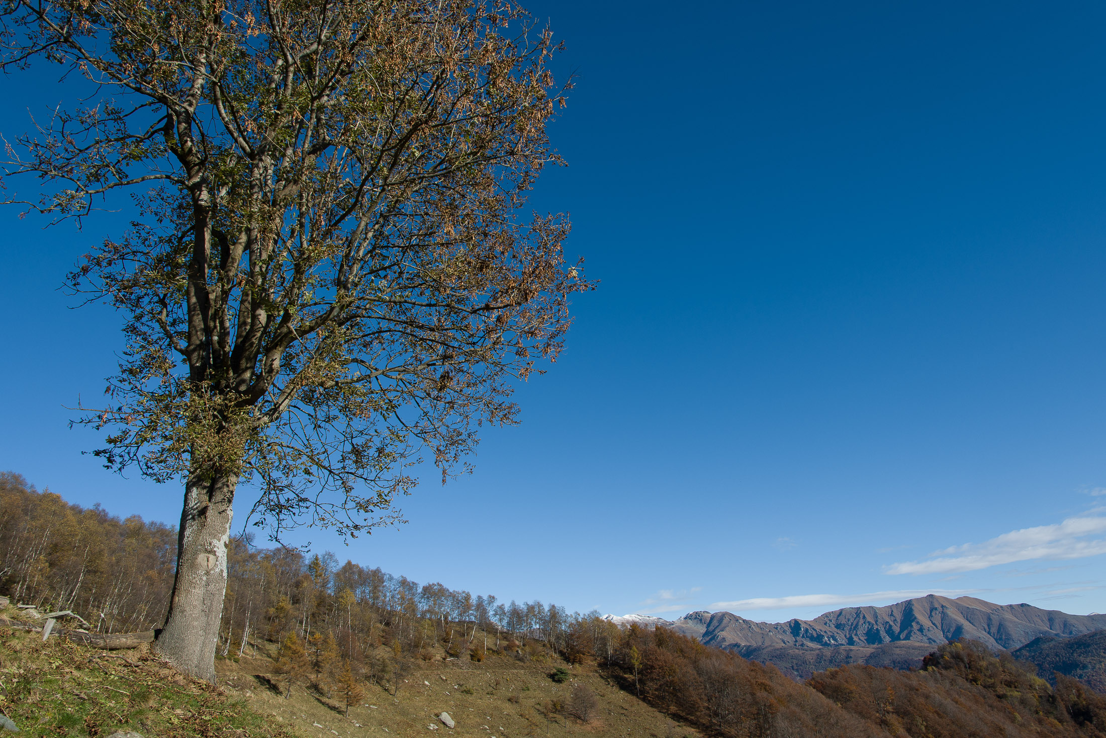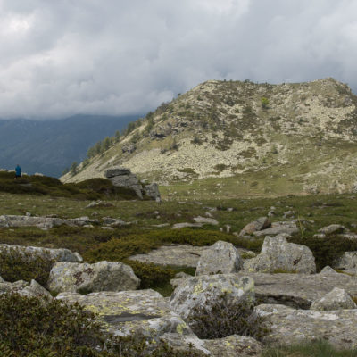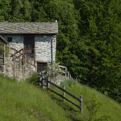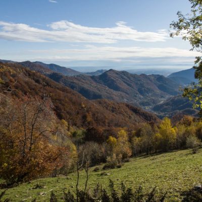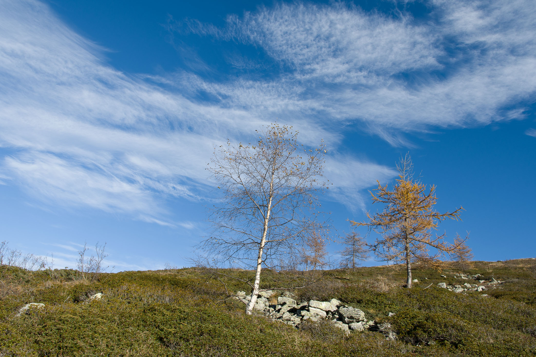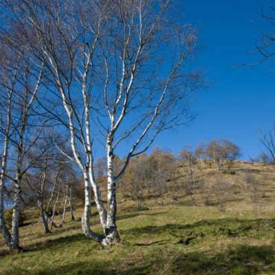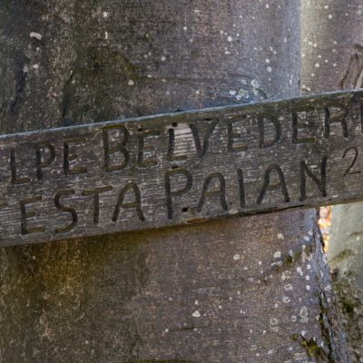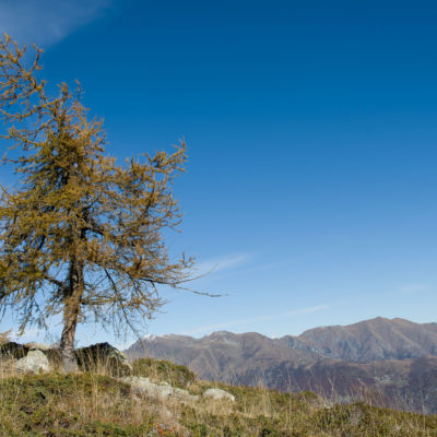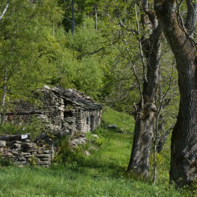 Hinter den Häusern von Giardino geht man an der Gabelung vor der Kirche rechts und folgt dem unbefestigten Alpsträsschen bis Sart (1151 m), eine ehemalige Alp, die Hütten werden noch instandgehalten und als Wochenenddomizil genutzt. Die Wiesen und Weiden in der Umgebung sind inzwischen von vielen Birken überwachsen. Bei den Alpgebäuden beginnt ein markierter Weg, der durch Buchenwald hinauf zur grossen Lichtung von Baudè (1240 m, in der Fraternali-Karte als Baudet bezeichnet) führt. Von Mai bis September stehen hier noch einige Kühe und Ziegen auf den saftigen Weiden, die schön gelegene Alp wird auch heute noch von einem Bauern aus dem Tal bewohnt und bewirtschaftet. Jenseits der Hütten verschwindet der Pfad wieder im Wald und mündet wenig später in einen Forstweg, den man nach einem kurzen Anstieg bei den Ruinen von I Nogeri (1320 m) wieder verlässt. Hier lässt man den Wald hinter sich und geht über Wiesen und Weiden zwischen alten Trockensteinmauern hinauf zur Alpe Belvedere (1452 m). Der klangvolle Name ist hier bereits Programm, die Berge und Hügel des Bassa Valle (das untere Lanzo-Tal) liegen einem zu Füssen, jenseits davon verliert sich die piemontesische Tiefebene im nahezu immerwährenden Dunst. Das ehemalige Alpgebäude wurde vor einigen Jahren wieder aufgebaut und zu Ferienwohnungen umgebaut, ideal für diejenigen, die Stille und völlige Abgeschiedenheit in Verbindung mit ein wenig Komfort mögen (nähere Informationen: www.alpebelvedere.net). Wenige Meter oberhalb zweigt bei einem Wegweiser ein markierter Pfad von der Alpstrasse ab, dieser führt zunächst leicht ansteigend auf einen mit Birken überwachsenen Rücken, kurz darauf erreicht man wieder offenes und aussichtsreiches Gelände. Weiter zwischen verstreuten Birken hinauf zum Gipfel der Testa della Cialma (1630 m). Ein paar windzerzauste Bäume, weite Blicke in die Ferne, mehr gibt es von hier oben nicht zu berichten. Einsamkeit kann so wohltuend sein.