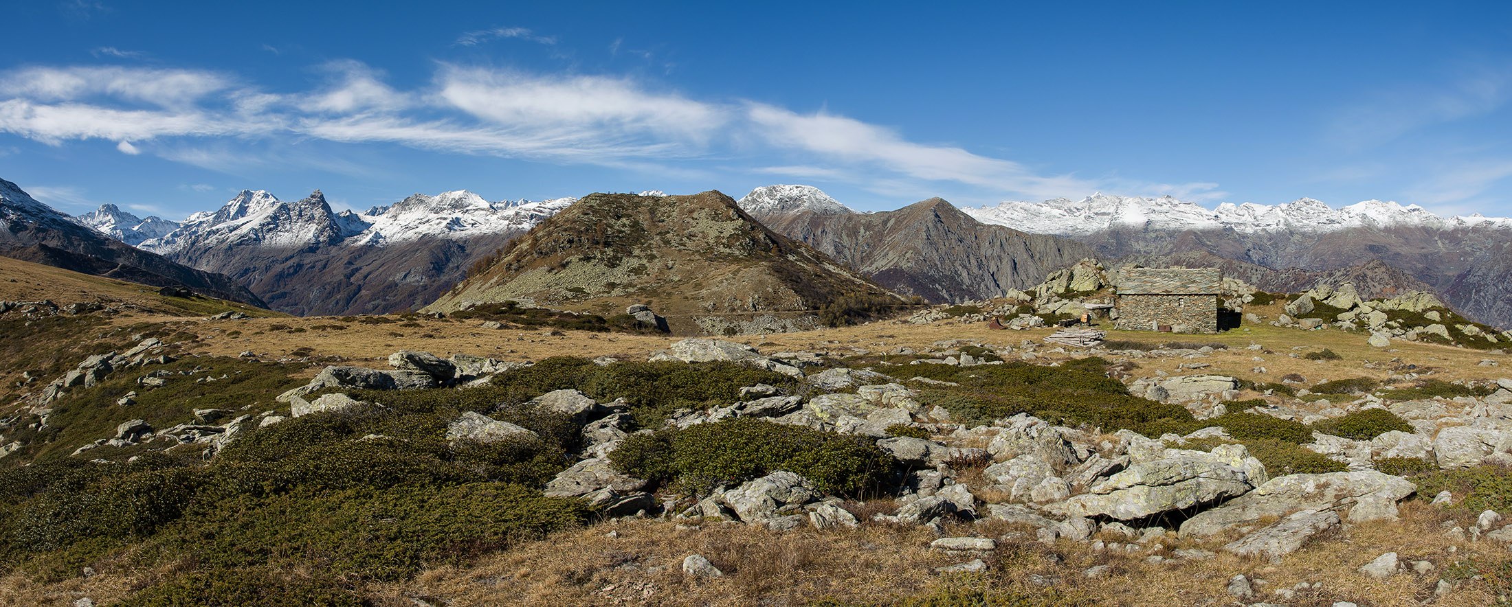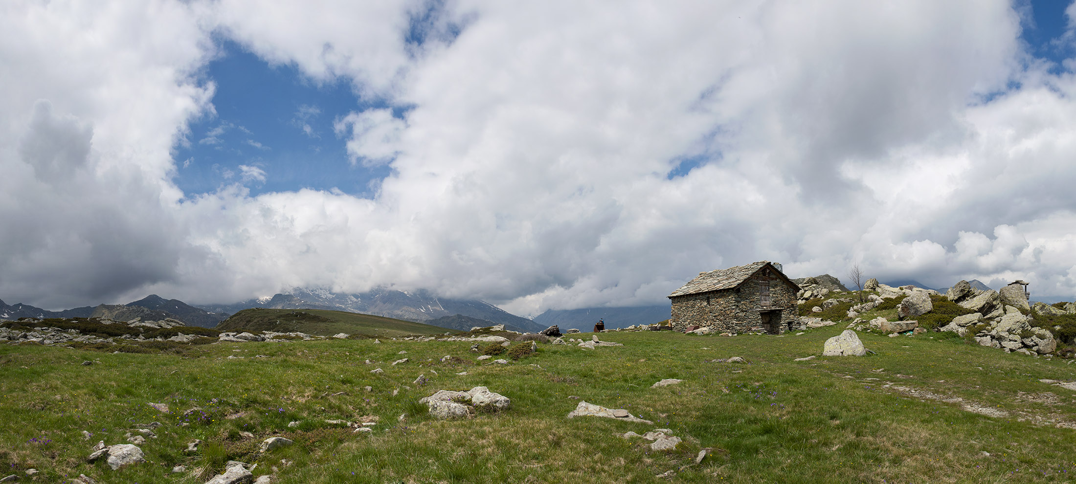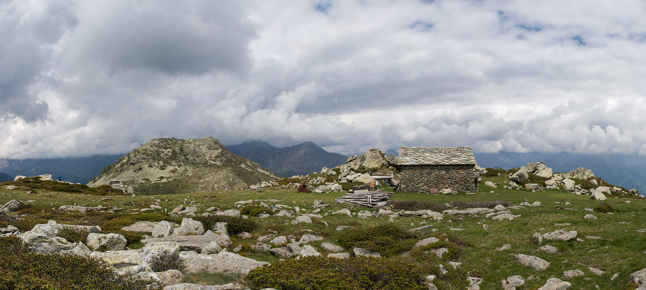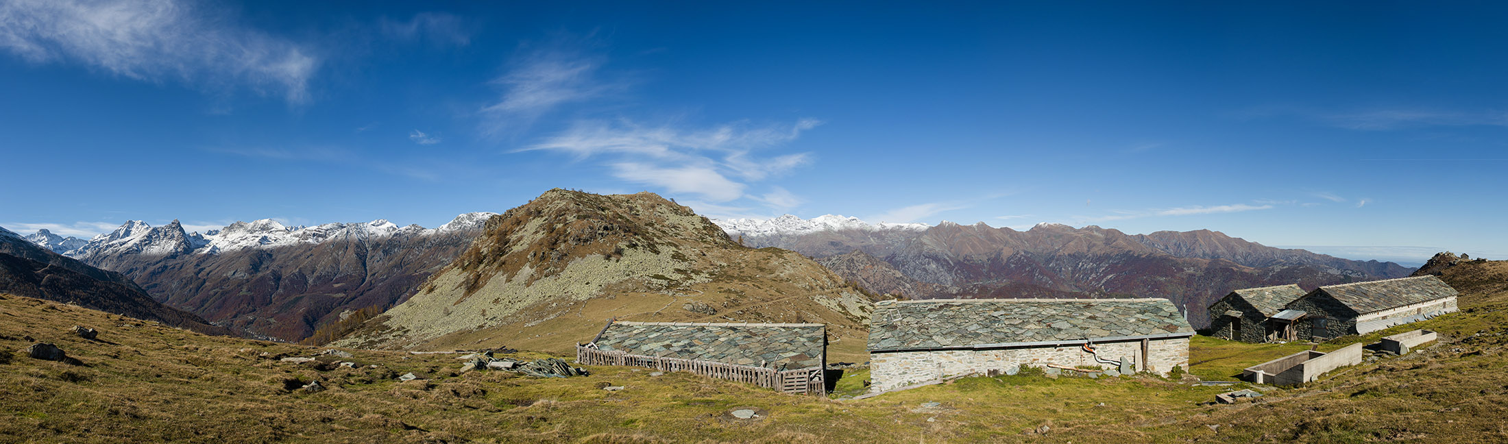 Bis zum Gipfel der Testa Paian, der breite Bergrücken unmittelbar südlich der Alpe del Conte, ist es nun nicht mehr weit. Jenseits der Alpgebäude mit den grossen Ställen geht es zunächst bergab, nach wenigen Metern mündet der breite Weg in eine unbefestigte Alpstrasse, der man rechts folgt. Kurz darauf geht man links über eine Weide (Wegweiser), nach einem 20-minütigen steilen Schlussanstieg steht man auf dem flachen Gipfelplateau der Testa Paian (1856 m). Das Panorama von diesem weltabgeschiedenen Ort ist umfassend und eindrücklich. Im Westen präsentiert sich, zum Greifen nah, die Gipfelkulisse des Val d‘Ala, das mittlere der drei Lanzo-Täler, Bessanese (3604 m), Uja di Ciamarella (3677 m) und Uja di Mondrone (2964 m) sind hier die markantesten Erhebungen. Im Norden zeigt sich der Gran Paradiso (4061 m), im Süden der lange Grat von der Rocca Moross (2135 m) bis zum Monte Ciriunda (2244 m), Richtung Osten blickt man ins Bassa Valle und auf die dahinterliegende Tiefebene.