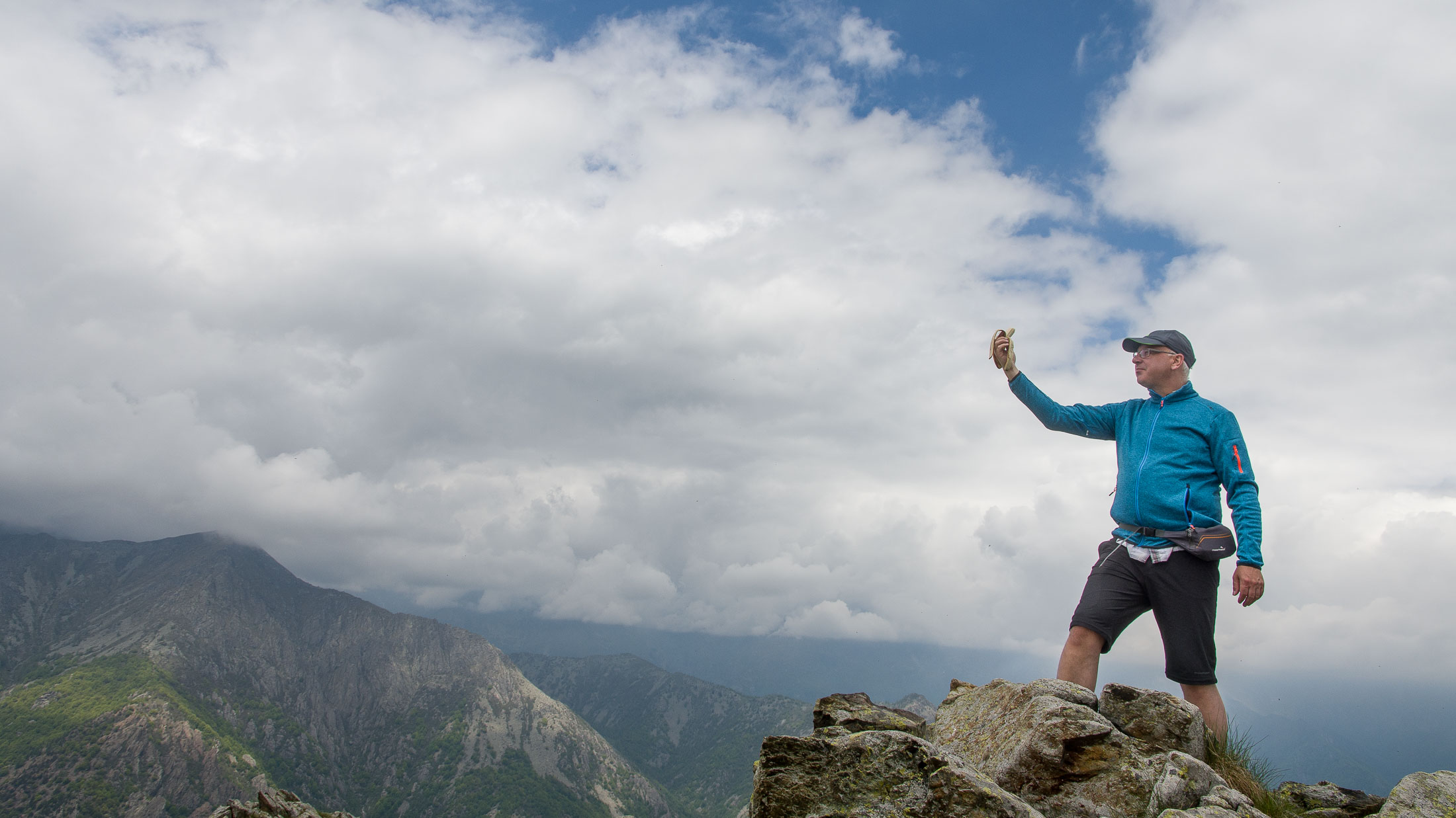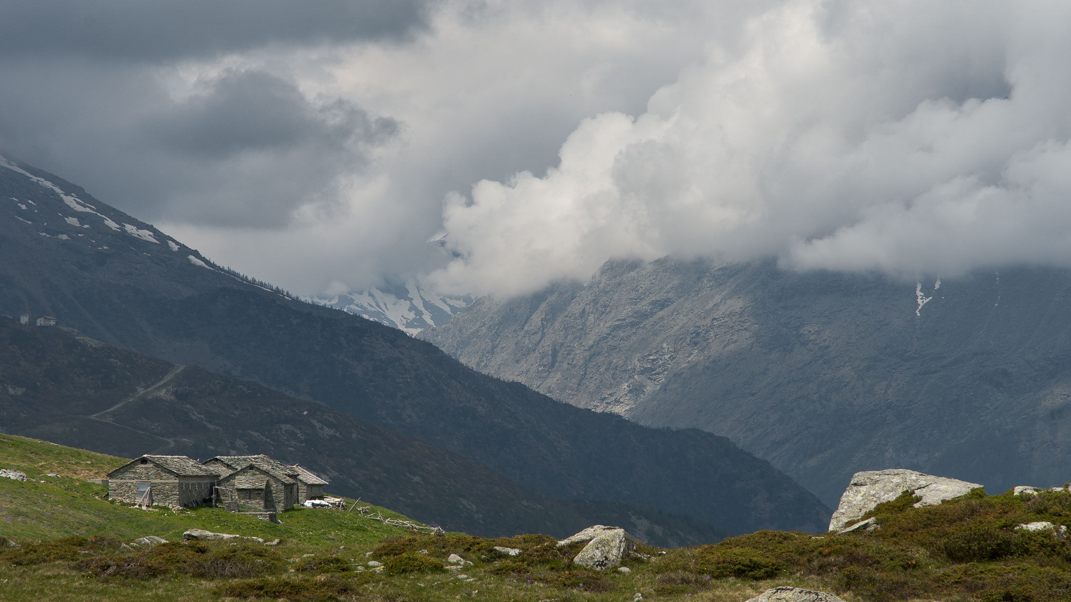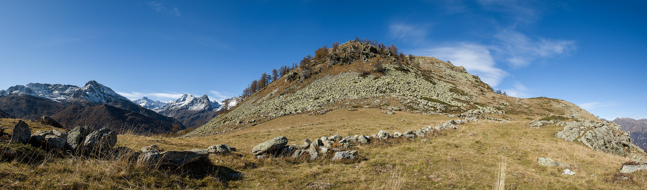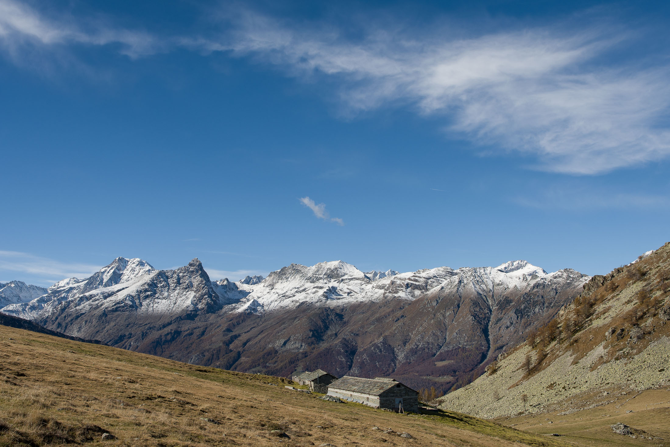 Bis zum Gipfel der Testa Paian, der breite Bergrücken unmittelbar südlich der Alpe del Conte, ist es nun nicht mehr weit. Jenseits der Alpgebäude mit den grossen Ställen geht es zunächst bergab, nach wenigen Metern mündet der breite Weg in eine unbefestigte Alpstrasse, der man rechts folgt. Kurz darauf geht man links über eine Weide (Wegweiser), nach einem 20-minütigen steilen Schlussanstieg steht man auf dem flachen Gipfelplateau der Testa Paian (1856 m). Das Panorama von diesem weltabgeschiedenen Ort ist umfassend und eindrücklich. Im Westen präsentiert sich, zum Greifen nah, die Gipfelkulisse des Val d‘Ala, das mittlere der drei Lanzo-Täler, Bessanese (3604 m), Uja di Ciamarella (3677 m) und Uja di Mondrone (2964 m) sind hier die markantesten Erhebungen. Im Norden zeigt sich der Gran Paradiso (4061 m), im Süden der lange Grat von der Rocca Moross (2135 m) bis zum Monte Ciriunda (2244 m), Richtung Osten blickt man ins Bassa Valle und auf die dahinterliegende Tiefebene.