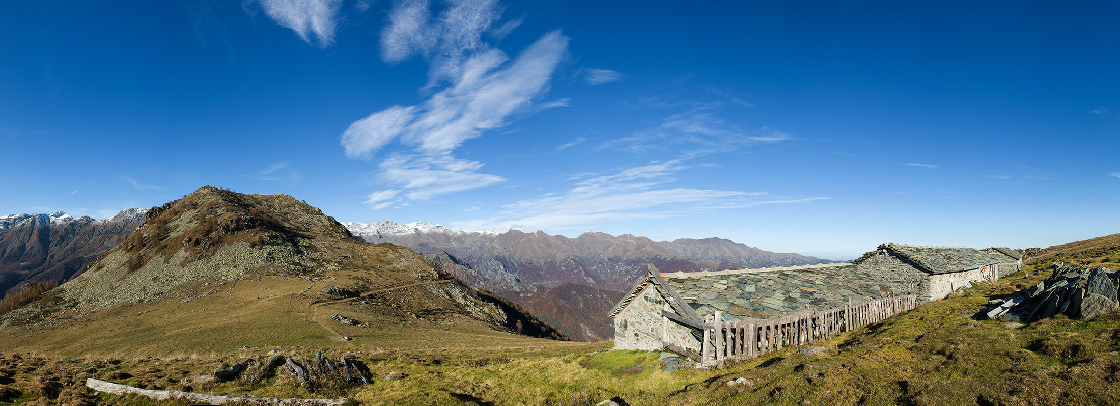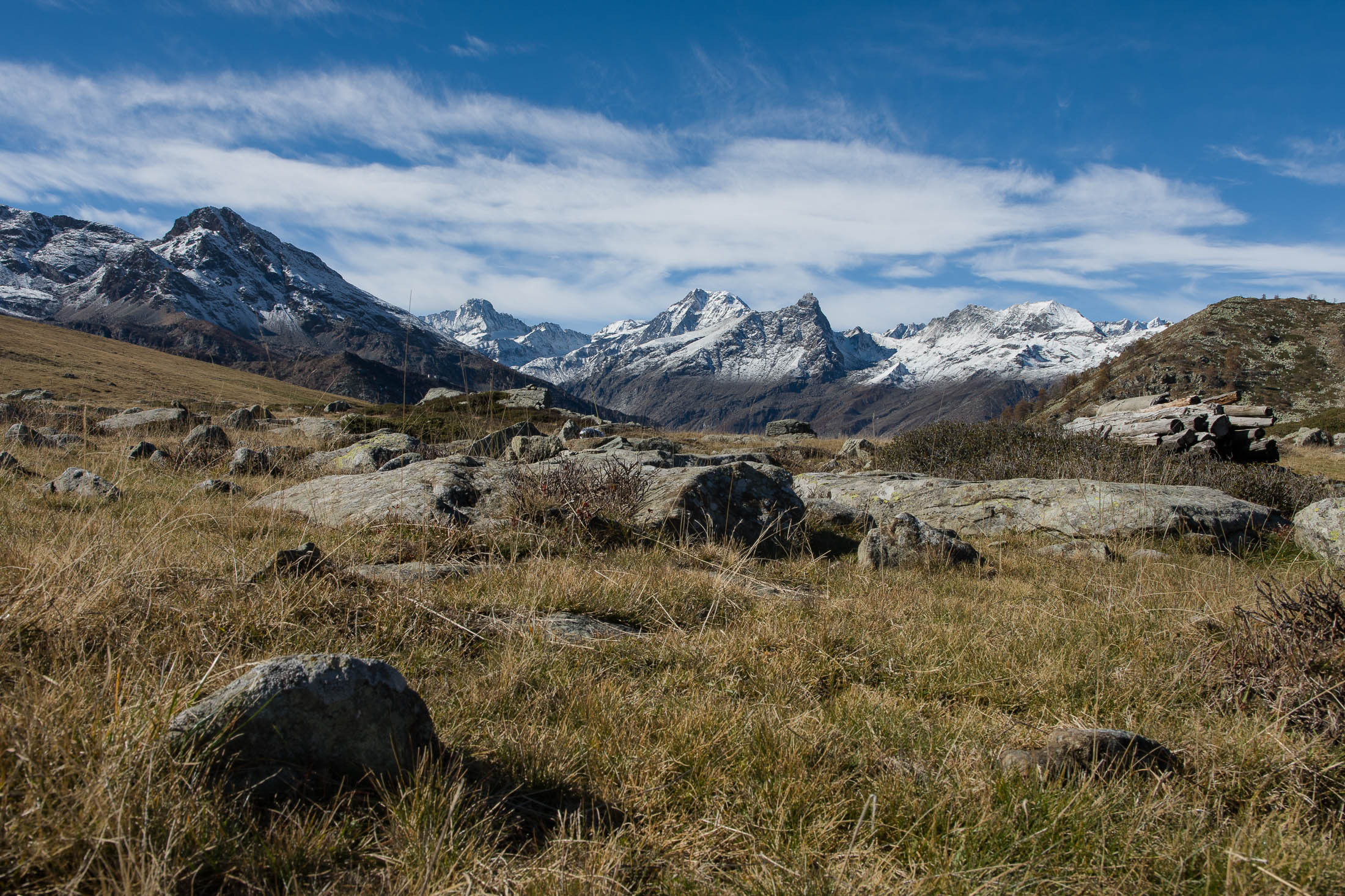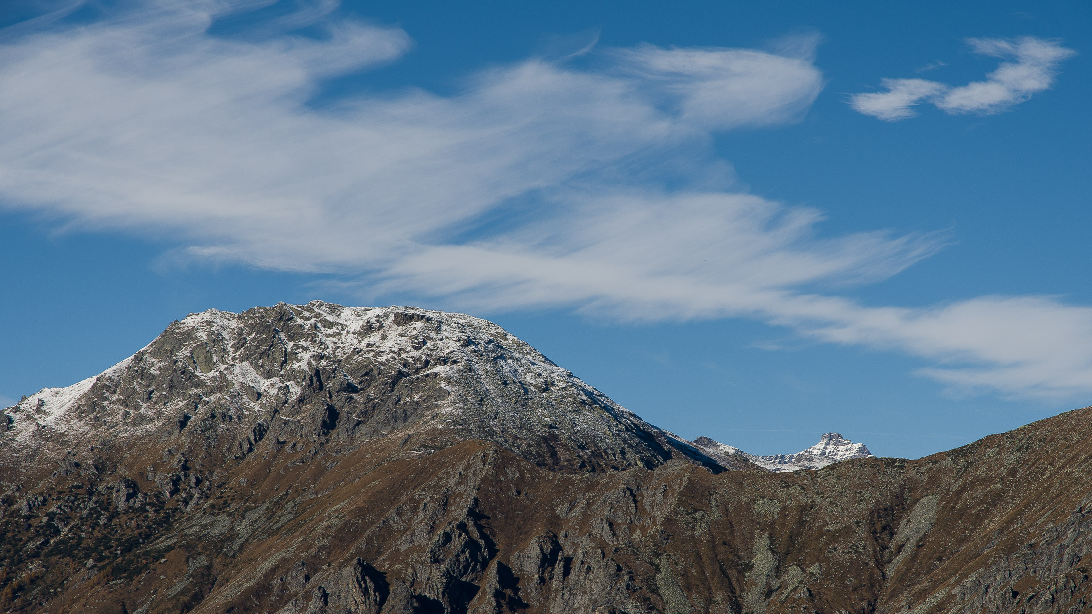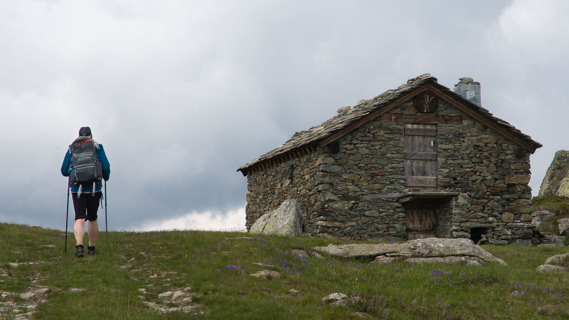 Bis zum Gipfel der Testa Paian, der breite Bergrücken unmittelbar südlich der Alpe del Conte, ist es nun nicht mehr weit. Jenseits der Alpgebäude mit den grossen Ställen geht es zunächst bergab, nach wenigen Metern mündet der breite Weg in eine unbefestigte Alpstrasse, der man rechts folgt. Kurz darauf geht man links über eine Weide (Wegweiser), nach einem 20-minütigen steilen Schlussanstieg steht man auf dem flachen Gipfelplateau der Testa Paian (1856 m). Das Panorama von diesem weltabgeschiedenen Ort ist umfassend und eindrücklich. Im Westen präsentiert sich, zum Greifen nah, die Gipfelkulisse des Val d‘Ala, das mittlere der drei Lanzo-Täler, Bessanese (3604 m), Uja di Ciamarella (3677 m) und Uja di Mondrone (2964 m) sind hier die markantesten Erhebungen. Im Norden zeigt sich der Gran Paradiso (4061 m), im Süden der lange Grat von der Rocca Moross (2135 m) bis zum Monte Ciriunda (2244 m), Richtung Osten blickt man ins Bassa Valle und auf die dahinterliegende Tiefebene.