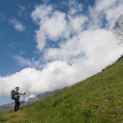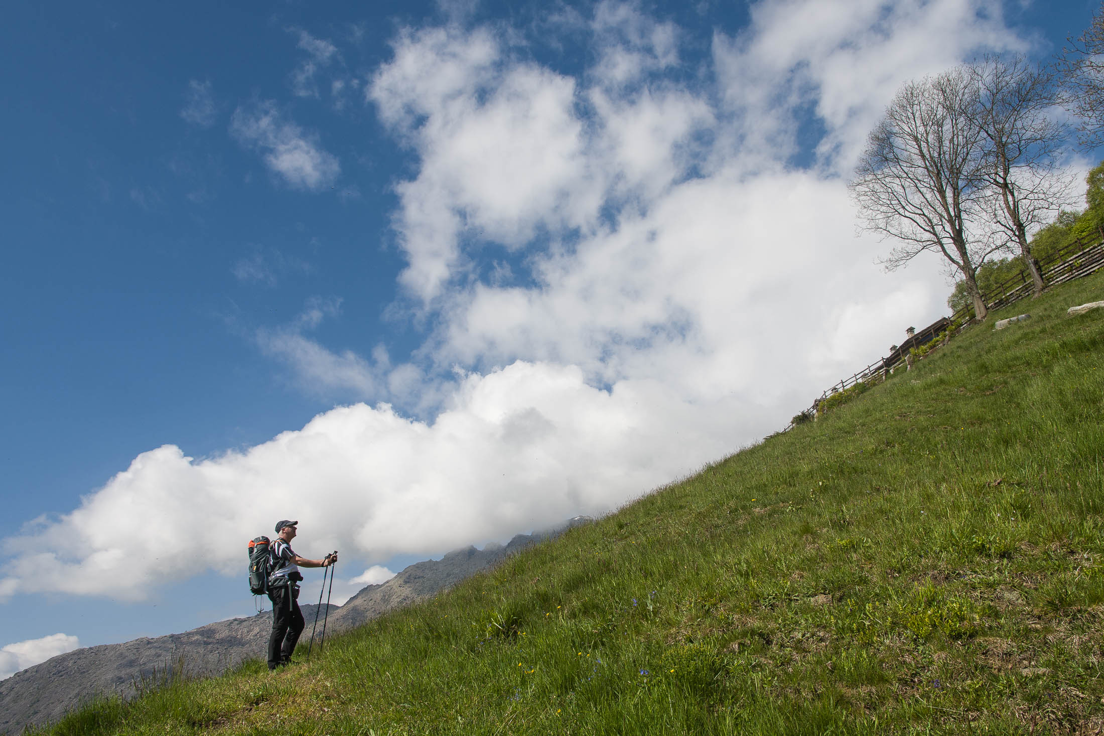 Der Weiterweg führt zunächst ohne nennenswerte Höhenunterschiede weiter Richtung Westen, die Umgebung ist überwachsen mit Alpenrosen, Wacholderbüschen, Birken und vielen verstreuten Ebereschen. Im März und April können hier noch einige Schneereste liegen, da die zu durchquerende Flanke nordexponiert im Schatten liegt. Nach einem kurzen Anstieg mündet der ansonsten einfach zu begehende Pfad in einen unbefestigten Fahrweg, auf diesem weiter aufwärts bis zu einem einzelstehenden Alpgebäude. Die Landschaft ändert sich plötzlich schlagartig, vor einem liegt die weitläufige Hochfläche der Alpe del Conte (1767 m). Wahrlich ein stimmungsvoller und faszinierender Ort, die endlose Weite und das atemberaubende Panorama laden Verweilen ein, hier möchte man so schnell nicht mehr weg. Das Gebimmel der Kuhglocken sorgt für die passende Begleitmusik. Die Alpe del Conte ist von Juli bis Mitte September bewohnt und bewirtschaftet. Die Kühe werden noch von Hand gemolken, die Milch wird sofort vor Ort zu Käse verarbeitet, ebenfalls in traditioneller Handarbeit, morgens und abends, eigentlich hat sich hier oben in den letzten 100 Jahren nichts verändert. Und das ist gut so. Die Alpe del Conte (Conte = dt. Graf) wurde einst nach dem Grafen Luigi Francesetti (1775–1850) von Mezzenile benannt, er war Unternehmer, Intellektueller und Politiker. Im Frühling und im Frühsommer sind die Alpwiesen ein riesiges Blumenmeer, Veilchen und Enziane geben sich ein farbenfrohes Stelldichein.