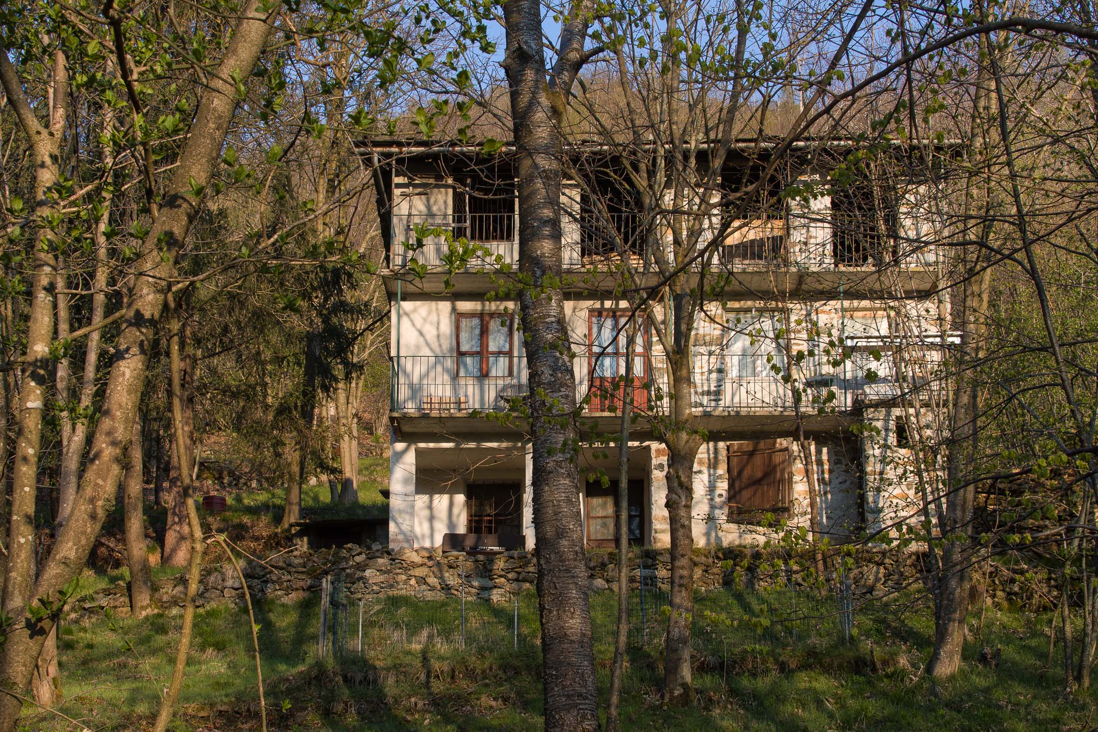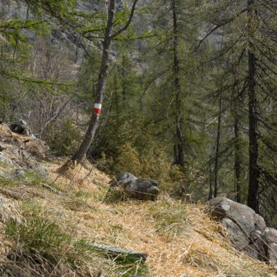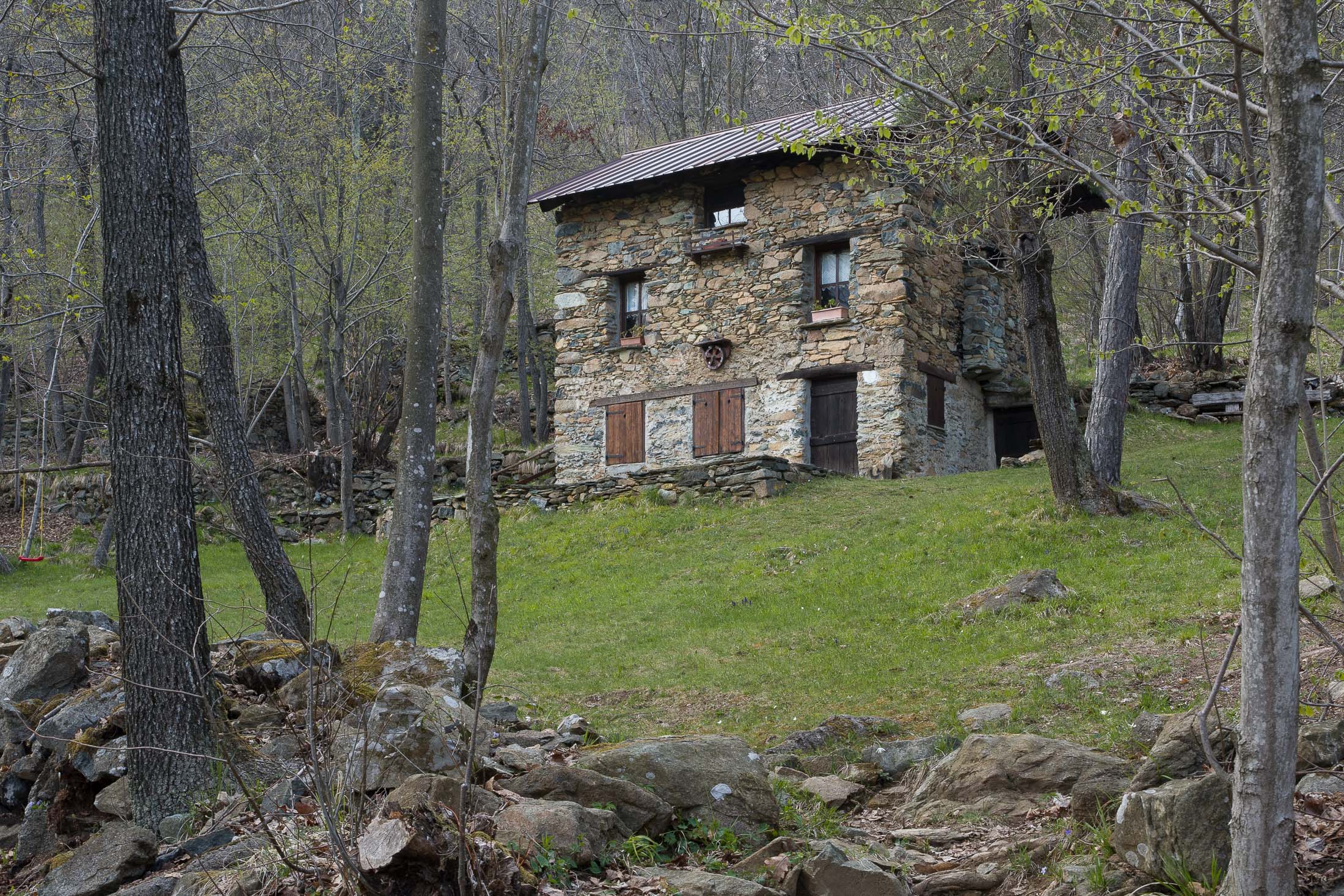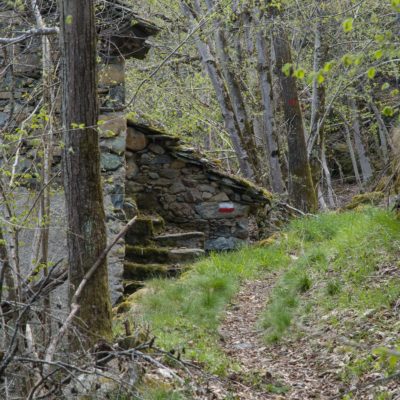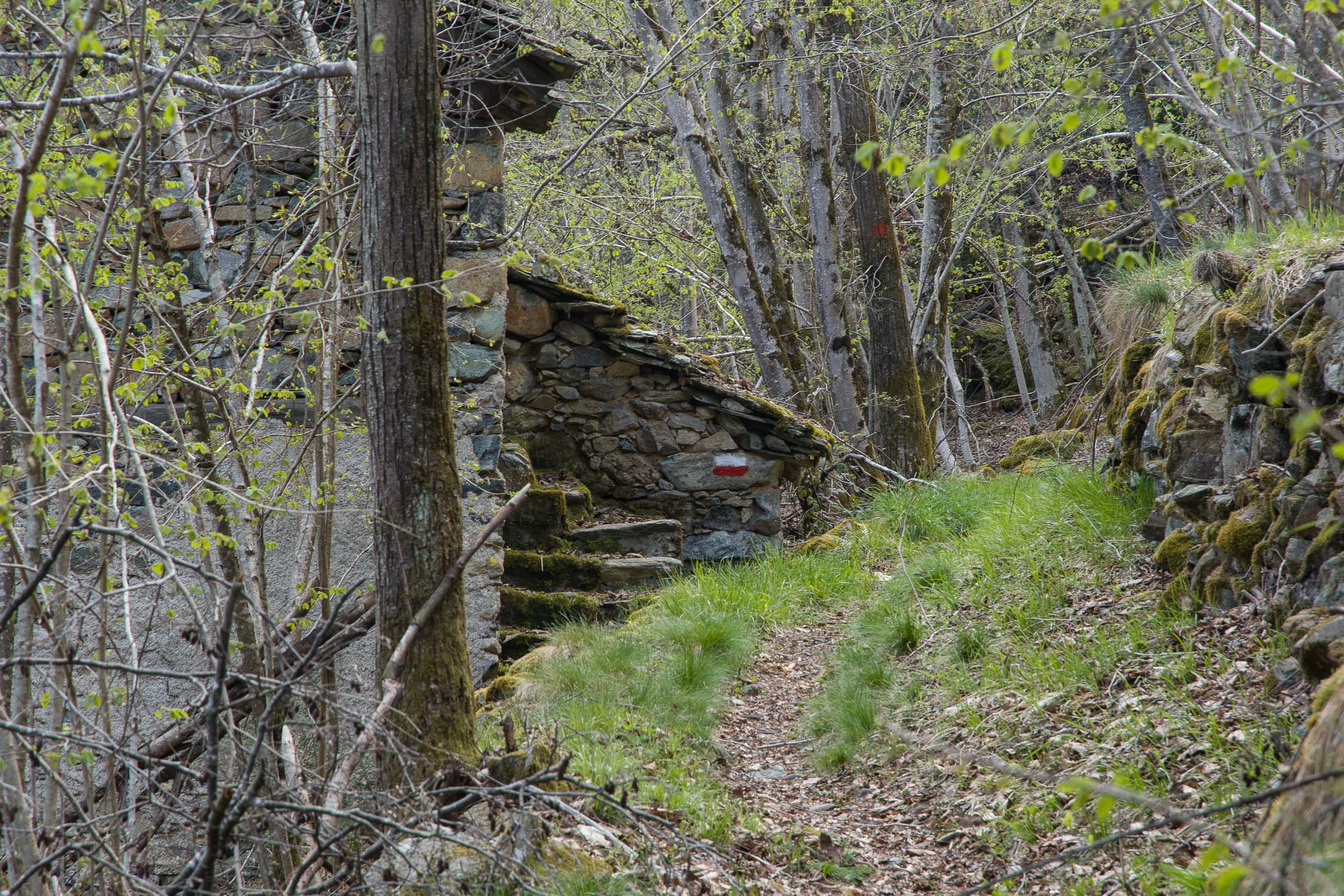 Der Abstieg verläuft zunächst auf der Aufstiegsroute bis zum Colle Prà Lorenzo (1388 m), dort geht man geradeaus und folgt dem Grat für einige Minuten, bevor der Weg Richtung Nordosten abknickt. Auf grasigem Pfad steigt man nun durch verbuschendes ehemaliges Weideland ab und kommt zu der einzelstehenden Hütte von Bramafam (1100 m), eine seit langem aufgegebene Alp. Ein gottverlassener und mystisch anmutender Ort inmitten der Einsamkeit, in der Umgebung ragen unzählige abgestorbene Baumgerippe in den Himmel, was der Schönheit der Gegend jedoch keinen Abbruch tut. Von Bramafam geht es weiterhin kontinuierlich bergab, in den Sommermonaten wandert man hier und da durch hohes Gras. Schliesslich erreicht man den Talboden des Vallone di Ordagna und überquert den gleichnamigen Bach, der wenige Kilometer östlich in die Stura di Viù mündet. Der jetzt deutlich bessere Weg verläuft nun relativ eben durch dichten Wald, vorbei an den aufgegebenen Alpsiedlungen von Combacistel, Piazzola und Muande Castagna, die heute nahezu alle in Ruinen liegen. Kurz darauf kommt man nach Case Figial (750 m), ein hübsch renoviertes Anwesen auf einer kleinen Lichtung, was heute noch als Wochenend- oder Feriendomizil genutzt wird. Das verbleibende Wegstück ist gemütliches Genusswandern, zunächst führt der Weg ohne nennenswerte Höhenunterschiede entlang eines historischen Bewässerungskanals zu dem einzelstehenden Bildstock am Colle Colmet (717 m). Von dort geht es auf schönem Waldweg sanft bergab, wenig später erreicht man die Häuser der Località Fontana und eine Fahrstrasse, auf der man in 10 Minuten zur Kirche von Villa (628 m), dem Hauptort von Traves, zurückkehrt.