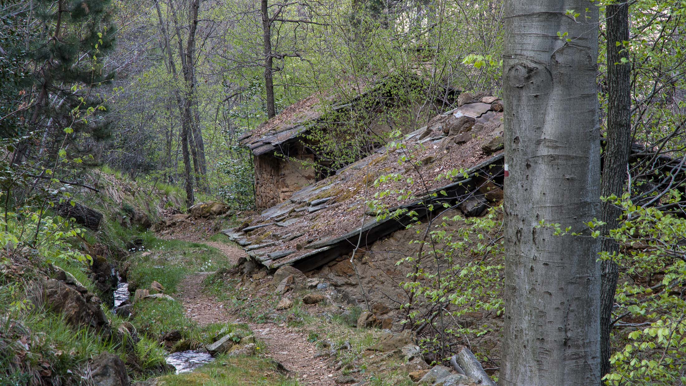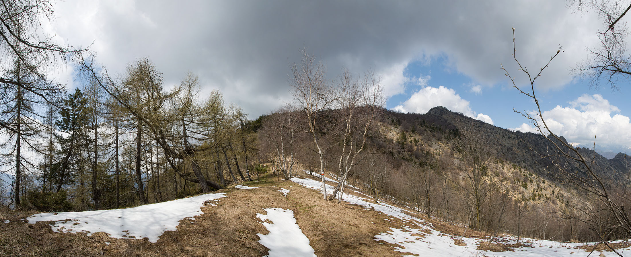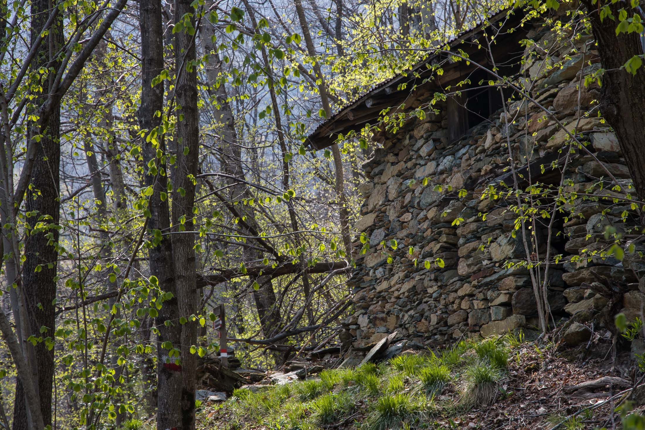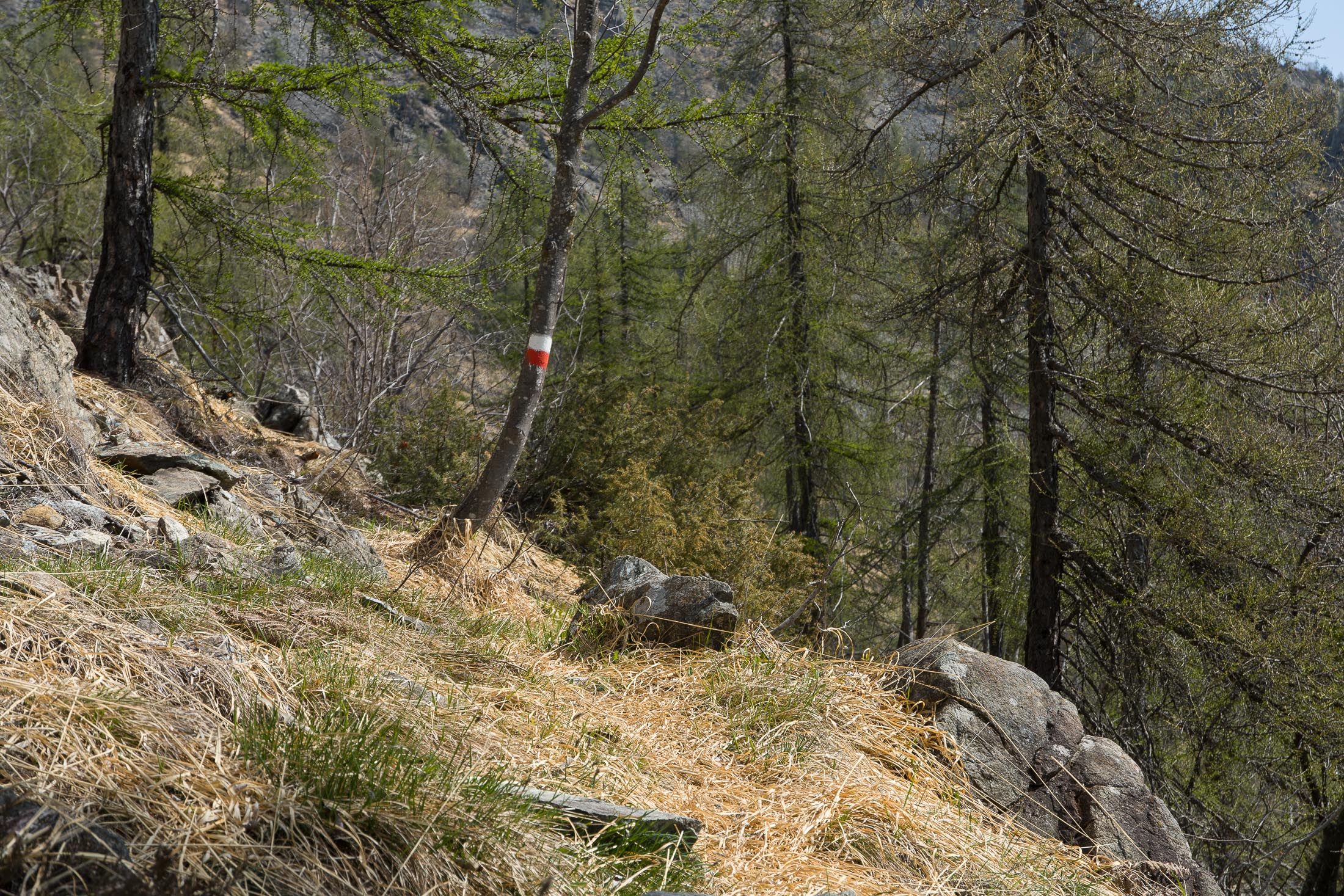 Der Abstieg verläuft zunächst auf der Aufstiegsroute bis zum Colle Prà Lorenzo (1388 m), dort geht man geradeaus und folgt dem Grat für einige Minuten, bevor der Weg Richtung Nordosten abknickt. Auf grasigem Pfad steigt man nun durch verbuschendes ehemaliges Weideland ab und kommt zu der einzelstehenden Hütte von Bramafam (1100 m), eine seit langem aufgegebene Alp. Ein gottverlassener und mystisch anmutender Ort inmitten der Einsamkeit, in der Umgebung ragen unzählige abgestorbene Baumgerippe in den Himmel, was der Schönheit der Gegend jedoch keinen Abbruch tut. Von Bramafam geht es weiterhin kontinuierlich bergab, in den Sommermonaten wandert man hier und da durch hohes Gras. Schliesslich erreicht man den Talboden des Vallone di Ordagna und überquert den gleichnamigen Bach, der wenige Kilometer östlich in die Stura di Viù mündet. Der jetzt deutlich bessere Weg verläuft nun relativ eben durch dichten Wald, vorbei an den aufgegebenen Alpsiedlungen von Combacistel, Piazzola und Muande Castagna, die heute nahezu alle in Ruinen liegen. Kurz darauf kommt man nach Case Figial (750 m), ein hübsch renoviertes Anwesen auf einer kleinen Lichtung, was heute noch als Wochenend- oder Feriendomizil genutzt wird. Das verbleibende Wegstück ist gemütliches Genusswandern, zunächst führt der Weg ohne nennenswerte Höhenunterschiede entlang eines historischen Bewässerungskanals zu dem einzelstehenden Bildstock am Colle Colmet (717 m). Von dort geht es auf schönem Waldweg sanft bergab, wenig später erreicht man die Häuser der Località Fontana und eine Fahrstrasse, auf der man in 10 Minuten zur Kirche von Villa (628 m), dem Hauptort von Traves, zurückkehrt.