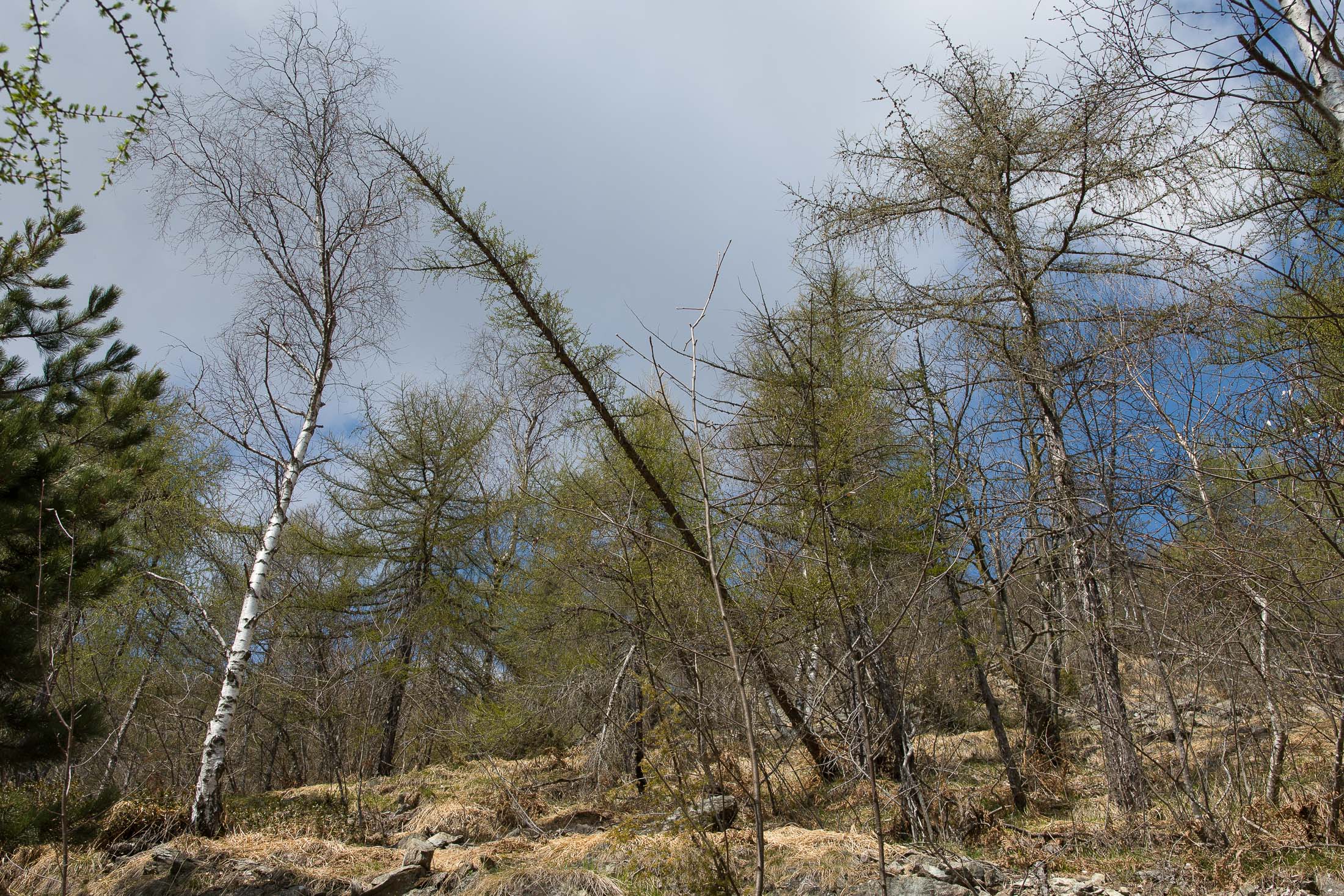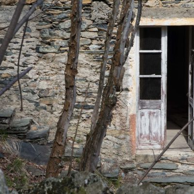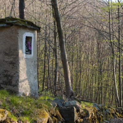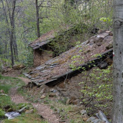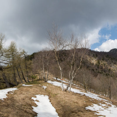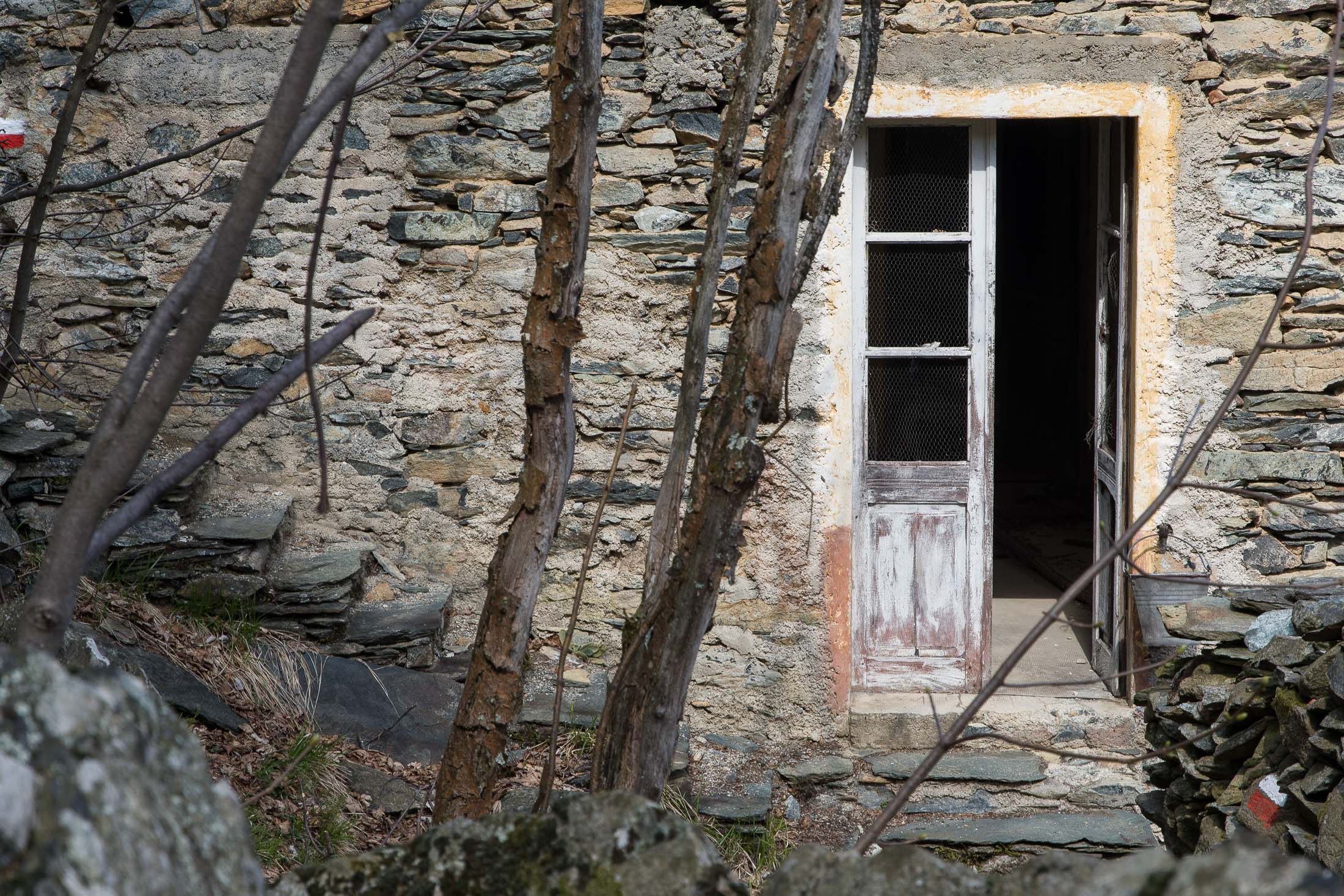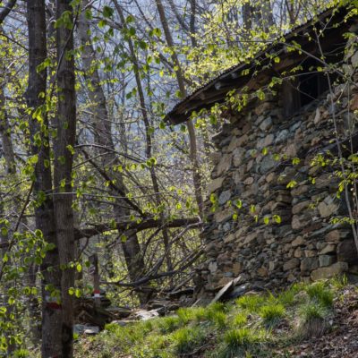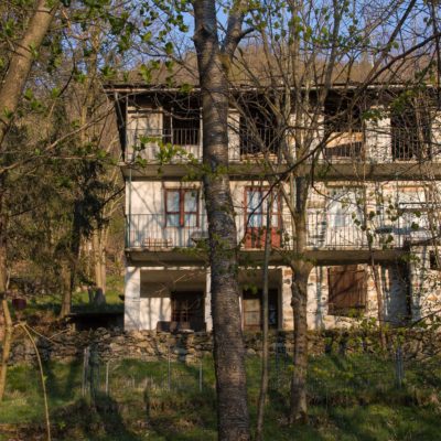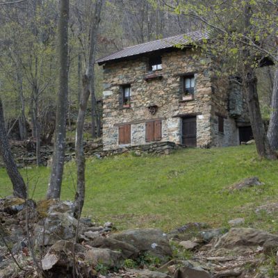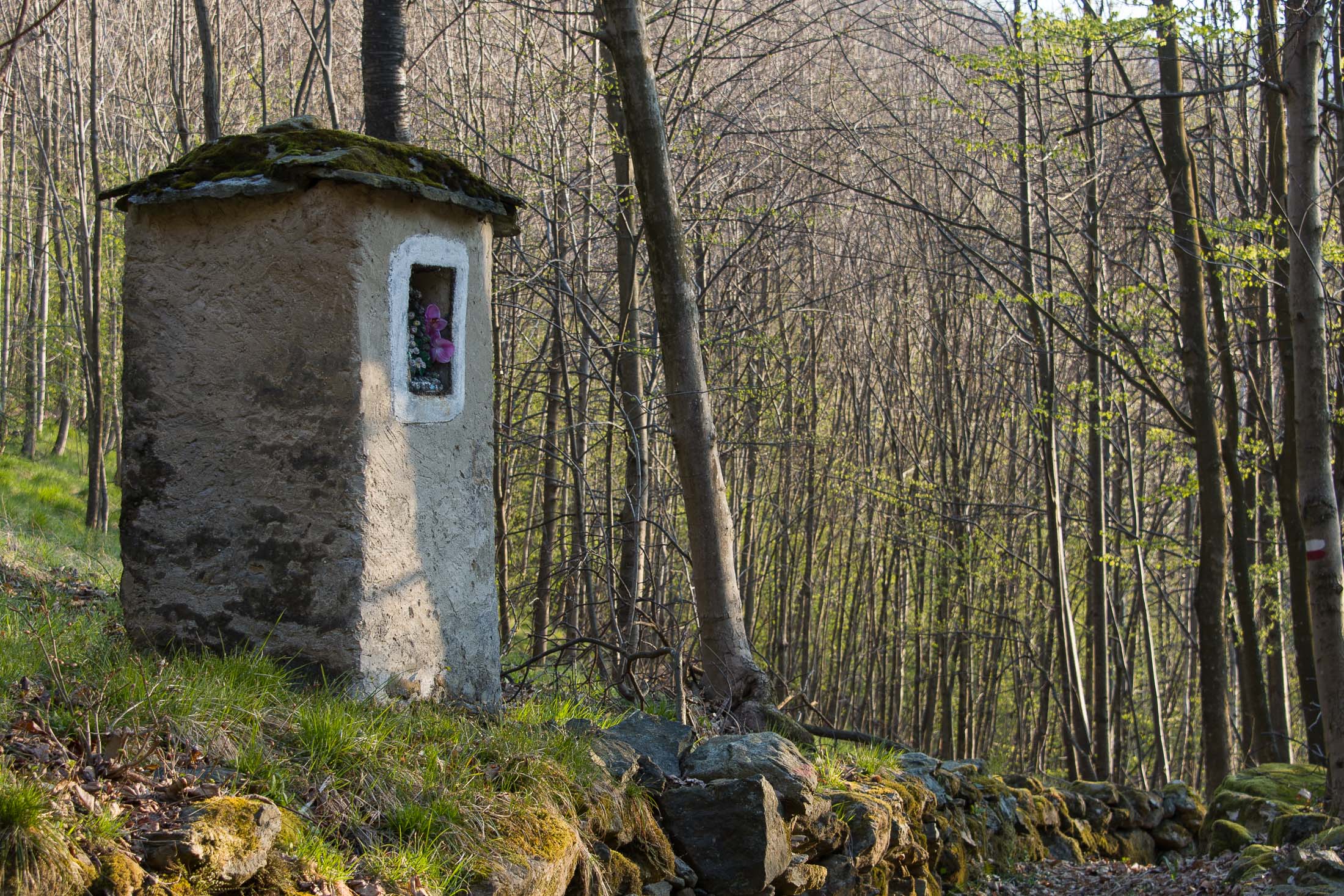 Der Abstieg verläuft zunächst auf der Aufstiegsroute bis zum Colle Prà Lorenzo (1388 m), dort geht man geradeaus und folgt dem Grat für einige Minuten, bevor der Weg Richtung Nordosten abknickt. Auf grasigem Pfad steigt man nun durch verbuschendes ehemaliges Weideland ab und kommt zu der einzelstehenden Hütte von Bramafam (1100 m), eine seit langem aufgegebene Alp. Ein gottverlassener und mystisch anmutender Ort inmitten der Einsamkeit, in der Umgebung ragen unzählige abgestorbene Baumgerippe in den Himmel, was der Schönheit der Gegend jedoch keinen Abbruch tut. Von Bramafam geht es weiterhin kontinuierlich bergab, in den Sommermonaten wandert man hier und da durch hohes Gras. Schliesslich erreicht man den Talboden des Vallone di Ordagna und überquert den gleichnamigen Bach, der wenige Kilometer östlich in die Stura di Viù mündet. Der jetzt deutlich bessere Weg verläuft nun relativ eben durch dichten Wald, vorbei an den aufgegebenen Alpsiedlungen von Combacistel, Piazzola und Muande Castagna, die heute nahezu alle in Ruinen liegen. Kurz darauf kommt man nach Case Figial (750 m), ein hübsch renoviertes Anwesen auf einer kleinen Lichtung, was heute noch als Wochenend- oder Feriendomizil genutzt wird. Das verbleibende Wegstück ist gemütliches Genusswandern, zunächst führt der Weg ohne nennenswerte Höhenunterschiede entlang eines historischen Bewässerungskanals zu dem einzelstehenden Bildstock am Colle Colmet (717 m). Von dort geht es auf schönem Waldweg sanft bergab, wenig später erreicht man die Häuser der Località Fontana und eine Fahrstrasse, auf der man in 10 Minuten zur Kirche von Villa (628 m), dem Hauptort von Traves, zurückkehrt.
