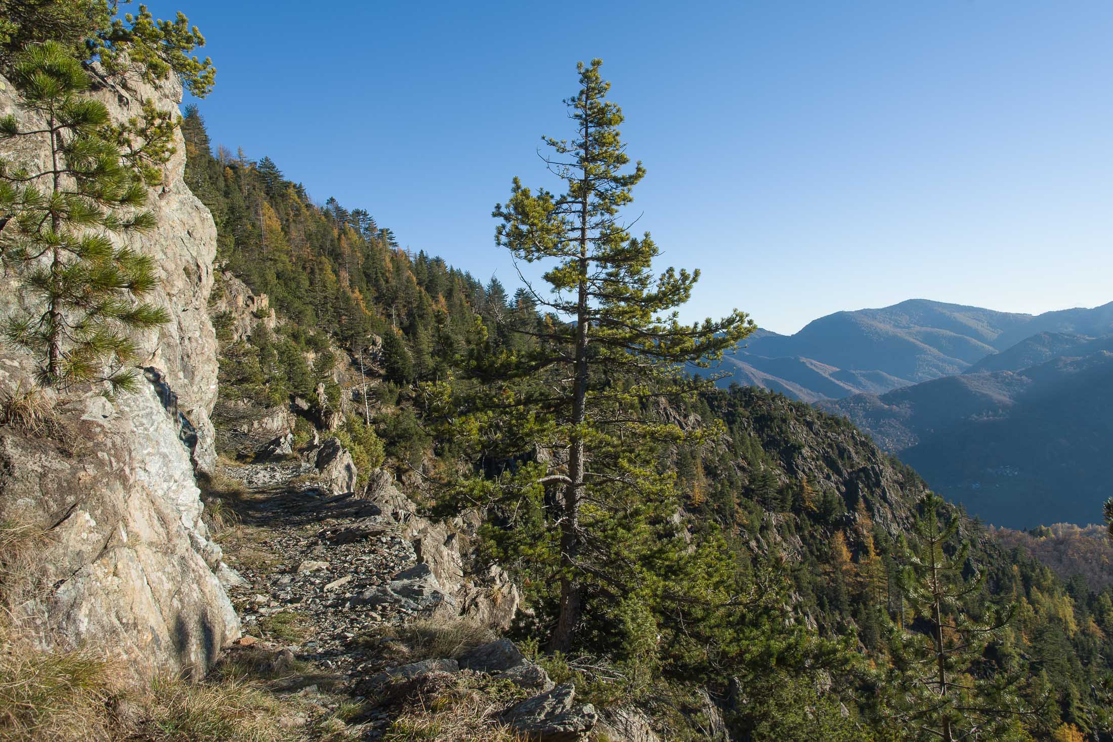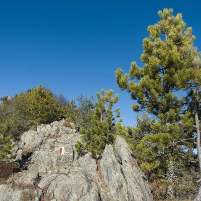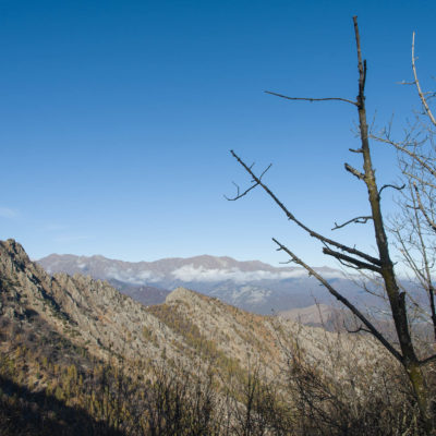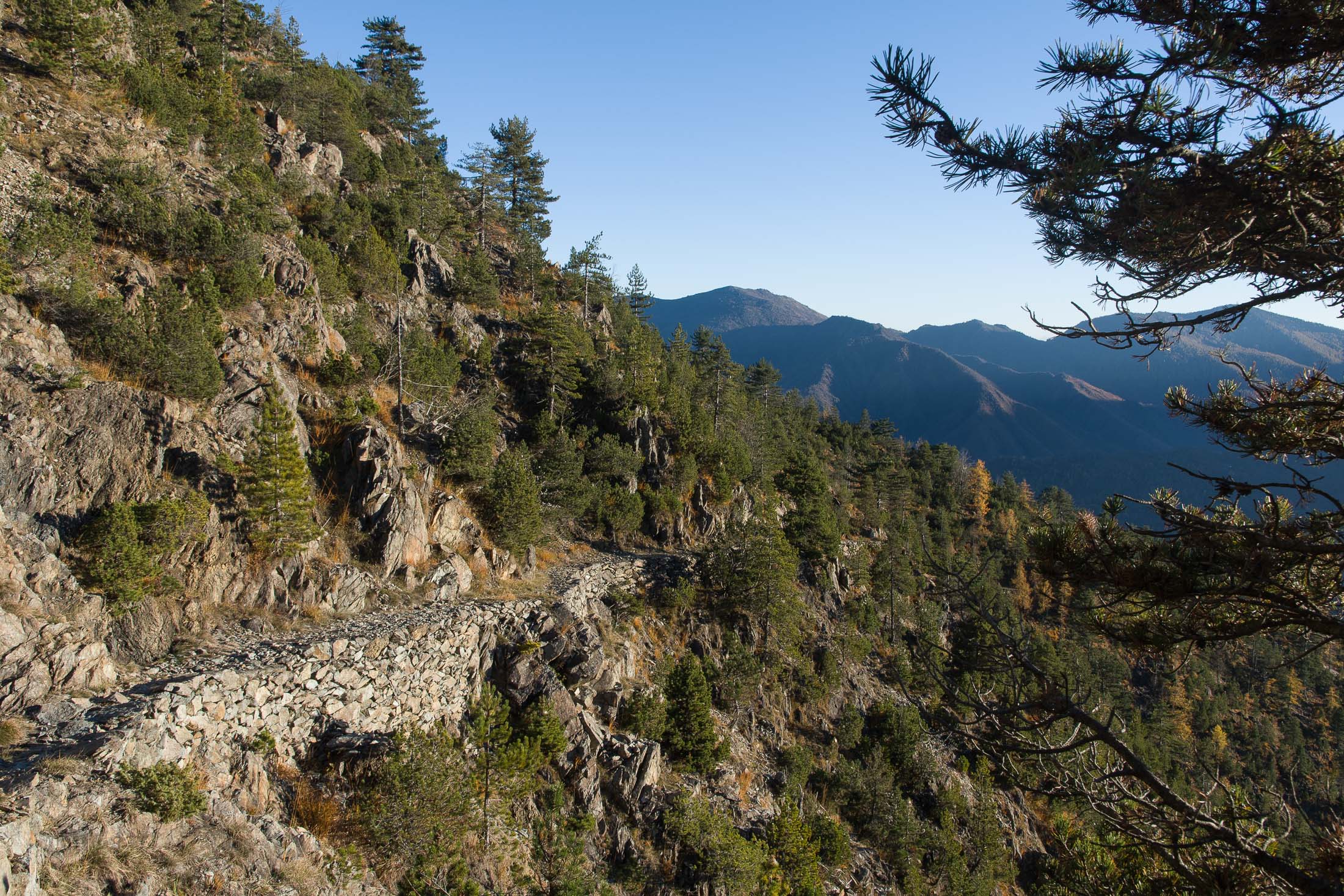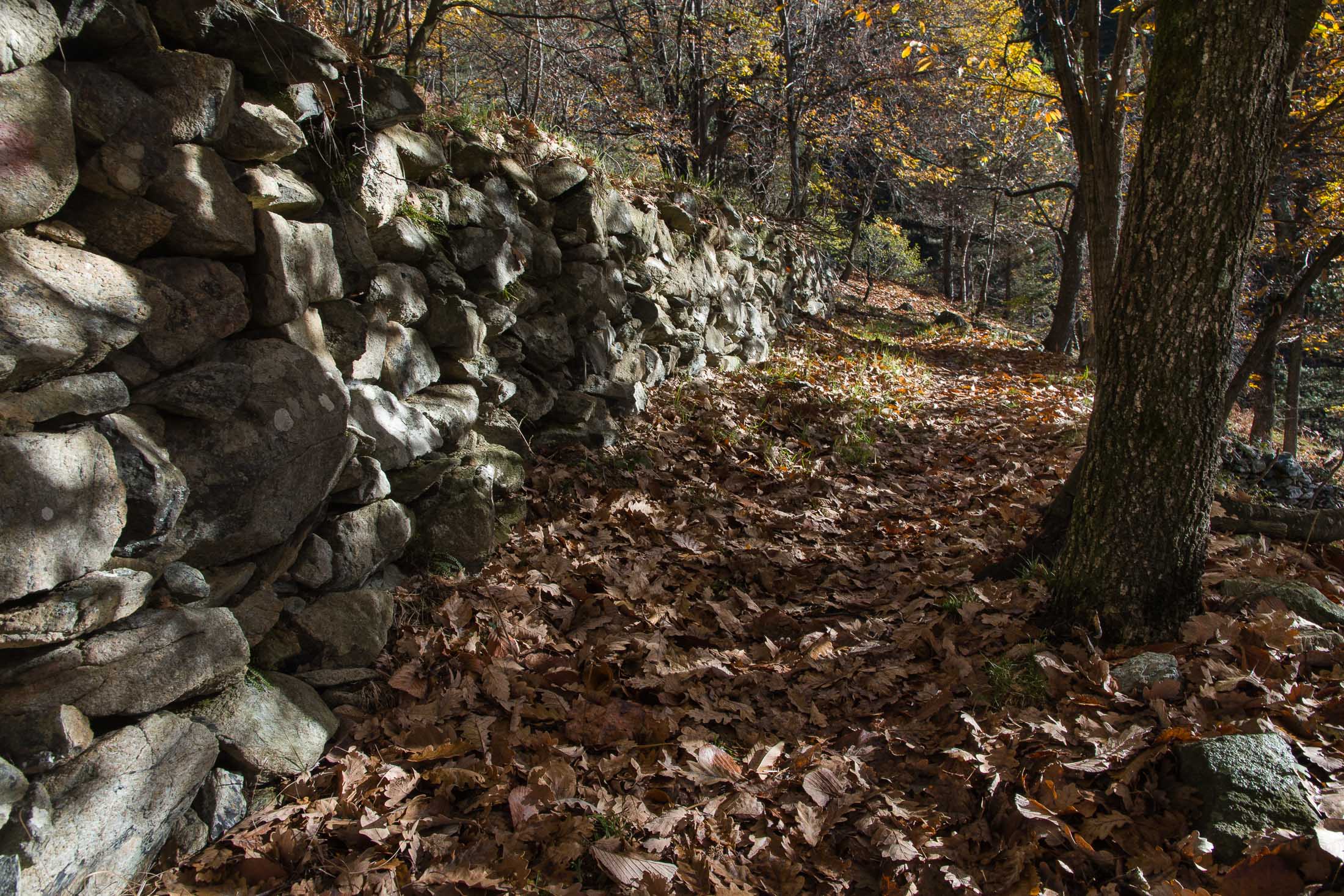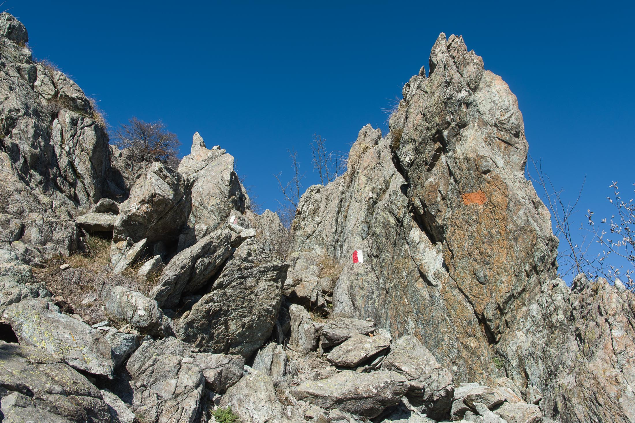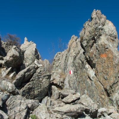 Der Abstieg von der Uja di Calcante führt durch die steile Nordwest-Flanke. Die Hauptspeise kommt gleich am Anfang, noch im Gipfelbereich muss eine kurze ausgesetzte felsige Stelle überwunden werden, hier ist Trittsicherheit erforderlich. Dann sind die Knie gefordert, auf steinigem und bisweilen rauhem Pfad geht es zunächst 300 Höhenmeter steil abwärts. Weiter unten wird das Gelände ein wenig freundlicher, man erreicht eine kleine Verebnungsfläche mit verstreuten Lärchen und kurz darauf den Colle della Cialmetta mit der Cappella di San Michele Arcangelo (1303 m). Die sehenswerte kleine Kirchenkapelle wurde von Einheimischen in ehrenamtlicher Arbeit aufwendig restauriert. Von hier nimmt man den Weg Richtung Fubina. Es folgt ein besonders schöner Abschnitt auf einer breiten, teils gepflasterten und die Felswände gemauerten Mulattiera (= Saumweg oder Maultierweg), die entlang der wilden Südwestflanke der Uja di Calcante sanft abwärts führt. Eine beeindruckende historische Weganlage, hier kann man eine Weile gemütlich vor sich hinschlendern. Nach etwa einer Dreiviertelstunde erreicht man die bereits oben genannte Wegkreuzung, der verbleibende Abstieg bis Selvagnengo verläuft auf dem Aufstiegsweg.