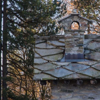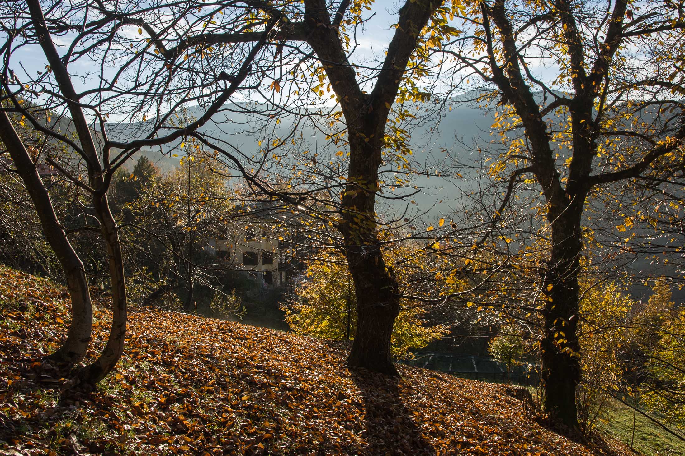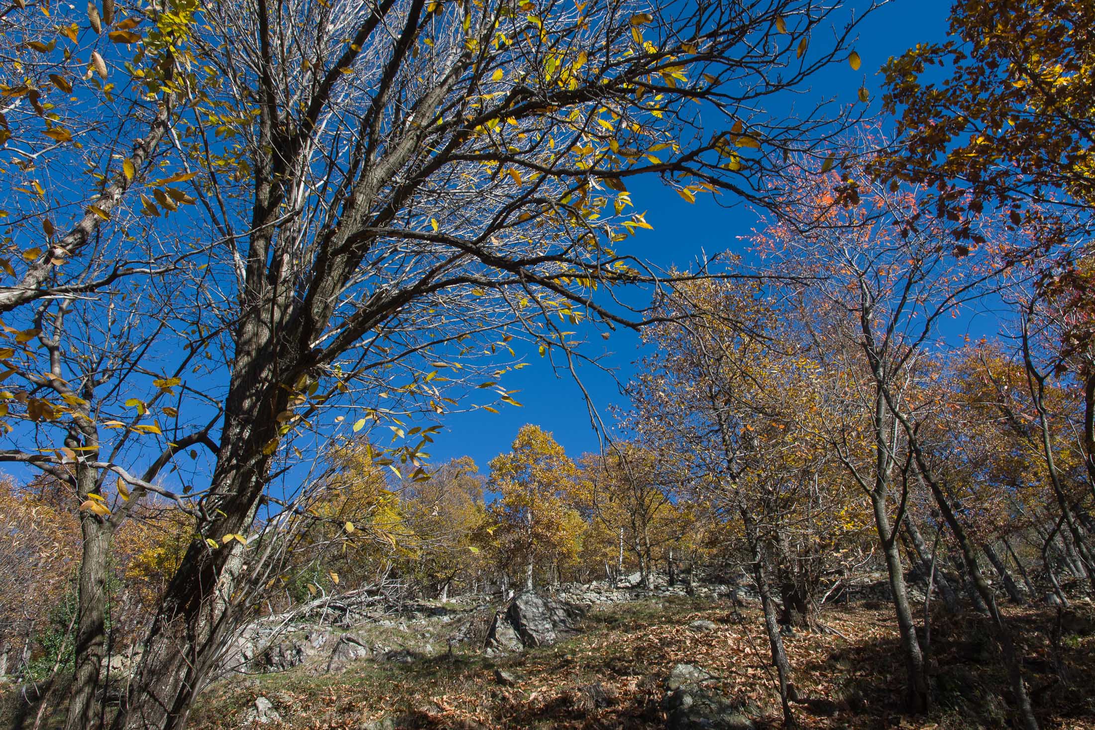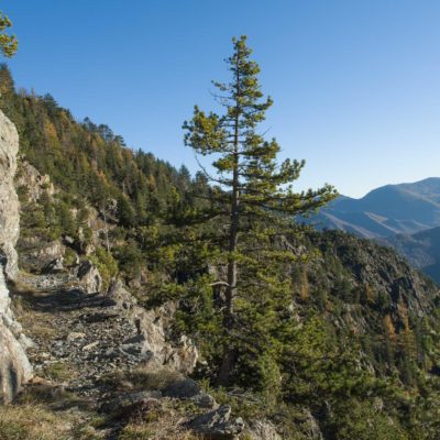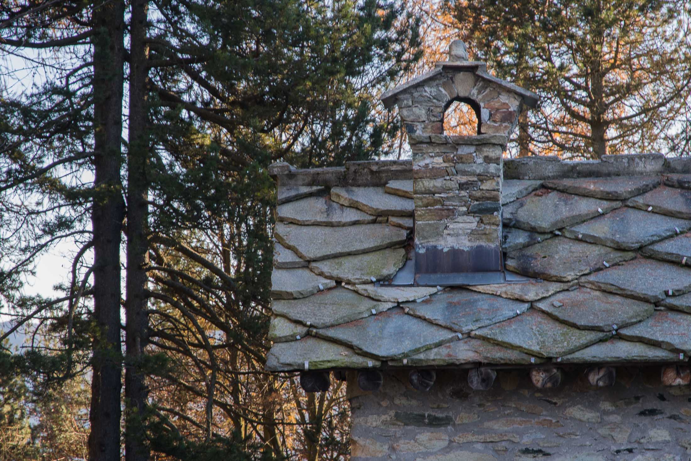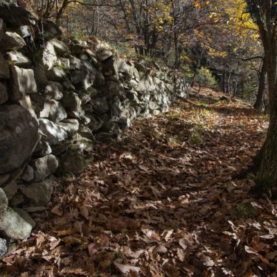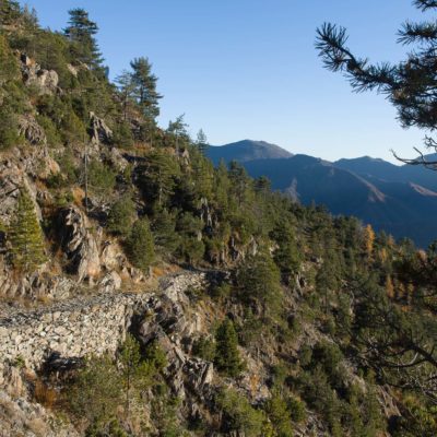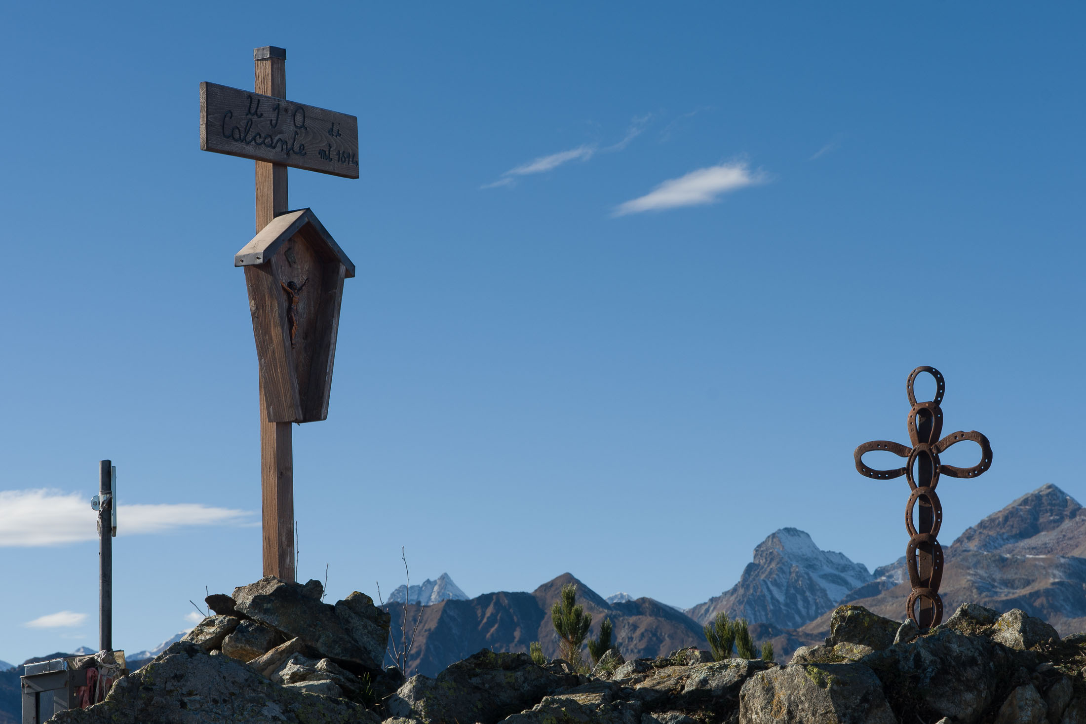Der Abstieg von der Uja di Calcante führt durch die steile Nordwest-Flanke. Die Hauptspeise kommt gleich am Anfang, noch im Gipfelbereich muss eine kurze ausgesetzte felsige Stelle überwunden werden, hier ist Trittsicherheit erforderlich. Dann sind die Knie gefordert, auf steinigem und bisweilen rauhem Pfad geht es zunächst 300 Höhenmeter steil abwärts. Weiter unten wird das Gelände ein wenig freundlicher, man erreicht eine kleine Verebnungsfläche mit verstreuten Lärchen und kurz darauf den Colle della Cialmetta mit der Cappella di San Michele Arcangelo (1303 m). Die sehenswerte kleine Kirchenkapelle wurde von Einheimischen in ehrenamtlicher Arbeit aufwendig restauriert. Von hier nimmt man den Weg Richtung Fubina. Es folgt ein besonders schöner Abschnitt auf einer breiten, teils gepflasterten und die Felswände gemauerten Mulattiera (= Saumweg oder Maultierweg), die entlang der wilden Südwestflanke der Uja di Calcante sanft abwärts führt. Eine beeindruckende historische Weganlage, hier kann man eine Weile gemütlich vor sich hinschlendern. Nach etwa einer Dreiviertelstunde erreicht man die bereits oben genannte Wegkreuzung, der verbleibende Abstieg bis Selvagnengo verläuft auf dem Aufstiegsweg.