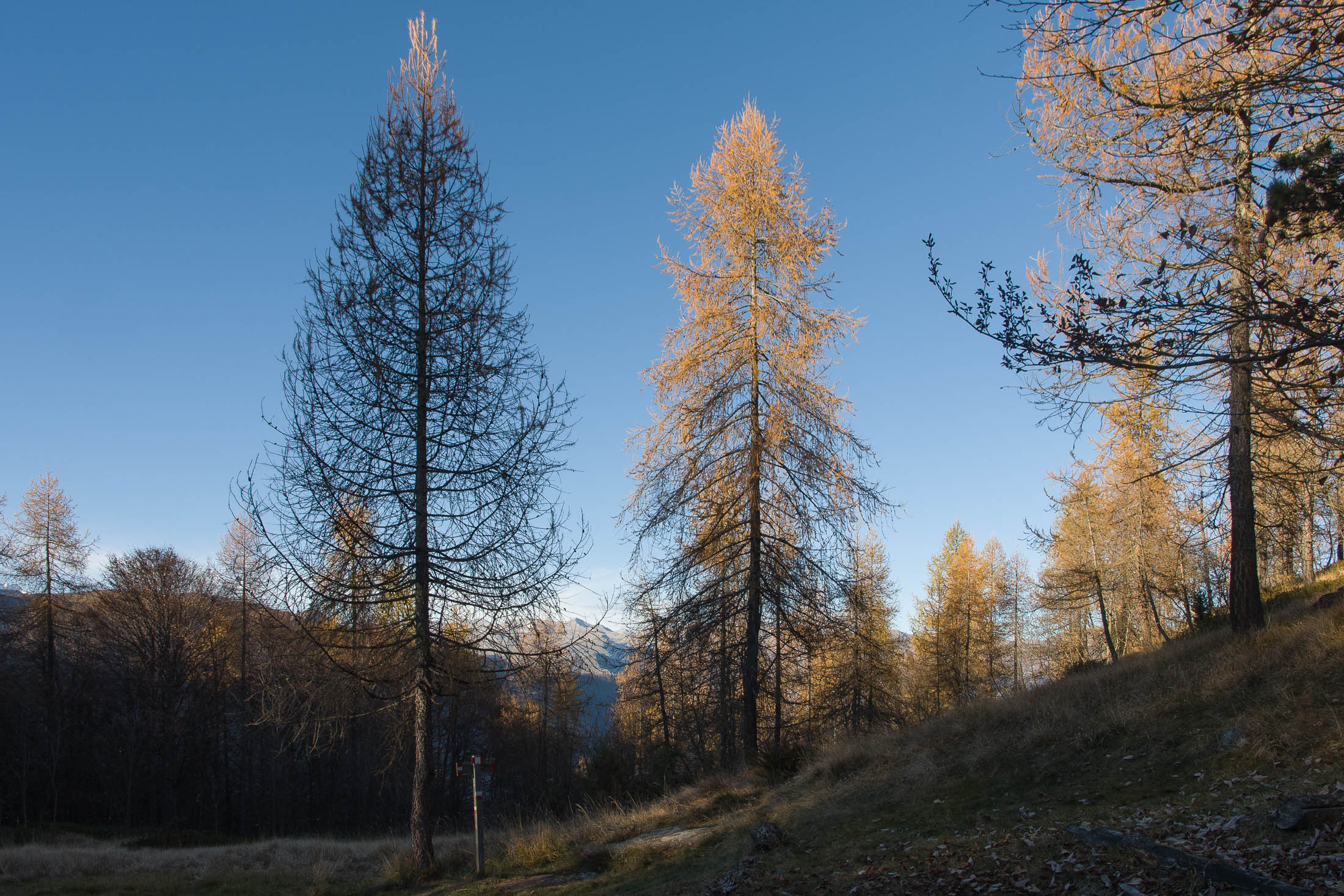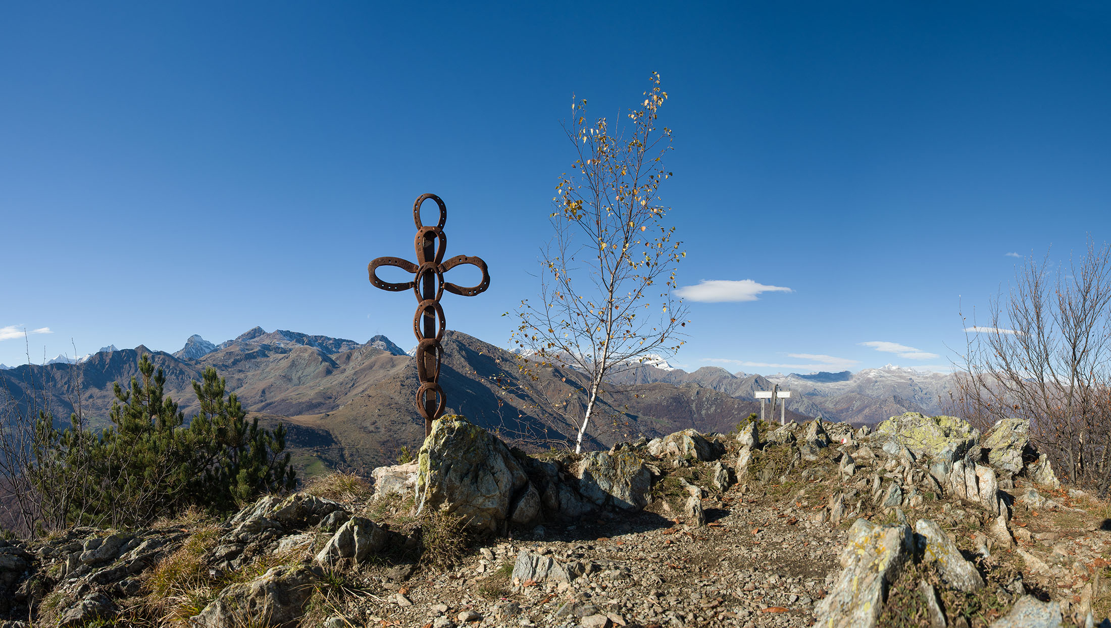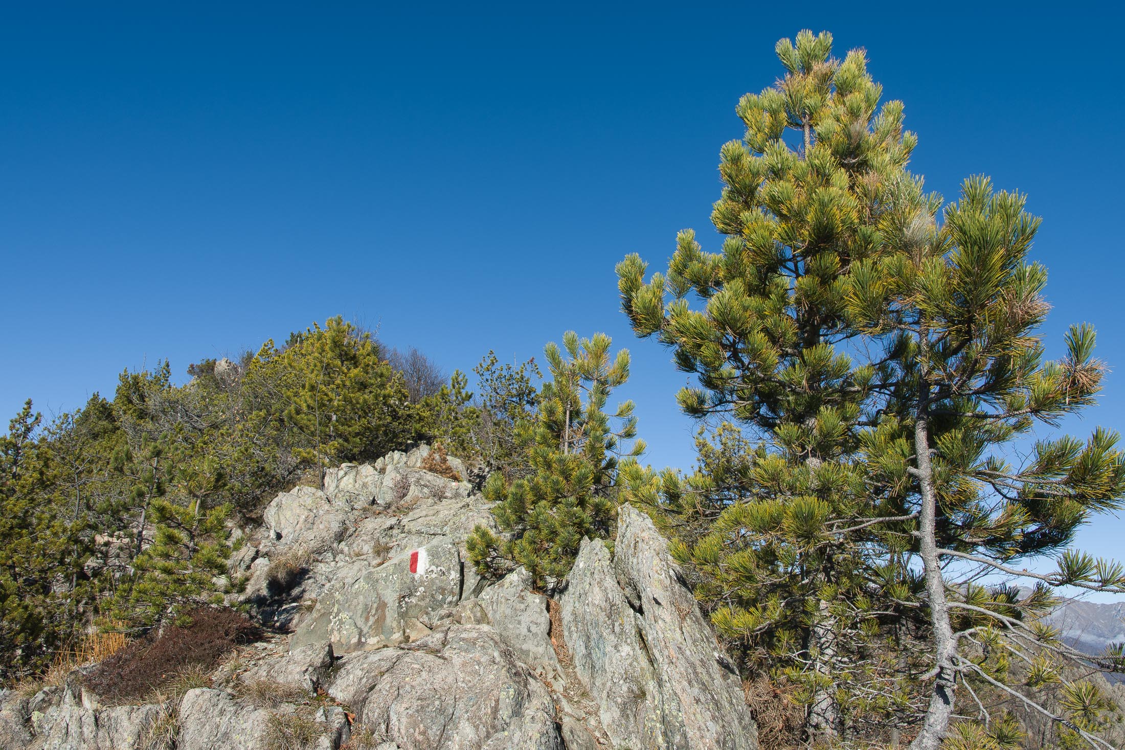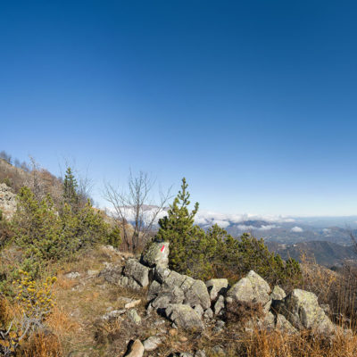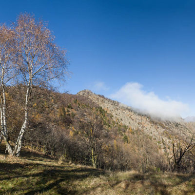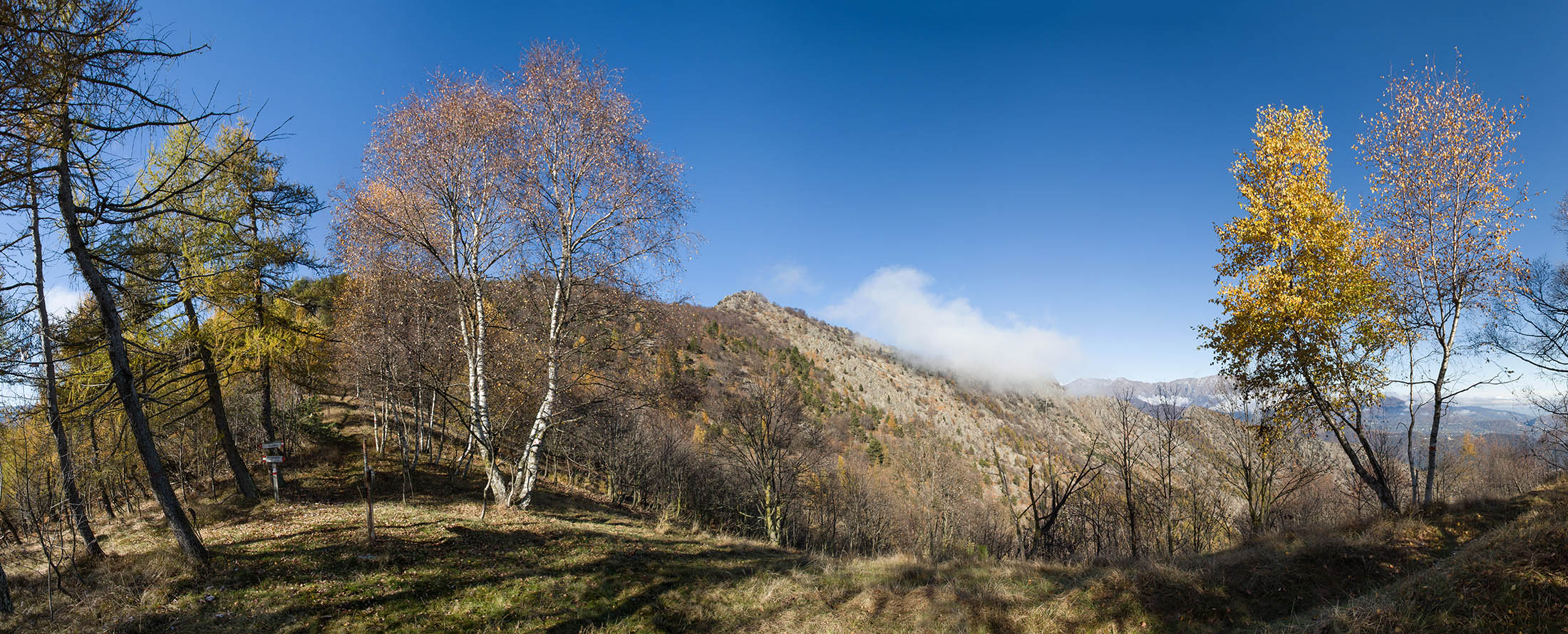 Die Wanderung beginnt bei der Häusergruppe von Ventrunera (966 m) oberhalb von Selvagnengo, ein abgelegener Ortsteil von Viù. Die Gegend war früher dicht besiedelt, nach dem Zusammenbruch der Berglandwirtschaft nach dem zweiten Weltkrieg leben hier heute nur noch wenige Menschen. Das schmale Asphaltsträsschen endet nach wenigen Kehren bei den Häusern von Millanera (1050 m, nicht in den einschlägigen Karten eingezeichnet). Ein idyllischer Ort mitten im Grünen, mit schönem Blick über das Valle die Viù. Die Stille hat das Regiment übernommen, zumindest scheint hier niemand mehr dauerhaft zu wohnen. Verschlossene Fenster und Türen, mittendrin ein grosser Gemüsegarten und ein paar herumstehende Blumentöpfe. Die wenigen Anwesen machen einen gepflegten Eindruck und werden vermutlich noch als Wochenend- oder Feriendomizil genutzt. Bei dem Wegweiser oberhalb des Weilers folgt man dem unbefestigten Fahrweg Richtung Osten bis zu einem offenen Unterstand, wo ein markierter Pfad abzweigt. Dieser führt zunächst in leichtem Auf und Ab entlang einer Trockensteinmauer durch allmählich verwilderndes Kultur- und Weideland, später steiler ansteigend durch einen herrlichen Kiefernwald. Nach einer Weile kommt man zu einer Wegkreuzung (zahlreiche Wegweiser) und überquert den Hauptweg, der von Fubina zum Colle della Cialmetta führt. Im weiteren Verlauf windet sich der bisweilen steile Pfad hinauf zum Colle Prà Lorenzo (1388 m). Hier stösst man auf den Weg, der von Traves aus dem Bassa Valle hinaufkommt. Ein malerisches Fleckchen auf einem aussichtsreichen Gratrücken, das Gipfelziel bereits vor Augen, ringsherum ein paar verstreute Kiefern und Lärchen und Birken, Blätter rascheln leise im Wind. Einsamkeit kann so wohltuend sein...