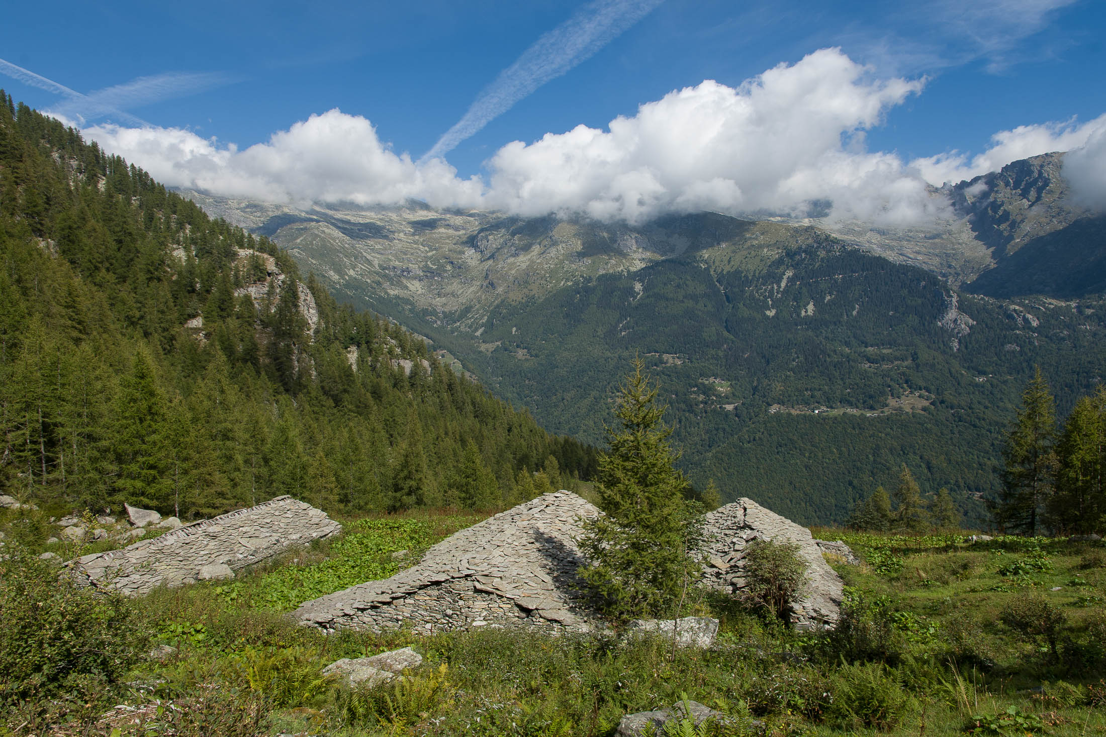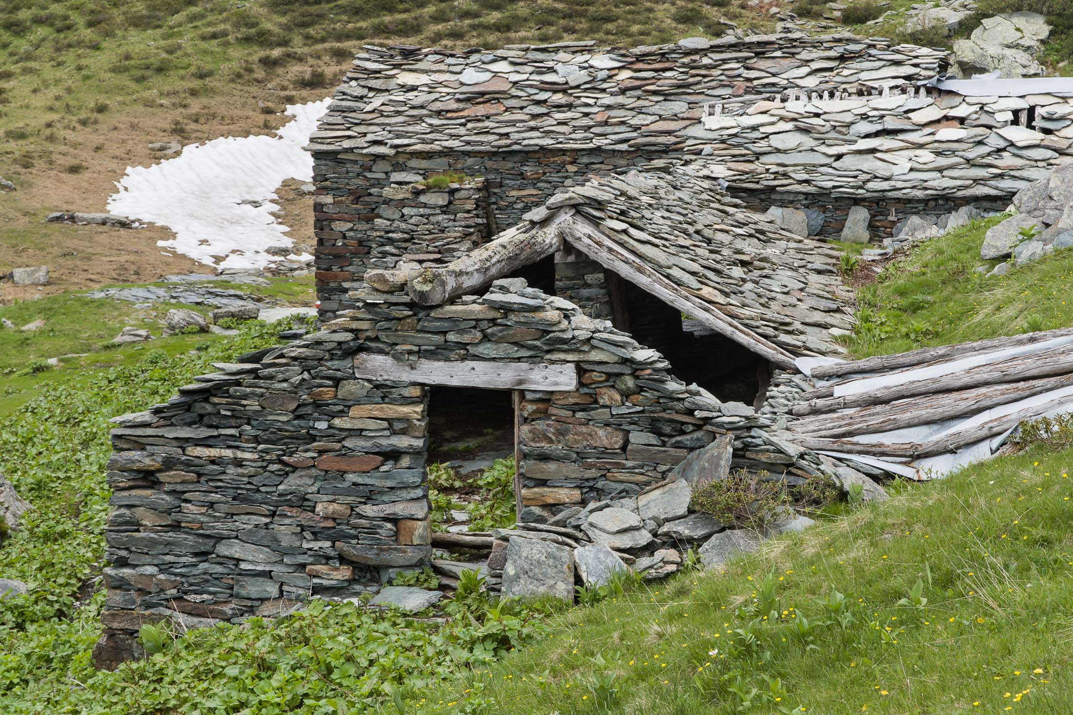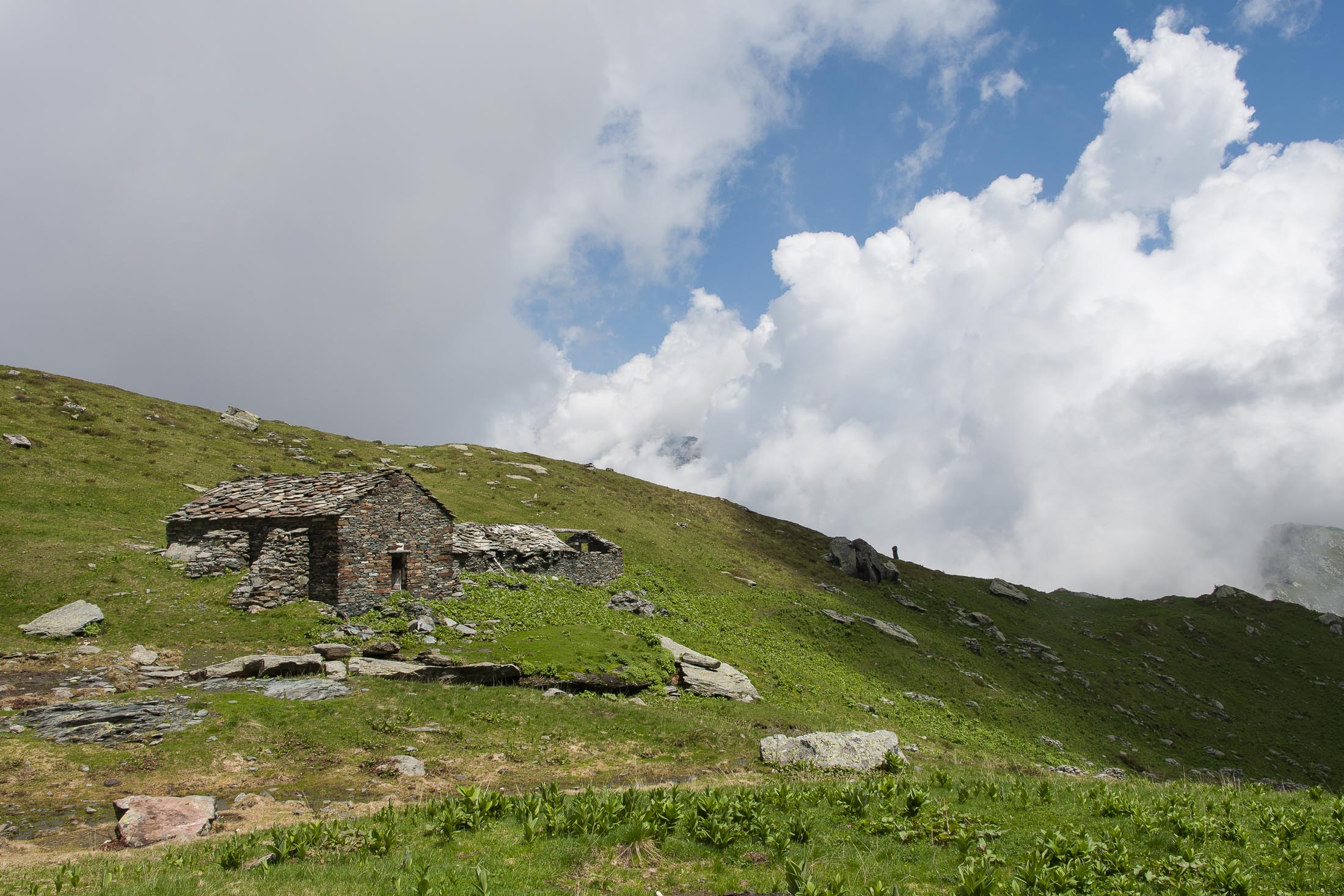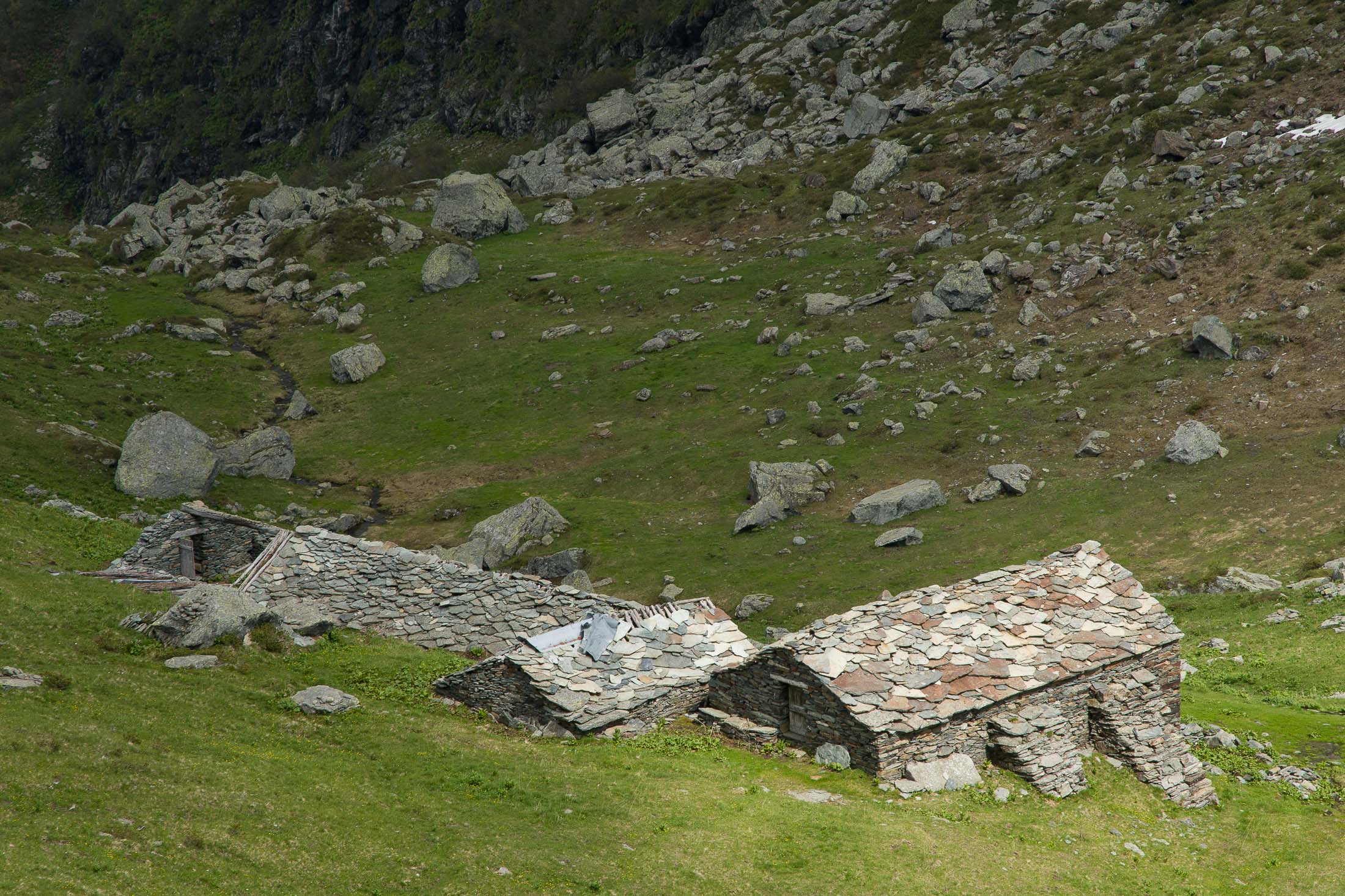 Der Weiterweg beginnt, anfangs mangels erkennbarer Markierungen etwas unklar, hinter den Alpgebäuden und führt durch teils verbuschtes Weideland zwischen einzelnen verstreuten Lärchen in westlicher Richtung hinauf auf eine weitere Hochebene am Rand eines kleinen Nebentals. Der mittlerweile wieder klar erkennbare und gut markierte Weg führt nun durch Erlengebüsch weiter bergwärts, man hält Kurs auf einen bereits von Weitem sichtbaren riesigen Steinmann am Rand einer markanten Geländestufe. Dort angekommen ändert sich schlagartig die Landschaft, man blickt über eine weite Alphochfläche in einem eindrücklichen Talkessel. Wenige Minuten später erreicht man die aufgegebenen Alpgebäude von Crot (2141 m). Weiter in südlicher Richtung, vorbei an dem mittlerweile verlandeten Lago di Crot (2164 m), ein heute ausgetrockneter ehemaliger Bergsee. Am südlichen Ende des Talkessels dreht der Weg Richtung Westen ab und führt steil hinauf auf eine von Steinen und Felsbrocken übersäte kleine Verebnungsfläche. Weiter oben muss ein Blockfeld überquert werden, was im Frühsommer bei Altschneeresten problematisch sein kann. Nach einem kurzen Schlussanstieg erreicht man schliesslich den westlichen Colle Croset (2459 m)*, Wasserscheide zwischen dem Val Grande di Lanzo und dem südlich gelegenen Val d‘Ala. Das grossartige Panorama von diesem weltabgeschiedenen Ort entschädigt für den bisweilen mühsamen und langen Aufstieg, ein wahrlich lohnender Höhepunkt eines traumhaft schönen Tages in völliger Einsamkeit. Richtung Süden blickt man ins Val d‘Ala, das mittlere der drei Lanzo-Täler, im Norden die Berge des Val Grande di Lanzo. Dahinter erhebt sich die hochalpine und teils vergletscherte Kulisse der Gran Paradiso-Gruppe mit den Denti di Broglio (3454 m), Becca di Monciair (3554 m), Ciarforon (3640 m), Tresenta (3609 m) und Gran Paradiso (4061 m).