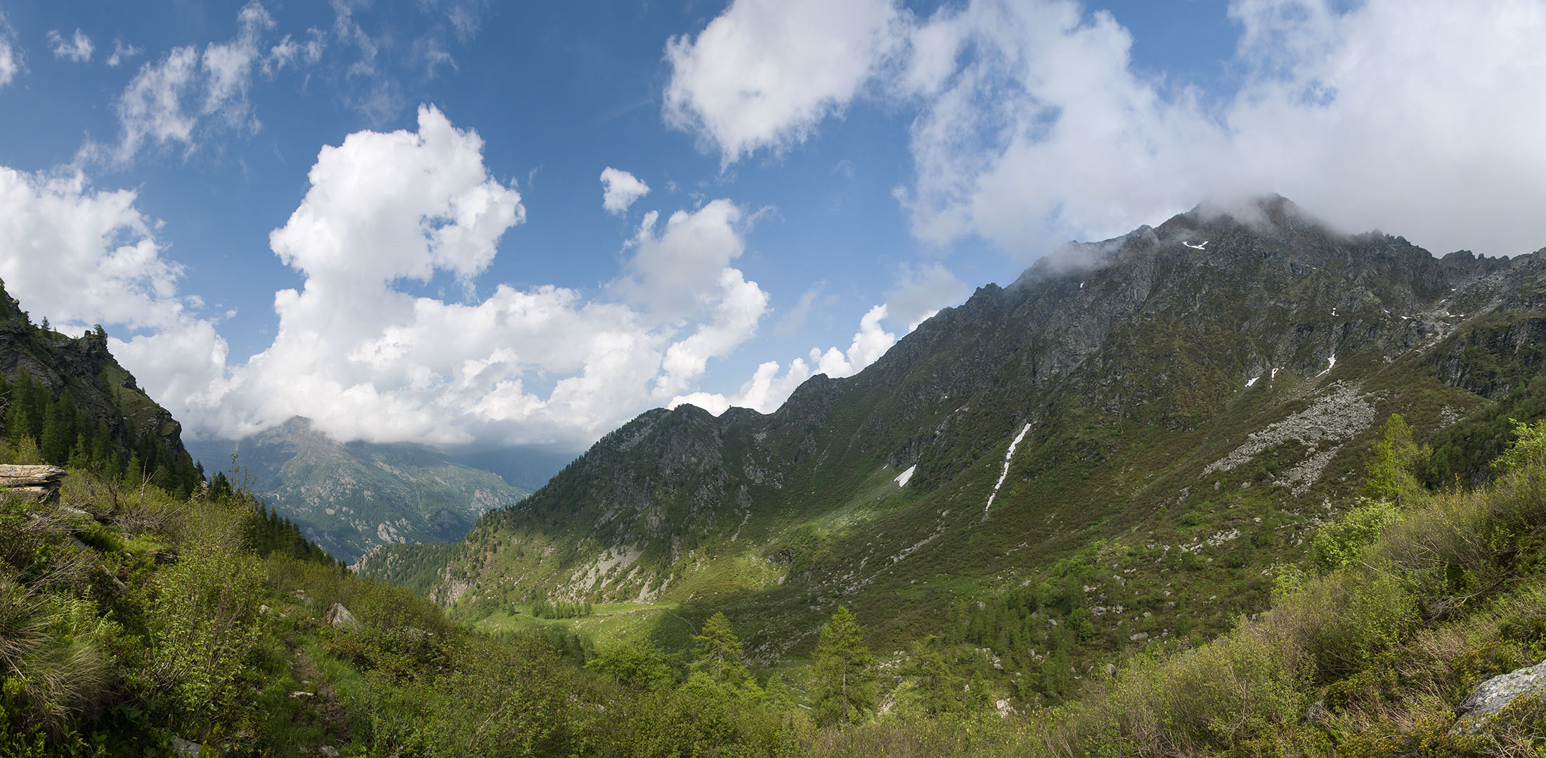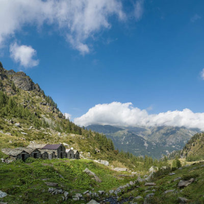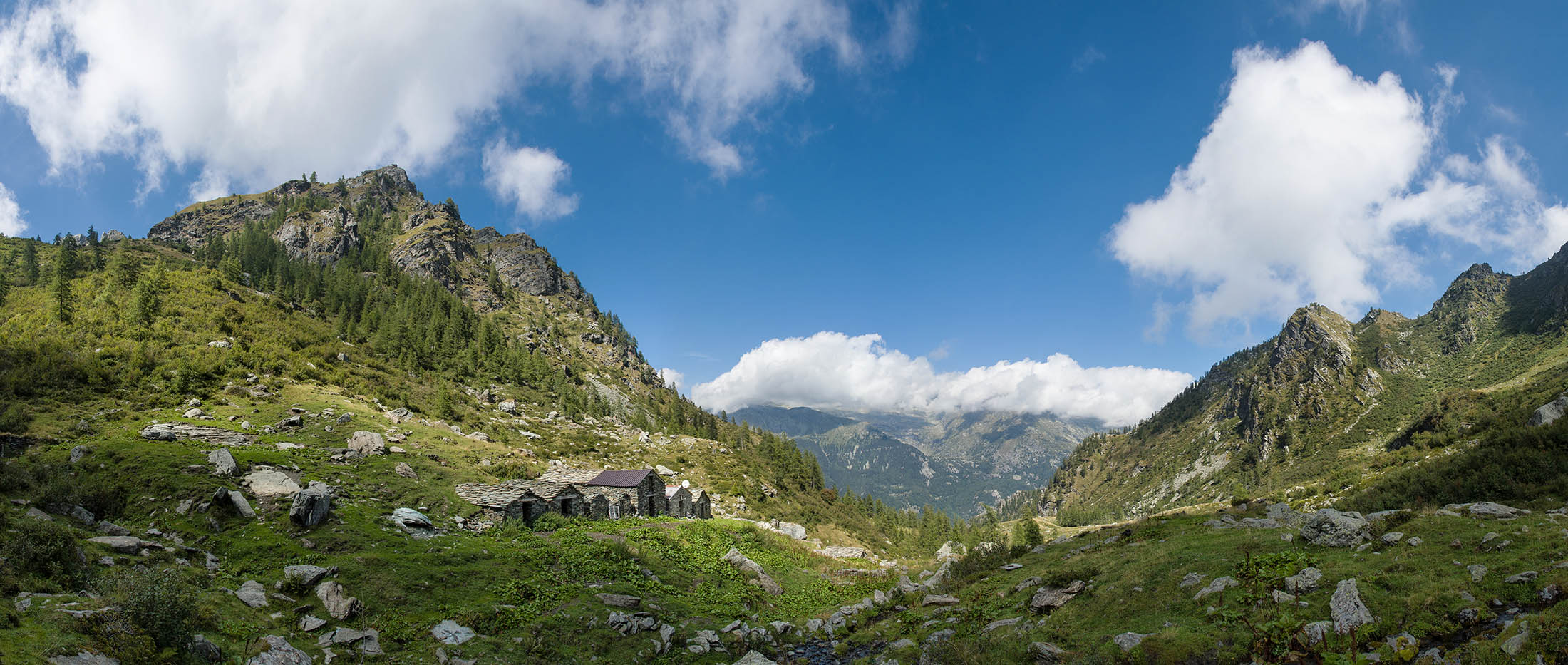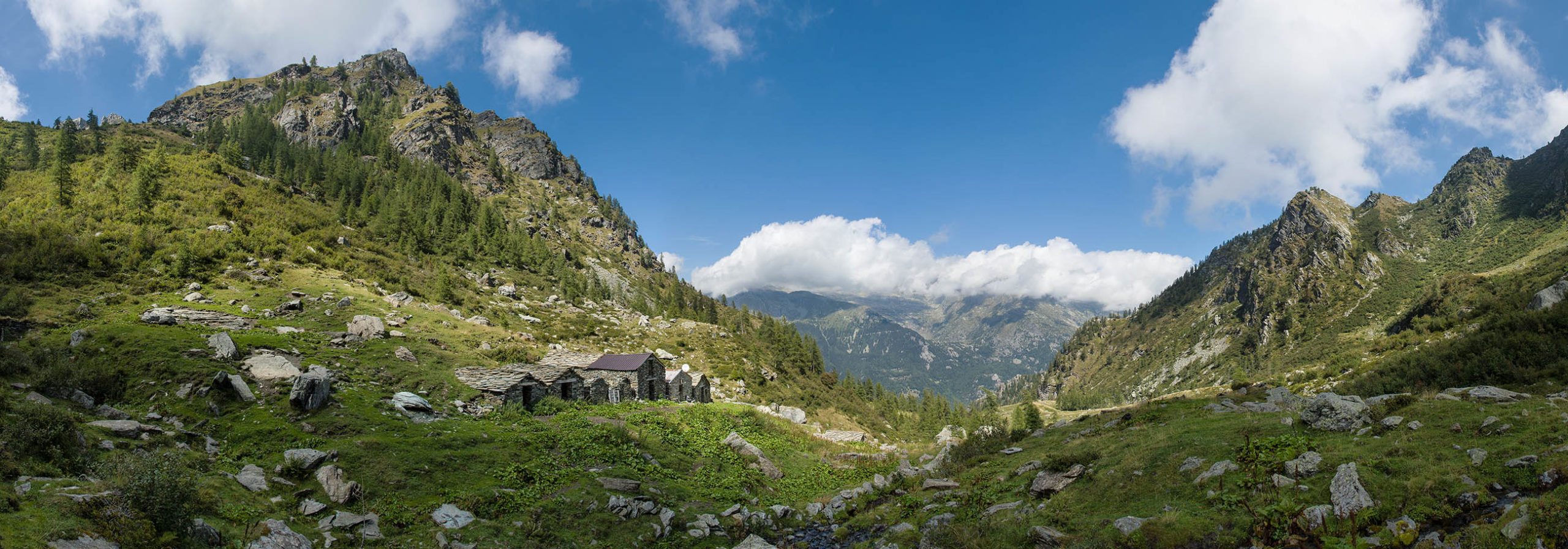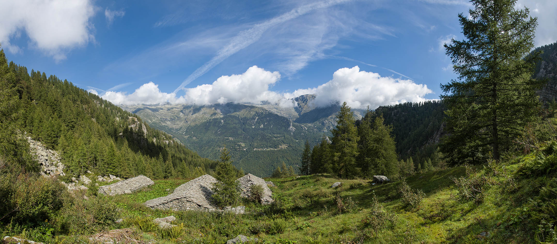 Der Weiterweg beginnt, anfangs mangels erkennbarer Markierungen etwas unklar, hinter den Alpgebäuden und führt durch teils verbuschtes Weideland zwischen einzelnen verstreuten Lärchen in westlicher Richtung hinauf auf eine weitere Hochebene am Rand eines kleinen Nebentals. Der mittlerweile wieder klar erkennbare und gut markierte Weg führt nun durch Erlengebüsch weiter bergwärts, man hält Kurs auf einen bereits von Weitem sichtbaren riesigen Steinmann am Rand einer markanten Geländestufe. Dort angekommen ändert sich schlagartig die Landschaft, man blickt über eine weite Alphochfläche in einem eindrücklichen Talkessel. Wenige Minuten später erreicht man die aufgegebenen Alpgebäude von Crot (2141 m). Weiter in südlicher Richtung, vorbei an dem mittlerweile verlandeten Lago di Crot (2164 m), ein heute ausgetrockneter ehemaliger Bergsee. Am südlichen Ende des Talkessels dreht der Weg Richtung Westen ab und führt steil hinauf auf eine von Steinen und Felsbrocken übersäte kleine Verebnungsfläche. Weiter oben muss ein Blockfeld überquert werden, was im Frühsommer bei Altschneeresten problematisch sein kann. Nach einem kurzen Schlussanstieg erreicht man schliesslich den westlichen Colle Croset (2459 m)*, Wasserscheide zwischen dem Val Grande di Lanzo und dem südlich gelegenen Val d‘Ala. Das grossartige Panorama von diesem weltabgeschiedenen Ort entschädigt für den bisweilen mühsamen und langen Aufstieg, ein wahrlich lohnender Höhepunkt eines traumhaft schönen Tages in völliger Einsamkeit. Richtung Süden blickt man ins Val d‘Ala, das mittlere der drei Lanzo-Täler, im Norden die Berge des Val Grande di Lanzo. Dahinter erhebt sich die hochalpine und teils vergletscherte Kulisse der Gran Paradiso-Gruppe mit den Denti di Broglio (3454 m), Becca di Monciair (3554 m), Ciarforon (3640 m), Tresenta (3609 m) und Gran Paradiso (4061 m).