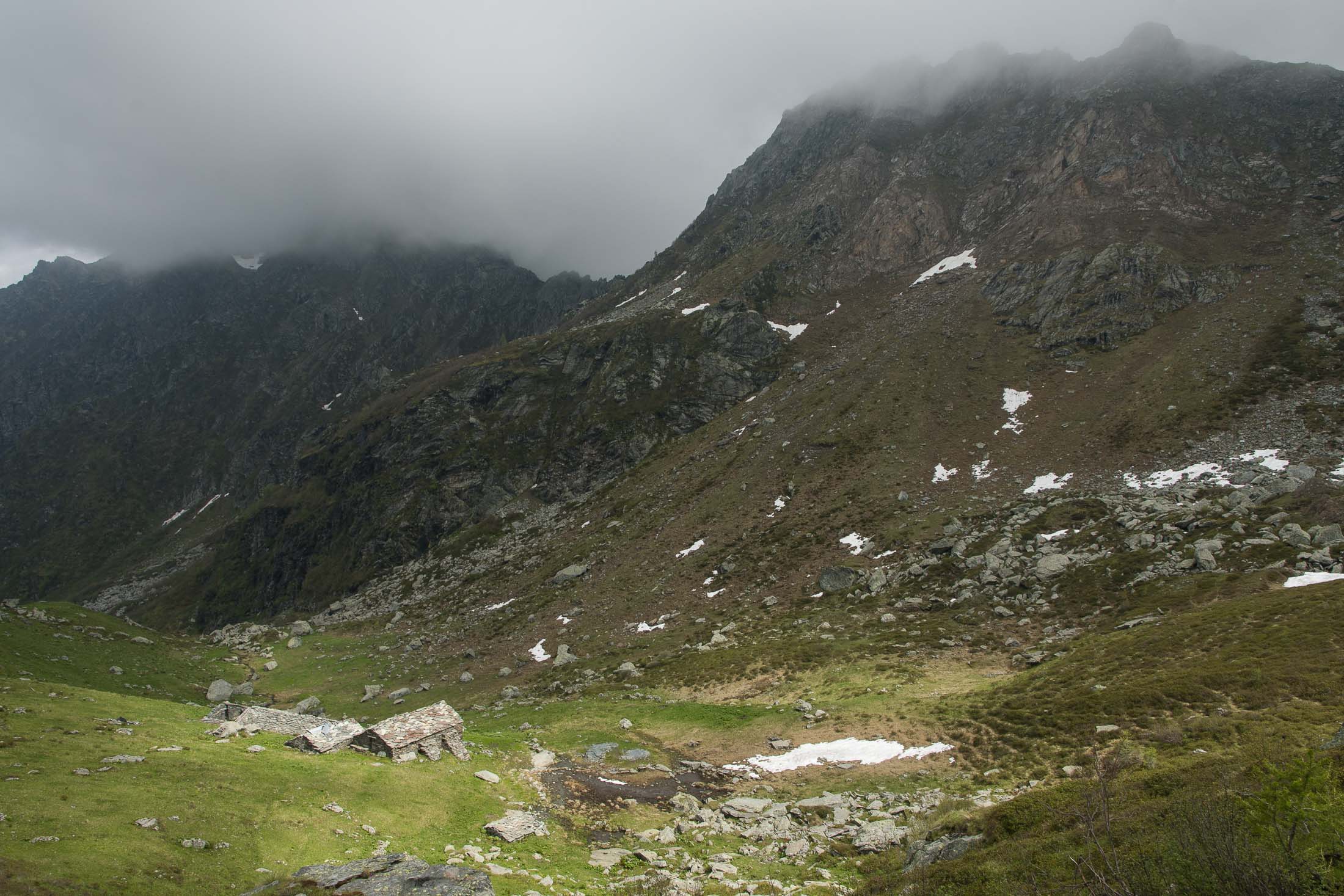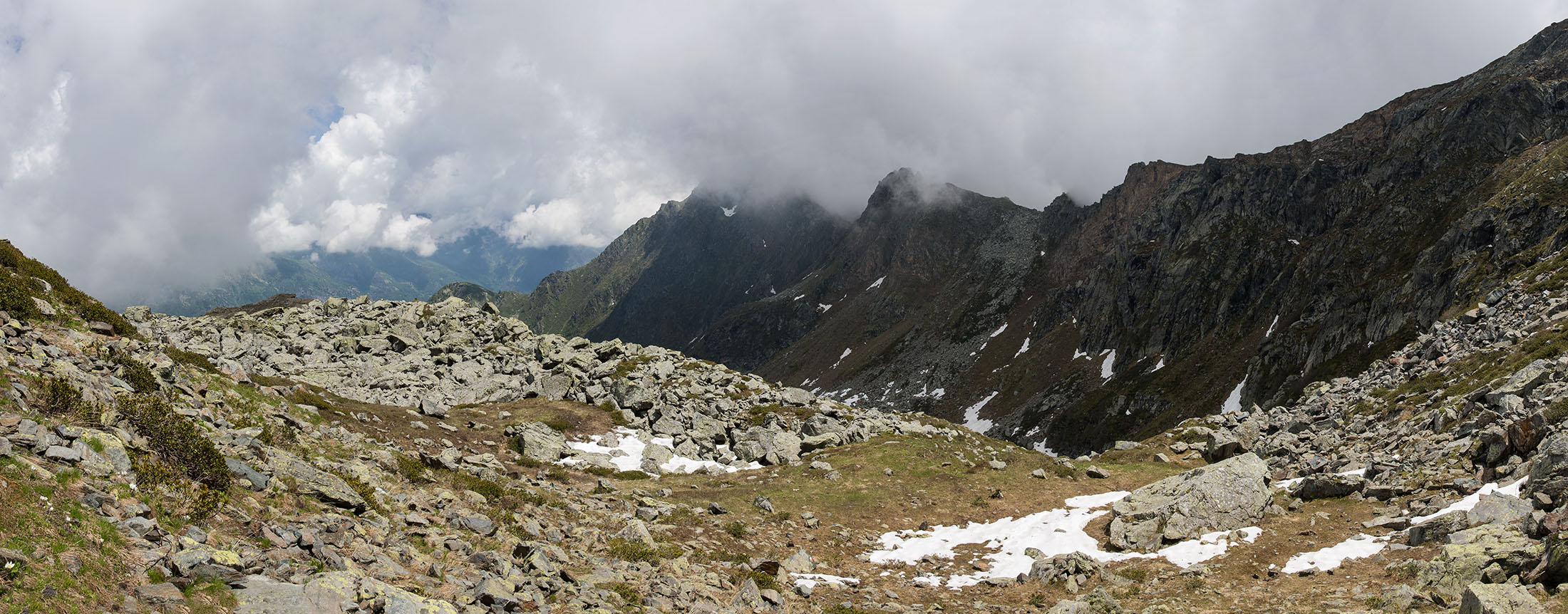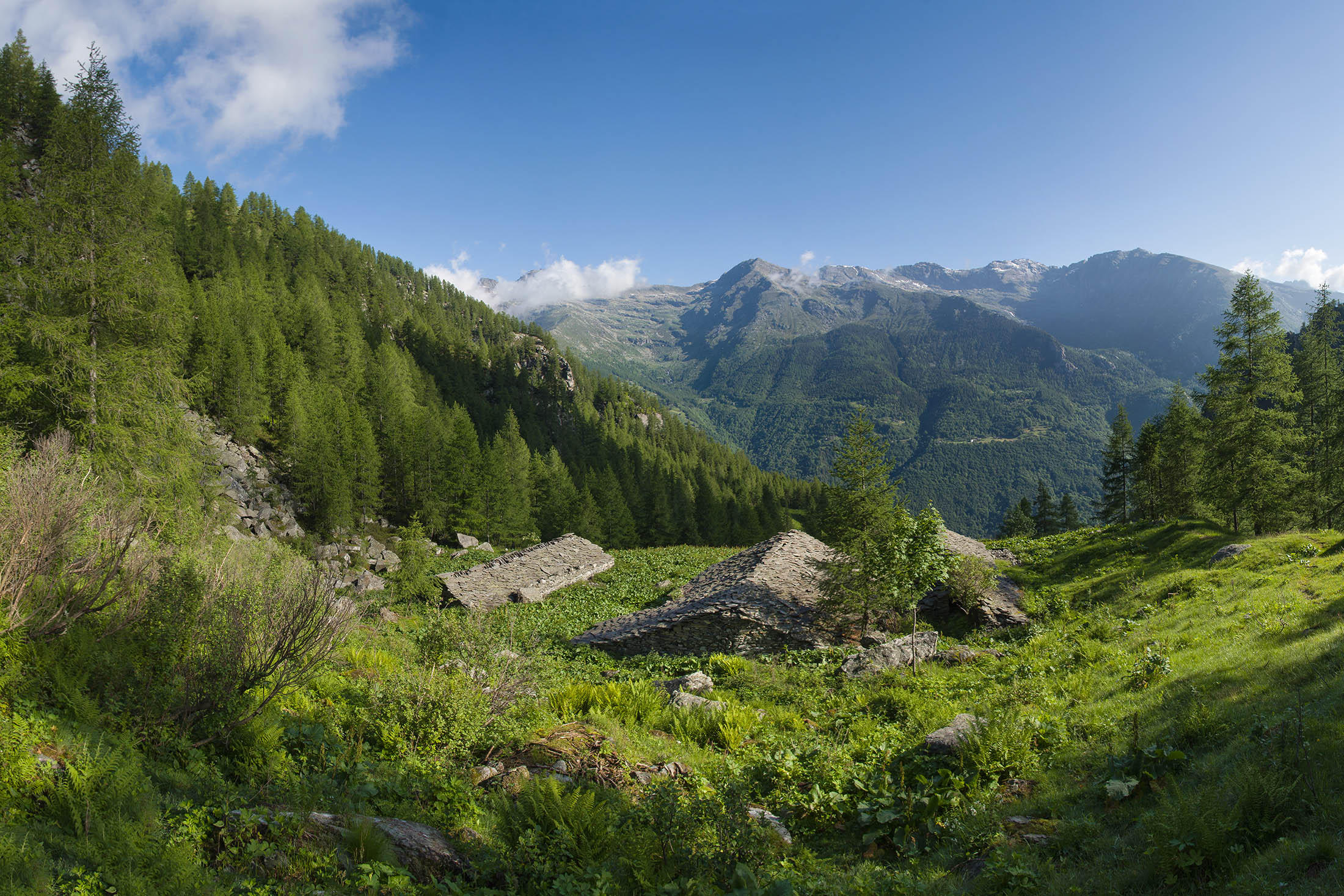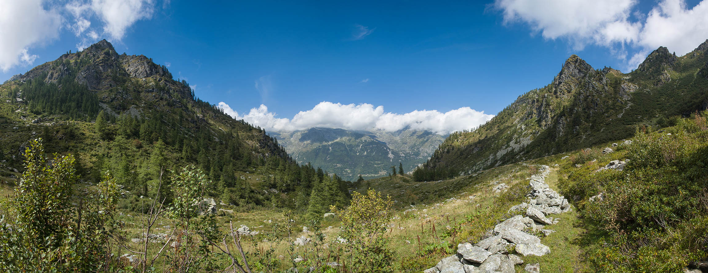 Der Weiterweg beginnt, anfangs mangels erkennbarer Markierungen etwas unklar, hinter den Alpgebäuden und führt durch teils verbuschtes Weideland zwischen einzelnen verstreuten Lärchen in westlicher Richtung hinauf auf eine weitere Hochebene am Rand eines kleinen Nebentals. Der mittlerweile wieder klar erkennbare und gut markierte Weg führt nun durch Erlengebüsch weiter bergwärts, man hält Kurs auf einen bereits von Weitem sichtbaren riesigen Steinmann am Rand einer markanten Geländestufe. Dort angekommen ändert sich schlagartig die Landschaft, man blickt über eine weite Alphochfläche in einem eindrücklichen Talkessel. Wenige Minuten später erreicht man die aufgegebenen Alpgebäude von Crot (2141 m). Weiter in südlicher Richtung, vorbei an dem mittlerweile verlandeten Lago di Crot (2164 m), ein heute ausgetrockneter ehemaliger Bergsee. Am südlichen Ende des Talkessels dreht der Weg Richtung Westen ab und führt steil hinauf auf eine von Steinen und Felsbrocken übersäte kleine Verebnungsfläche. Weiter oben muss ein Blockfeld überquert werden, was im Frühsommer bei Altschneeresten problematisch sein kann. Nach einem kurzen Schlussanstieg erreicht man schliesslich den westlichen Colle Croset (2459 m)*, Wasserscheide zwischen dem Val Grande di Lanzo und dem südlich gelegenen Val d‘Ala. Das grossartige Panorama von diesem weltabgeschiedenen Ort entschädigt für den bisweilen mühsamen und langen Aufstieg, ein wahrlich lohnender Höhepunkt eines traumhaft schönen Tages in völliger Einsamkeit. Richtung Süden blickt man ins Val d‘Ala, das mittlere der drei Lanzo-Täler, im Norden die Berge des Val Grande di Lanzo. Dahinter erhebt sich die hochalpine und teils vergletscherte Kulisse der Gran Paradiso-Gruppe mit den Denti di Broglio (3454 m), Becca di Monciair (3554 m), Ciarforon (3640 m), Tresenta (3609 m) und Gran Paradiso (4061 m).
