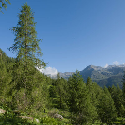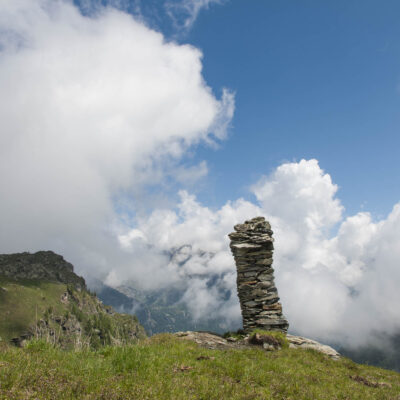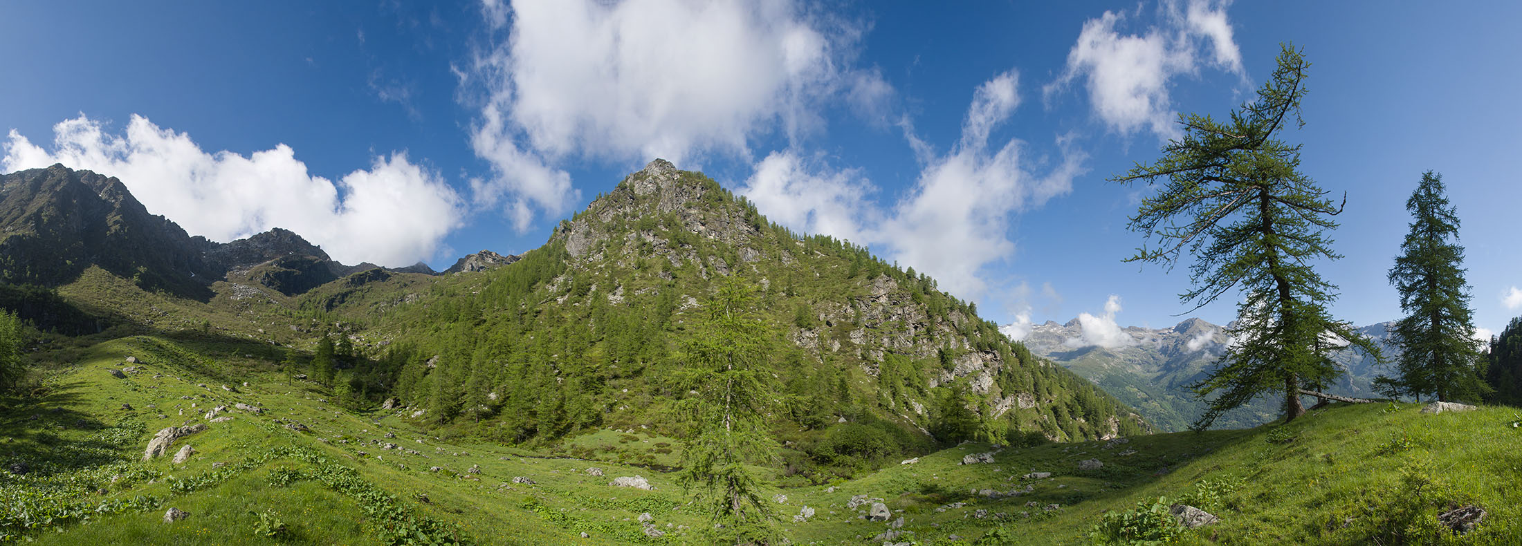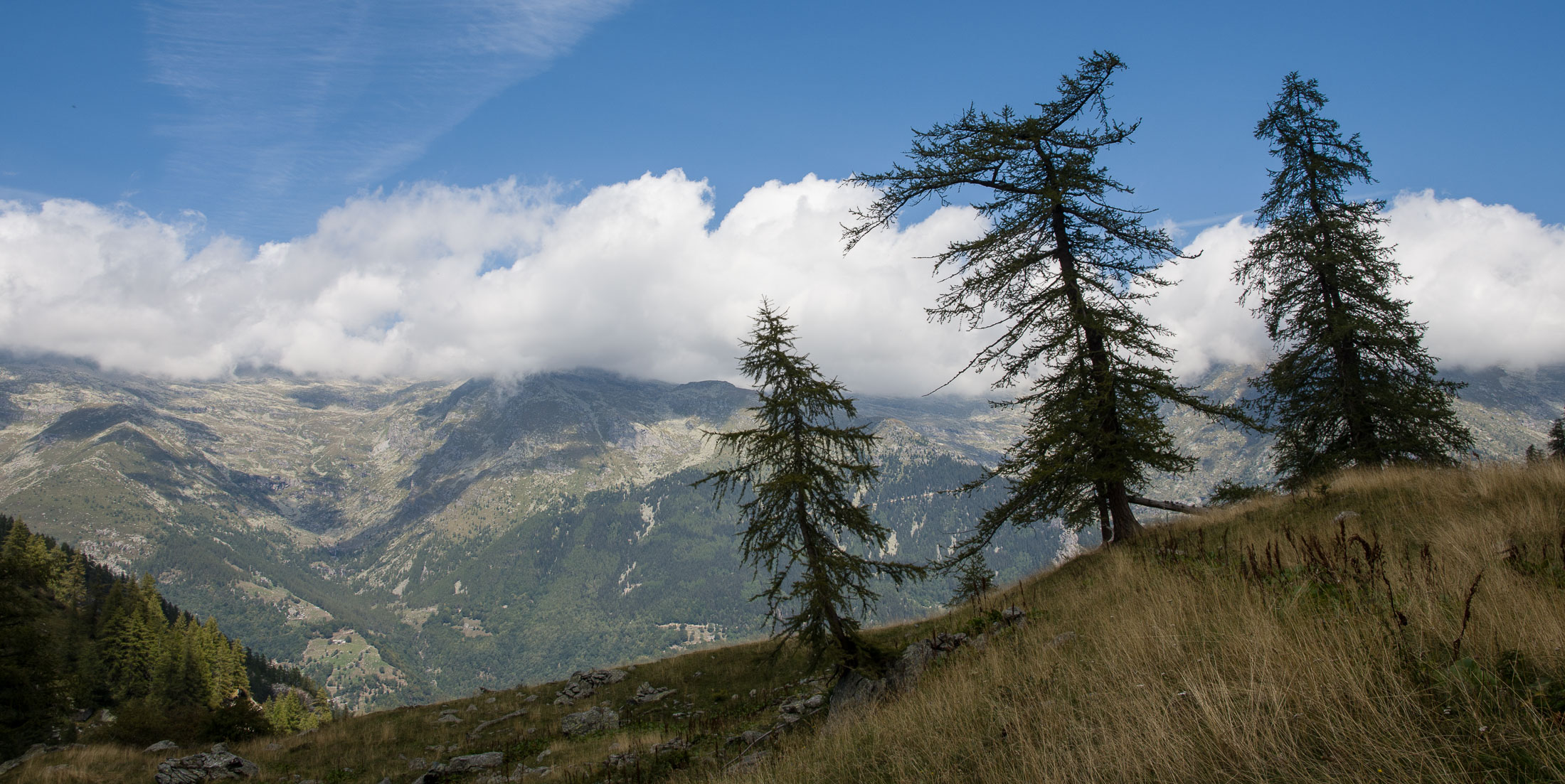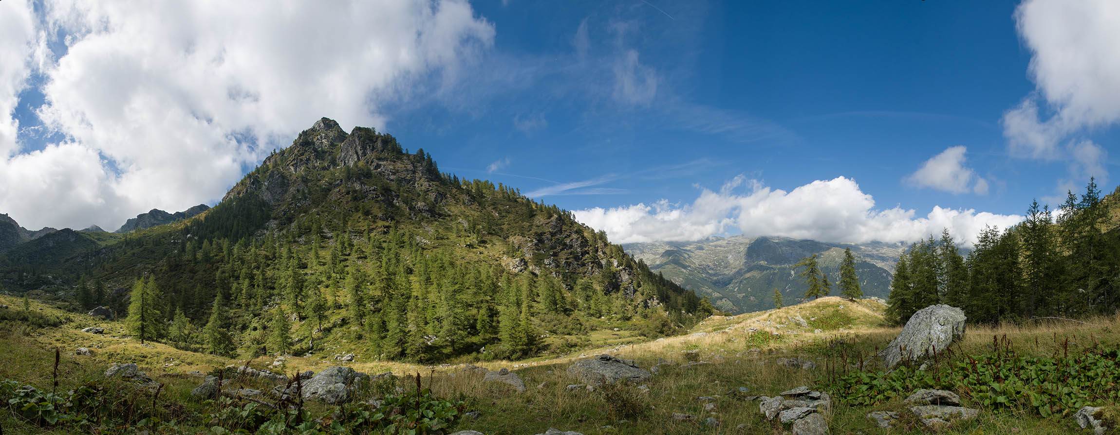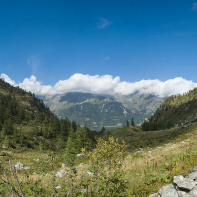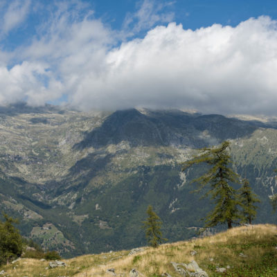 Der Weiterweg beginnt, anfangs mangels erkennbarer Markierungen etwas unklar, hinter den Alpgebäuden und führt durch teils verbuschtes Weideland zwischen einzelnen verstreuten Lärchen in westlicher Richtung hinauf auf eine weitere Hochebene am Rand eines kleinen Nebentals. Der mittlerweile wieder klar erkennbare und gut markierte Weg führt nun durch Erlengebüsch weiter bergwärts, man hält Kurs auf einen bereits von Weitem sichtbaren riesigen Steinmann am Rand einer markanten Geländestufe. Dort angekommen ändert sich schlagartig die Landschaft, man blickt über eine weite Alphochfläche in einem eindrücklichen Talkessel. Wenige Minuten später erreicht man die aufgegebenen Alpgebäude von Crot (2141 m). Weiter in südlicher Richtung, vorbei an dem mittlerweile verlandeten Lago di Crot (2164 m), ein heute ausgetrockneter ehemaliger Bergsee. Am südlichen Ende des Talkessels dreht der Weg Richtung Westen ab und führt steil hinauf auf eine von Steinen und Felsbrocken übersäte kleine Verebnungsfläche. Weiter oben muss ein Blockfeld überquert werden, was im Frühsommer bei Altschneeresten problematisch sein kann. Nach einem kurzen Schlussanstieg erreicht man schliesslich den westlichen Colle Croset (2459 m)*, Wasserscheide zwischen dem Val Grande di Lanzo und dem südlich gelegenen Val d‘Ala. Das grossartige Panorama von diesem weltabgeschiedenen Ort entschädigt für den bisweilen mühsamen und langen Aufstieg, ein wahrlich lohnender Höhepunkt eines traumhaft schönen Tages in völliger Einsamkeit. Richtung Süden blickt man ins Val d‘Ala, das mittlere der drei Lanzo-Täler, im Norden die Berge des Val Grande di Lanzo. Dahinter erhebt sich die hochalpine und teils vergletscherte Kulisse der Gran Paradiso-Gruppe mit den Denti di Broglio (3454 m), Becca di Monciair (3554 m), Ciarforon (3640 m), Tresenta (3609 m) und Gran Paradiso (4061 m).