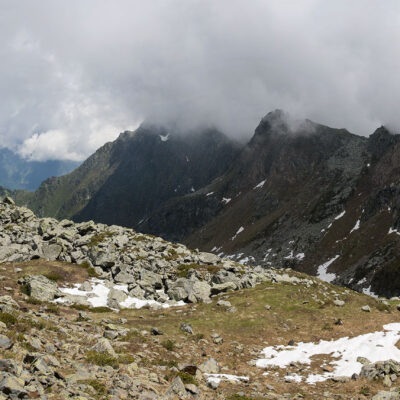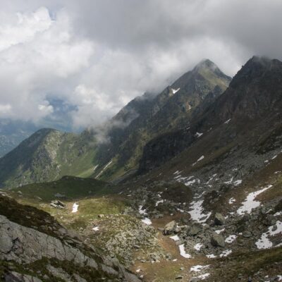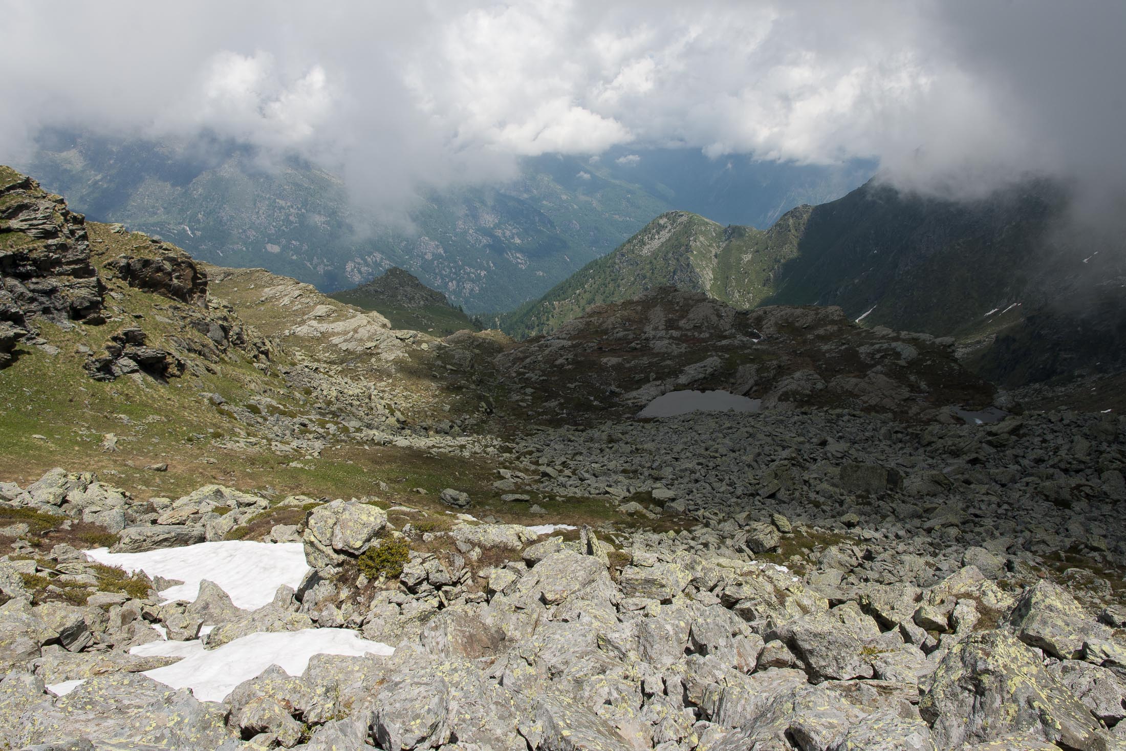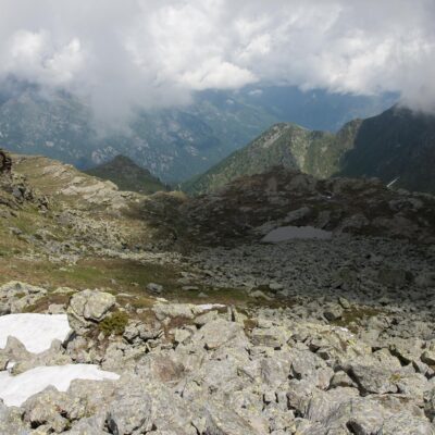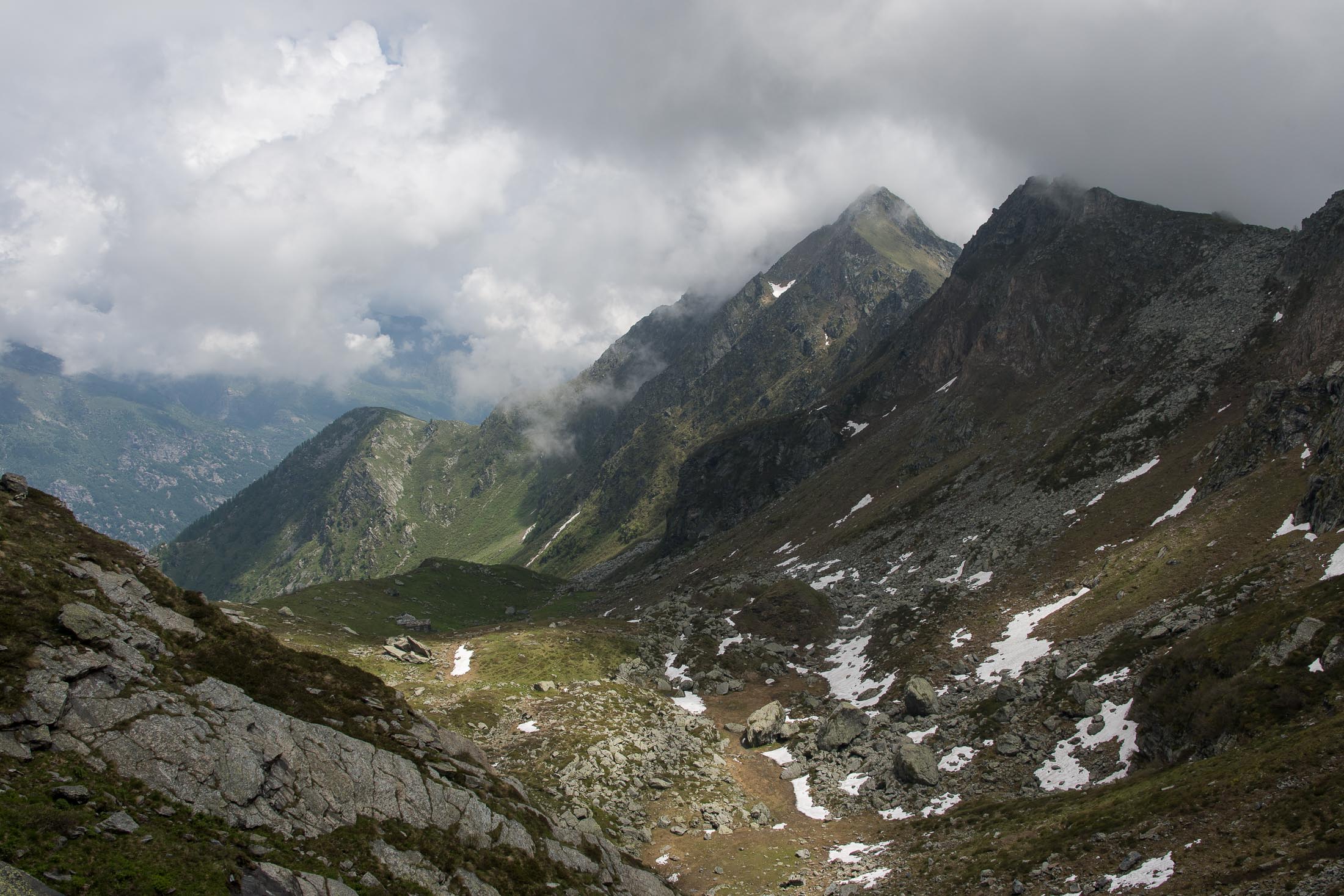 Der Abstieg verläuft auf dem Aufstiegsweg. Ein Abstieg ins nördlich gelegene Val d‘Ala ist möglich, aber wegen der Unübersichtlichkeit des Geländes nicht empfehlenswert. Die Tour wird dann ziemlich lang (ca. 9-10 Std. und ca. 1400 Höhenmeter im Auf- und Abstieg, T3/T4), südlich des Passes erwarten einen zunächst einige weglose und unmarkierte Abschnitte, die bei dichtem Nebel Orientierungsprobleme bereiten können.