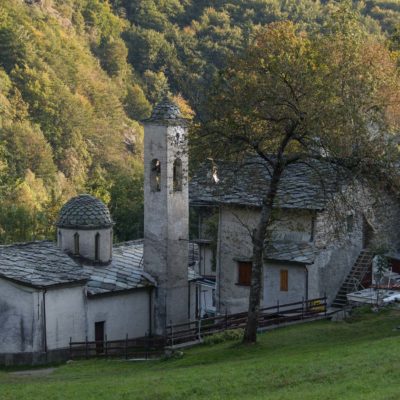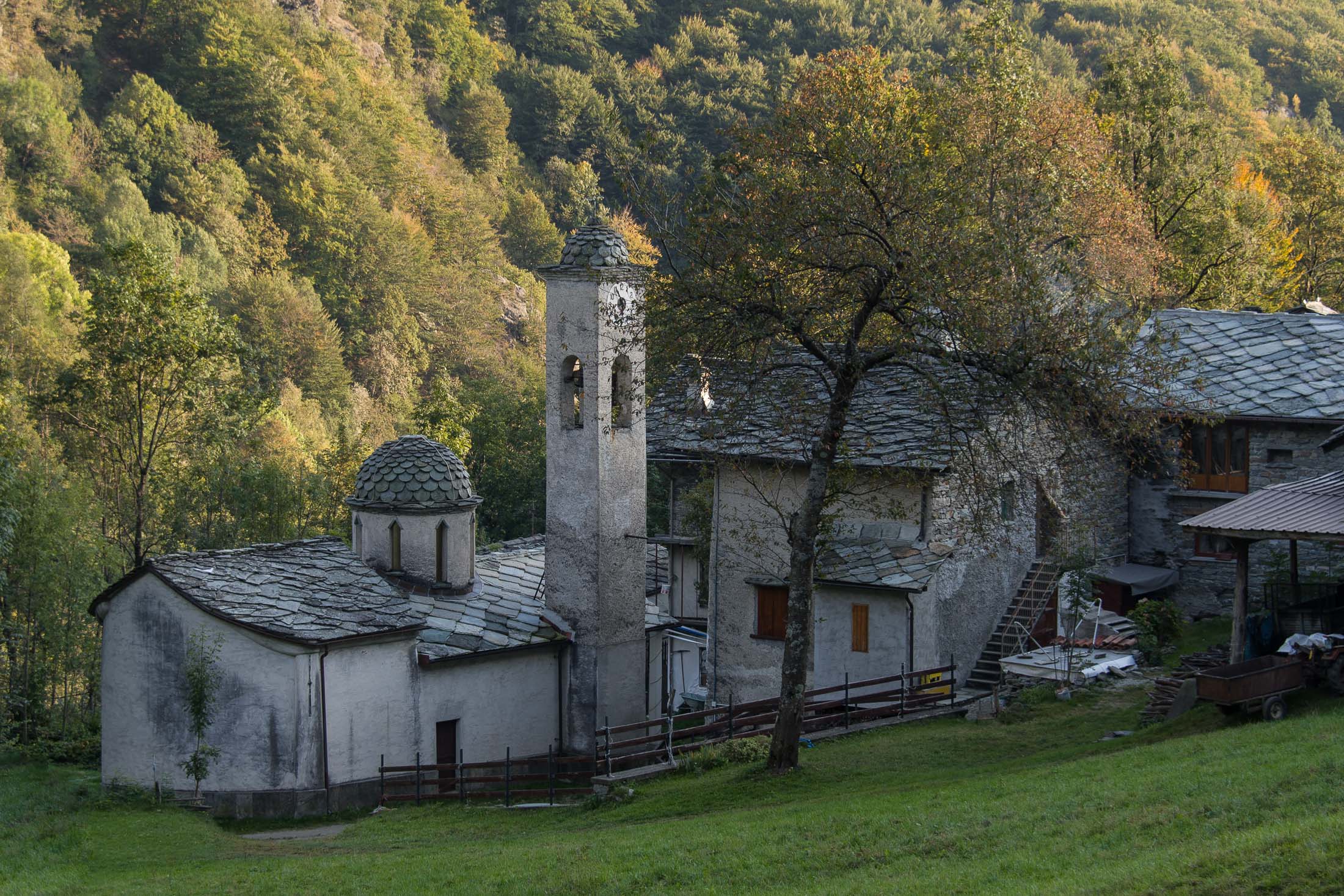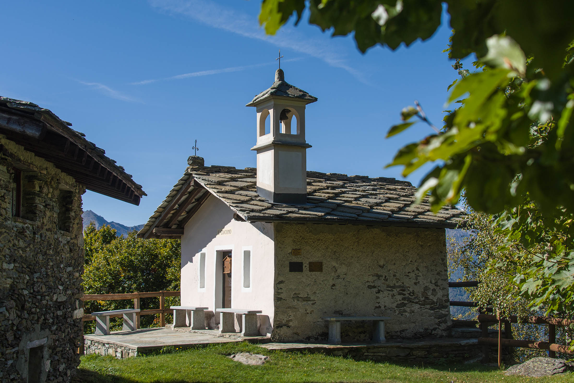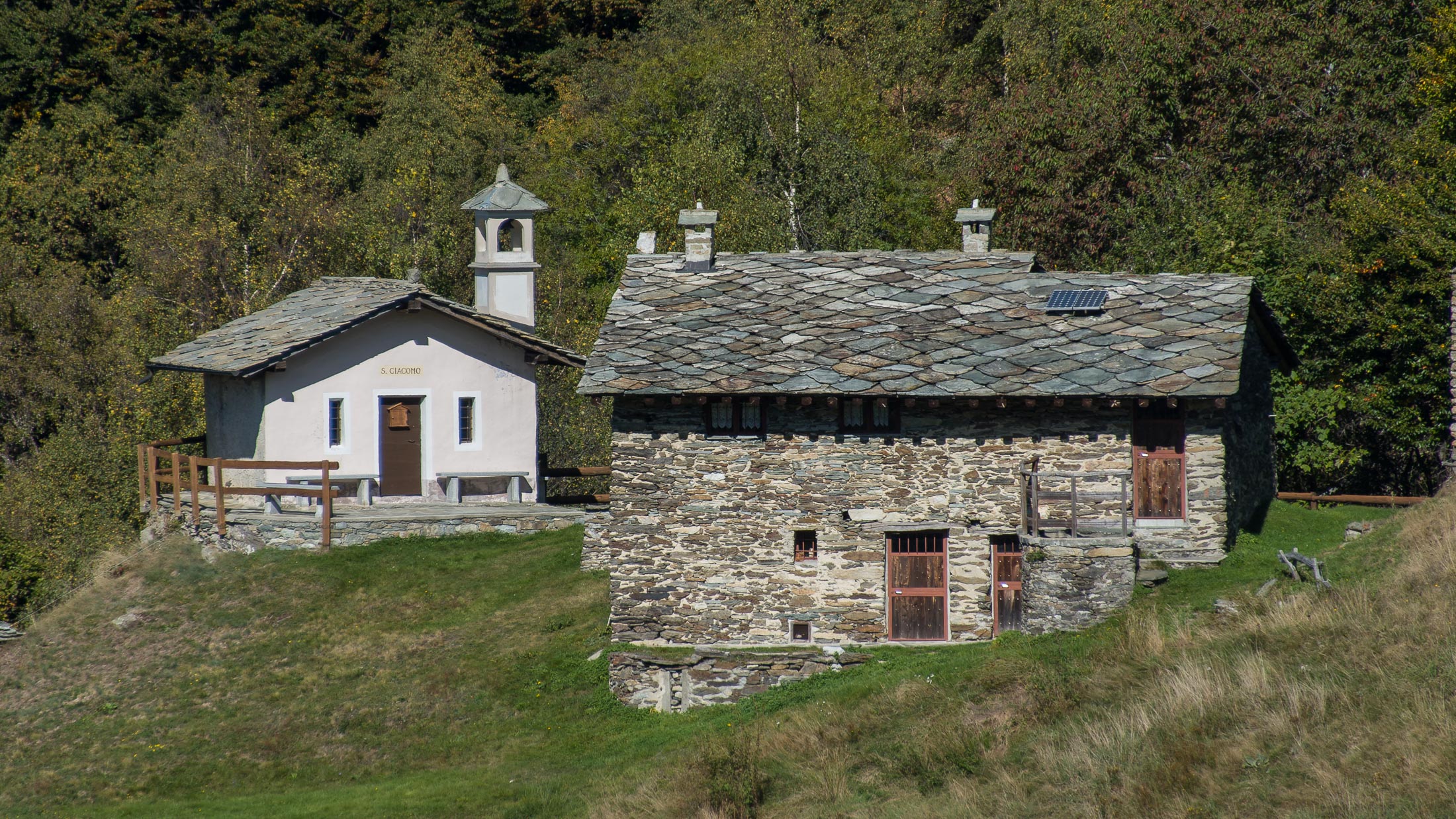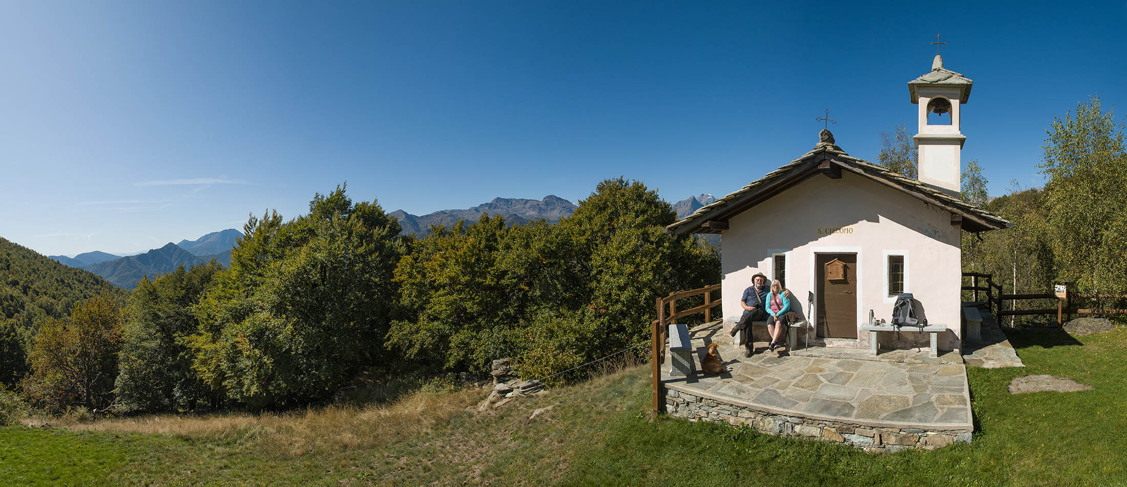 Am oberen Ortsrand von Vrù (1039 m) zweigt ein unbefestigter und für den öffentlichen Verkehr gesperrter Forstweg ab, der alsbald im schattigen Buchenwald verschwindet. In zahllosen Kehren windet sich der Weg hinauf nach Blinant (1304 m), eine schön gelegene kleine Alpsiedlung auf einer sonnigen Lichtung mit einigen hübsch renovierten Hütten, die heute als Wochenendhäuschen genutzt werden. Weiter oben lichtet sich der Wald und man wandert durch ein Weidegebiet, was jedoch immer mehr verbuscht und von Farnen, Alpenrosen und vielen Birken überwachsen ist. Der Weiterweg führt ein weiteres Stück durch lauschigen Wald, wenig später erreicht man den weitläufigen Colle San Giacomo (1460 m), mit tollem Panorama auf die Berge der drei Lanzo-Täler. Im Osten erstreckt sich die nahe piemontesische Tiefebene, bei klarem Wetter blickt man auf die Millionenmetropole von Turin. Der Colle San Giacomo befindet sich auf einer kleinen Hochebene auf dem langen Gratrücken, der das Val Grande di Lanzo von dem östlich gelegenen Valle Tesso trennt. Am Pass folgt man dem Wegweiser und steigt in Kürze hinab zu der im Sommer bestossenen Alpe San Giacomo (1414 m), von dort sind es nur noch wenige Schritte bis zur Cappella di San Giacomo. Die sehenswerte kleine Kirchenkapelle wird von Einheimischen in ehrenamtlicher Arbeit gepflegt und instandgehalten. Ein friedvoller Ort, das beschauliche Gotteshaus ist genau die richtige Kulisse zum Entschleunigen.